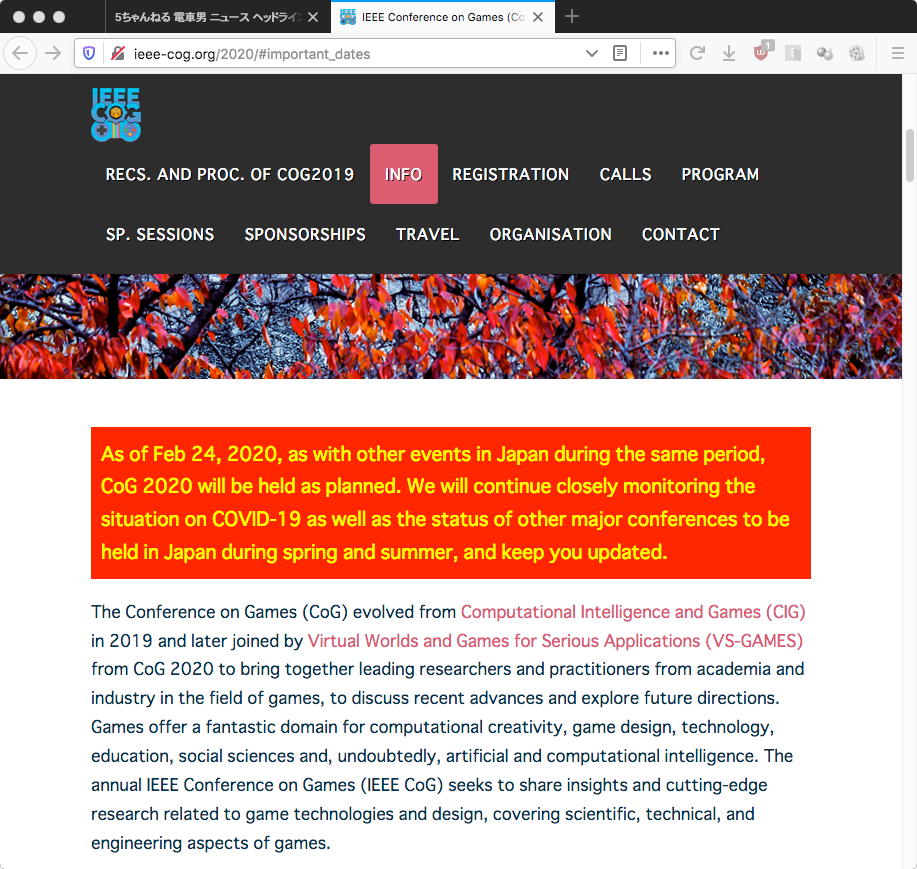 今月下旬に論文募集締め切りがある国際会議CoG2020のサイトを久しぶりに見てみると、以下のように毒々しい表示で、「2020年2月24日の時点で、同時期の日本での他のイベントと同様に、CoG2020は計画どおりに開催されます。COVID-19の状況と、春と夏に日本で開催される他の主要な会議の状況を引き続き注意深く監視し、最新情報をお届けします」とあった。 ここは粛々と応募していくしかない。