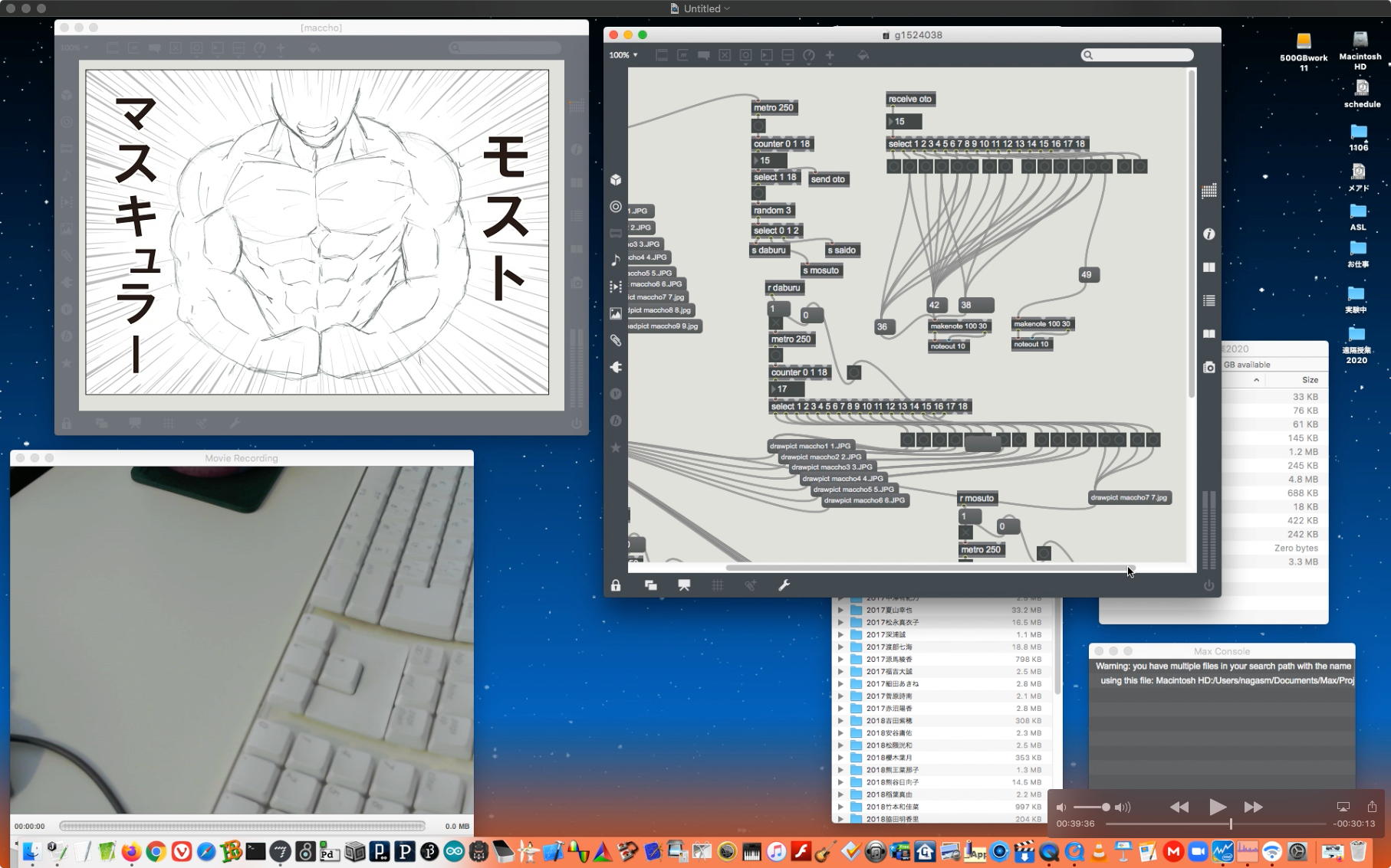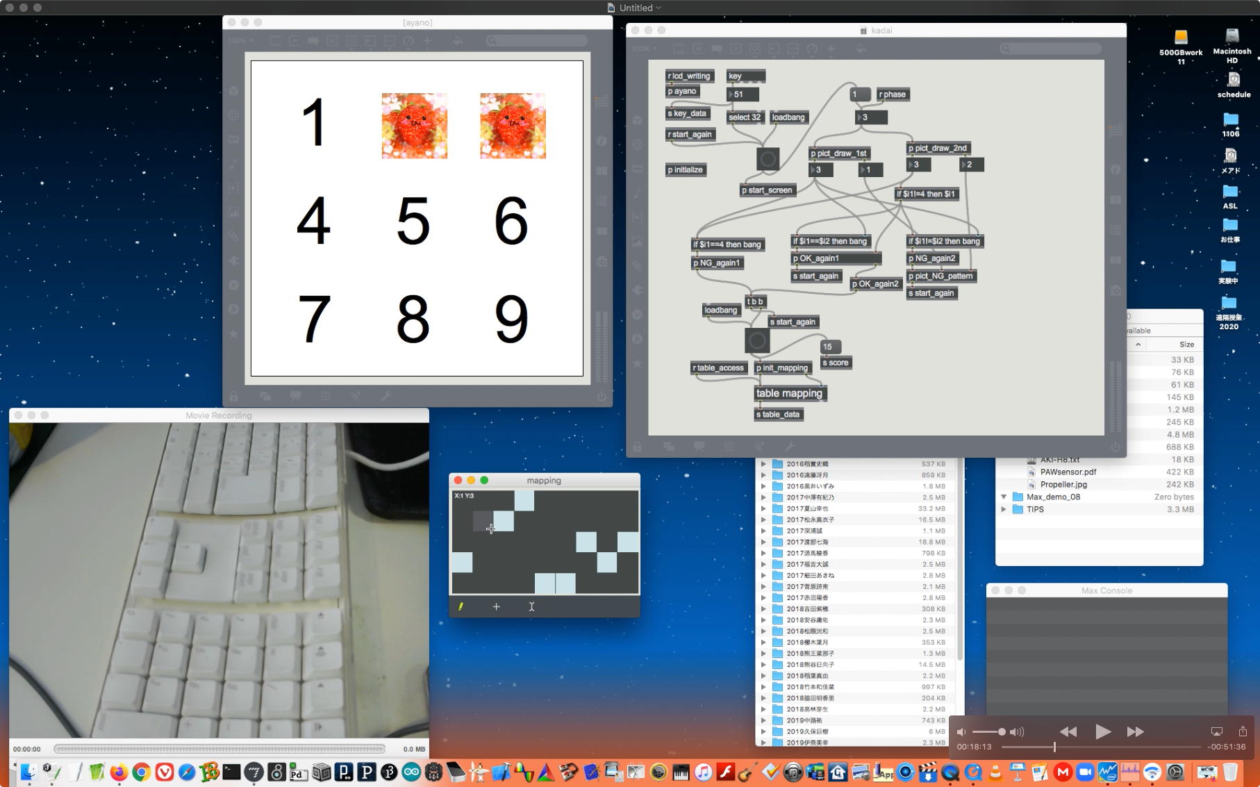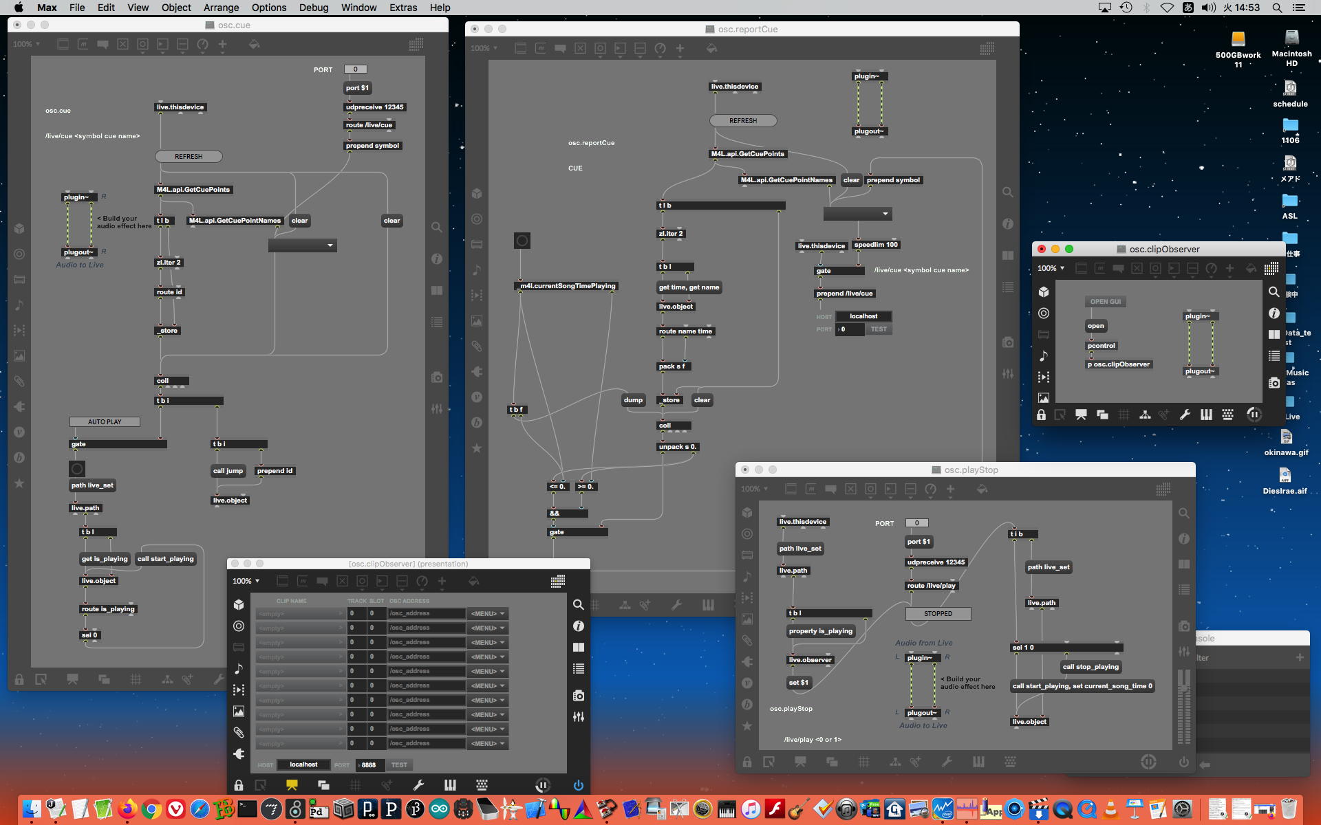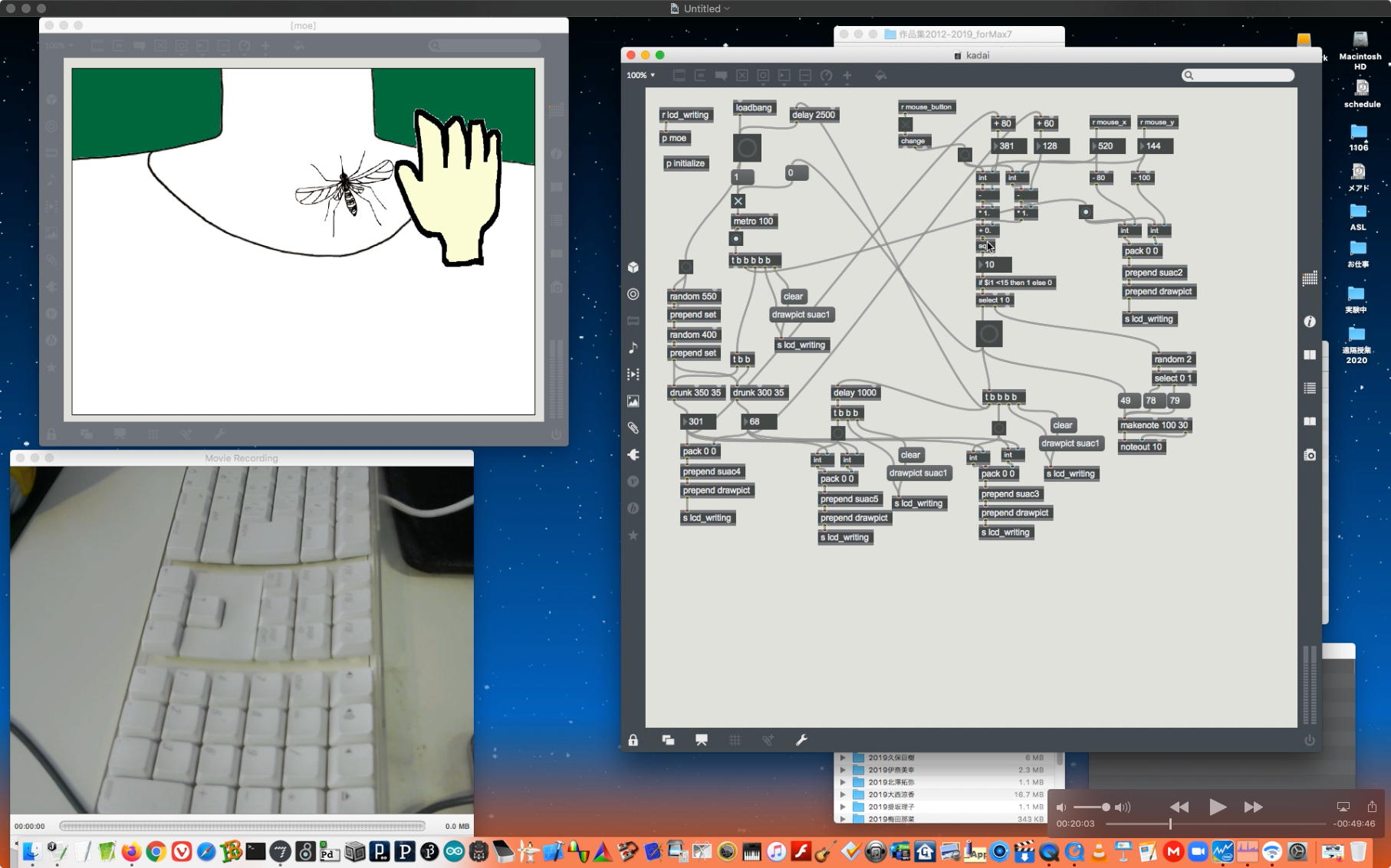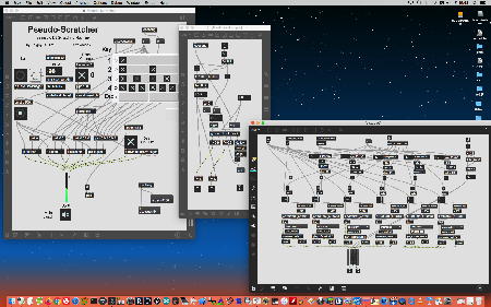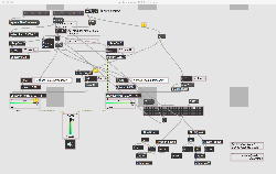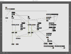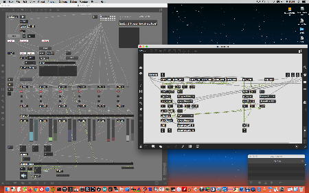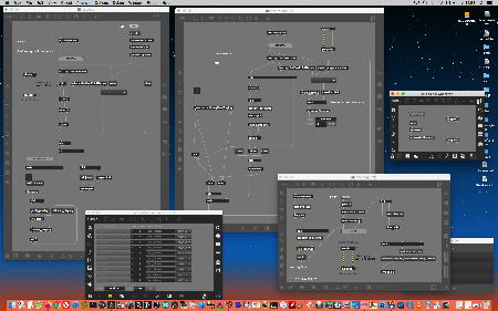 研究室に並んだ4台のiMacのうち3台はチーム「でんぷん」の作品でOSC相互通信をするということで、LANはSUACのネットから切り離して孤立LANを構成することになる。 そこでこの3台を「でんぷんA→100.0.0.1」・「でんぷんB→100.0.0.2」・「でんぷんC→100.0.0.3」とIPアドレスを手入力で設定し、さらにそれぞれが自分をポート8001/8002/8003でモニタする(他マシンからこのポート番号で送る)、というサンプルMaxパッチを作って、それぞれのデスクトップに置いた。 これで作品記録のための準備は完了である。