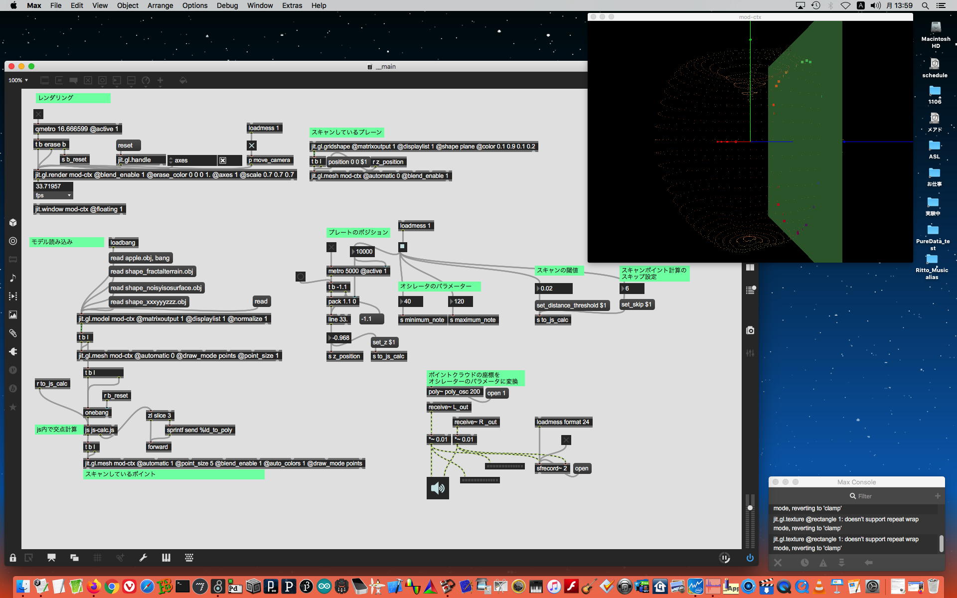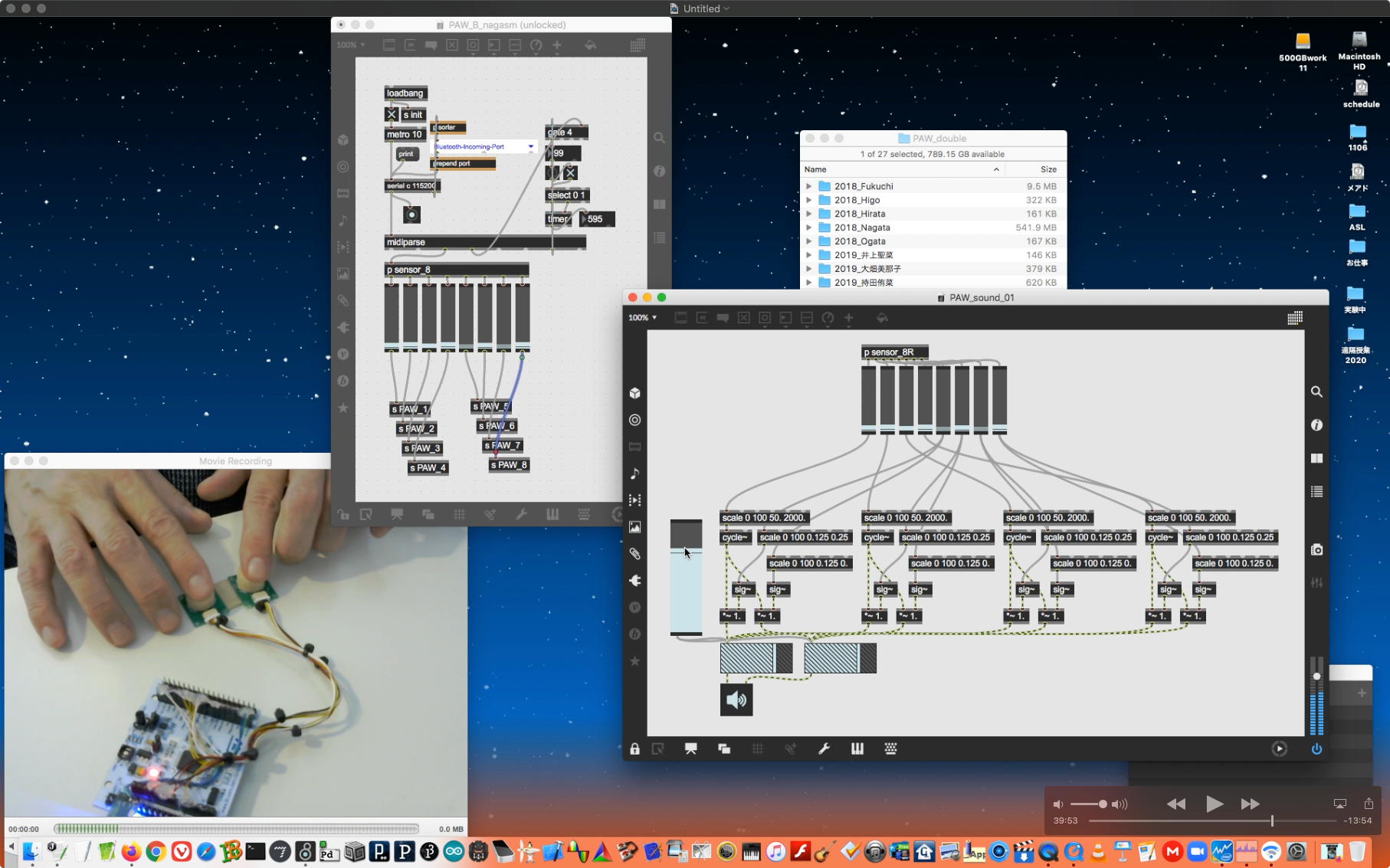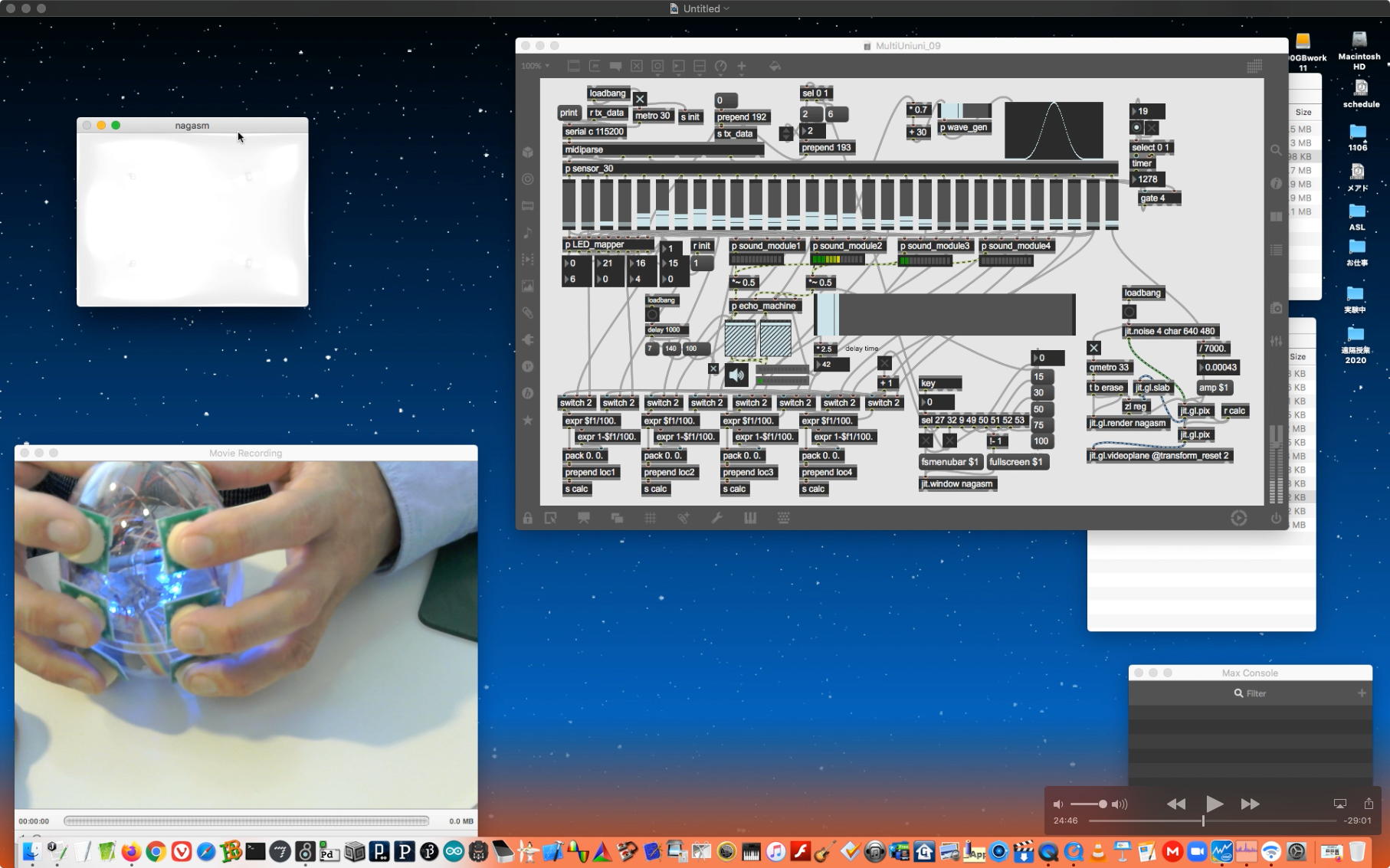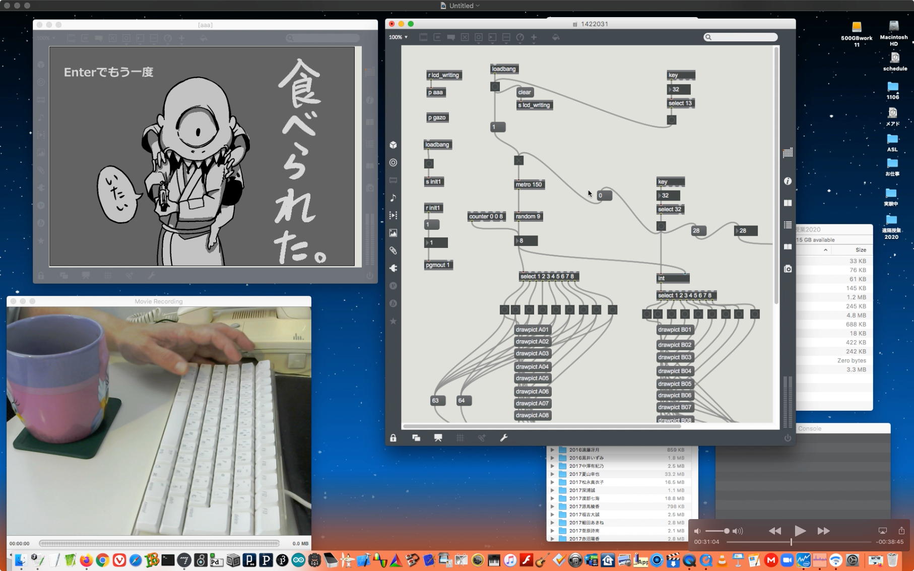研究室に並んだ4台のiMacのうち3台はチーム「でんぷん」の作品でOSC相互通信をするということで、LANはSUACのネットから切り離して孤立LANを構成することになる。 そこでこの3台を「でんぷんA→100.0.0.1」・「でんぷんB→100.0.0.2」・「でんぷんC→100.0.0.3」とIPアドレスを手入力で設定し、さらにそれぞれが自分をポート8001/8002/8003でモニタする(他マシンからこのポート番号で送る)、というサンプルMaxパッチを作って、それぞれのデスクトップに置いた。 これで作品記録のための準備は完了である。