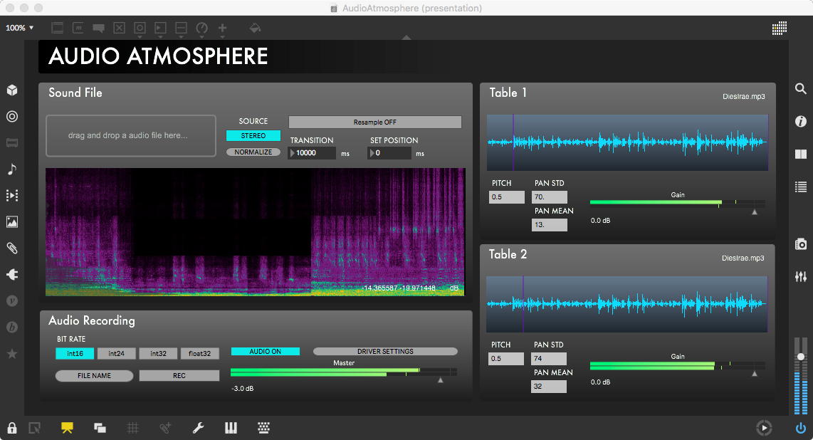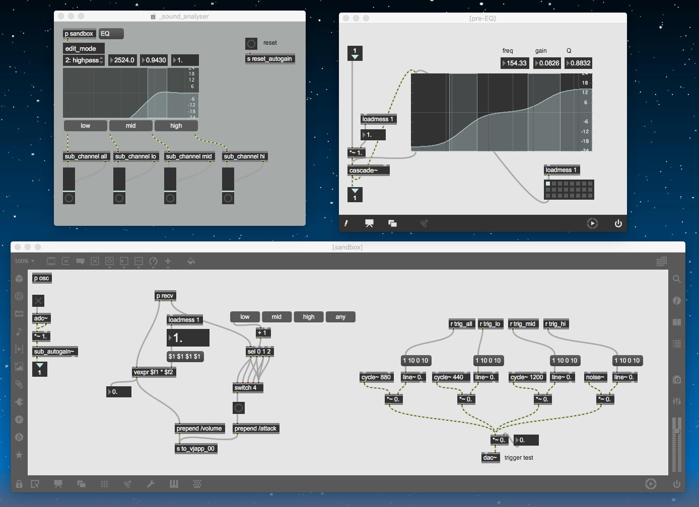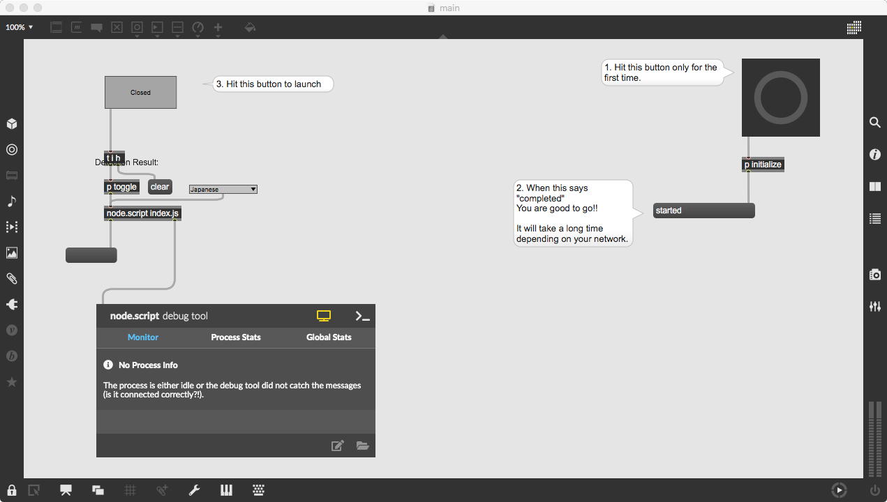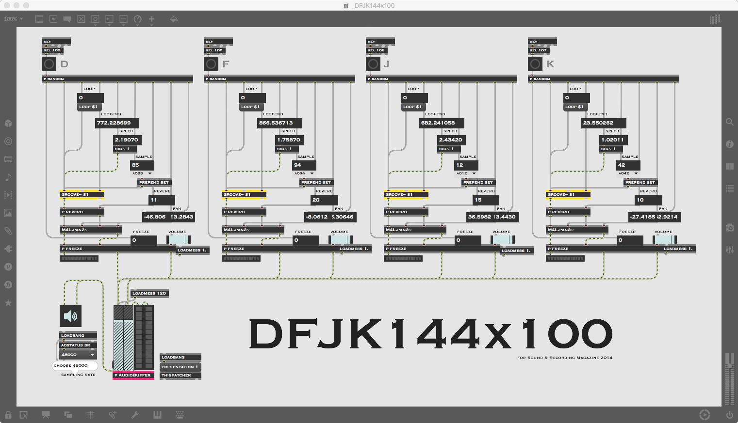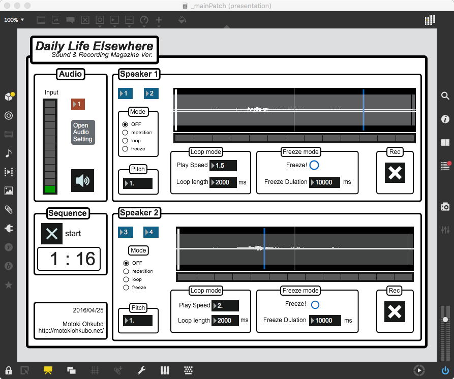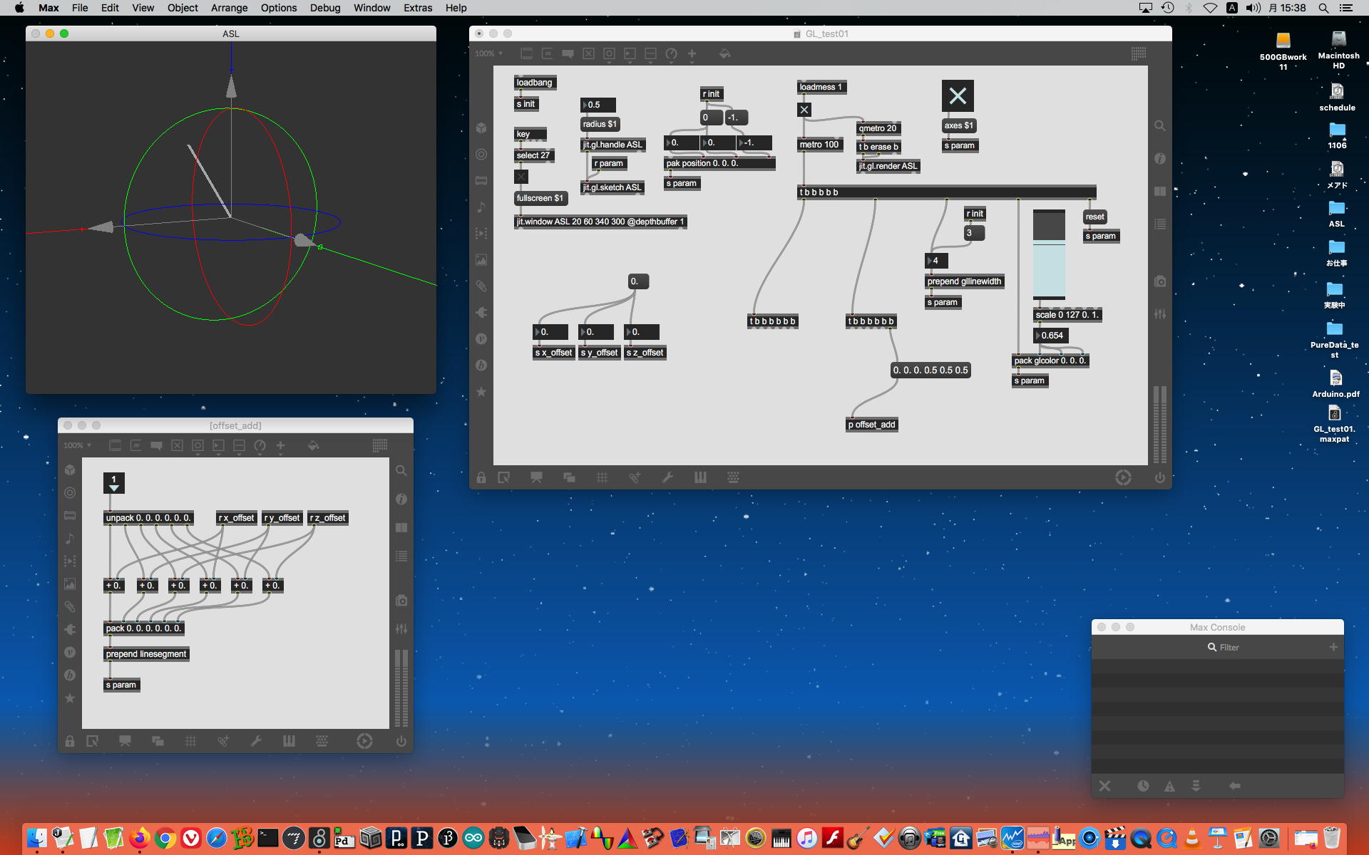 研究室に並んだ4台のiMacのうち3台はチーム「でんぷん」の作品でOSC相互通信をするということで、LANはSUACのネットから切り離して孤立LANを構成することになる。 そこでこの3台を「でんぷんA→100.0.0.1」・「でんぷんB→100.0.0.2」・「でんぷんC→100.0.0.3」とIPアドレスを手入力で設定し、さらにそれぞれが自分をポート8001/8002/8003でモニタする(他マシンからこのポート番号で送る)、というサンプルMaxパッチを作って、それぞれのデスクトップに置いた。 これで作品記録のための準備は完了である。