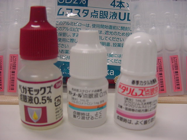 しかし実際には4つ目のように、そこから1週間が経過してもほとんど同じまま(^_^;)だった。 そしてさらに毎日4回、6時間おき(夜中も起きて点眼)に、それぞれの点眼薬の間に5分ずつあける・・・というのを愚直に繰り返し繰り返し続けて1週間、一番下のように、昨日はようやく前週から明らかに穴ぼこが小さくなってきたのだが、まだ視界の中央付近なので視力は0.3ほどである、と確認できた。 引き続きまた来週まで同じことの繰り返しだが、防護用にソフトコンタクトレンズが載っているので、痛みもなく平穏に日々が過ぎている。