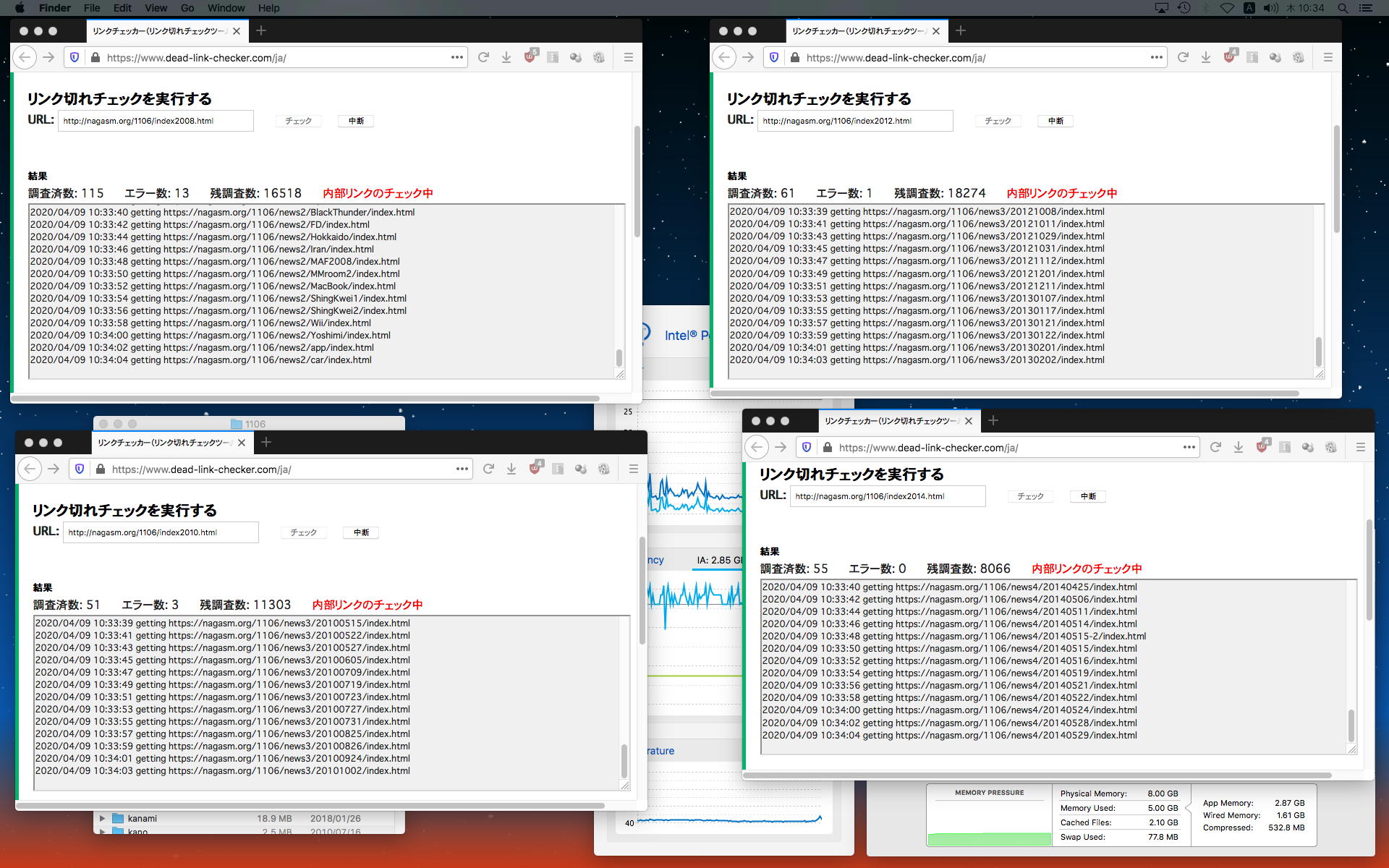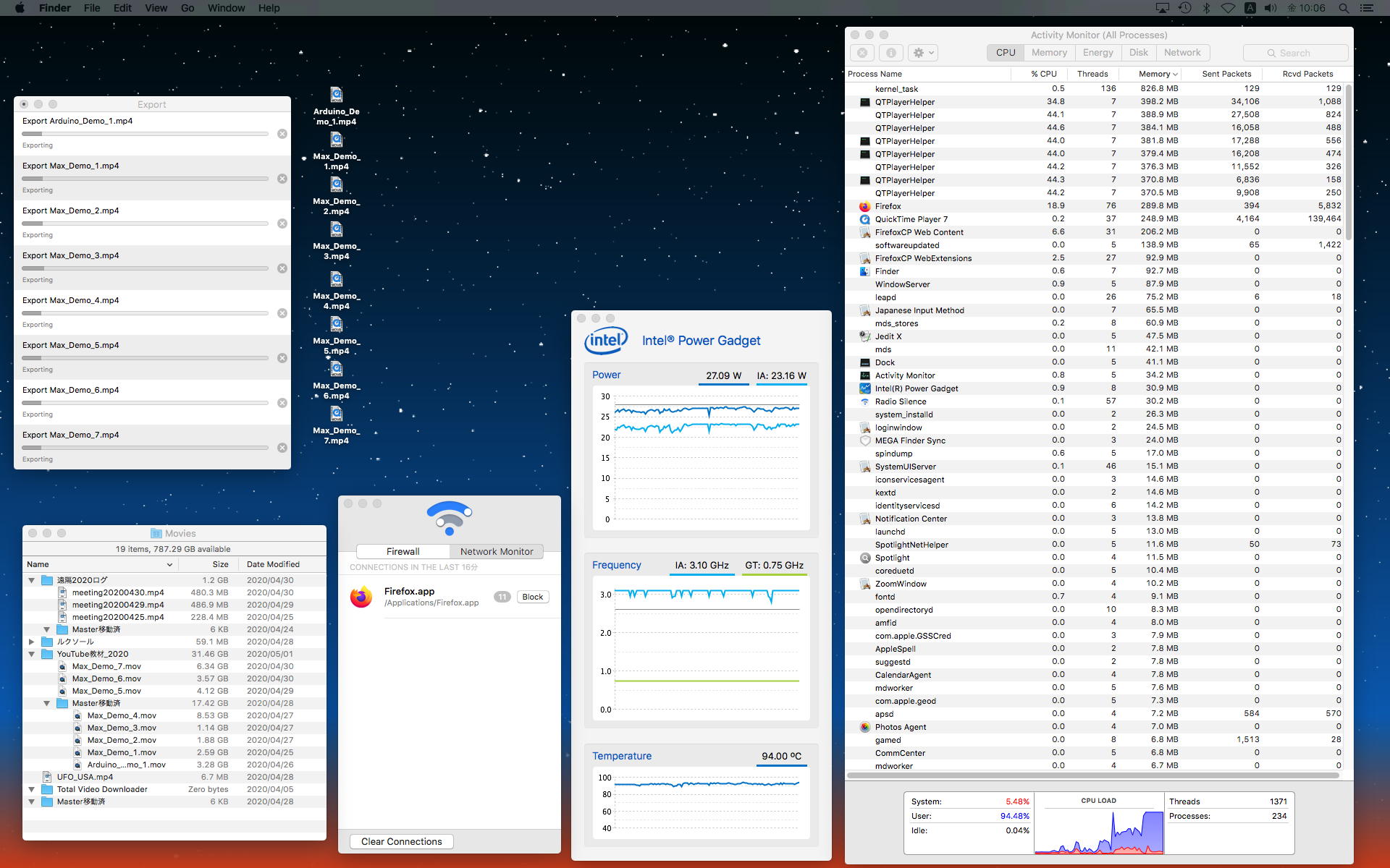 朝イチで眼科に行ったが、「張らないねぇ・・・」といういつもの判定だった。 まぁ歳も歳なので、細胞の回復はこんなもんだ、とあまり心配していない。 そして研究室に出てくると、昨日のYouTubeアップロードは完了していたが、ここまで8本の教材動画のサイズ合計が32GB!!にもなっていたので、そのままバックアップせずに、QuickTimePlayer7Proでmp4に変換することにした。 すると以下のように、8本の変換プロセスが唸りを上げて走り出し、CPUの温度は94℃まで跳ね上がってへばりついた(^_^;)。 横に置いたファンでMac miniを連続強制空冷していてこれであるが、おそらく明朝まで完了せず、さらに明日も走り続けることになる。