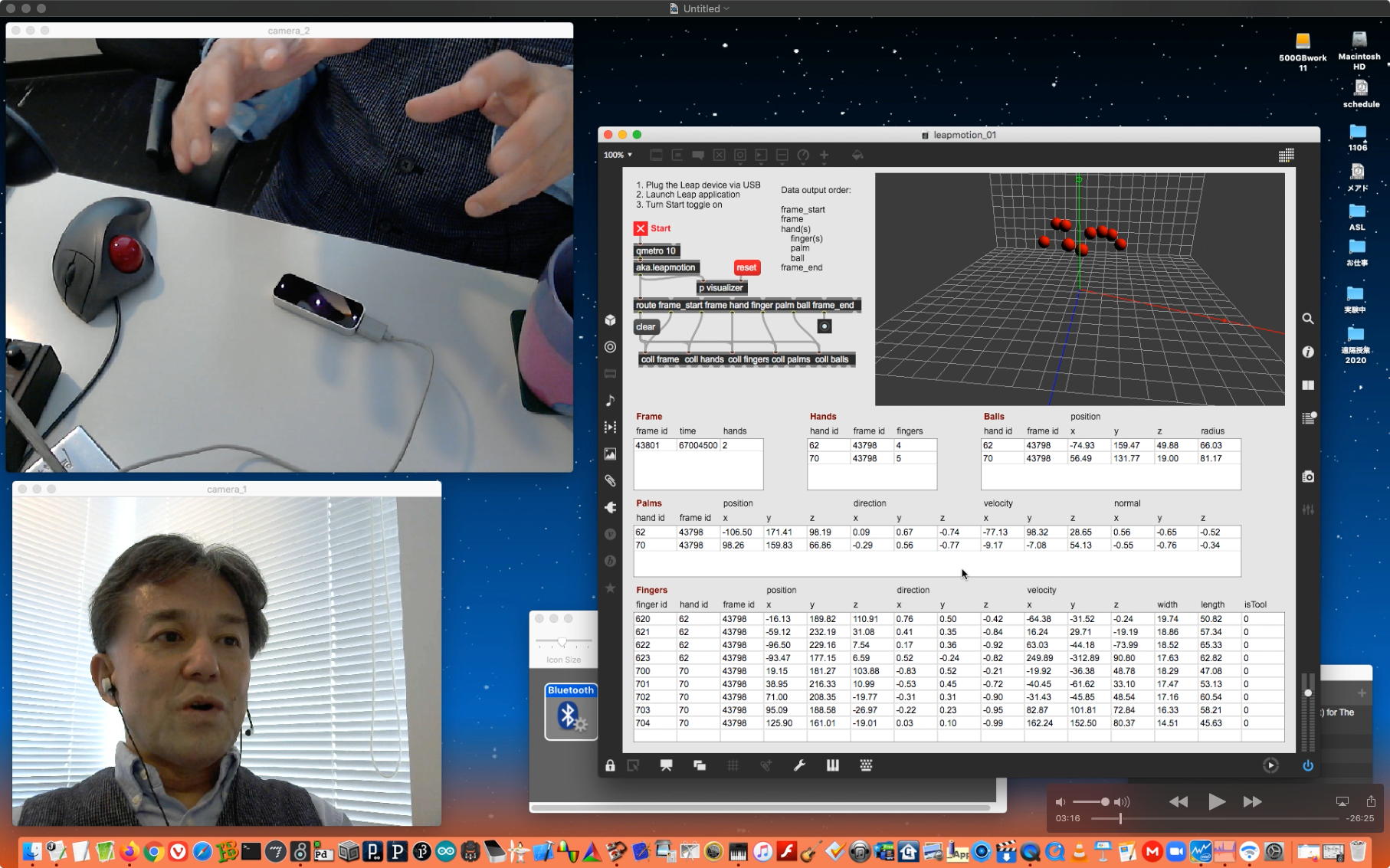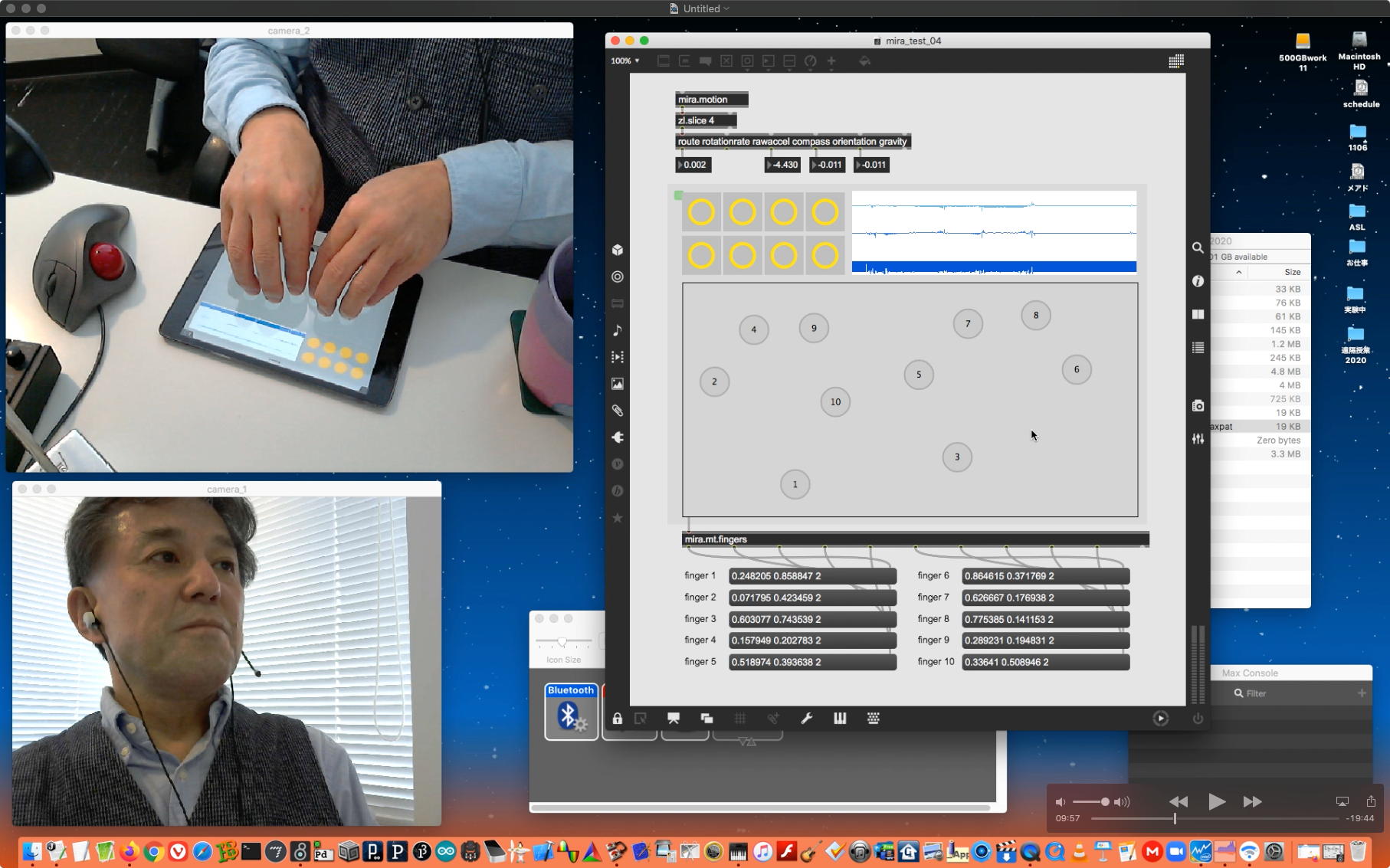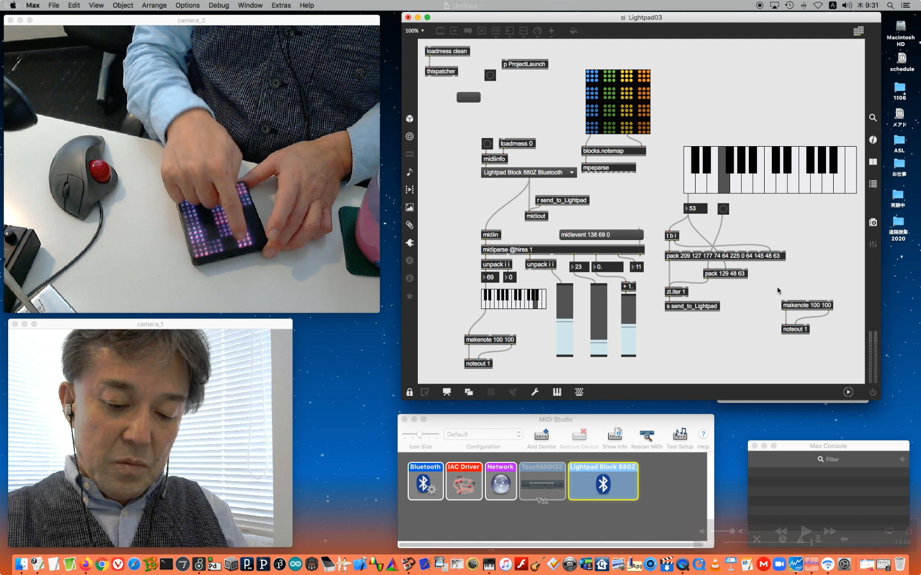 そして朝イチで上のように、昨日のリベンジということでleapmotionと、さらにiPadを出してきて「mira」と、LightPadBlock"ROLi"との3点セットで、またまた盛り沢山(30分)の Max8の紹介(6) を作った。 これをYouTubeにアップロード(1時間10分)しているうちにゼミZOOM会議の時間となって、「YouTubeアップロードと並行してのZOOM会議」という新しい実験になった。