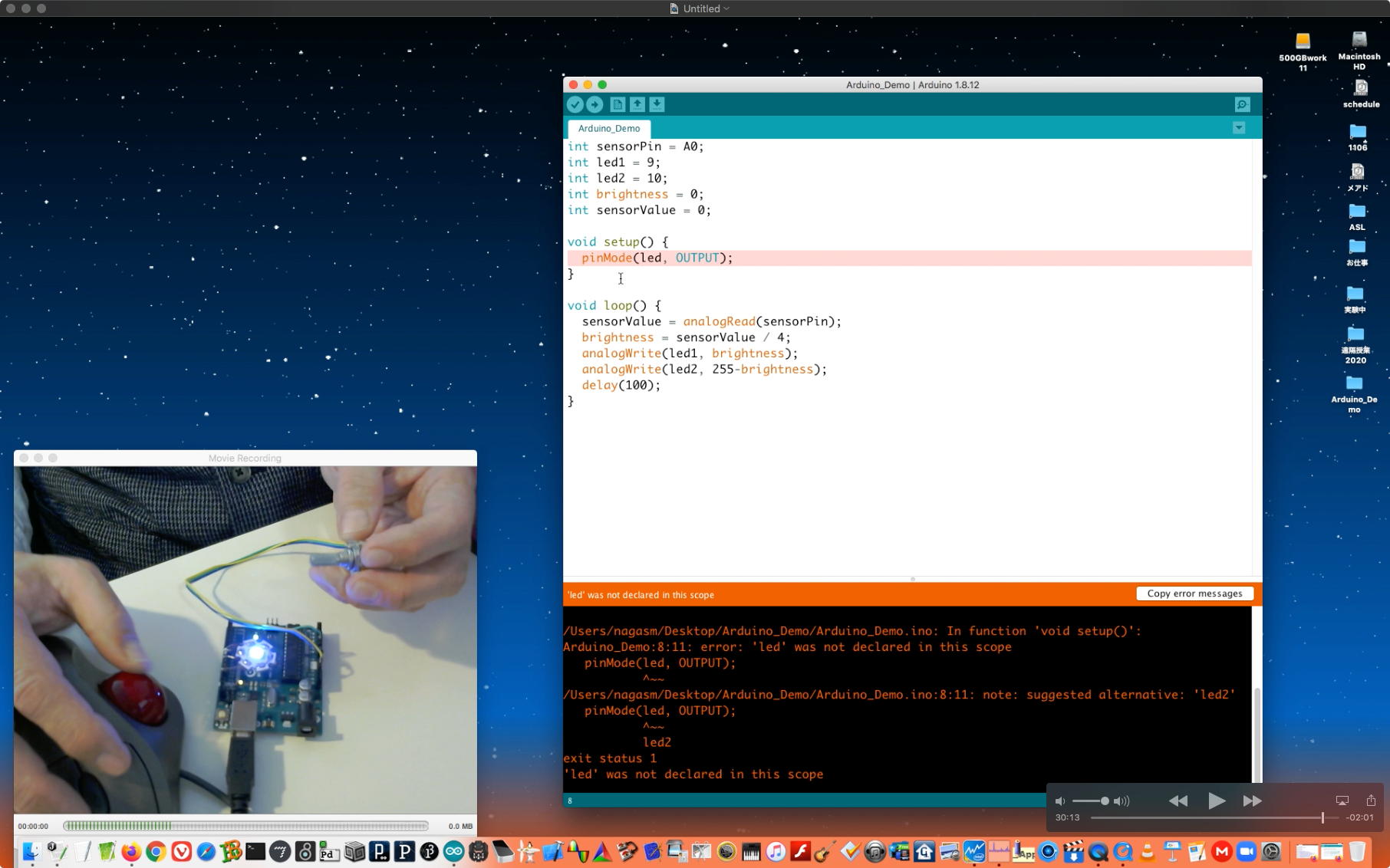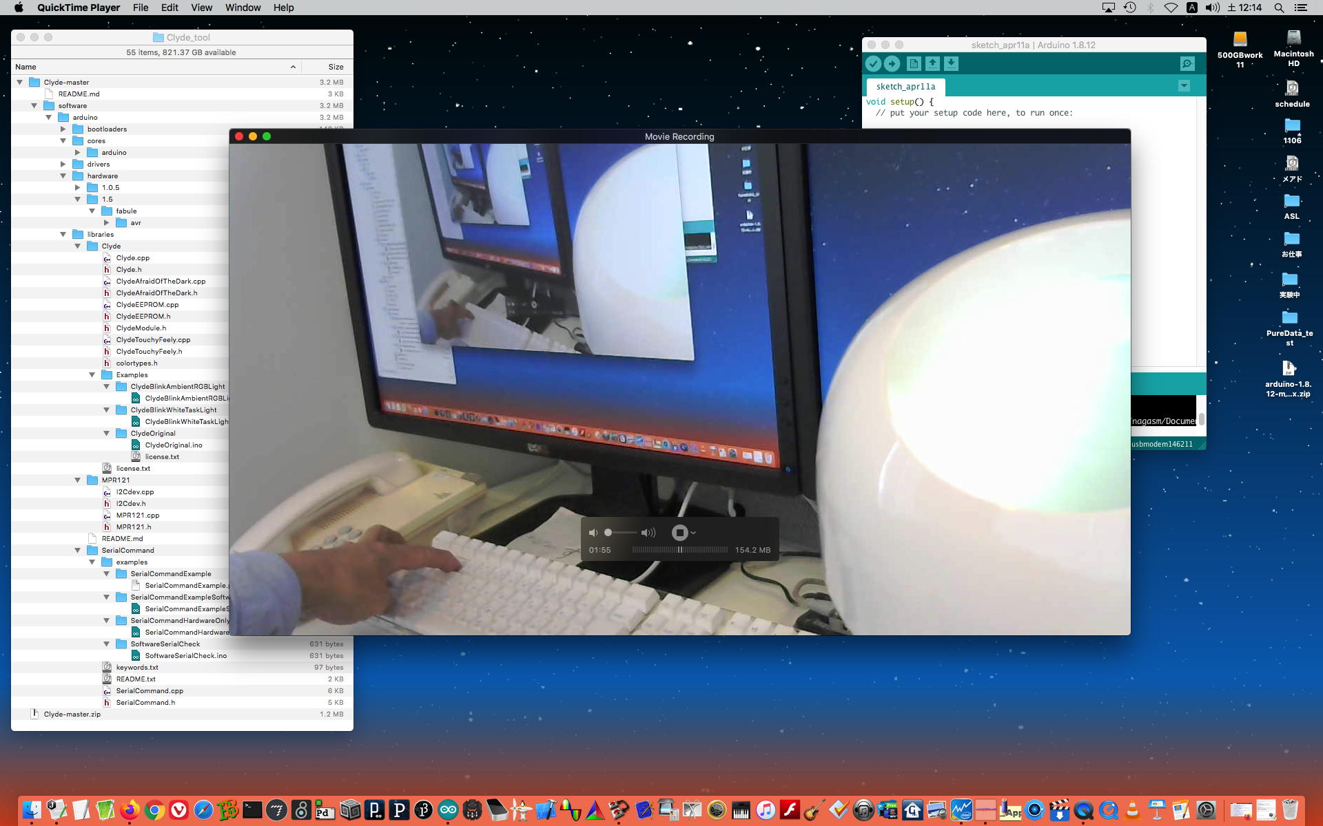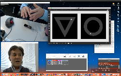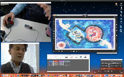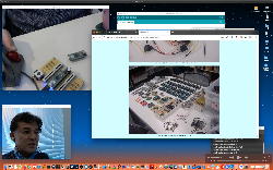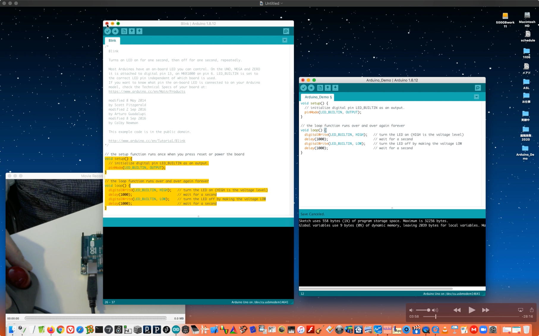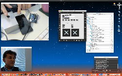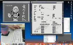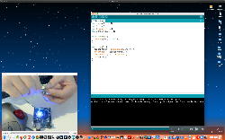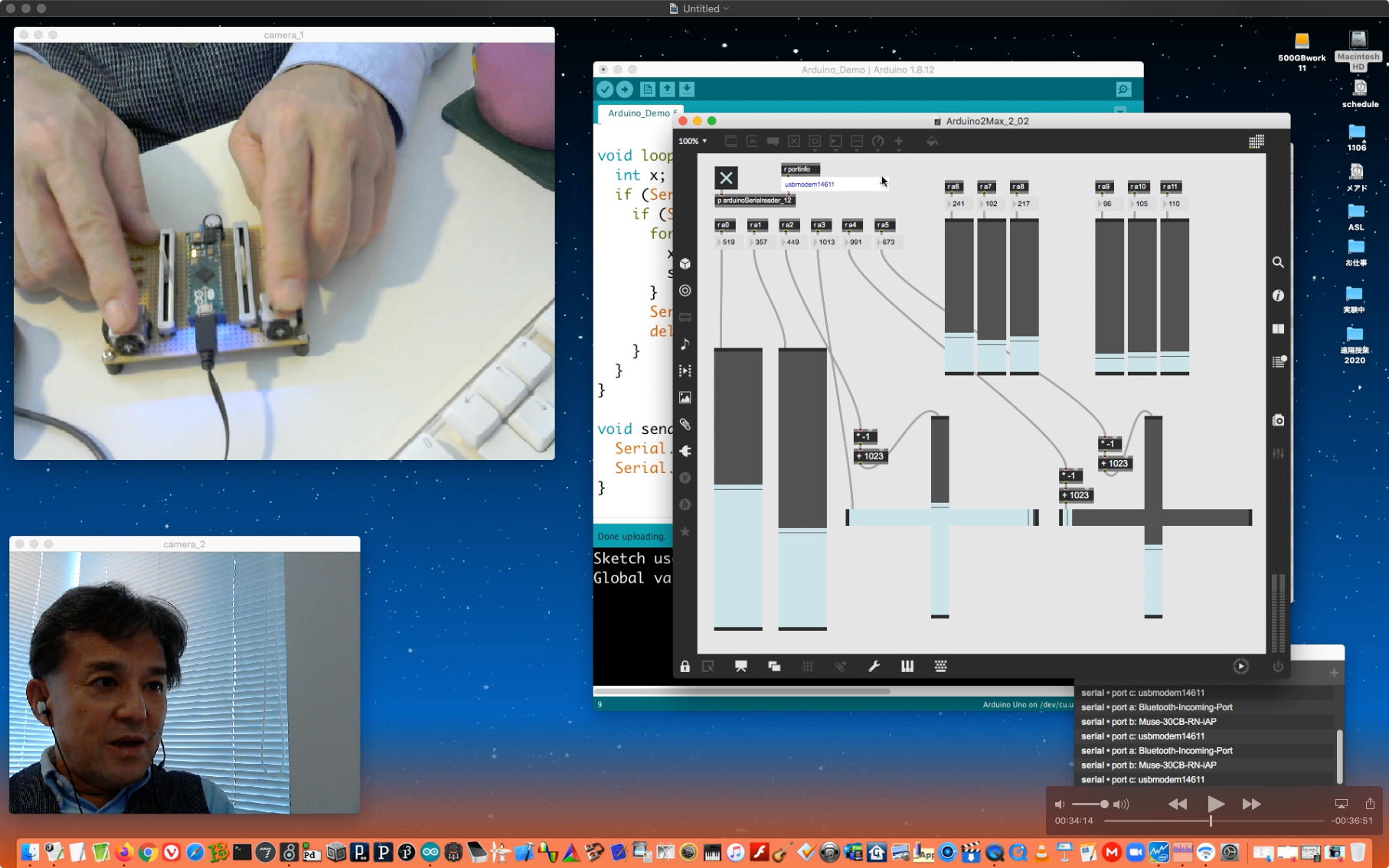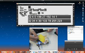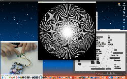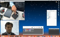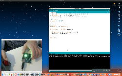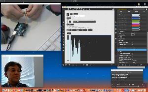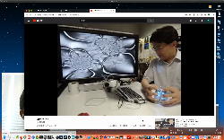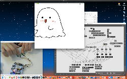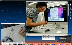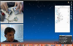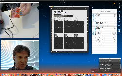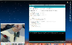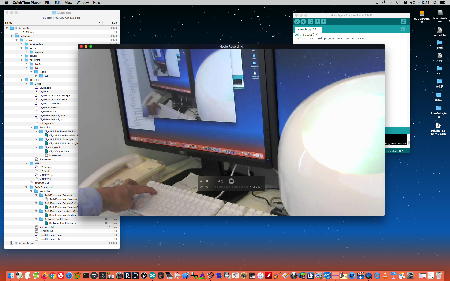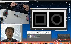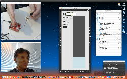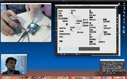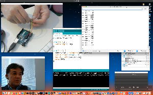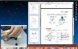 午後には、Arduinoの搭載されたいろいろなボード(各種センサ)を持ち出したが今日はそこまで行かず、上のように「Arduinoの基本」という30分ほどの この動画 を作ったところでオシマイとなった。 Max(jitter)でカメラ2台を同時に使うところは良かったのだが、Maxが起動しているとWebだけでなくArduino IDEも激重になった(^_^;)ので断念して、QuickTimePlayer7Proの「Video Recording」画面で1つだけWebカメラを表示した状態で、QuickTimePlayerXの「Desktop Recording」で全体を一発撮りする、という方法を採用した。 終わってみると所要時間が「59分」とか言われたので、またまたYouTubeへのアップロードを放置したまま帰宅することにした。