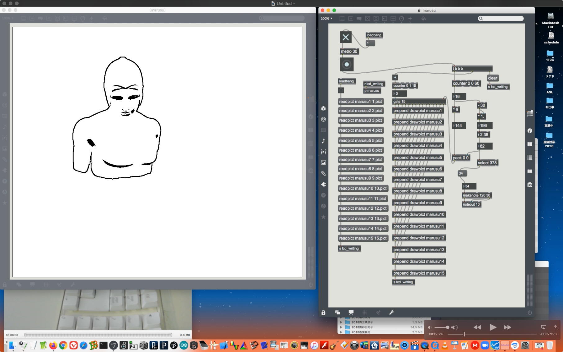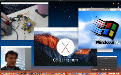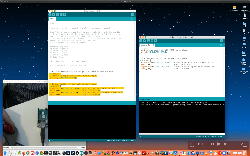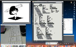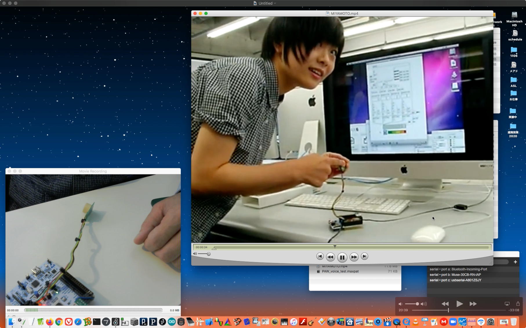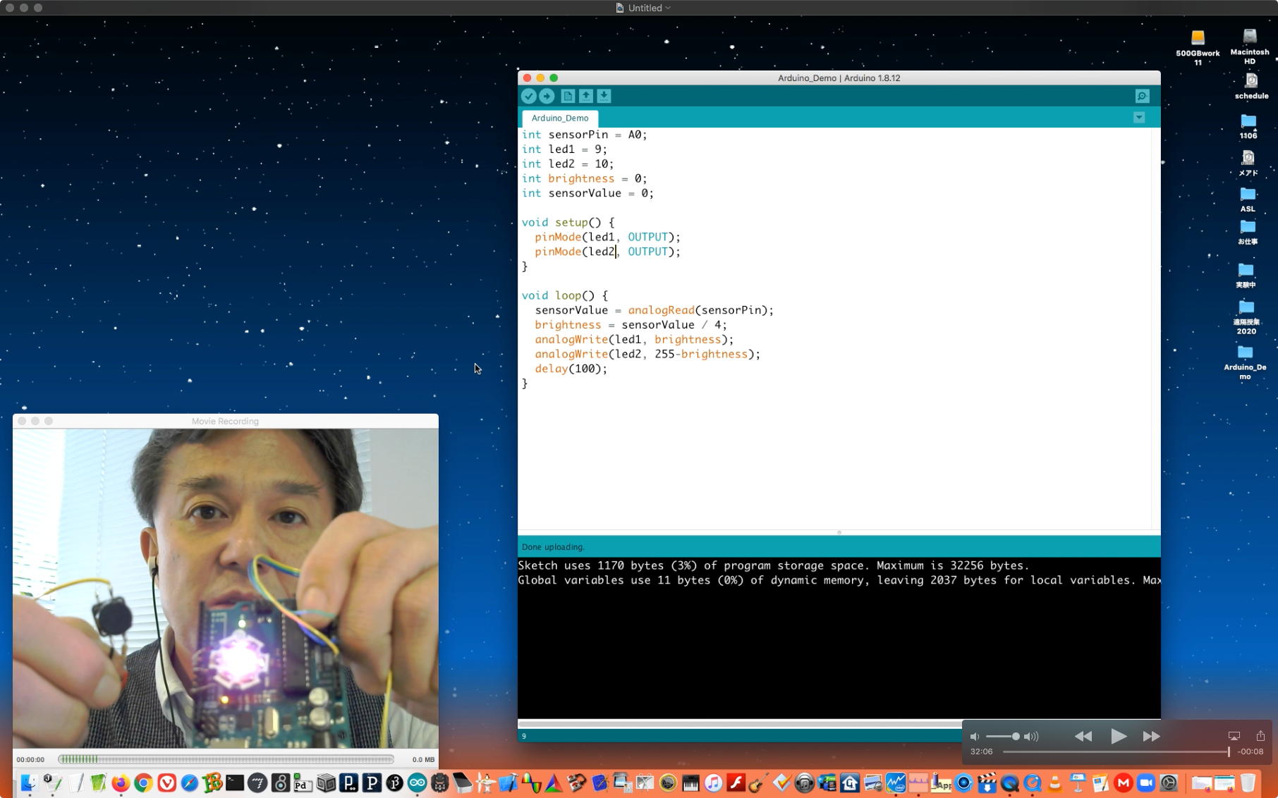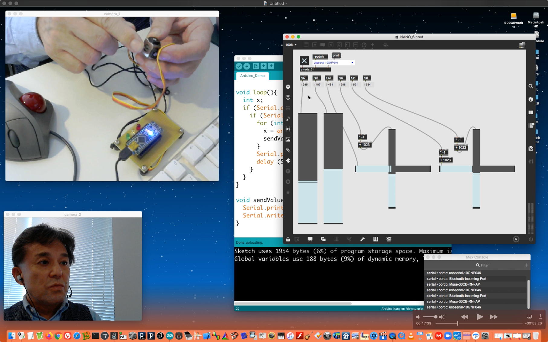 午後には、Arduinoの搭載されたいろいろなボード(各種センサ)を持ち出したが今日はそこまで行かず、上のように「Arduinoの基本」という30分ほどの この動画 を作ったところでオシマイとなった。 Max(jitter)でカメラ2台を同時に使うところは良かったのだが、Maxが起動しているとWebだけでなくArduino IDEも激重になった(^_^;)ので断念して、QuickTimePlayer7Proの「Video Recording」画面で1つだけWebカメラを表示した状態で、QuickTimePlayerXの「Desktop Recording」で全体を一発撮りする、という方法を採用した。 終わってみると所要時間が「59分」とか言われたので、またまたYouTubeへのアップロードを放置したまま帰宅することにした。