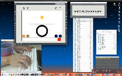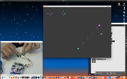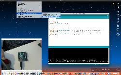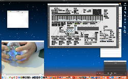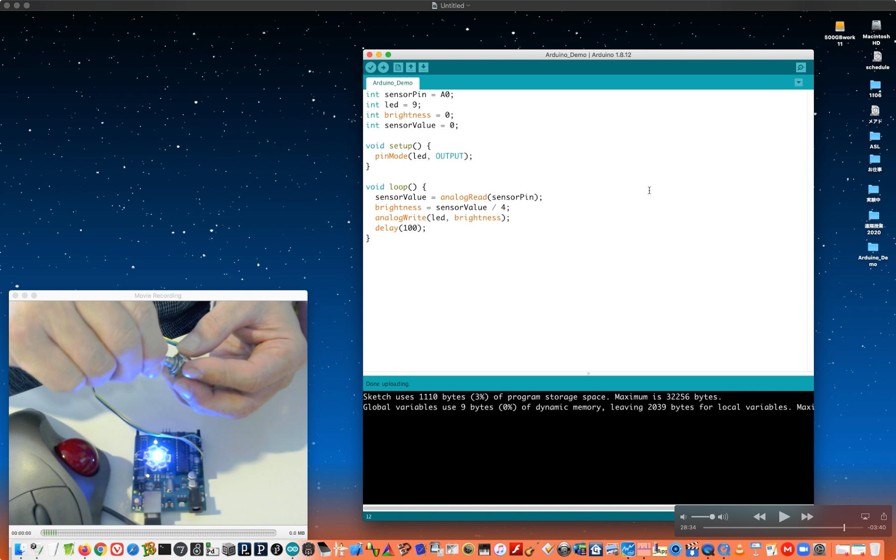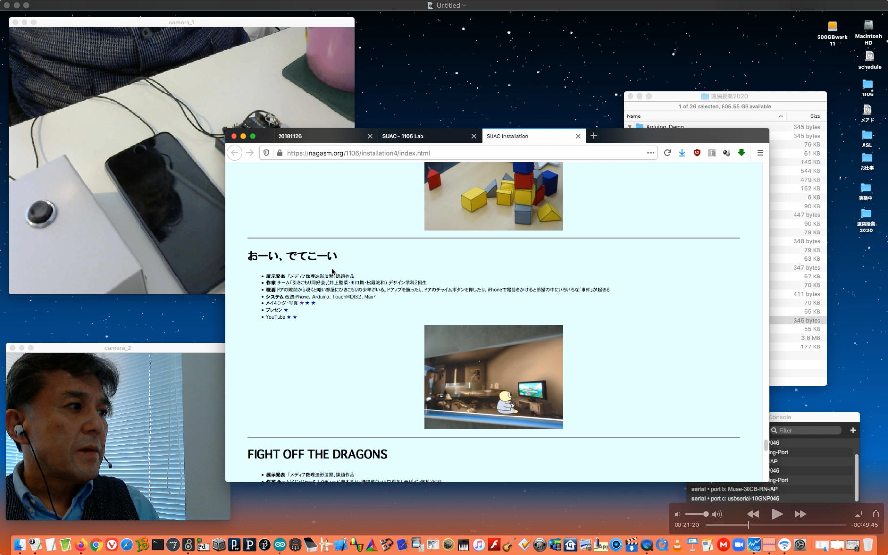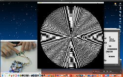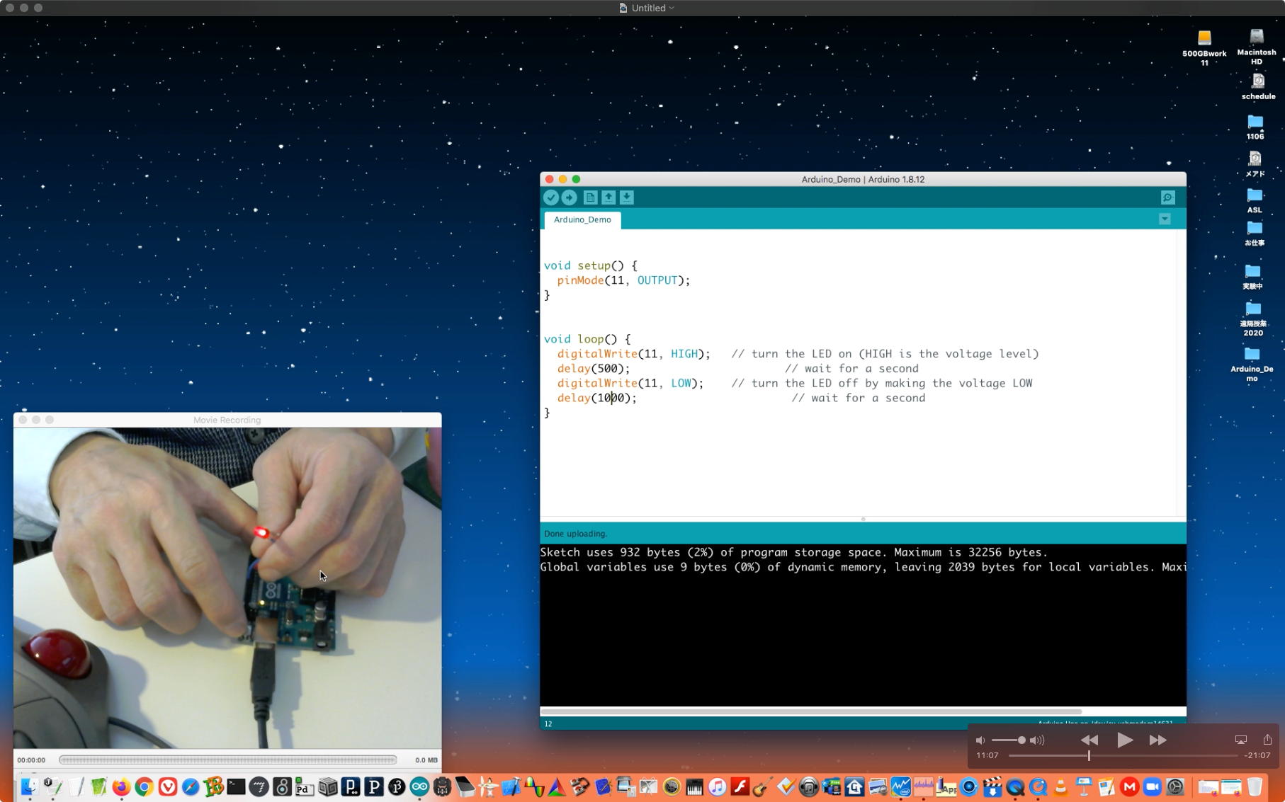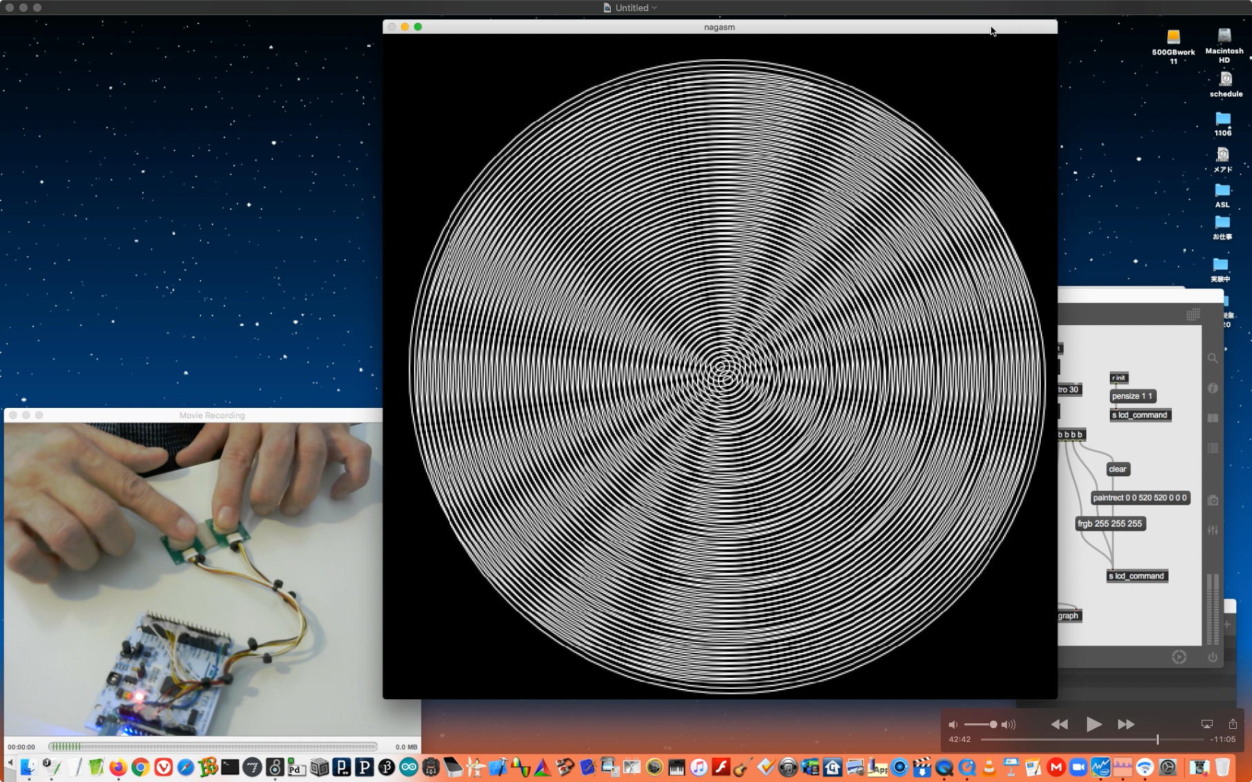 午後には、Arduinoの搭載されたいろいろなボード(各種センサ)を持ち出したが今日はそこまで行かず、上のように「Arduinoの基本」という30分ほどの この動画 を作ったところでオシマイとなった。 Max(jitter)でカメラ2台を同時に使うところは良かったのだが、Maxが起動しているとWebだけでなくArduino IDEも激重になった(^_^;)ので断念して、QuickTimePlayer7Proの「Video Recording」画面で1つだけWebカメラを表示した状態で、QuickTimePlayerXの「Desktop Recording」で全体を一発撮りする、という方法を採用した。 終わってみると所要時間が「59分」とか言われたので、またまたYouTubeへのアップロードを放置したまま帰宅することにした。