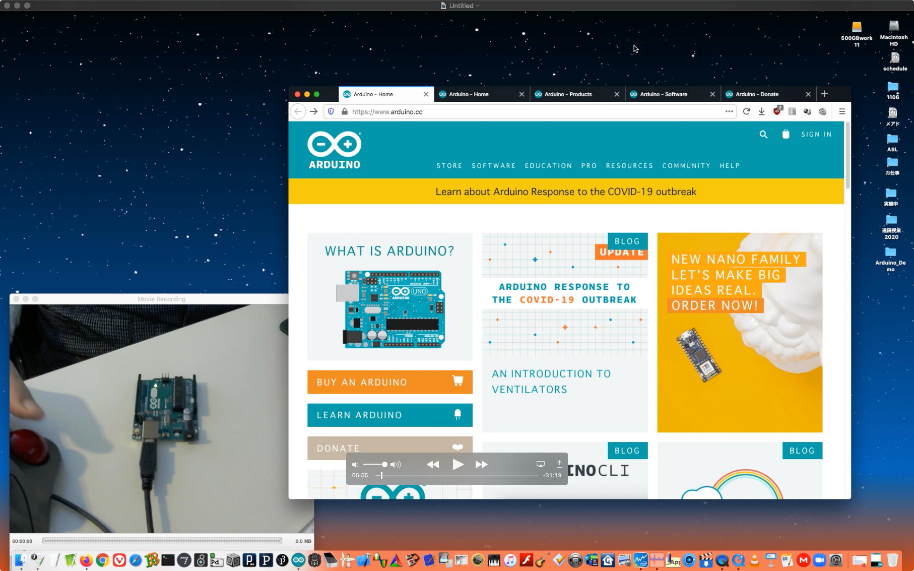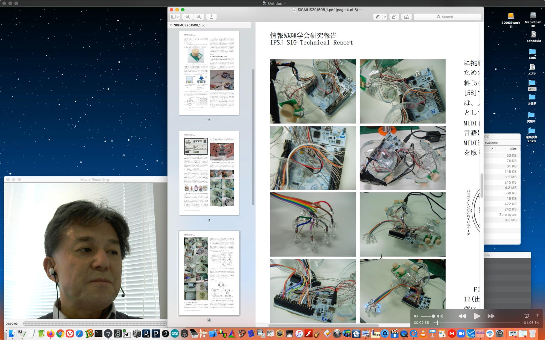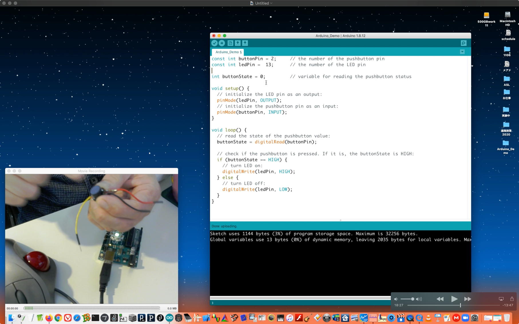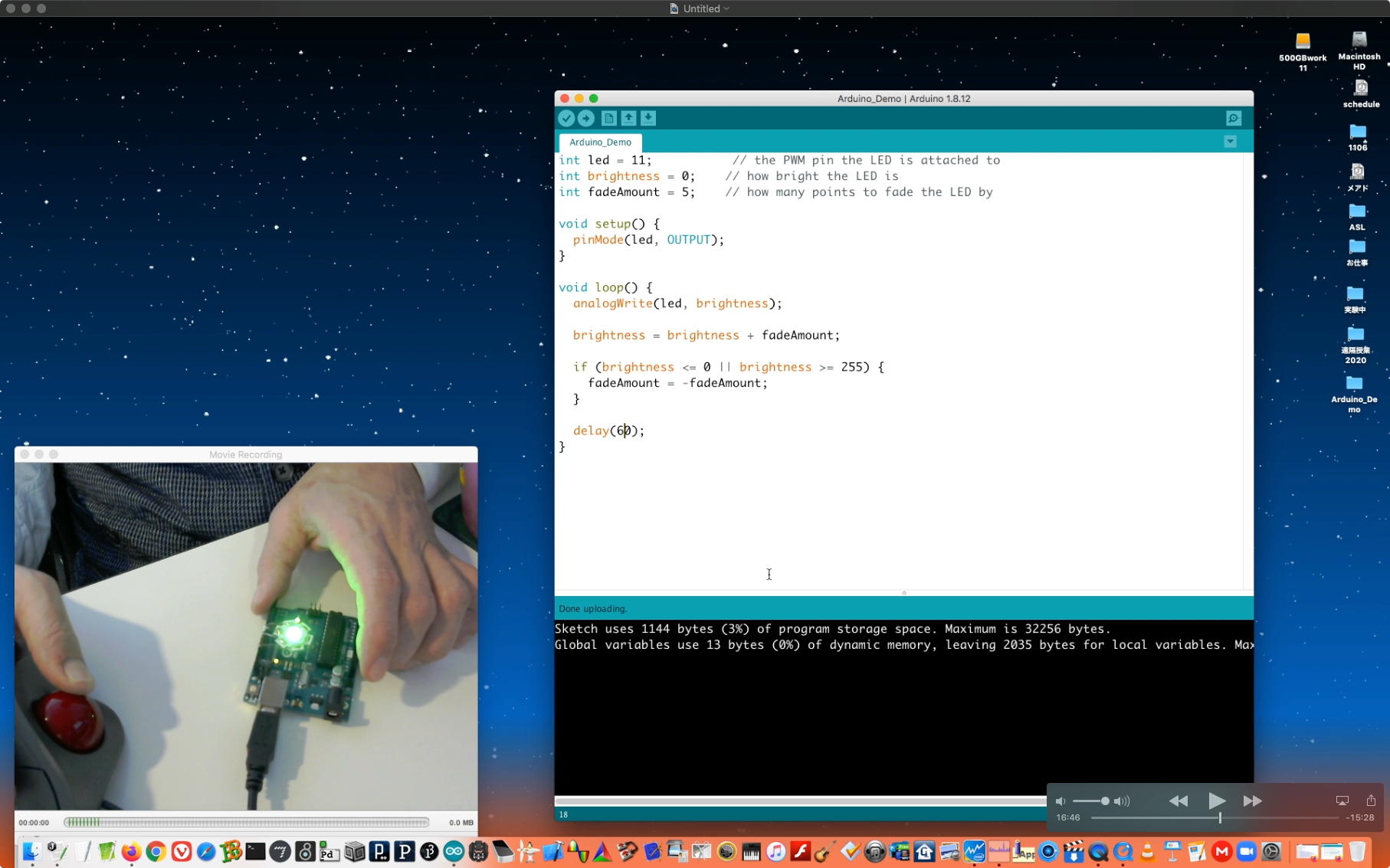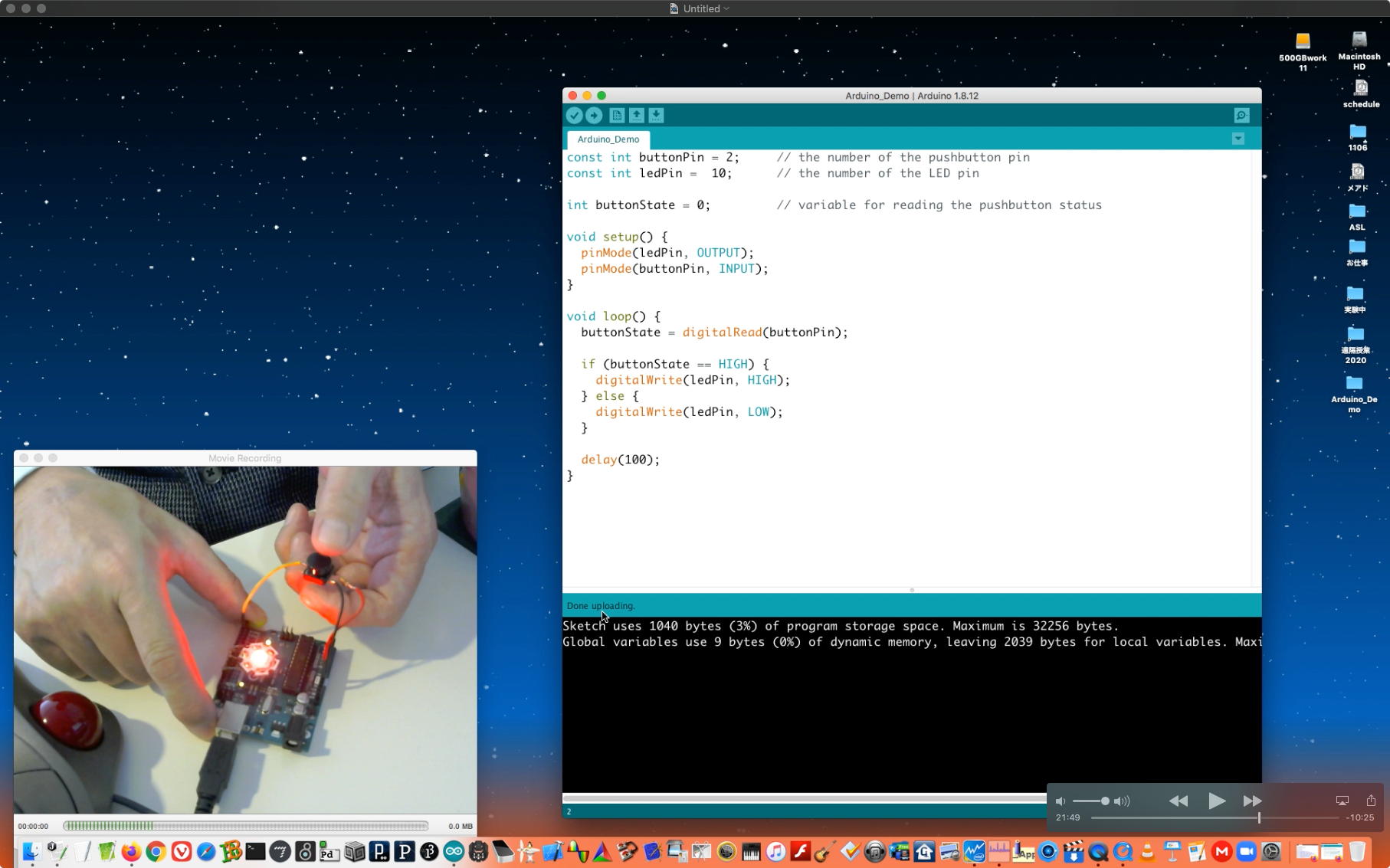 午後には、Arduinoの搭載されたいろいろなボード(各種センサ)を持ち出したが今日はそこまで行かず、上のように「Arduinoの基本」という30分ほどの この動画 を作ったところでオシマイとなった。 Max(jitter)でカメラ2台を同時に使うところは良かったのだが、Maxが起動しているとWebだけでなくArduino IDEも激重になった(^_^;)ので断念して、QuickTimePlayer7Proの「Video Recording」画面で1つだけWebカメラを表示した状態で、QuickTimePlayerXの「Desktop Recording」で全体を一発撮りする、という方法を採用した。 終わってみると所要時間が「59分」とか言われたので、またまたYouTubeへのアップロードを放置したまま帰宅することにした。