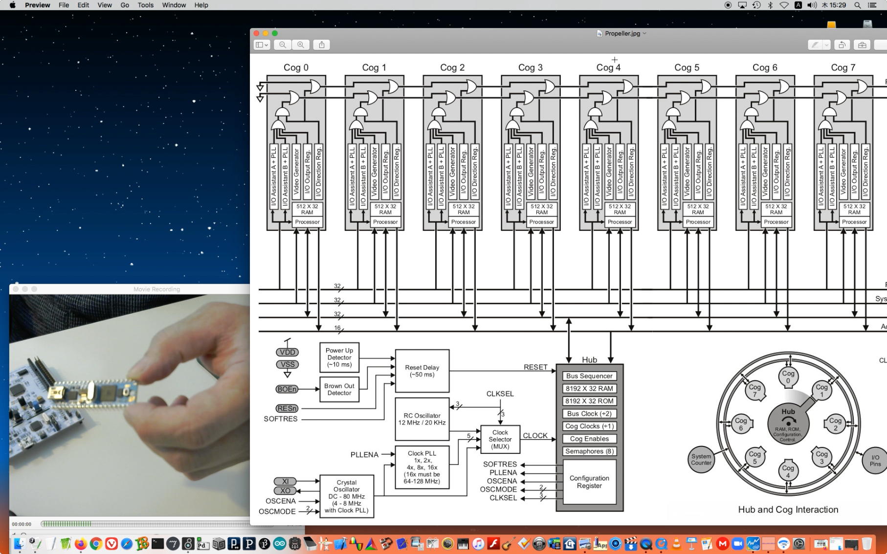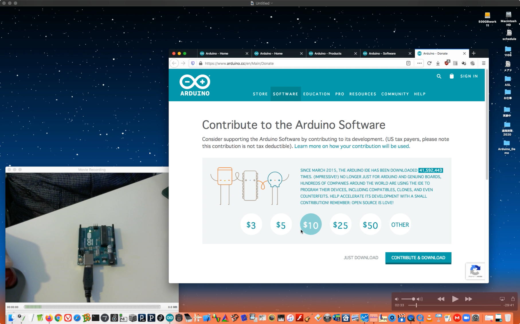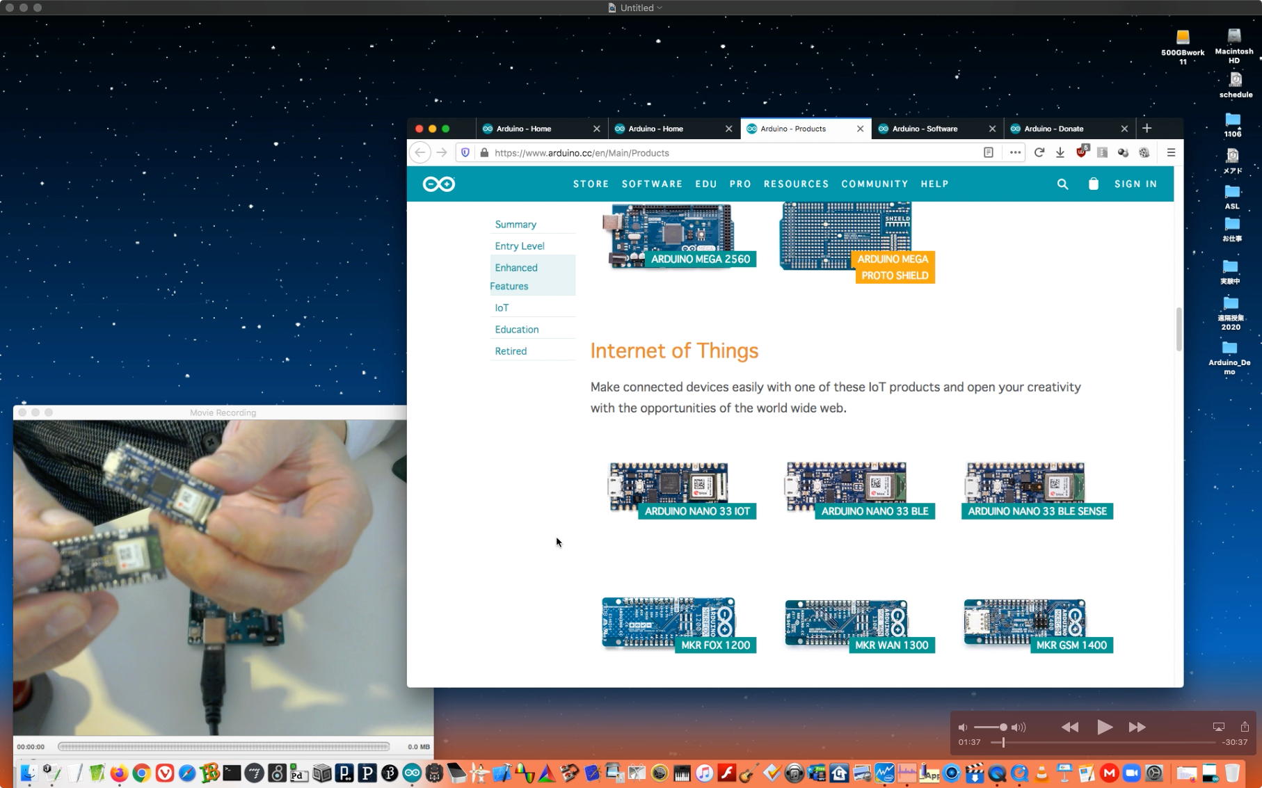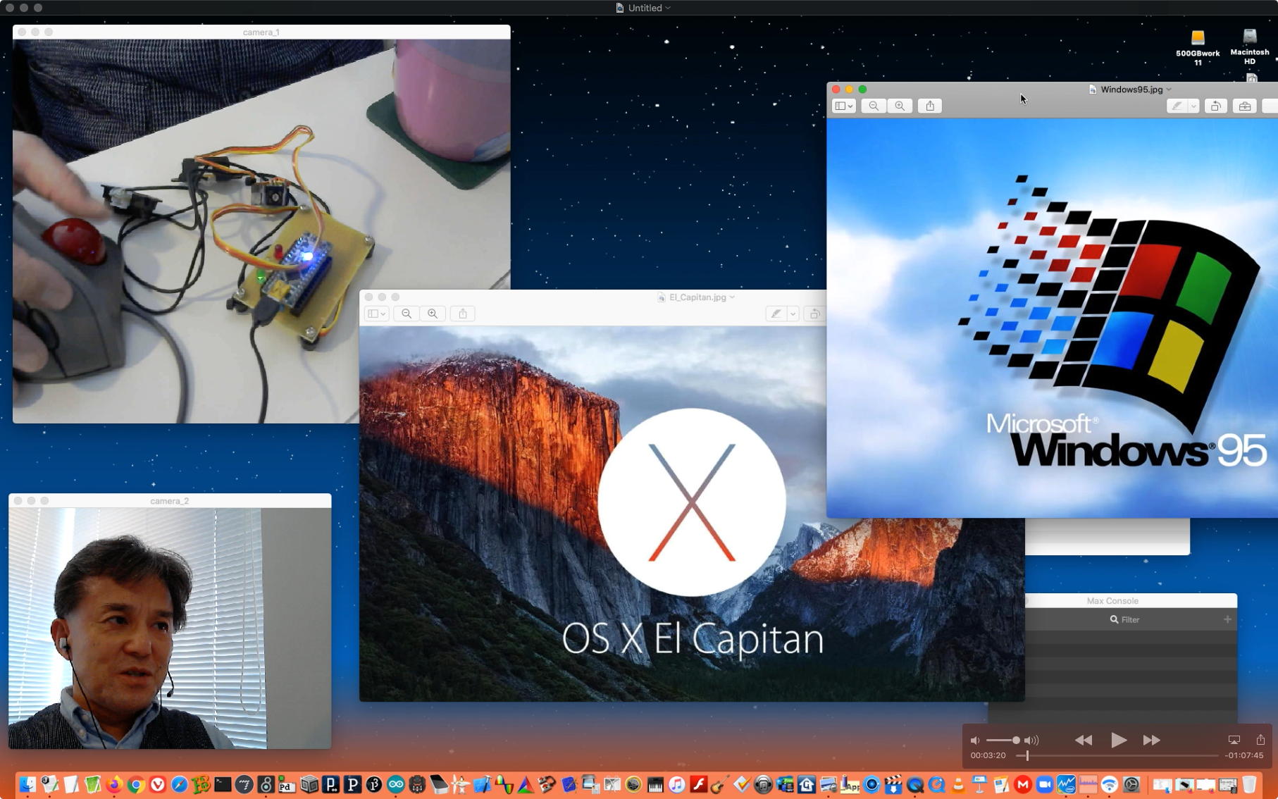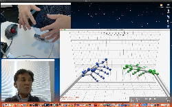 午後には、Arduinoの搭載されたいろいろなボード(各種センサ)を持ち出したが今日はそこまで行かず、上のように「Arduinoの基本」という30分ほどの この動画 を作ったところでオシマイとなった。 Max(jitter)でカメラ2台を同時に使うところは良かったのだが、Maxが起動しているとWebだけでなくArduino IDEも激重になった(^_^;)ので断念して、QuickTimePlayer7Proの「Video Recording」画面で1つだけWebカメラを表示した状態で、QuickTimePlayerXの「Desktop Recording」で全体を一発撮りする、という方法を採用した。 終わってみると所要時間が「59分」とか言われたので、またまたYouTubeへのアップロードを放置したまま帰宅することにした。