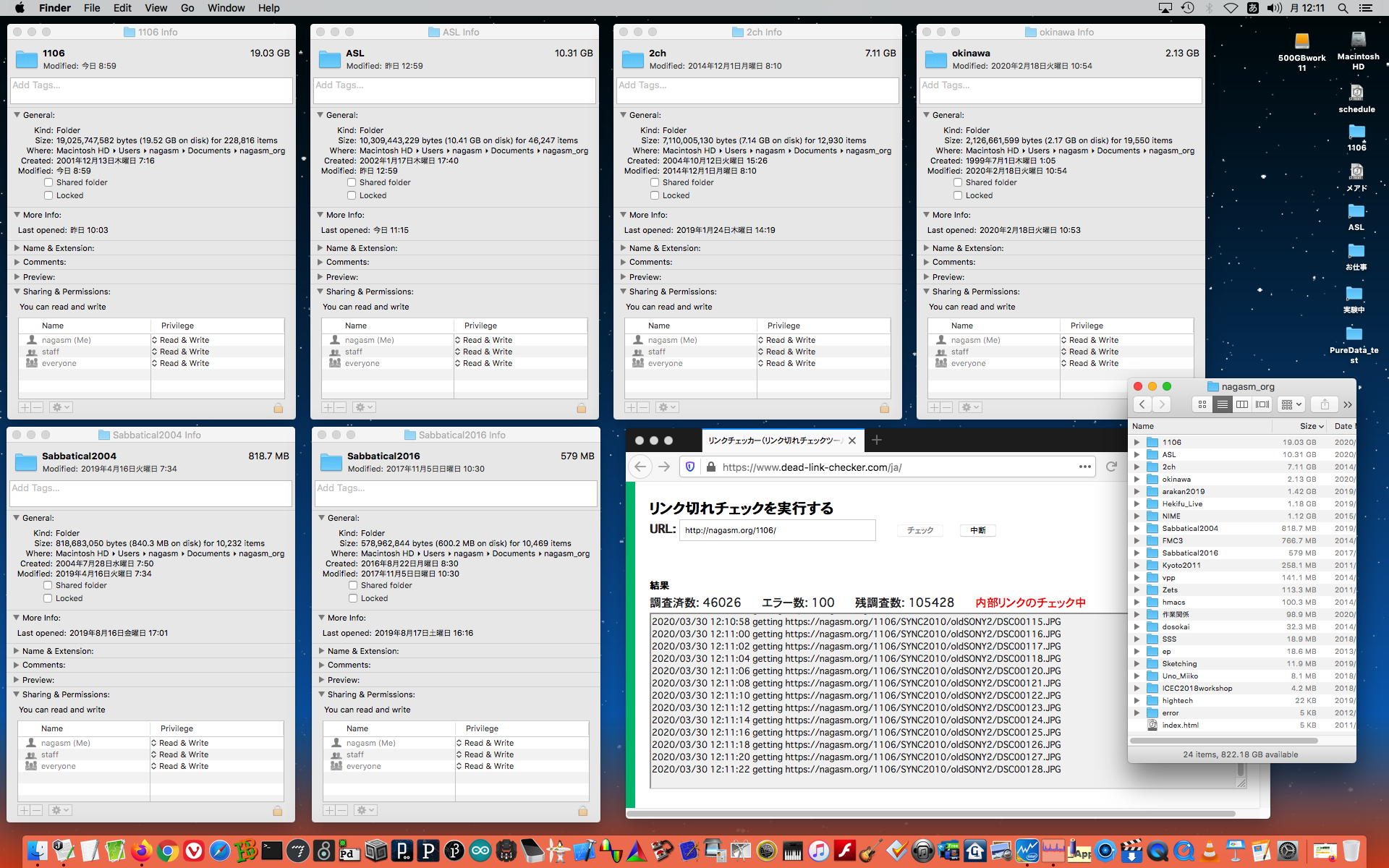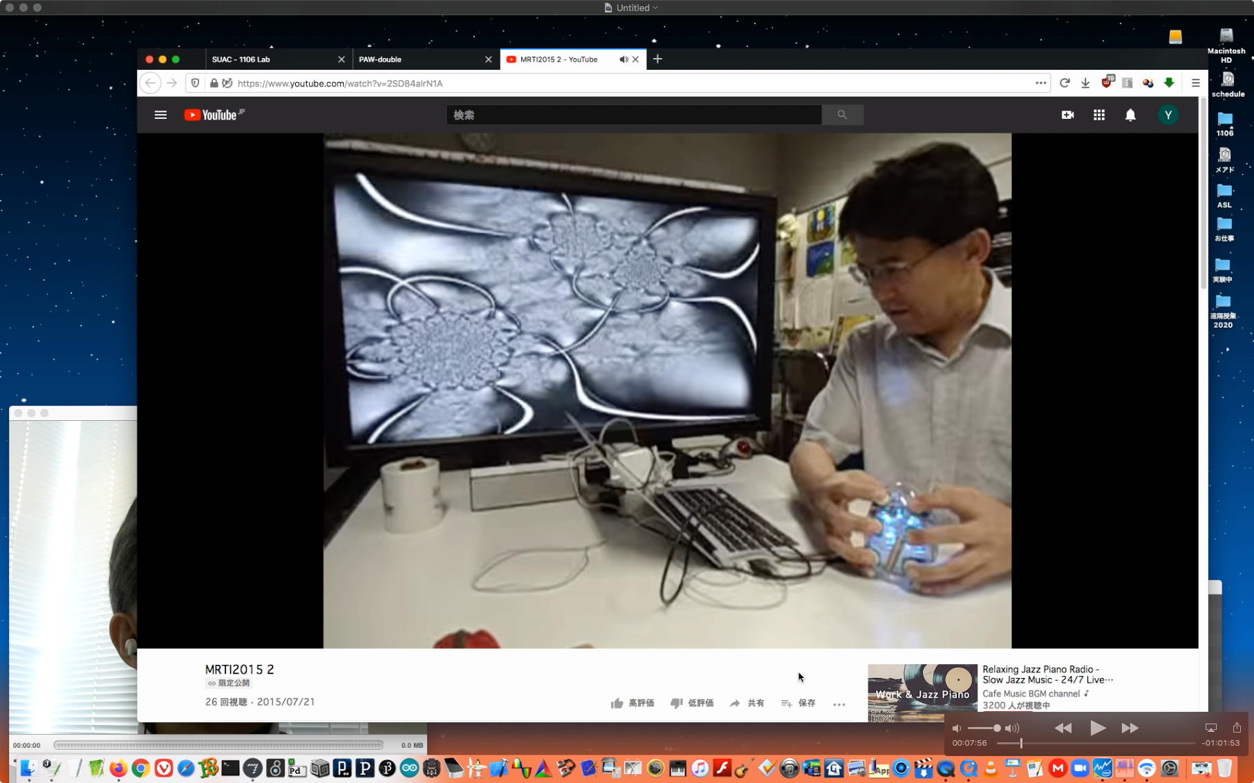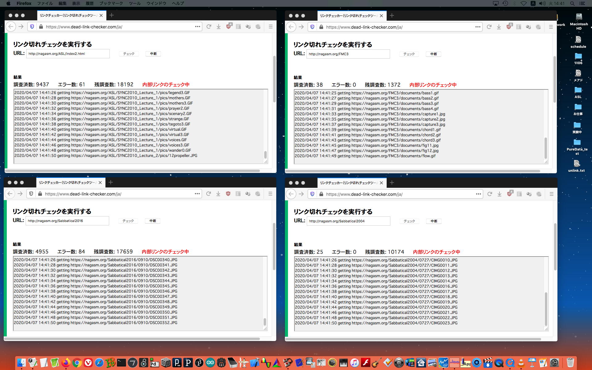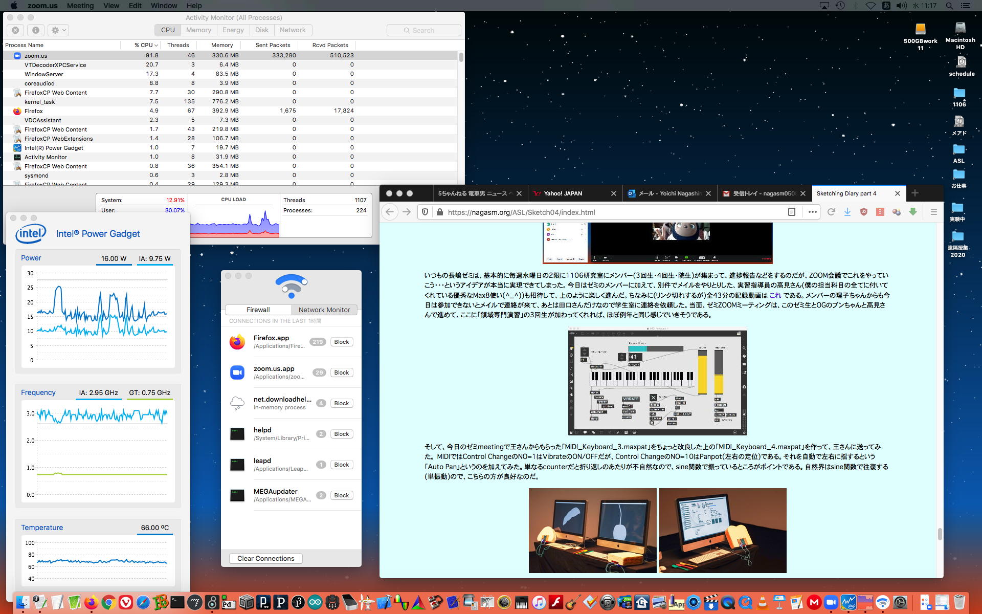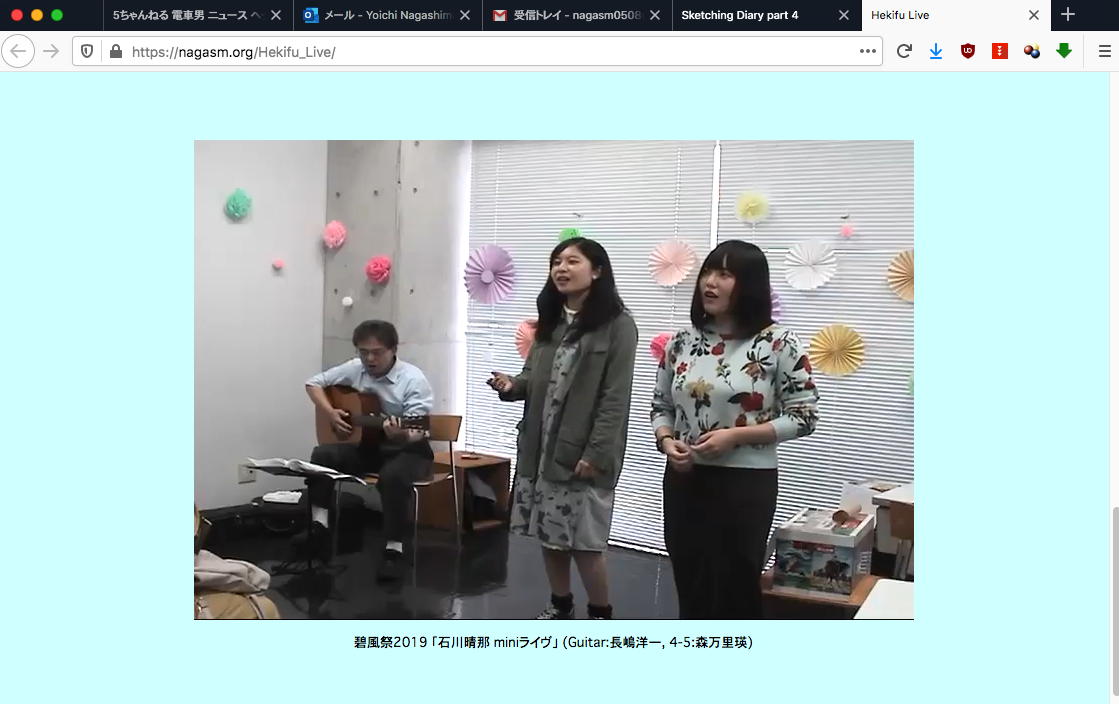 ちょっと思いついて、前年度の後期、「メディア数理造形演習」や「基礎演習E」で一緒に頑張った学生、あとアカペラのメンバーに、以下のようなメイルをBCCで送って、以下のように 研究室の環境 (お仕事Macの他に3台のMacBookAirも同時に走らせて4クライアントのZOOM会議をずっと走らせる)を整えてみた。 さすがに当日の反応というのは無いだろうが、いつでもどうぞ、というのも面白い。長嶋です。このメイルは去年あたり一緒に何かやった学生のアドレスにBCCで出しています。 前期は全て遠隔授業で学生は入構制限・・・という案内がおいおい出てくると思いますが、 それに備えて以下のようなページを作って実験しています。 https://nagasm.org/1106/ZOOM/ 興味のある人は可能な範囲でいつでも対応しますので、一度、おいで下さい。 当面はこの情報はSUAC学生全体には流さないで予備的な実験にご協力下さい。(_o_)