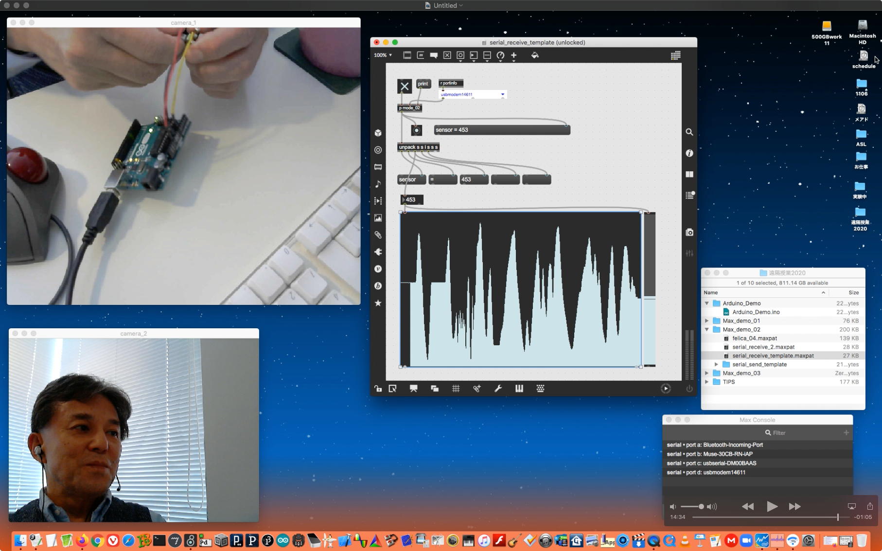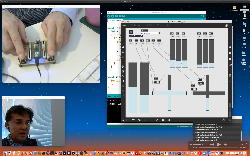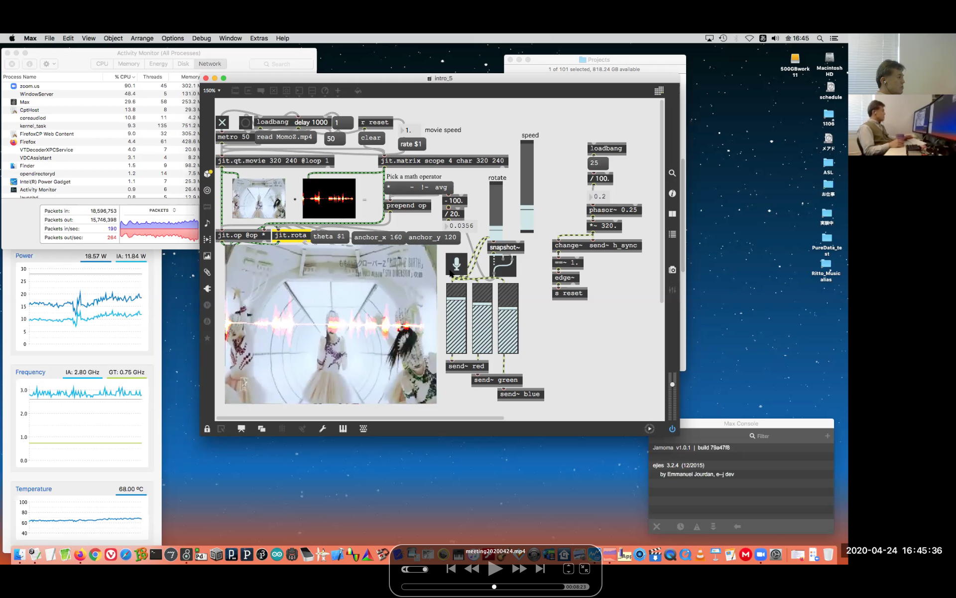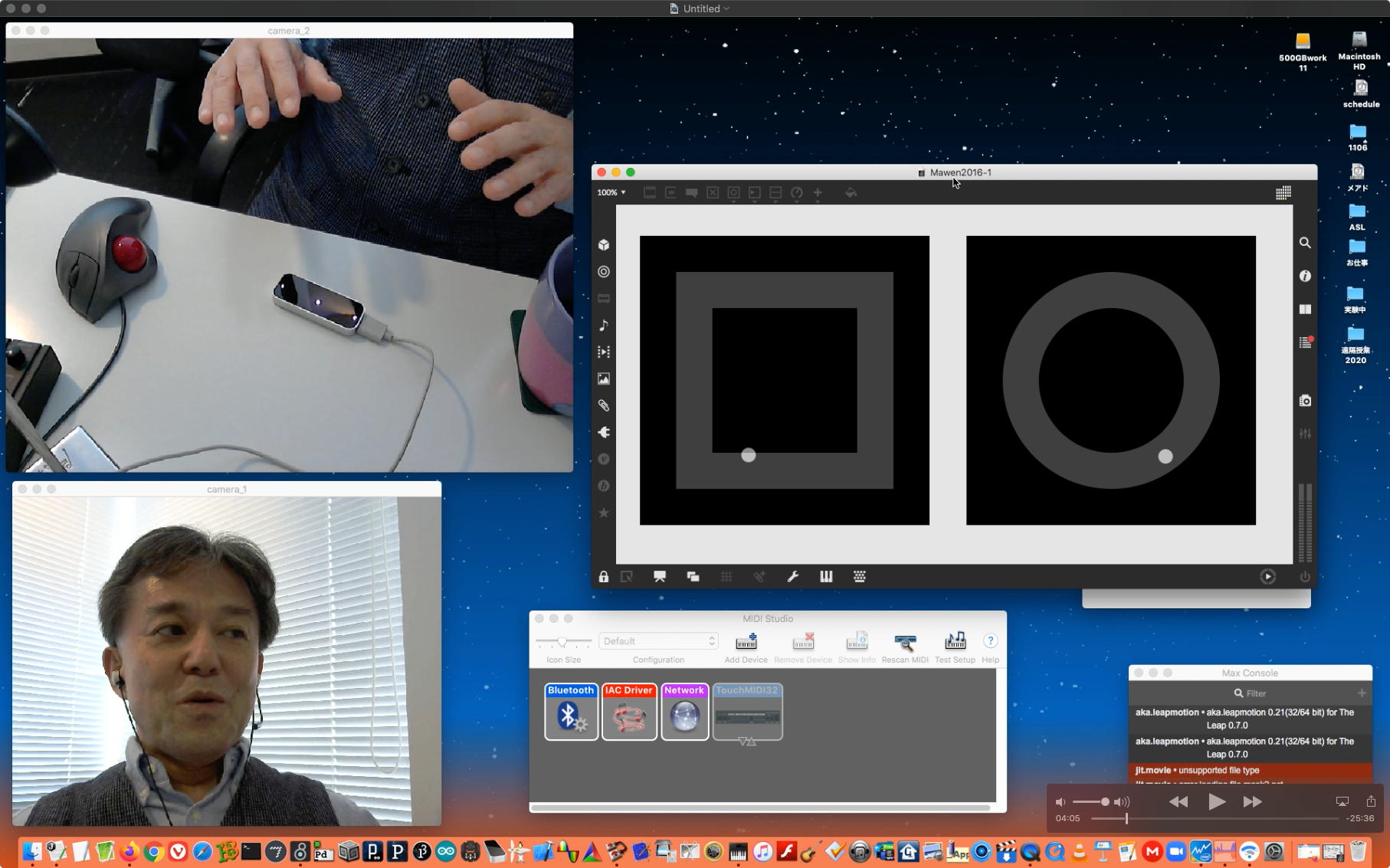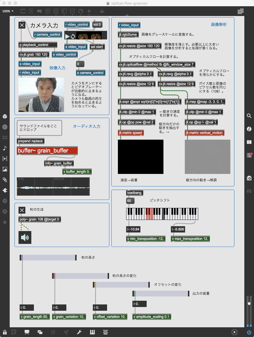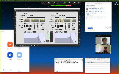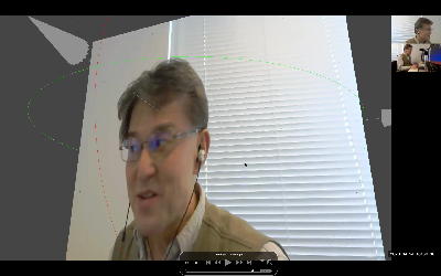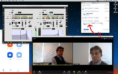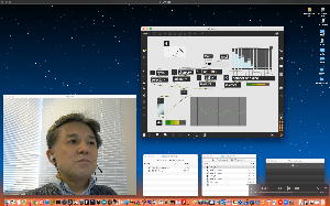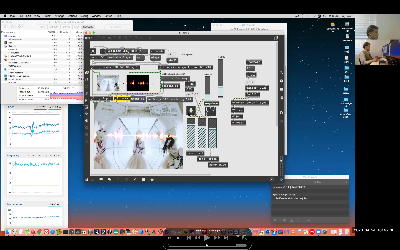 そして夕方には このように 研究室内の2台だけのZOOMを稼働させて、Mac内蔵音源とヘッドセットのマイクをミキシングした環境で「ZOOMでライヴにMax8を走らせる」ことが出来るかどうか・・・というテストをした。 MaxとMSPとはまぁOKだったが、究極のイジワルtestとして「ZOOMでも使っているWebカメラを画像ソースとしてjitterで処理する」(→フルスクリーン表示)というのを、ZOOMの「スクリーン共有」で送ってみると、かなり超重いことが判明した。 そしてcv.jitの画像認識で「目玉を認識して追従する」というパッチは走っていたが、cv.jitが取得するカメラ画像はほぼ真っ白になっていた。 まぁこれは当然なので、これはライブZOOMでやるのは避けた方がよさそうだ。