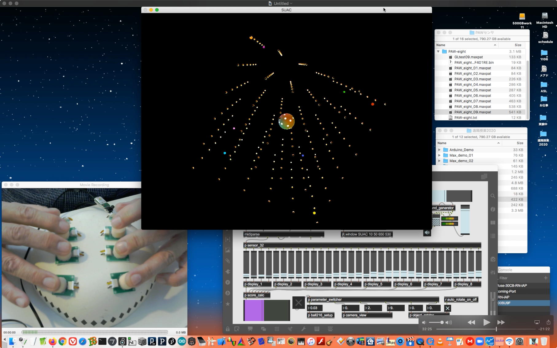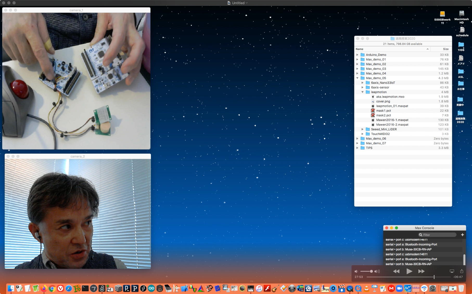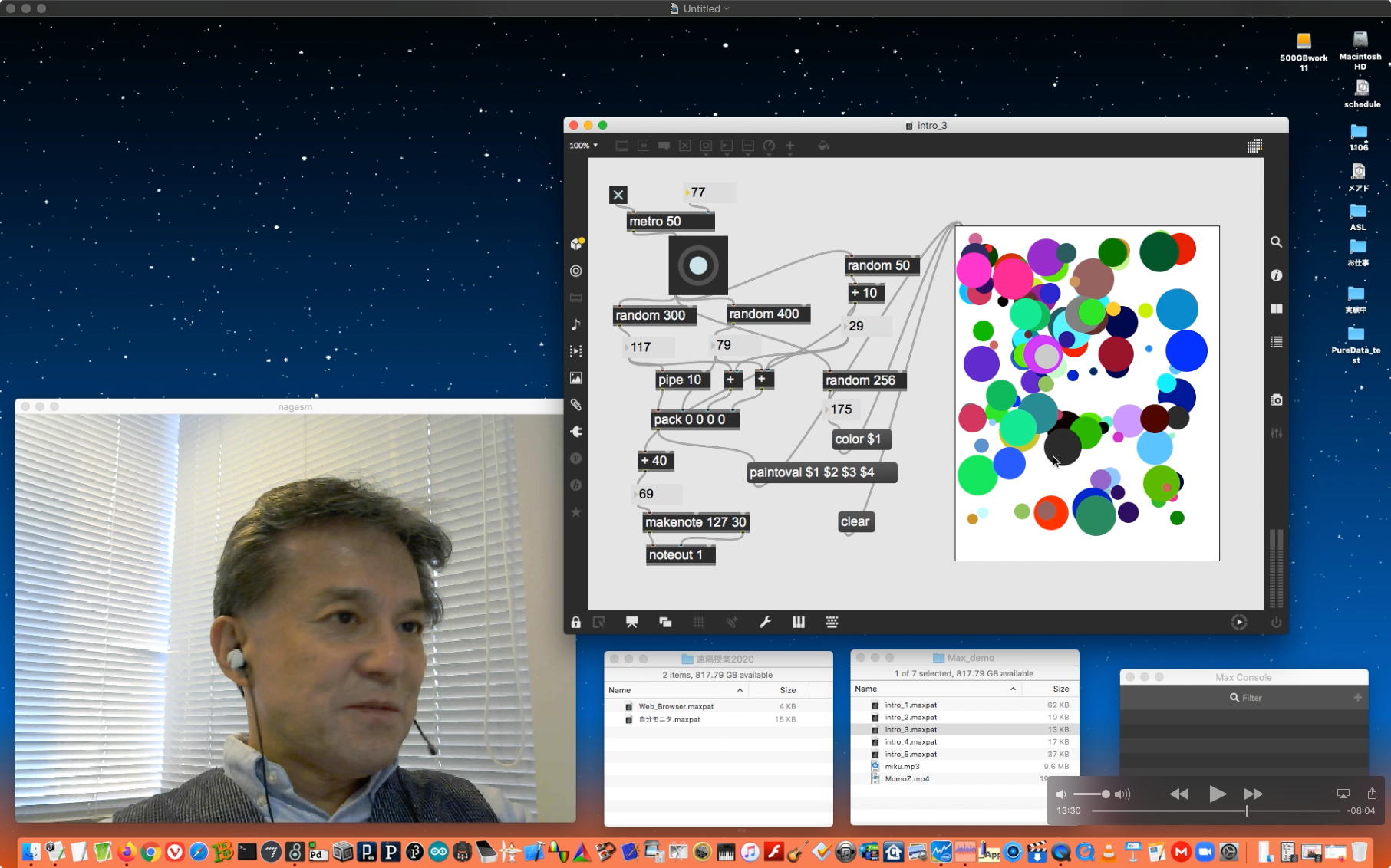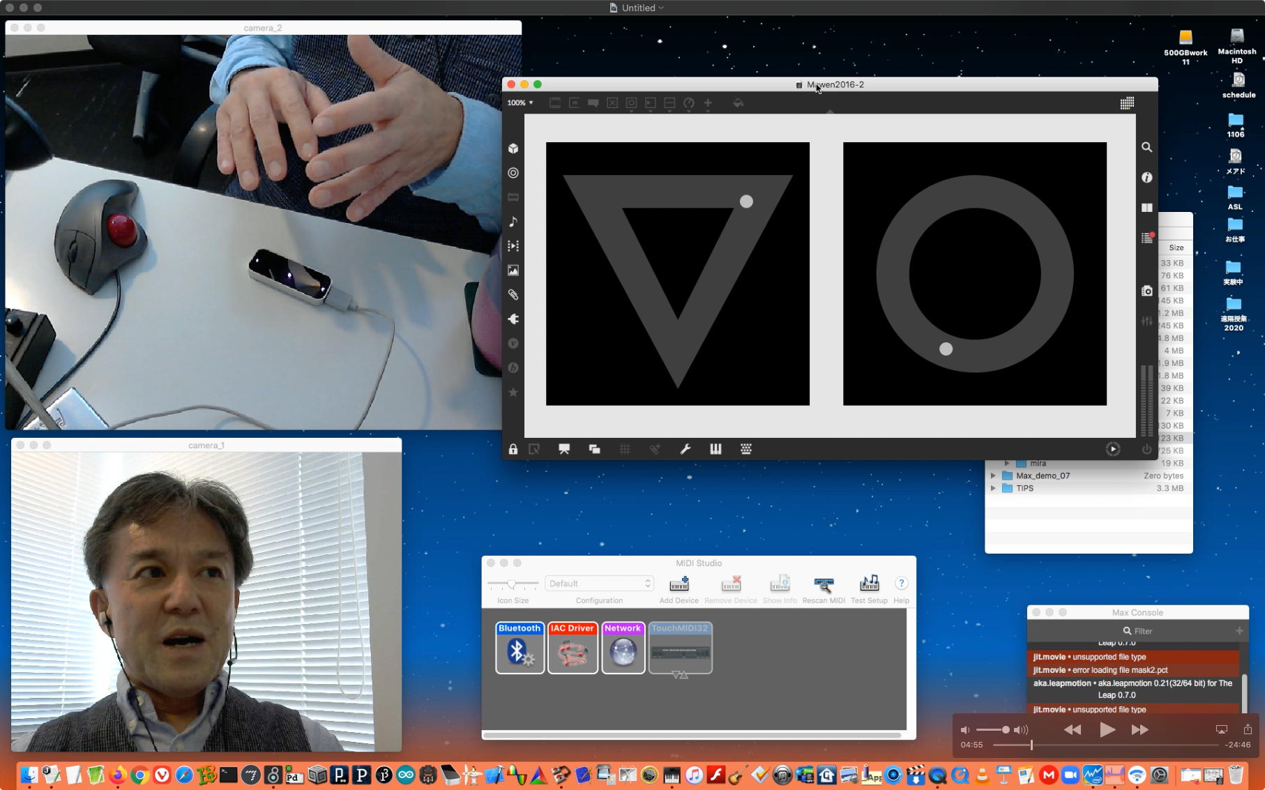 そして夕方には このように 研究室内の2台だけのZOOMを稼働させて、Mac内蔵音源とヘッドセットのマイクをミキシングした環境で「ZOOMでライヴにMax8を走らせる」ことが出来るかどうか・・・というテストをした。 MaxとMSPとはまぁOKだったが、究極のイジワルtestとして「ZOOMでも使っているWebカメラを画像ソースとしてjitterで処理する」(→フルスクリーン表示)というのを、ZOOMの「スクリーン共有」で送ってみると、かなり超重いことが判明した。 そしてcv.jitの画像認識で「目玉を認識して追従する」というパッチは走っていたが、cv.jitが取得するカメラ画像はほぼ真っ白になっていた。 まぁこれは当然なので、これはライブZOOMでやるのは避けた方がよさそうだ。
