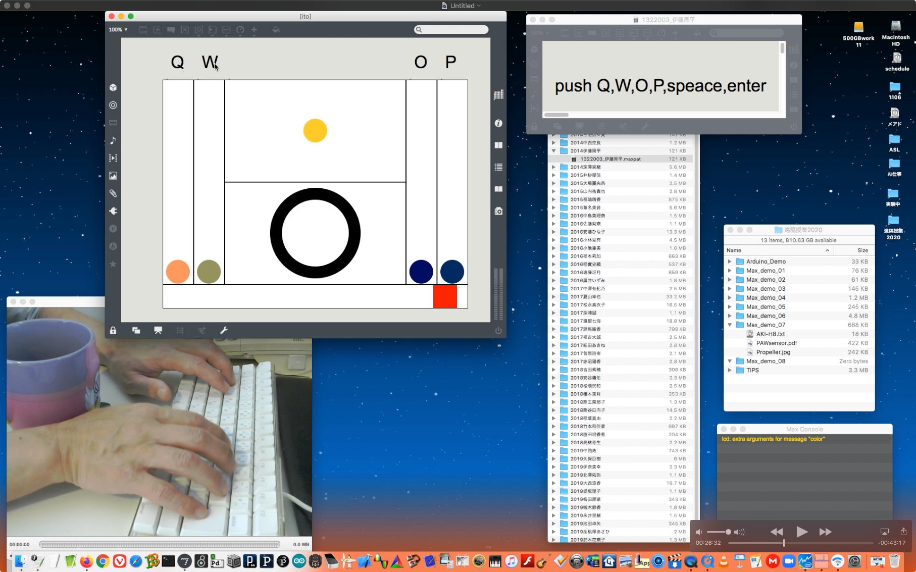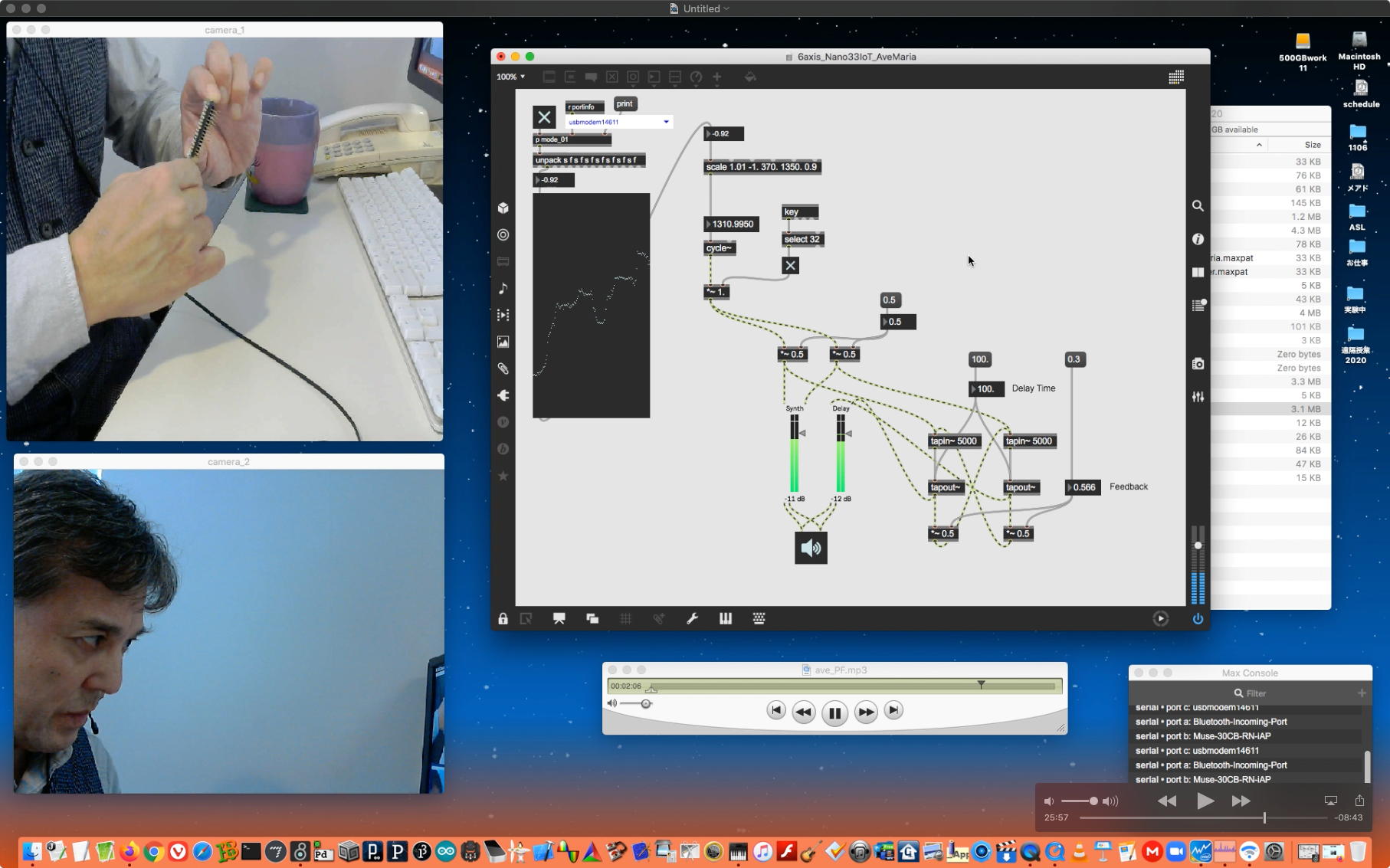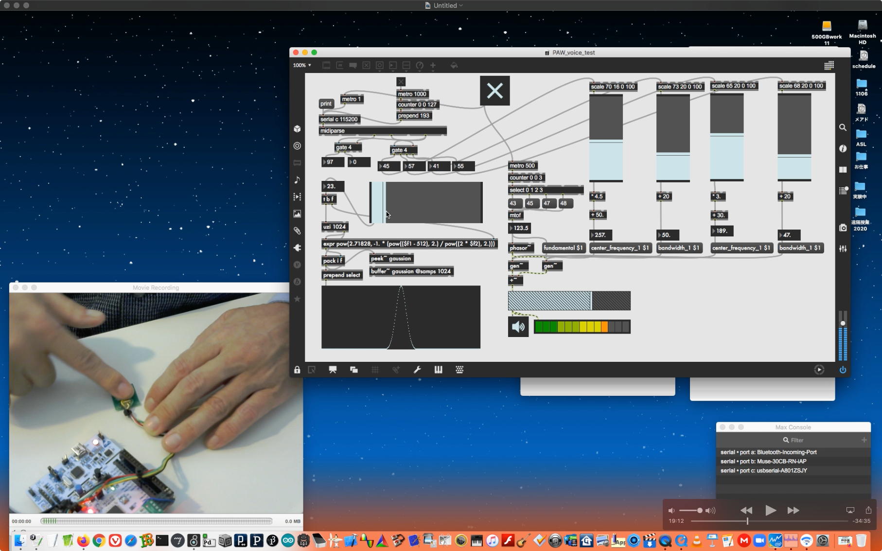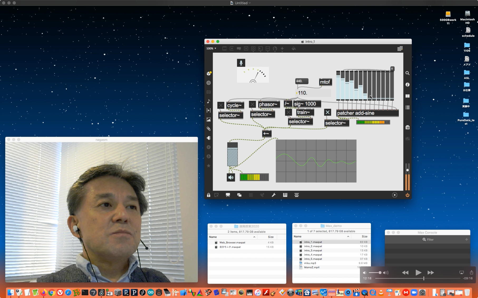 そして夕方には このように 研究室内の2台だけのZOOMを稼働させて、Mac内蔵音源とヘッドセットのマイクをミキシングした環境で「ZOOMでライヴにMax8を走らせる」ことが出来るかどうか・・・というテストをした。 MaxとMSPとはまぁOKだったが、究極のイジワルtestとして「ZOOMでも使っているWebカメラを画像ソースとしてjitterで処理する」(→フルスクリーン表示)というのを、ZOOMの「スクリーン共有」で送ってみると、かなり超重いことが判明した。 そしてcv.jitの画像認識で「目玉を認識して追従する」というパッチは走っていたが、cv.jitが取得するカメラ画像はほぼ真っ白になっていた。 まぁこれは当然なので、これはライブZOOMでやるのは避けた方がよさそうだ。