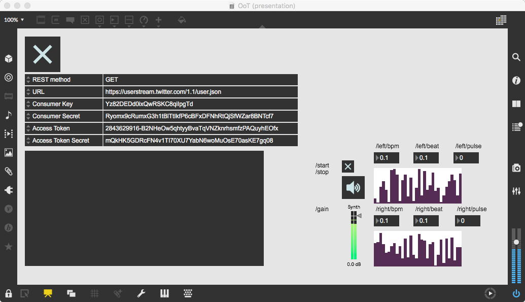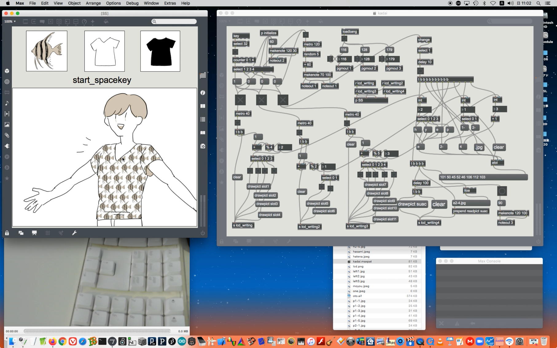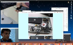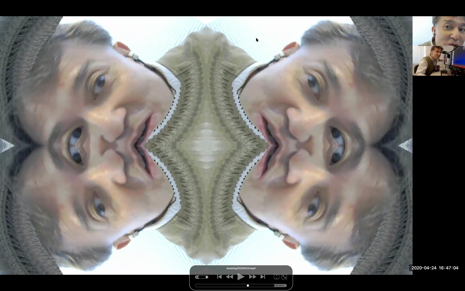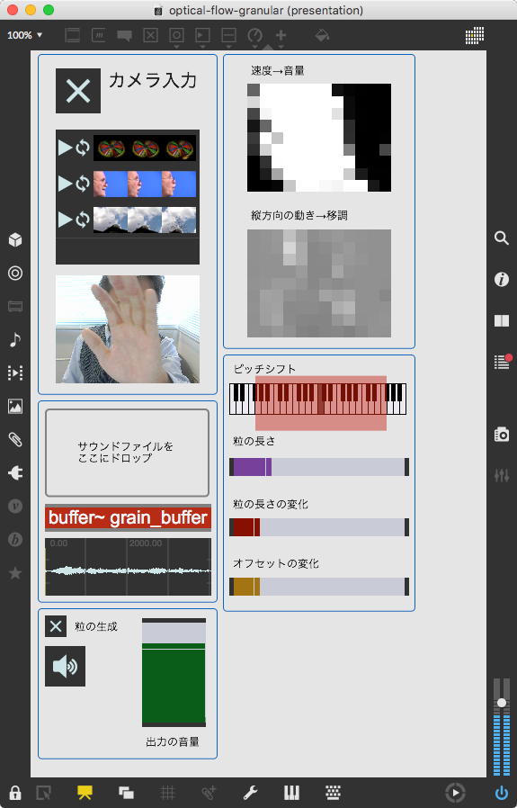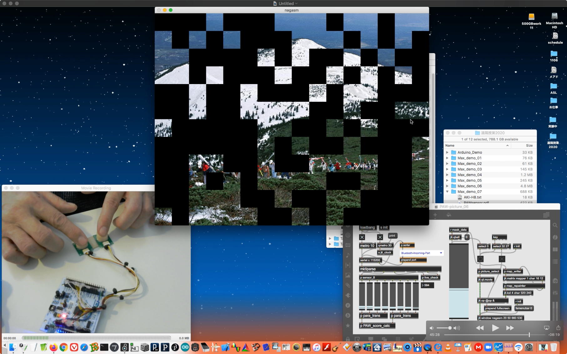 そして夕方には このように 研究室内の2台だけのZOOMを稼働させて、Mac内蔵音源とヘッドセットのマイクをミキシングした環境で「ZOOMでライヴにMax8を走らせる」ことが出来るかどうか・・・というテストをした。 MaxとMSPとはまぁOKだったが、究極のイジワルtestとして「ZOOMでも使っているWebカメラを画像ソースとしてjitterで処理する」(→フルスクリーン表示)というのを、ZOOMの「スクリーン共有」で送ってみると、かなり超重いことが判明した。 そしてcv.jitの画像認識で「目玉を認識して追従する」というパッチは走っていたが、cv.jitが取得するカメラ画像はほぼ真っ白になっていた。 まぁこれは当然なので、これはライブZOOMでやるのは避けた方がよさそうだ。