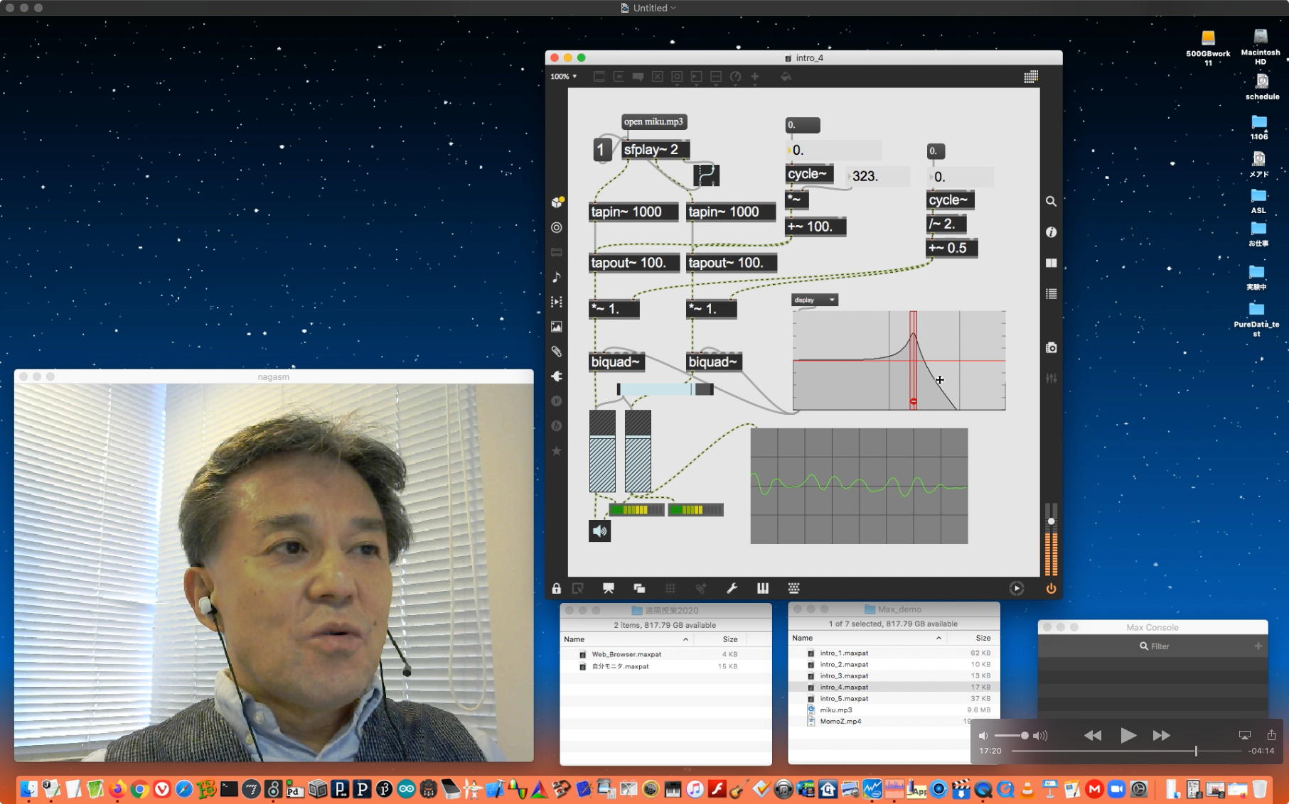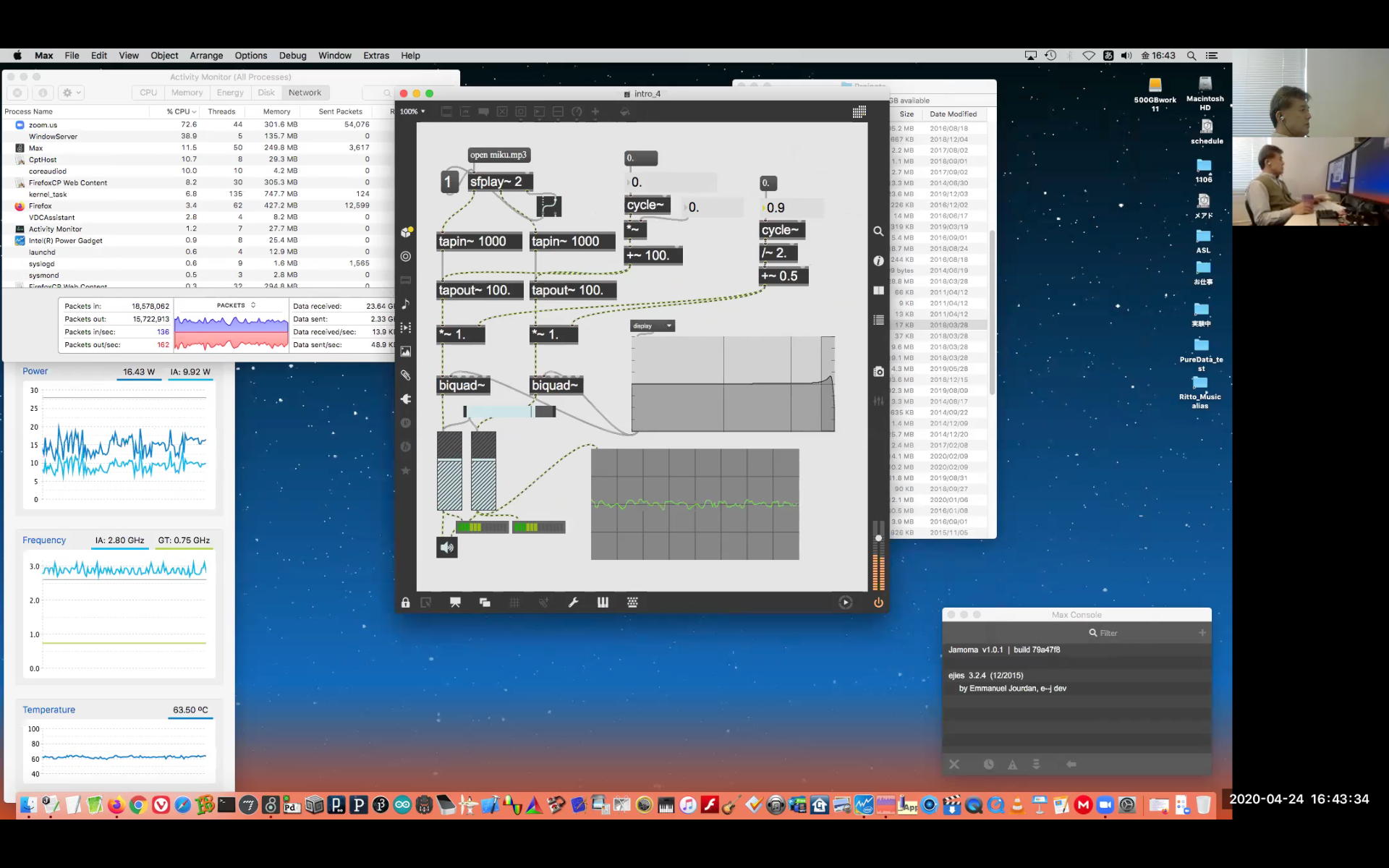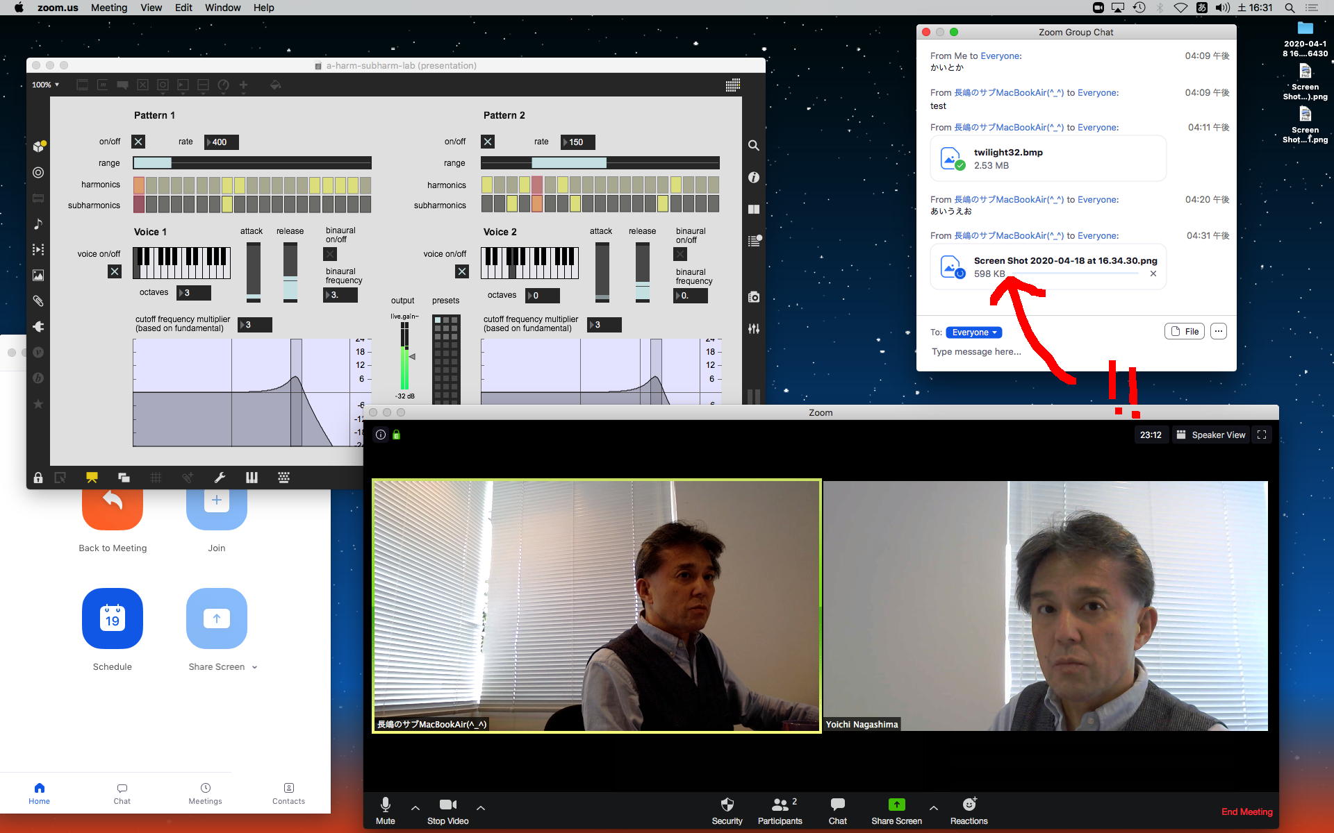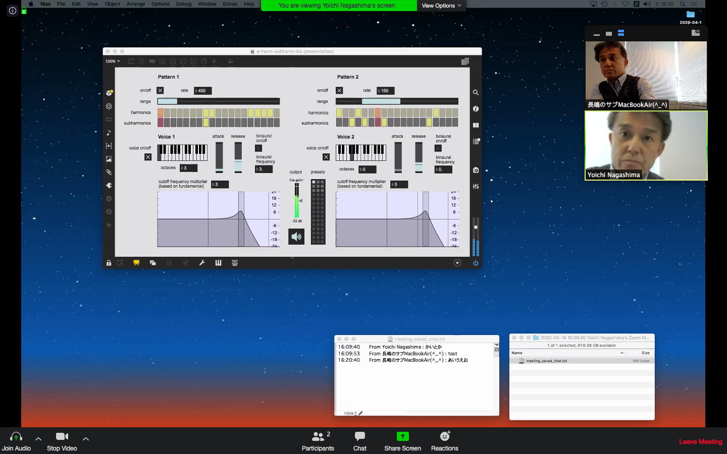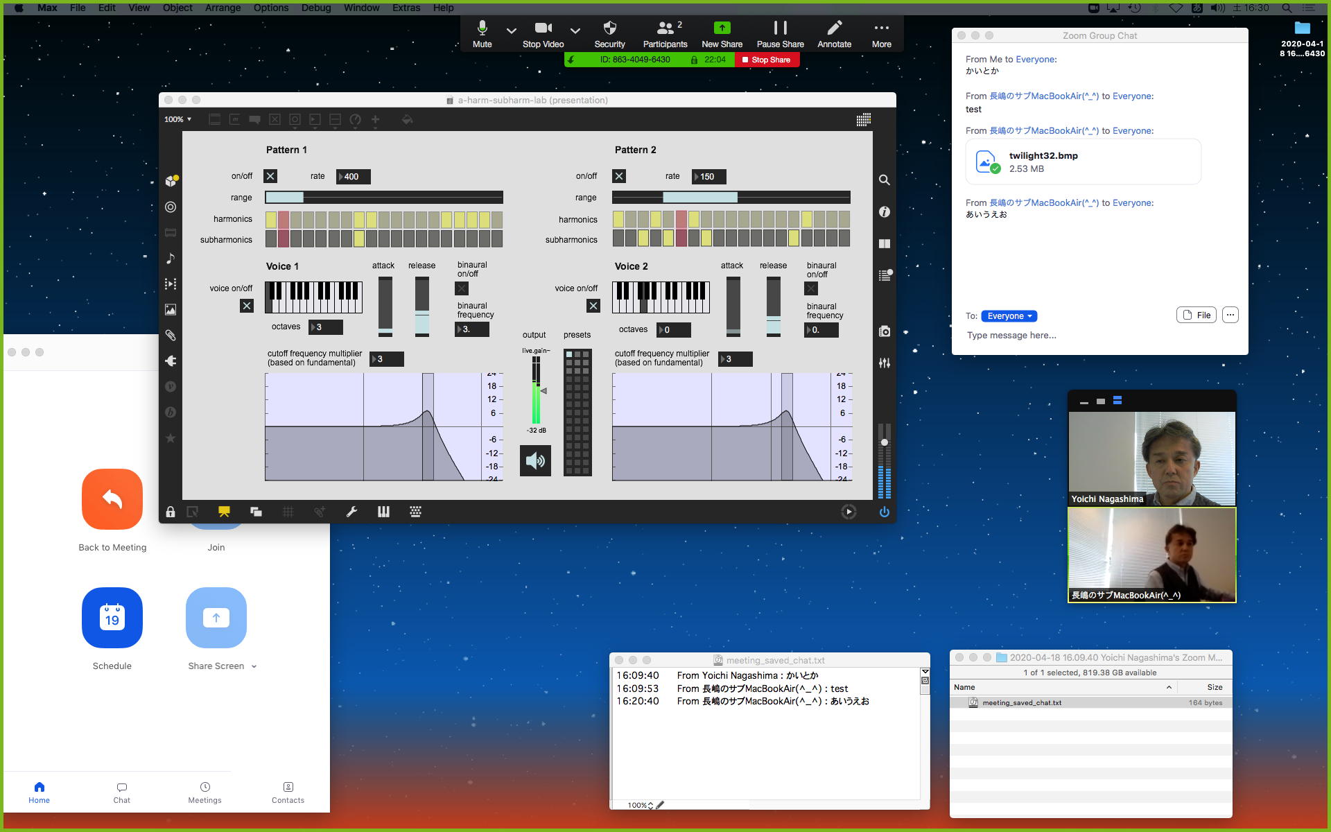 さて、ちょっと前からの懸案の再チェックである。 以下のように、ホストの方でMax8のパッチを走らせ続けてみると、一応はちゃんと動いて、それをデスクトップ共有でクライアントにもライブ配信できた。 そこでクライアントの方でスクリーンショットを撮って、そのデータをチャットに上げて共有すると、ホストのチャット画面にもサッとそれは現れた。 ところが、Max8のパッチを走らせたままホストがこの共有しているスクリーンショットをクリックしてダウンロードしようとすると、グルグルが回っているのにデータが一向に移ってこない、という問題の現象が現れた。 そしてMax8をQuitしてみると、ようやくダウンロードがちゃんと始まって、今度はサッとデータがダウンロードフォルダの中に保存された。 つまりやはり、「Max8はネット処理を邪魔している」のだった。(;_;)