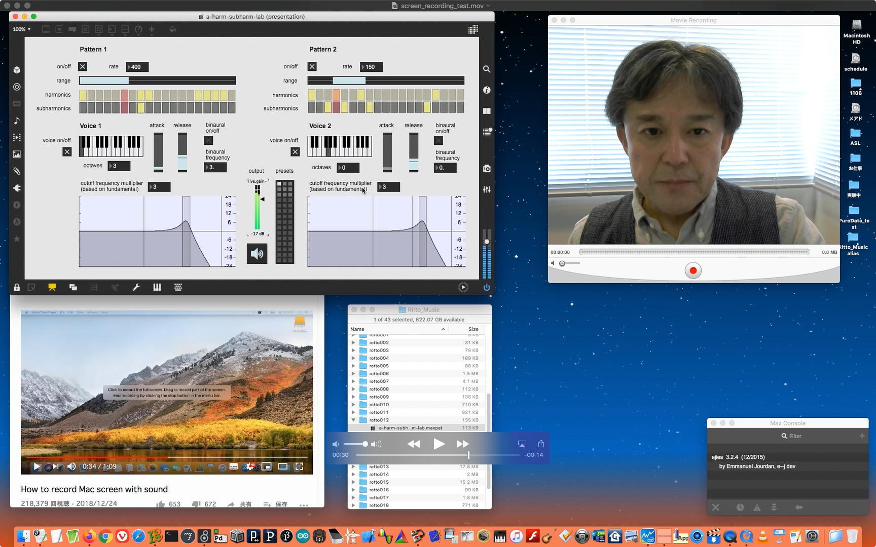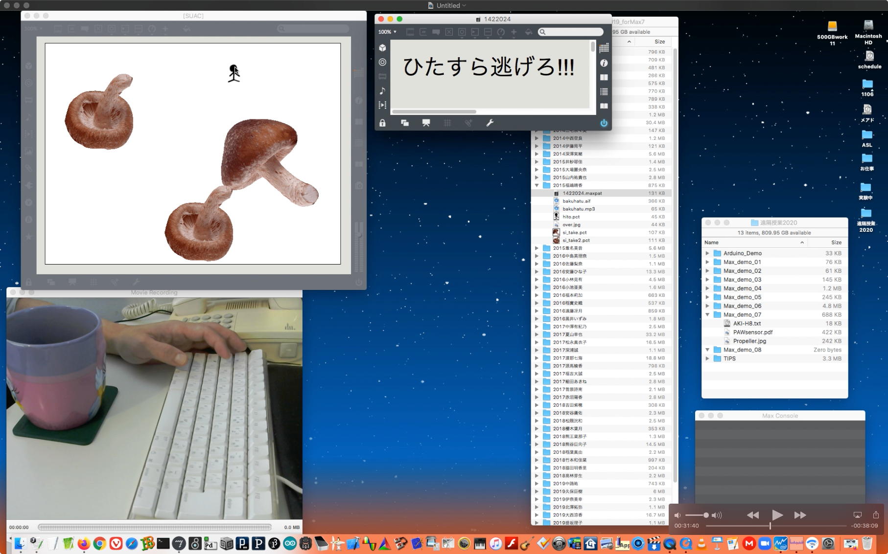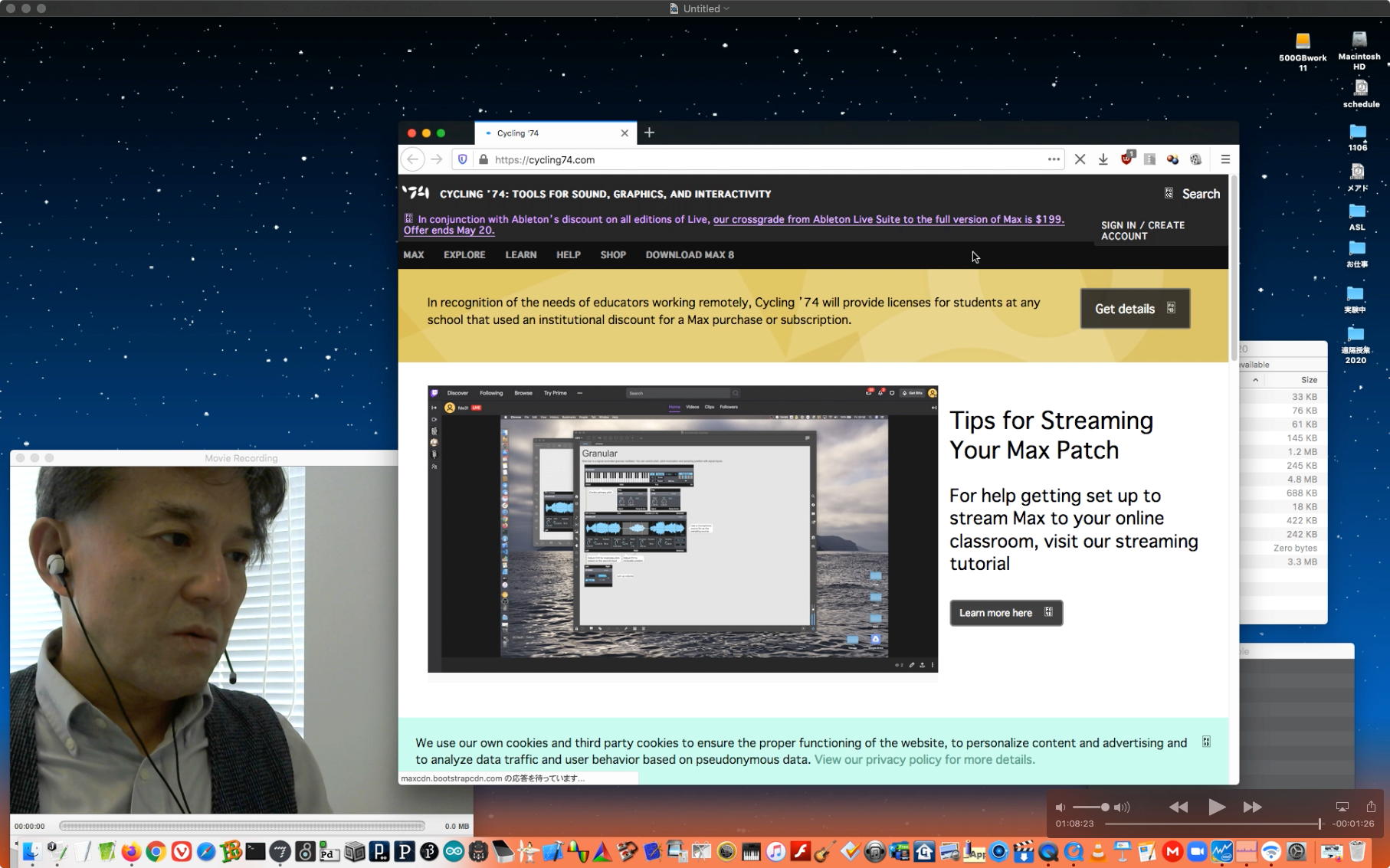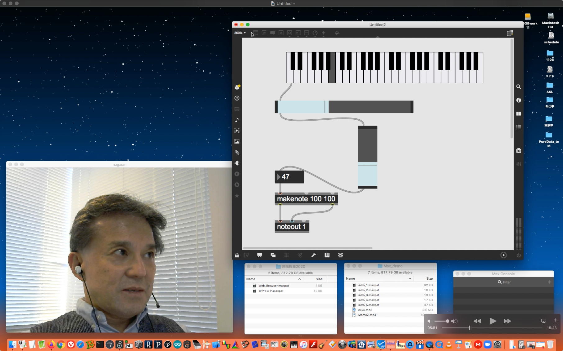 さて、ちょっと前からの懸案の再チェックである。 以下のように、ホストの方でMax8のパッチを走らせ続けてみると、一応はちゃんと動いて、それをデスクトップ共有でクライアントにもライブ配信できた。 そこでクライアントの方でスクリーンショットを撮って、そのデータをチャットに上げて共有すると、ホストのチャット画面にもサッとそれは現れた。 ところが、Max8のパッチを走らせたままホストがこの共有しているスクリーンショットをクリックしてダウンロードしようとすると、グルグルが回っているのにデータが一向に移ってこない、という問題の現象が現れた。 そしてMax8をQuitしてみると、ようやくダウンロードがちゃんと始まって、今度はサッとデータがダウンロードフォルダの中に保存された。 つまりやはり、「Max8はネット処理を邪魔している」のだった。(;_;)