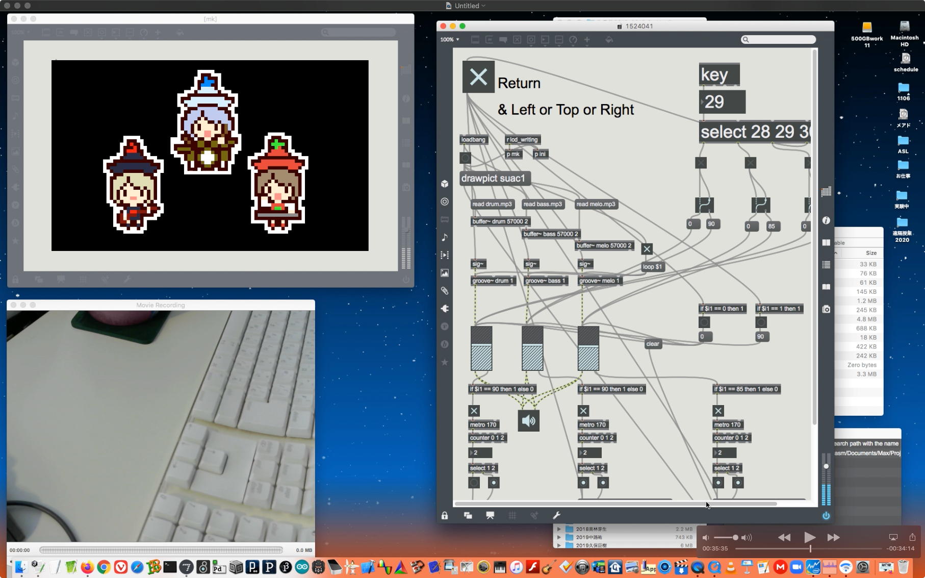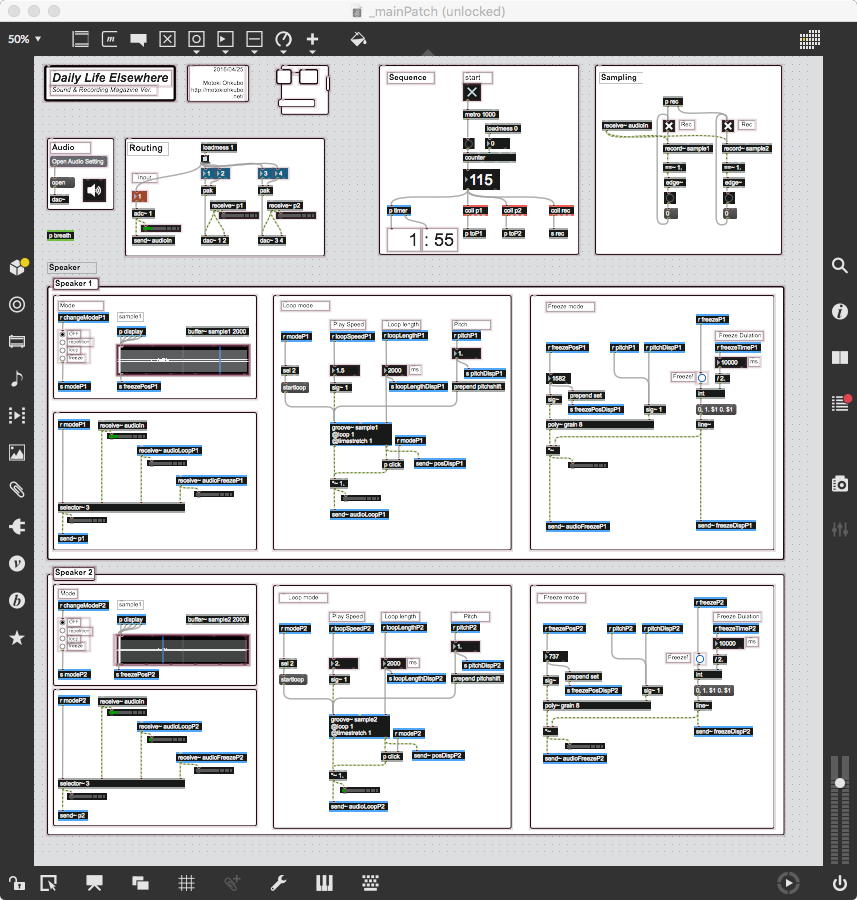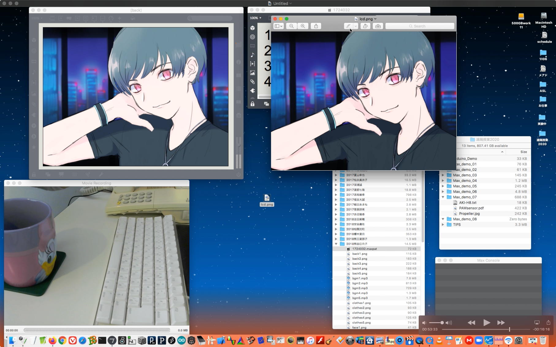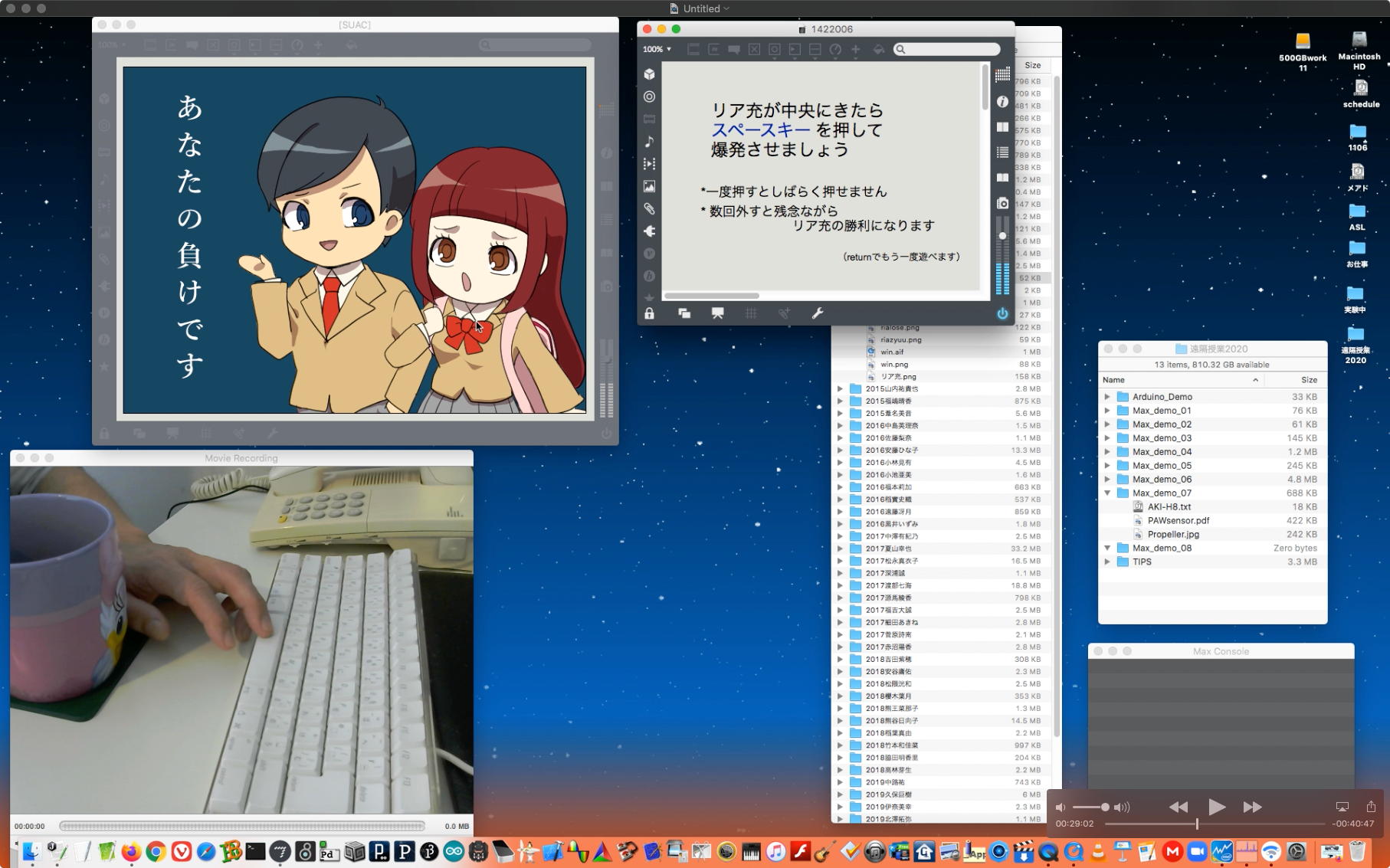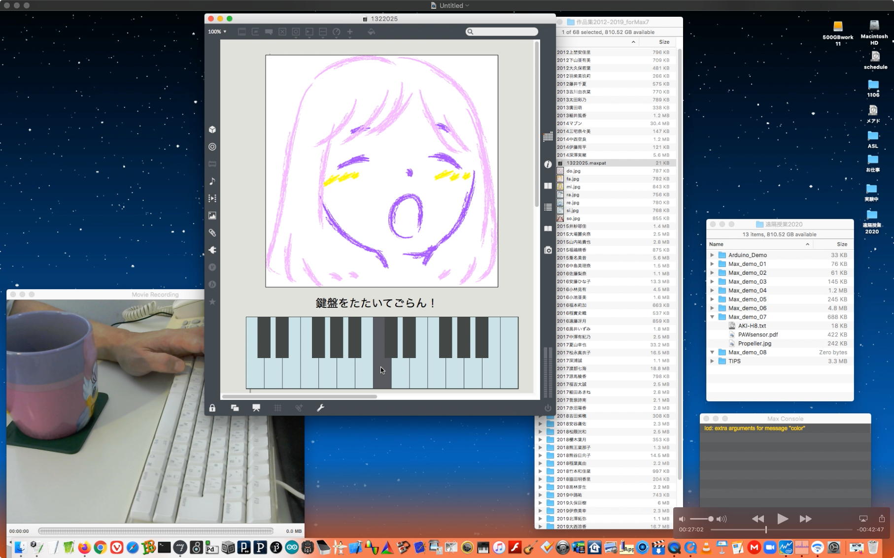 さて、ちょっと前からの懸案の再チェックである。 以下のように、ホストの方でMax8のパッチを走らせ続けてみると、一応はちゃんと動いて、それをデスクトップ共有でクライアントにもライブ配信できた。 そこでクライアントの方でスクリーンショットを撮って、そのデータをチャットに上げて共有すると、ホストのチャット画面にもサッとそれは現れた。 ところが、Max8のパッチを走らせたままホストがこの共有しているスクリーンショットをクリックしてダウンロードしようとすると、グルグルが回っているのにデータが一向に移ってこない、という問題の現象が現れた。 そしてMax8をQuitしてみると、ようやくダウンロードがちゃんと始まって、今度はサッとデータがダウンロードフォルダの中に保存された。 つまりやはり、「Max8はネット処理を邪魔している」のだった。(;_;)
