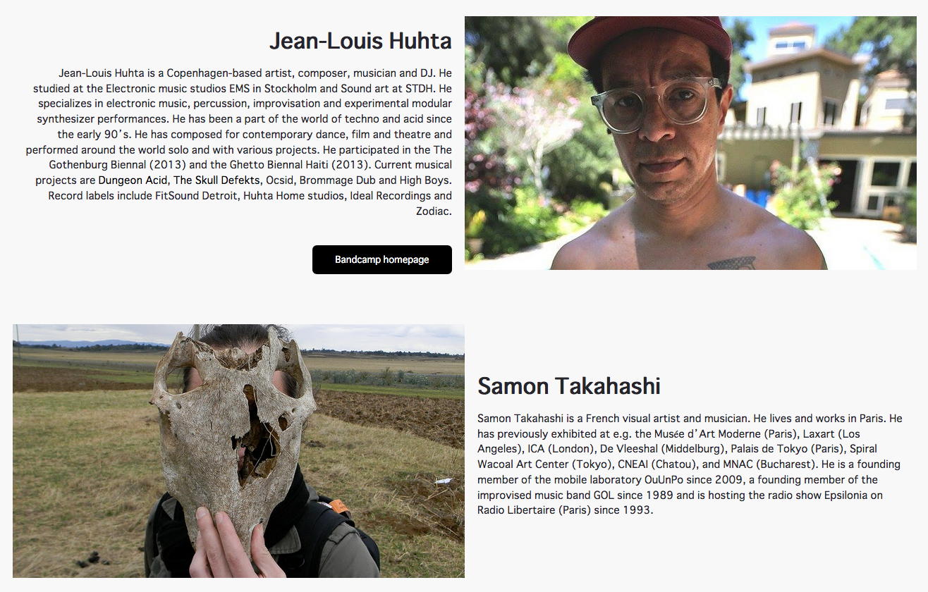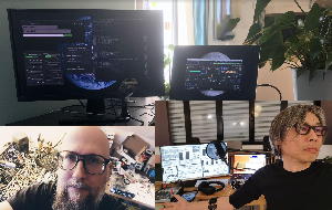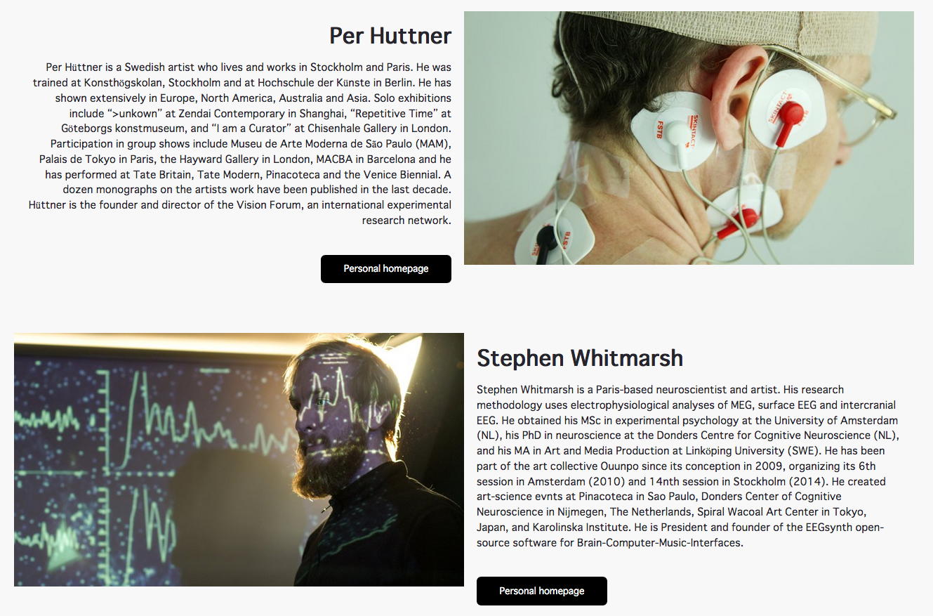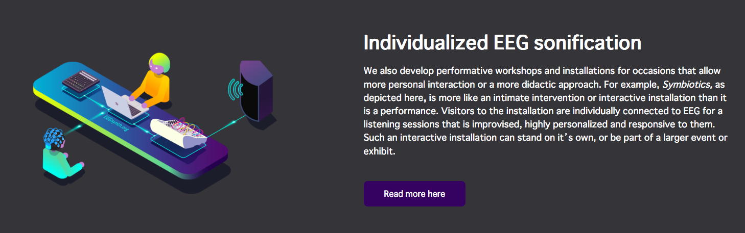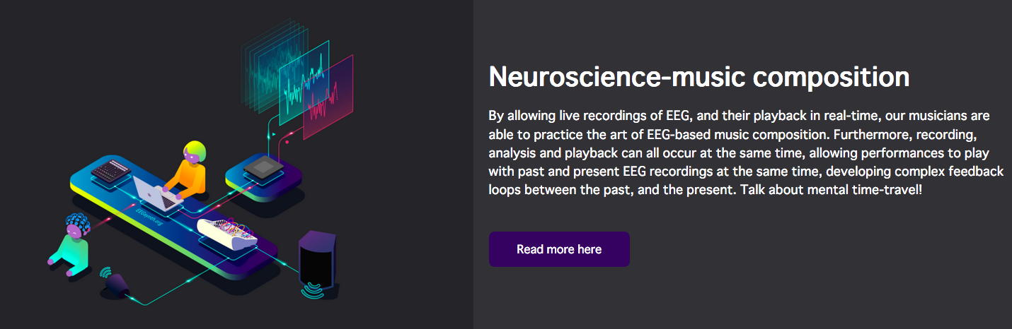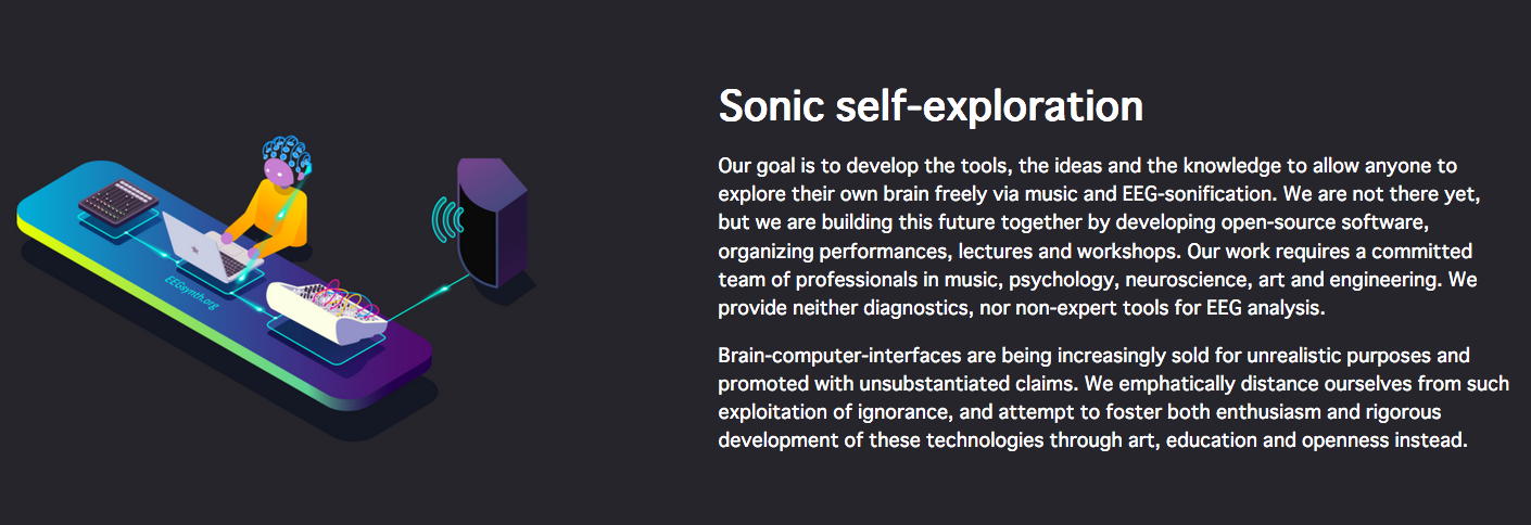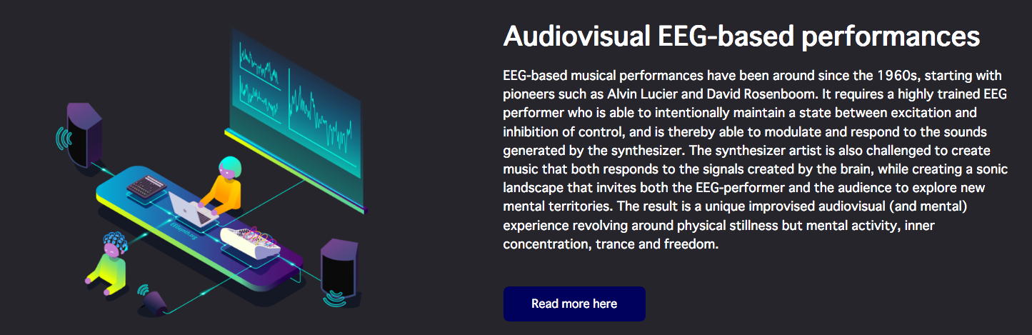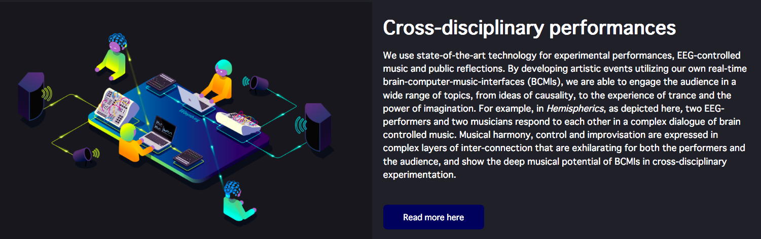 NIMEコミュニティのMLから届いたのは、あのAtau Tanakaからの案内で、上のような(下の写真の右下がアタウ)素敵なプロジェクトと組んだ「Internet radio streaming - Transformation II [online] - BCI, neuro-feedback and music, Lecture and performances - curated by 1+1=3 & Node for Antivirus」というものだった。 会場(ホール/クラブ等)でのコンサートが出来ないとなって、世界中のComputer Musicコミュニティの音楽家/研究者たちは、ネット上でのコンサートやレクチャーを発信し始めている。 昨日は、東京芸大の後藤英さんからも、芸大の作家たちのネット中継コンサートの案内が来ていたが、日本の夕方では世界中は時差でダメだったのでは・・・と思う。 いずれも記録動画でなく、ライヴのストリームに拘っているのだ。 特にアタウの案内にあった、 1+1=3 というところは以下のように、脳波ネタで色々と怪しい感じである。 上のリンクの先のどこかには、 こんな実験 まであった。 「怪しい人たちが怪しいことをしている」感が満載で、逆に楽しい。 この情報はさっそく、照岡さんに伝えた。