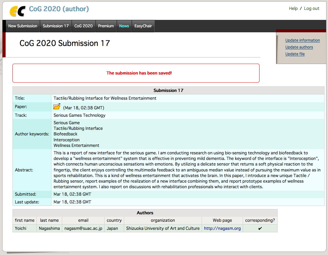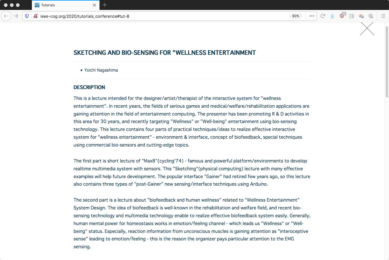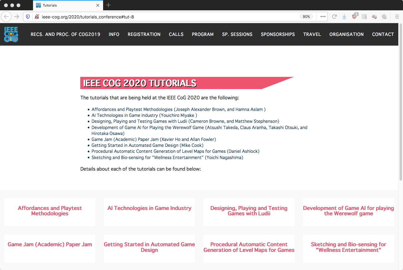 昨日の後期入試は、15人の部屋に8人の受験生が来て180分の実技試験があり、試験前入室から合わせて4時間立ちっぱなし(心の中で「頑張れ」と応援)、という苦行を今年も無事に完遂した。 そして、あと10日と迫ってきた CoG2020 の論文応募原稿の執筆に関して、たまたま TUTORIALS というタブを見つけて開いてみると、なんと以下のように8件のチュートリアルのメニューが並んでいて、8番目には僕のチュートリアルもちゃんとばっちり、載っていた(^_^)。 さらに 去年のProceedings というページも発見した。 こうなると、いよいよ頑張って鋭意、ひたすら原稿執筆である。