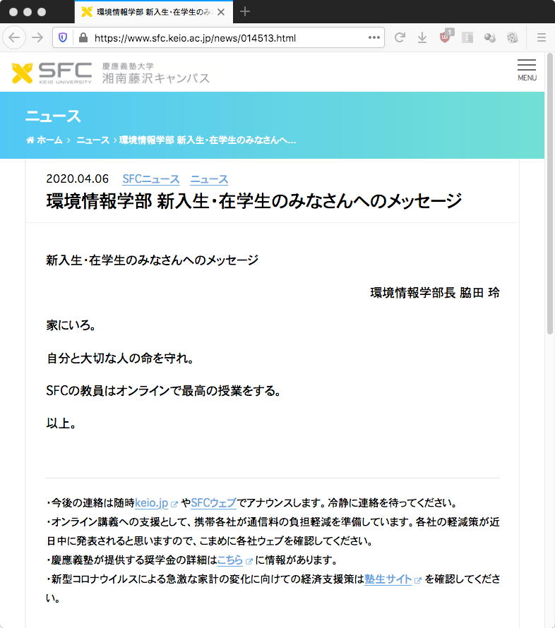 何もない連休中のこの日は履修登録期間の開始日である。 SUACのmanabaとかいう教務システムは、「履修登録しないとシラバスが見えない」(^_^;)という馬鹿な仕様のために、学生はいちいちダミーで仮に履修登録してはシラバスを見て実際に履修登録するかどうかを考えて、他の科目のシラバスも検討するためにはいったんその科目の履修登録をいちいちキャンセルしなければいけない、という愚行の繰り返しを強制されるために、遠隔の今期は例外的に履修登録期間を倍にしたらしい。 manabaに置いた教材はその履修期間が終わると消えてアクセスできない、というこれまた素晴らしい馬鹿仕様のために、常に全ての教材をWebに置いて、日々の復習だけでなく過去の資料もいつでも参照できるようにしている僕としては、とうていmanabaに教材を置ける訳もなく、manabaには「このページに行ってね」というリンクだけを記載している。