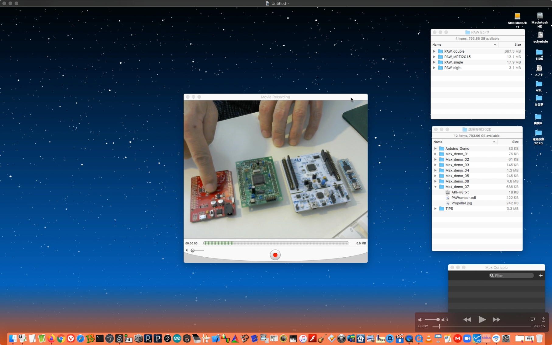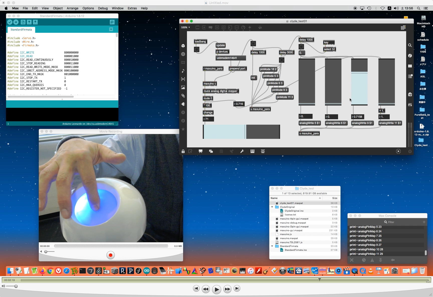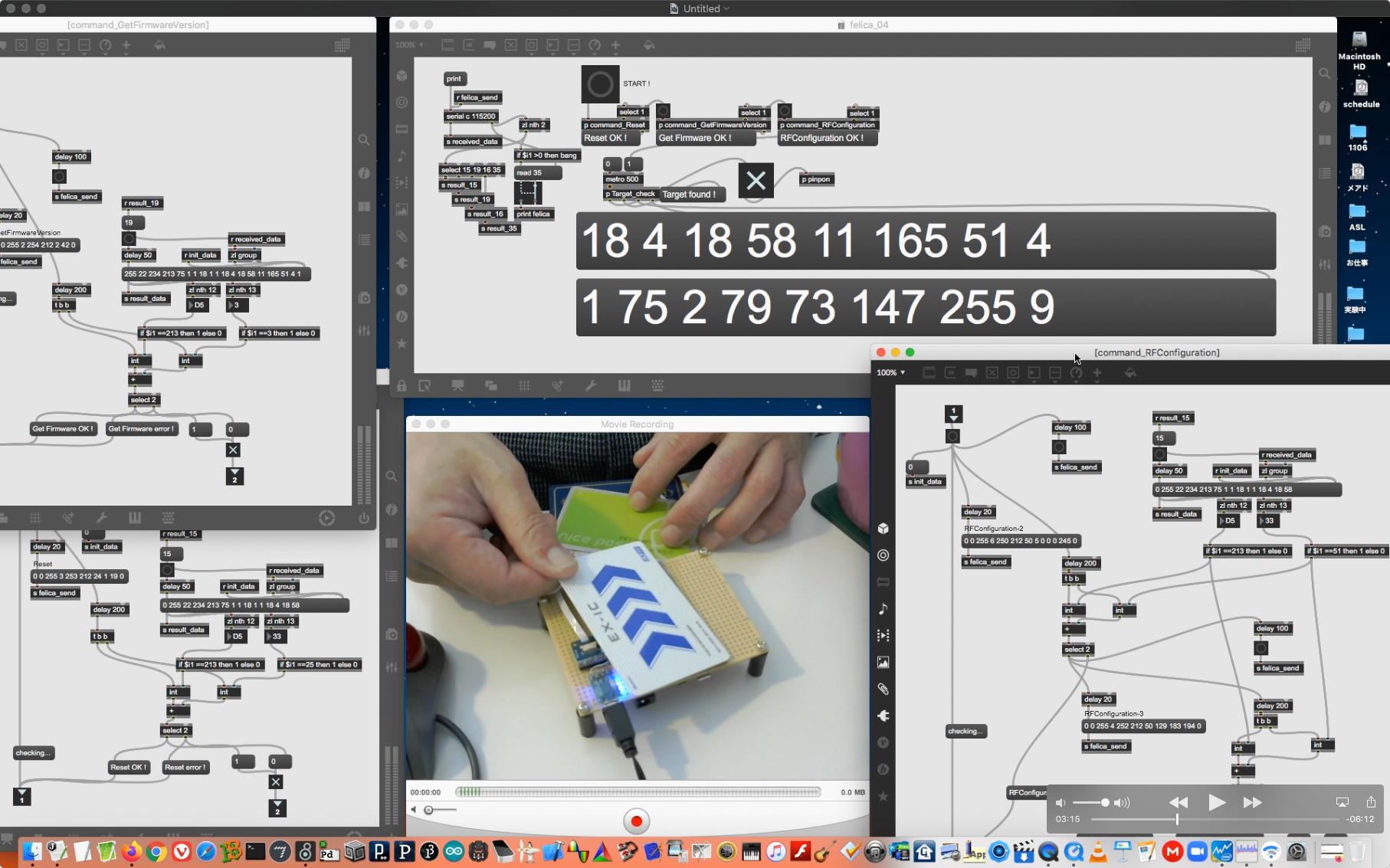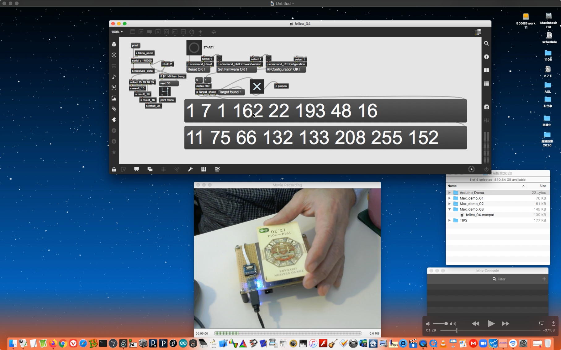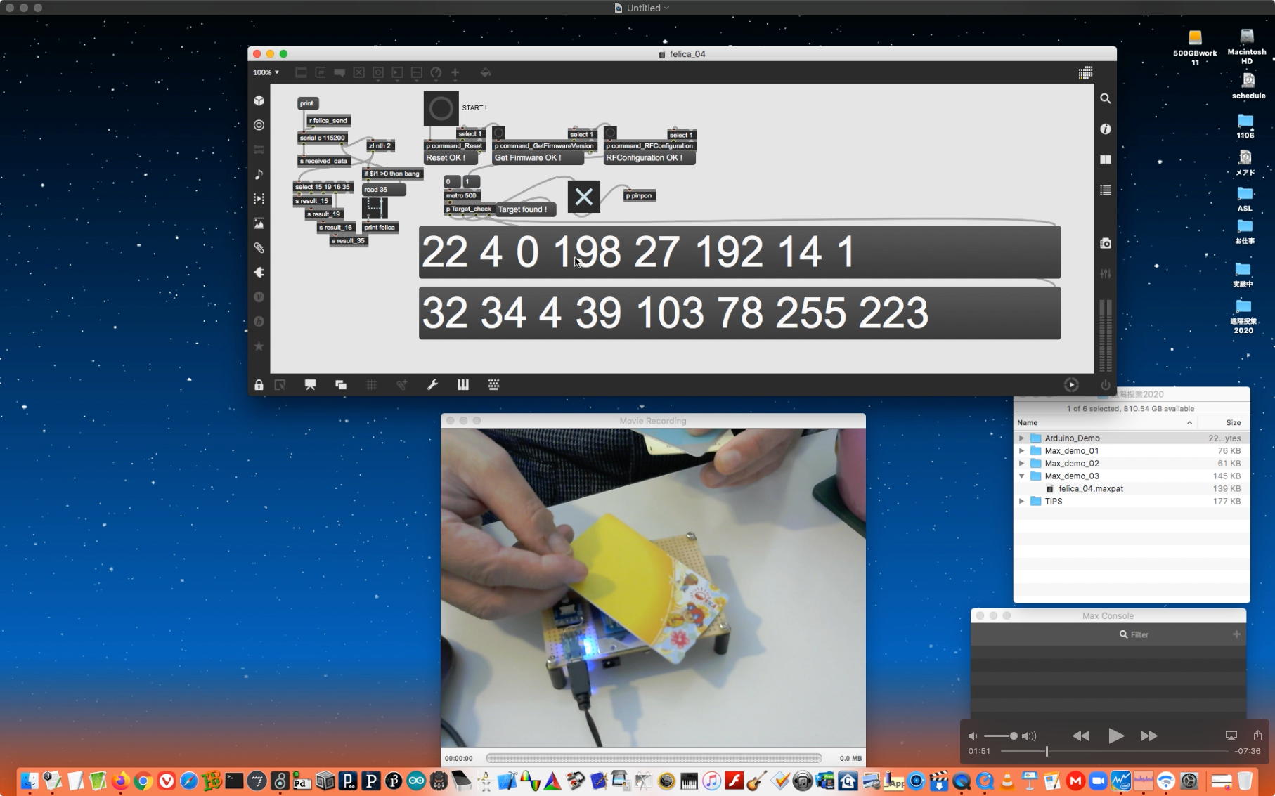 そして、Arduinoの紹介ともMax8の紹介とも言える教材動画として、何度かトラブルでの撮り直しの末に、上のような15分ほどの Max8の紹介(2) を記録してYouTubeに上げた。 後に判明した経験則として、jitterのダブルカメラのパッチを起動していると、どうもFelicaのパッチが正常に起動していたのにエラーとなる現象があり、この動画でも最初は裏で正常だったFelicaのパッチがエラーとなっていたのでそこで終了して、続きは別の動画とした。