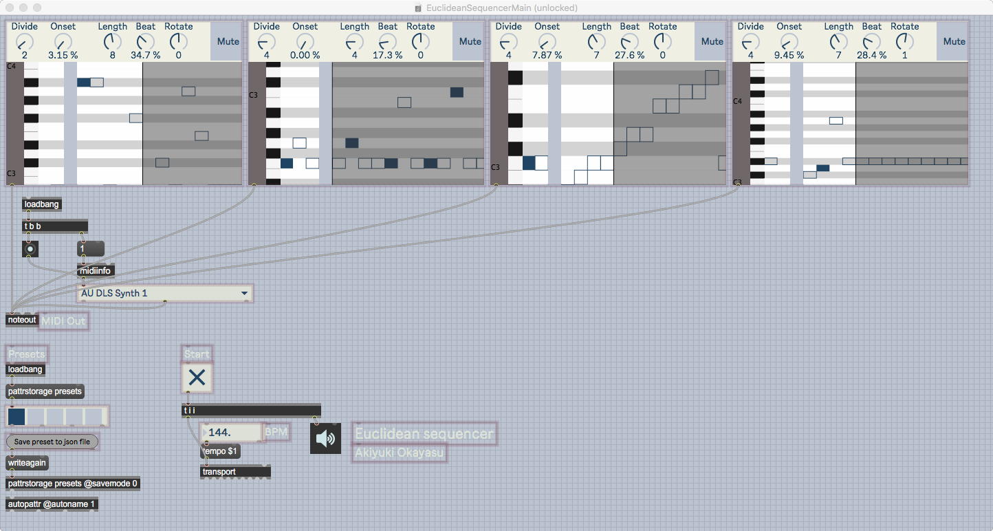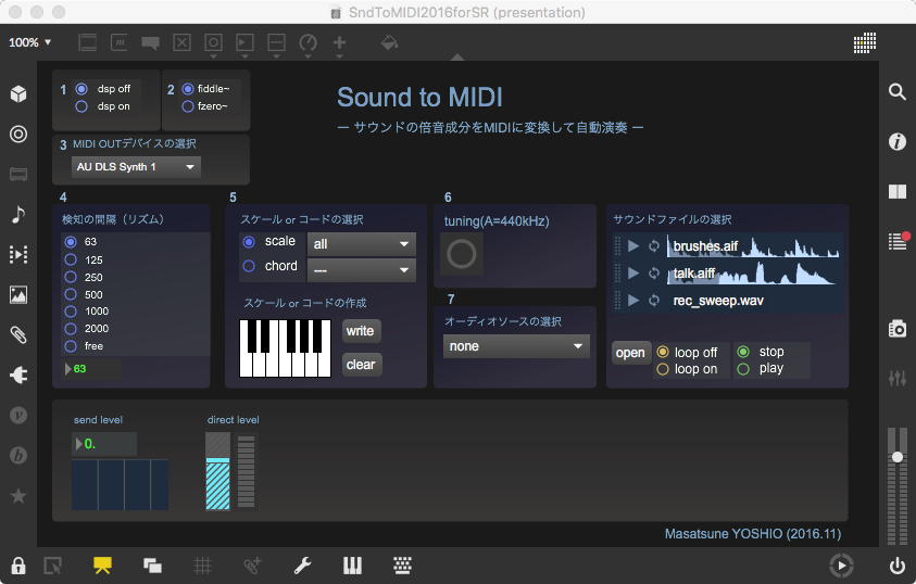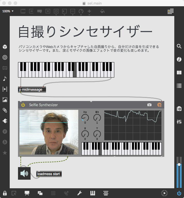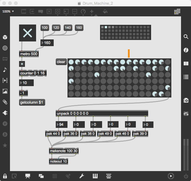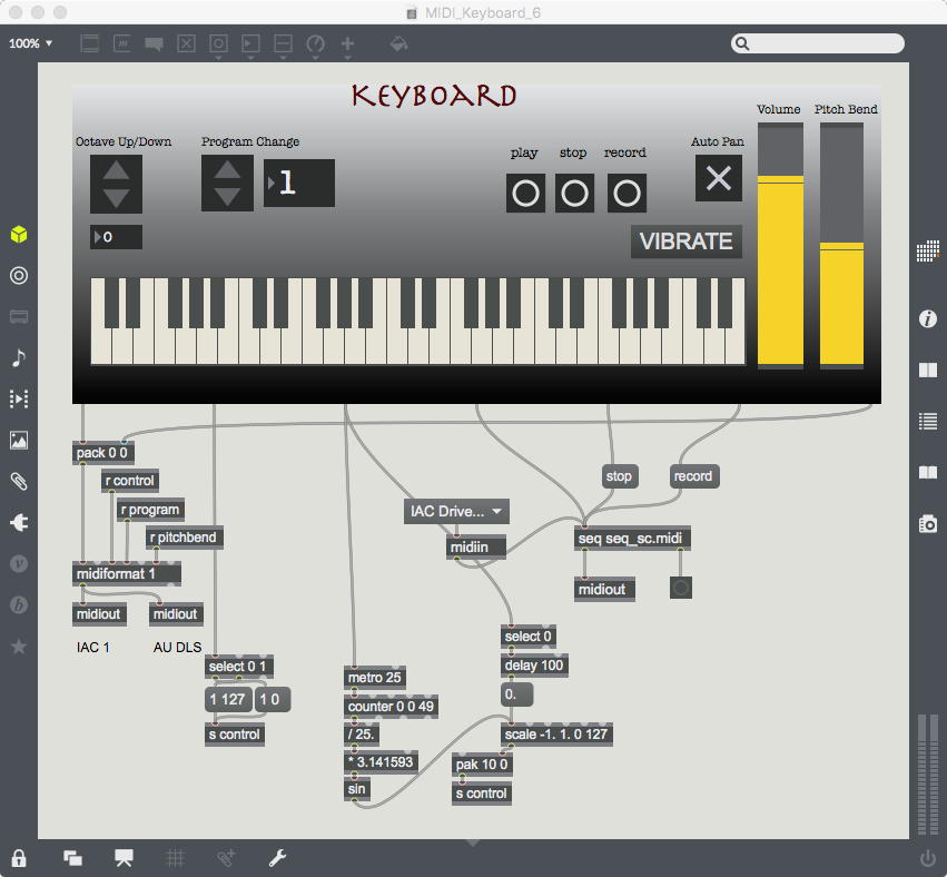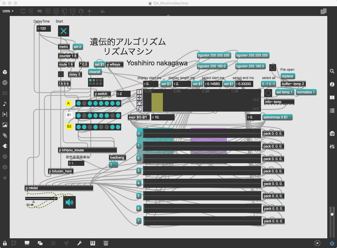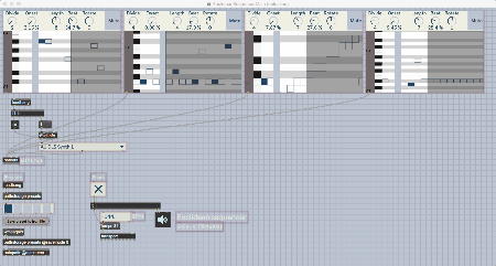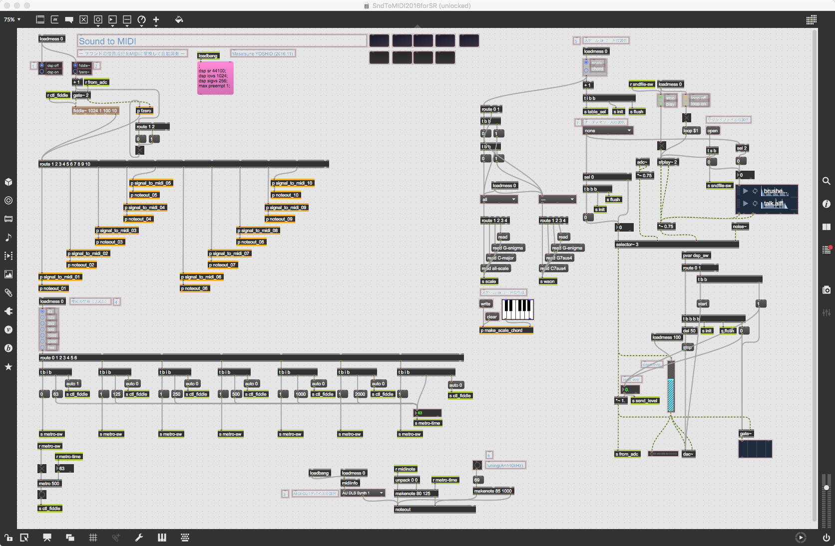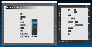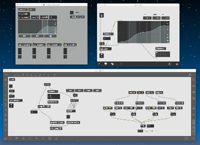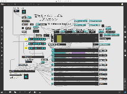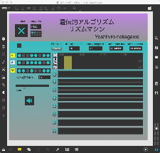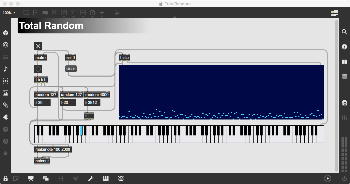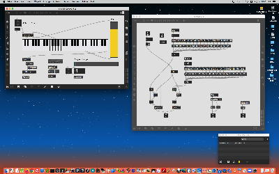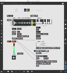 そして、Maxプログラミングに挑戦している王さんからは、「Drum_Machine」と「MIDI_Keyboard」という試作パッチが届いた。 なかなか頑張っているし、これまで僕が使ったことの無かったテクニック(マルチスライダーを円グラフにして縦横に並べて、ドラムシーケンサの個々の楽器ごとに個々のタイミングで異なるベロシティを設定可能)もあった。 「MIDI_Keyboard」は、パソコンのキーボードを白鍵と黒鍵に見立てて、さらに押し続けて離したときのノートオフにも対応した、なかなか上手いデザインである。 ただしサブパッチの中が力ワザであまり美しくないので、改良の余地があった。 そこで帰宅前に頑張ってこの2つのパッチをスマートに(テクニックも盛り込んで)改良して、以下のようなパッチをゼミmeetingの参加者全員に送った。 ゼミメンバーも、Max8の期間限定インストールが完了したので、全員がこれを共有体験できるのだ。(^_^)