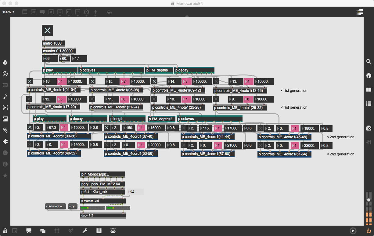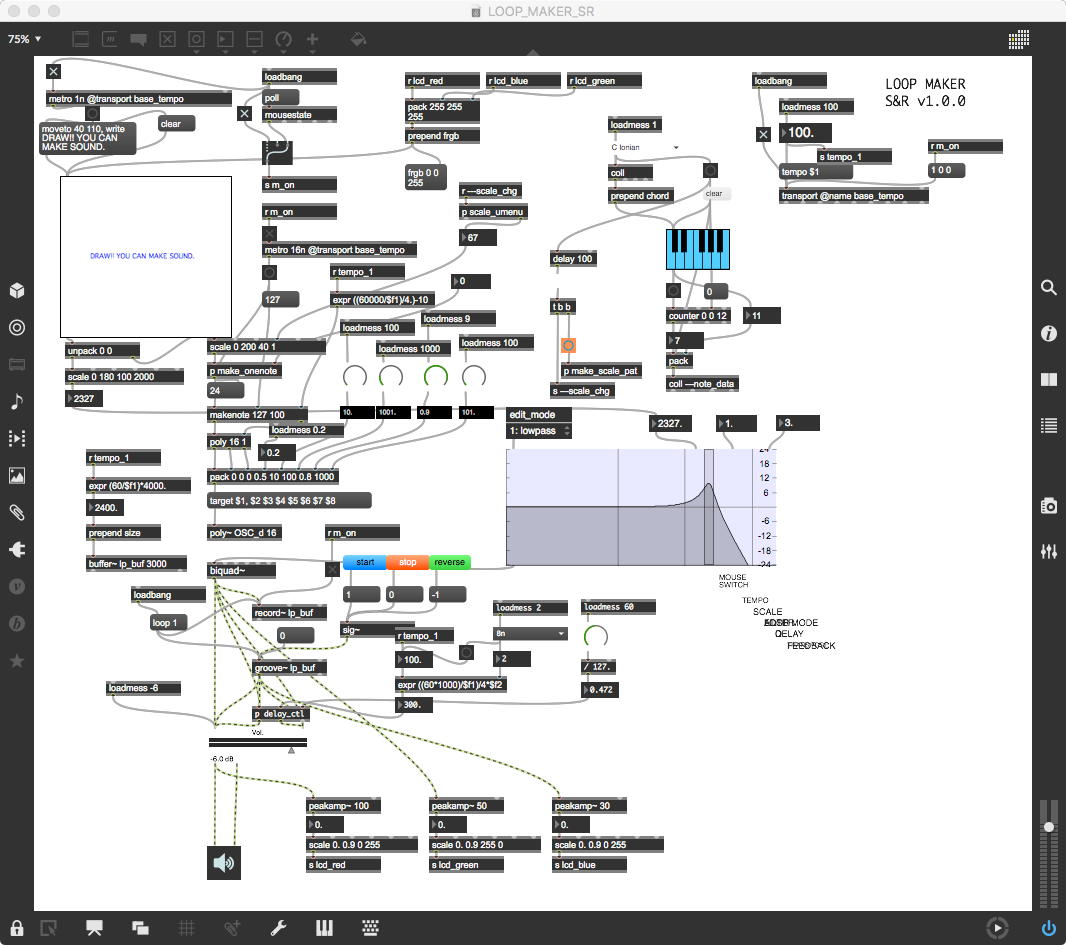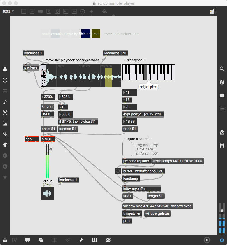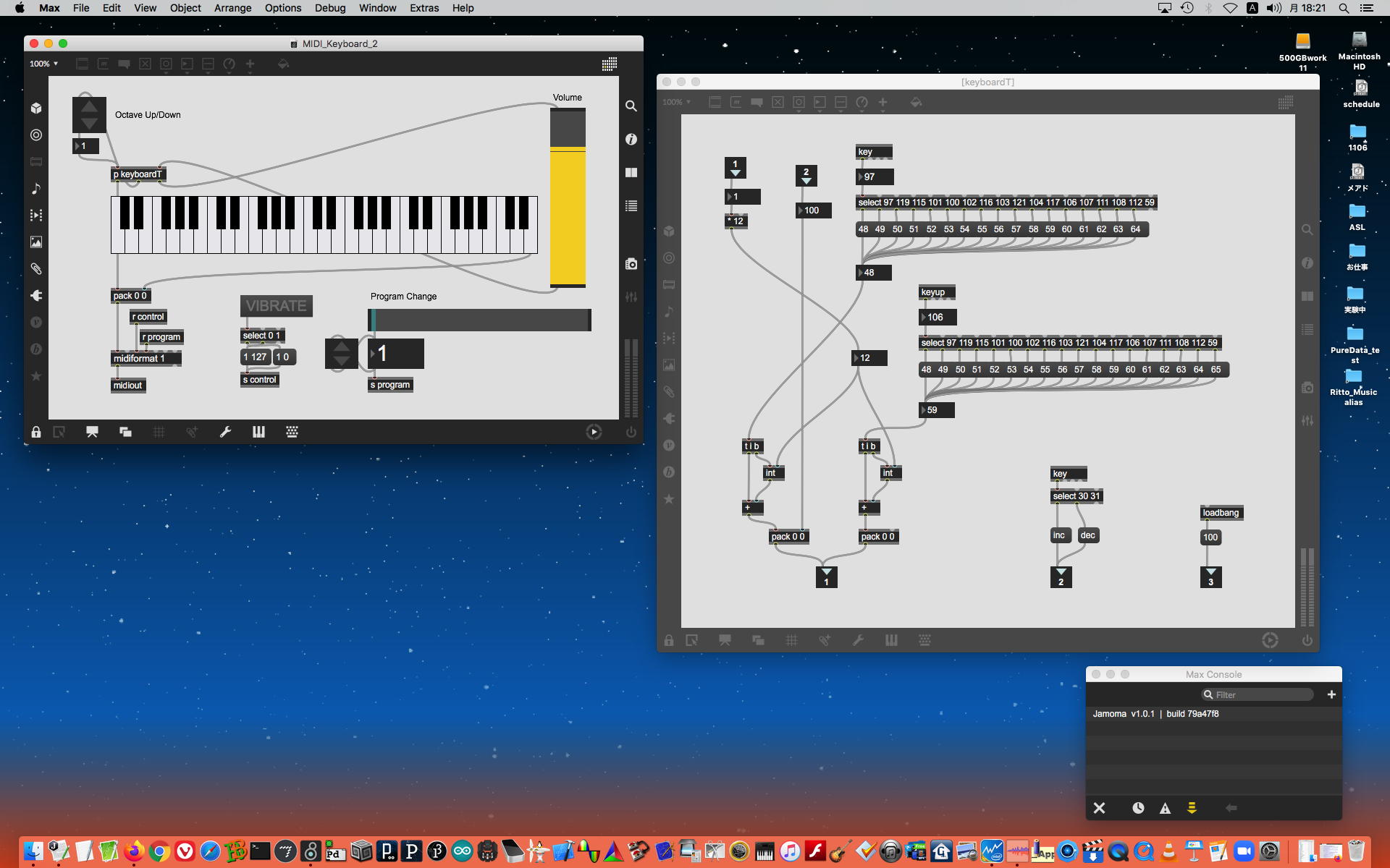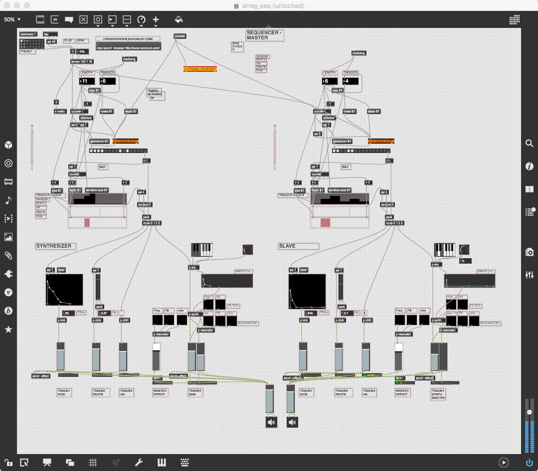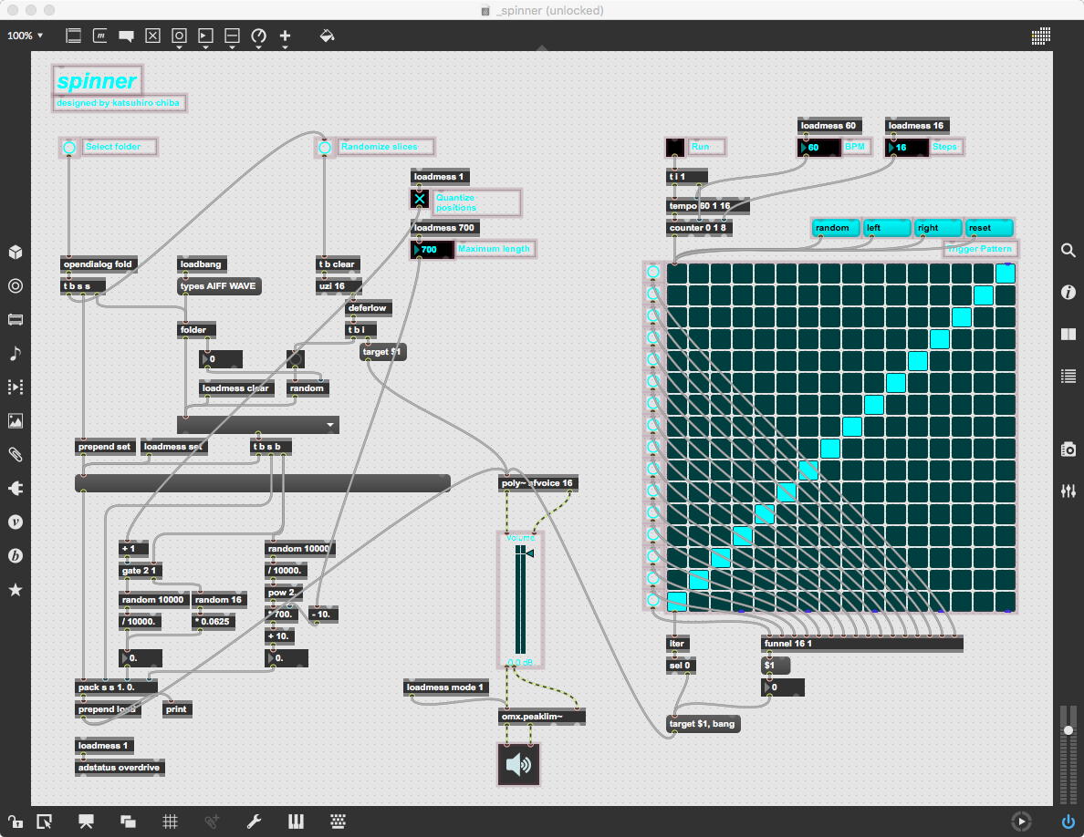 そして、Maxプログラミングに挑戦している王さんからは、「Drum_Machine」と「MIDI_Keyboard」という試作パッチが届いた。 なかなか頑張っているし、これまで僕が使ったことの無かったテクニック(マルチスライダーを円グラフにして縦横に並べて、ドラムシーケンサの個々の楽器ごとに個々のタイミングで異なるベロシティを設定可能)もあった。 「MIDI_Keyboard」は、パソコンのキーボードを白鍵と黒鍵に見立てて、さらに押し続けて離したときのノートオフにも対応した、なかなか上手いデザインである。 ただしサブパッチの中が力ワザであまり美しくないので、改良の余地があった。 そこで帰宅前に頑張ってこの2つのパッチをスマートに(テクニックも盛り込んで)改良して、以下のようなパッチをゼミmeetingの参加者全員に送った。 ゼミメンバーも、Max8の期間限定インストールが完了したので、全員がこれを共有体験できるのだ。(^_^)