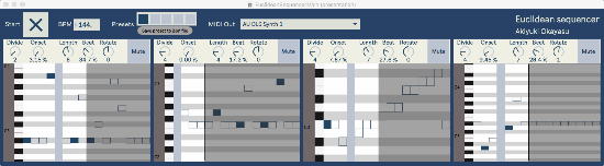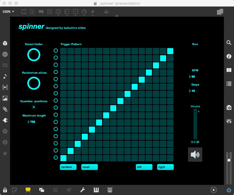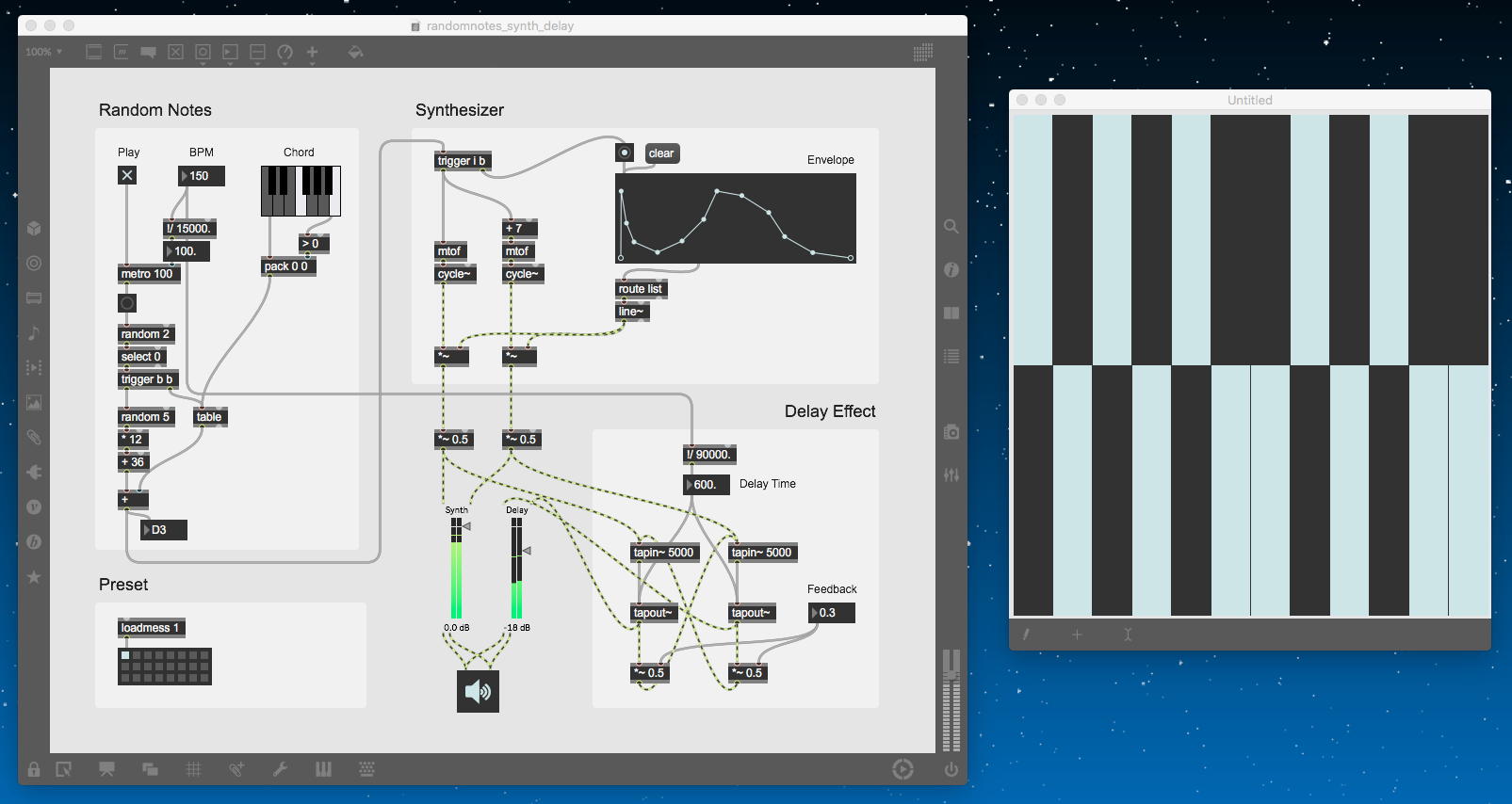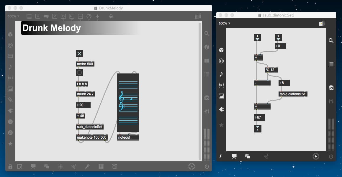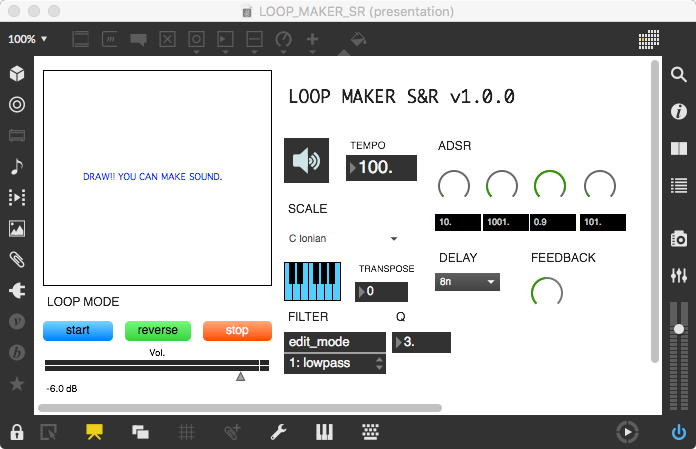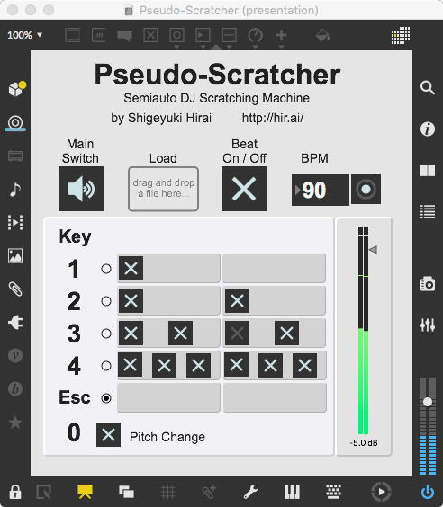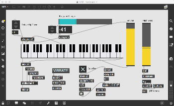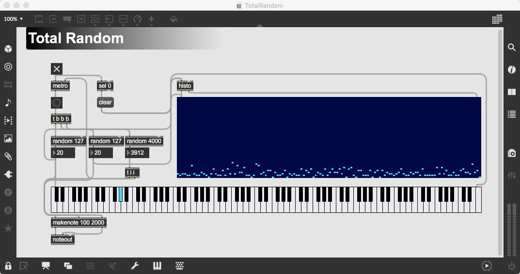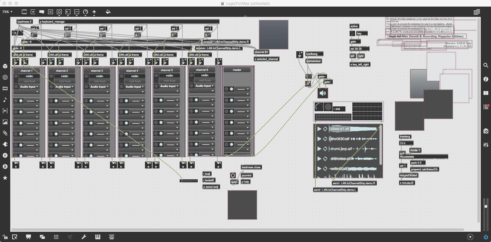 そして、Maxプログラミングに挑戦している王さんからは、「Drum_Machine」と「MIDI_Keyboard」という試作パッチが届いた。 なかなか頑張っているし、これまで僕が使ったことの無かったテクニック(マルチスライダーを円グラフにして縦横に並べて、ドラムシーケンサの個々の楽器ごとに個々のタイミングで異なるベロシティを設定可能)もあった。 「MIDI_Keyboard」は、パソコンのキーボードを白鍵と黒鍵に見立てて、さらに押し続けて離したときのノートオフにも対応した、なかなか上手いデザインである。 ただしサブパッチの中が力ワザであまり美しくないので、改良の余地があった。 そこで帰宅前に頑張ってこの2つのパッチをスマートに(テクニックも盛り込んで)改良して、以下のようなパッチをゼミmeetingの参加者全員に送った。 ゼミメンバーも、Max8の期間限定インストールが完了したので、全員がこれを共有体験できるのだ。(^_^)