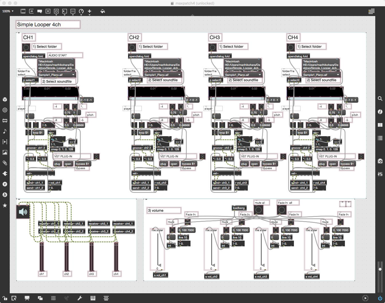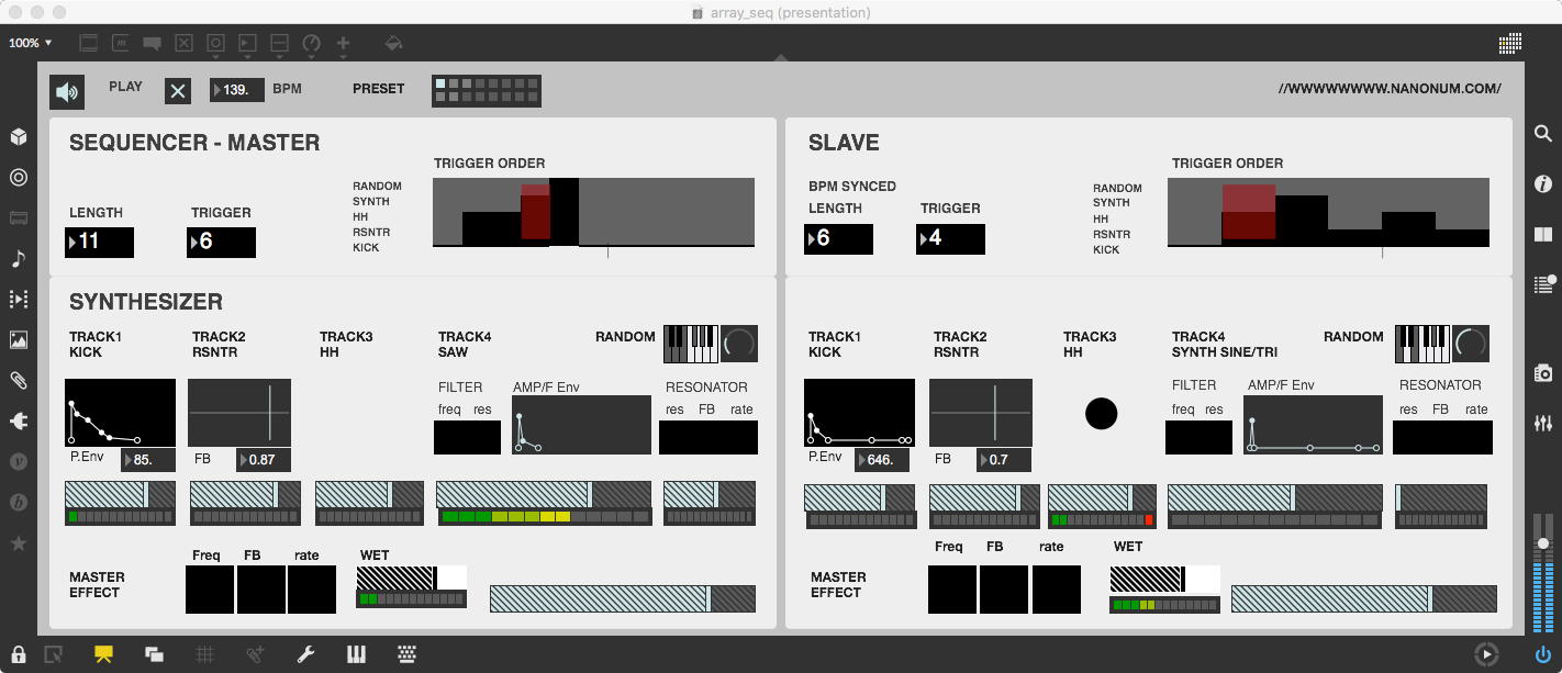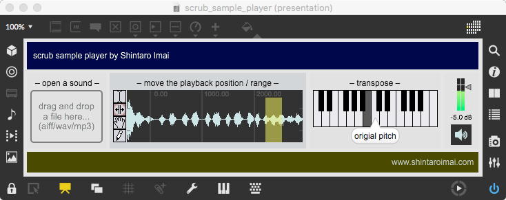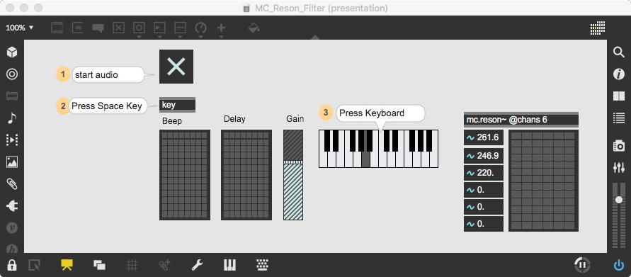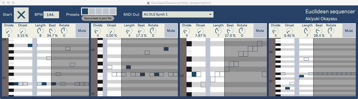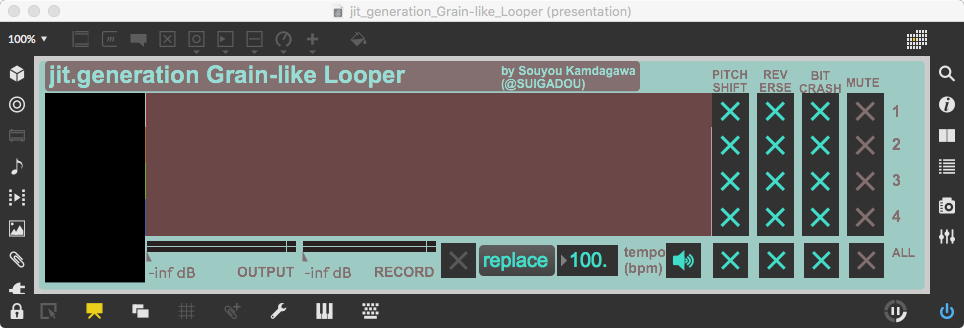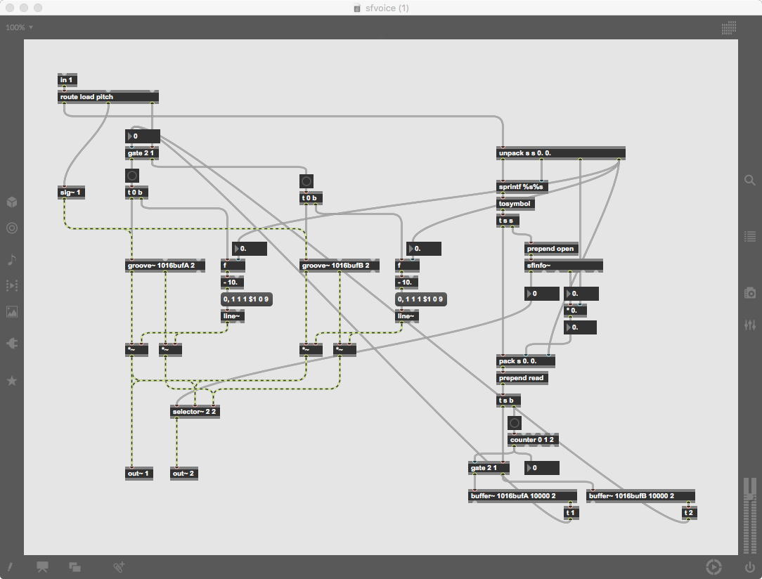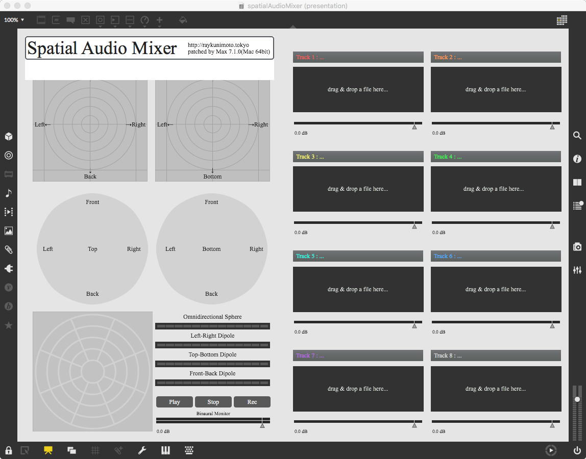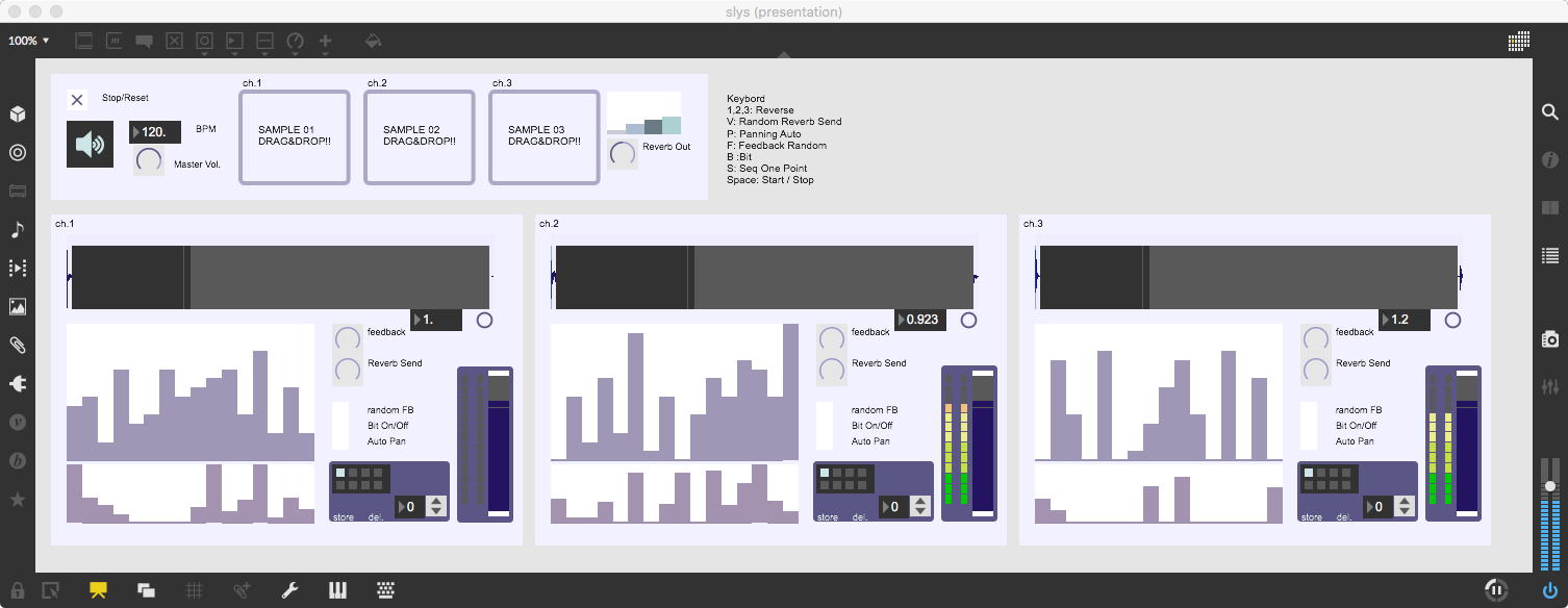 そして、Maxプログラミングに挑戦している王さんからは、「Drum_Machine」と「MIDI_Keyboard」という試作パッチが届いた。 なかなか頑張っているし、これまで僕が使ったことの無かったテクニック(マルチスライダーを円グラフにして縦横に並べて、ドラムシーケンサの個々の楽器ごとに個々のタイミングで異なるベロシティを設定可能)もあった。 「MIDI_Keyboard」は、パソコンのキーボードを白鍵と黒鍵に見立てて、さらに押し続けて離したときのノートオフにも対応した、なかなか上手いデザインである。 ただしサブパッチの中が力ワザであまり美しくないので、改良の余地があった。 そこで帰宅前に頑張ってこの2つのパッチをスマートに(テクニックも盛り込んで)改良して、以下のようなパッチをゼミmeetingの参加者全員に送った。 ゼミメンバーも、Max8の期間限定インストールが完了したので、全員がこれを共有体験できるのだ。(^_^)