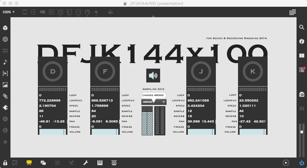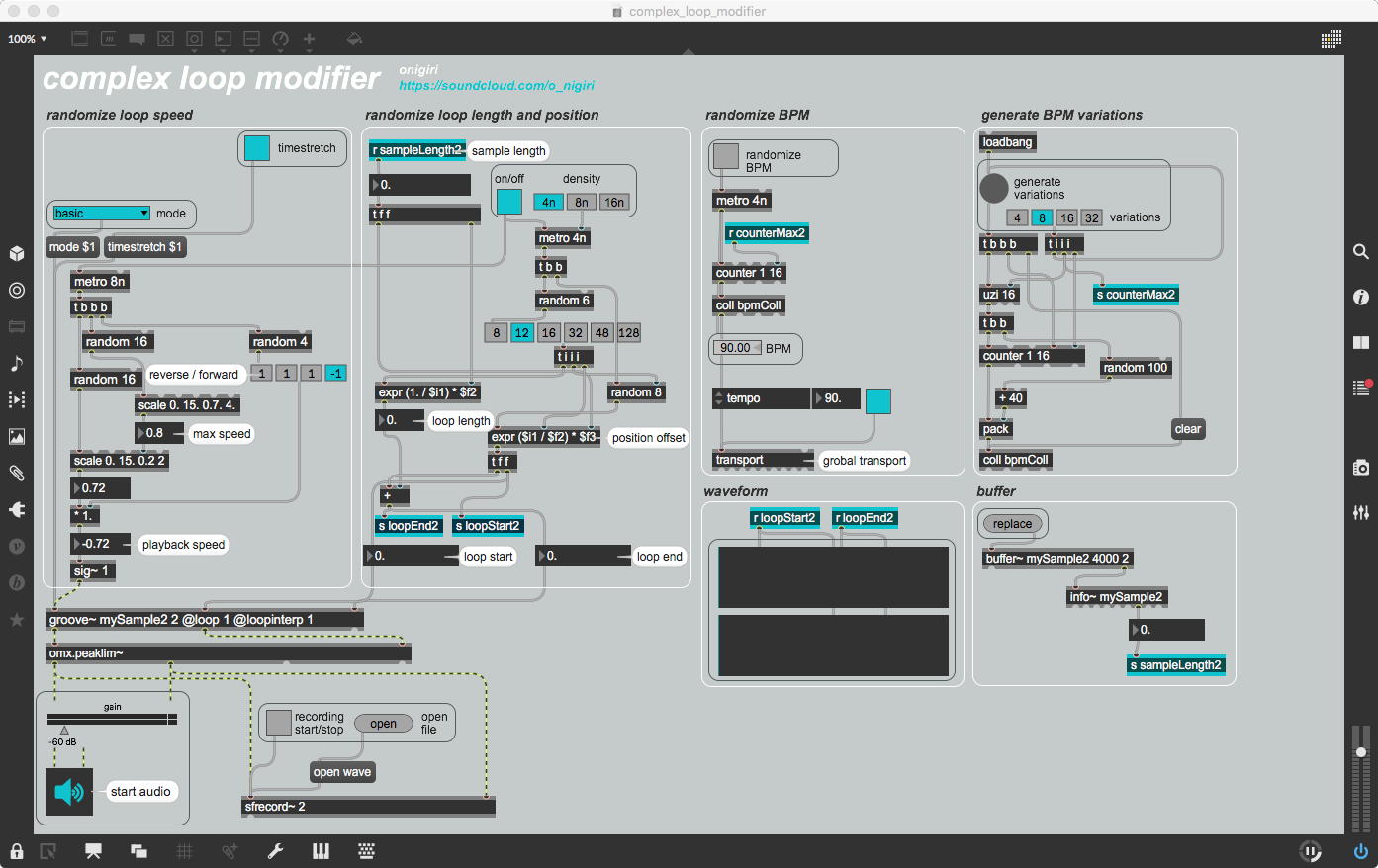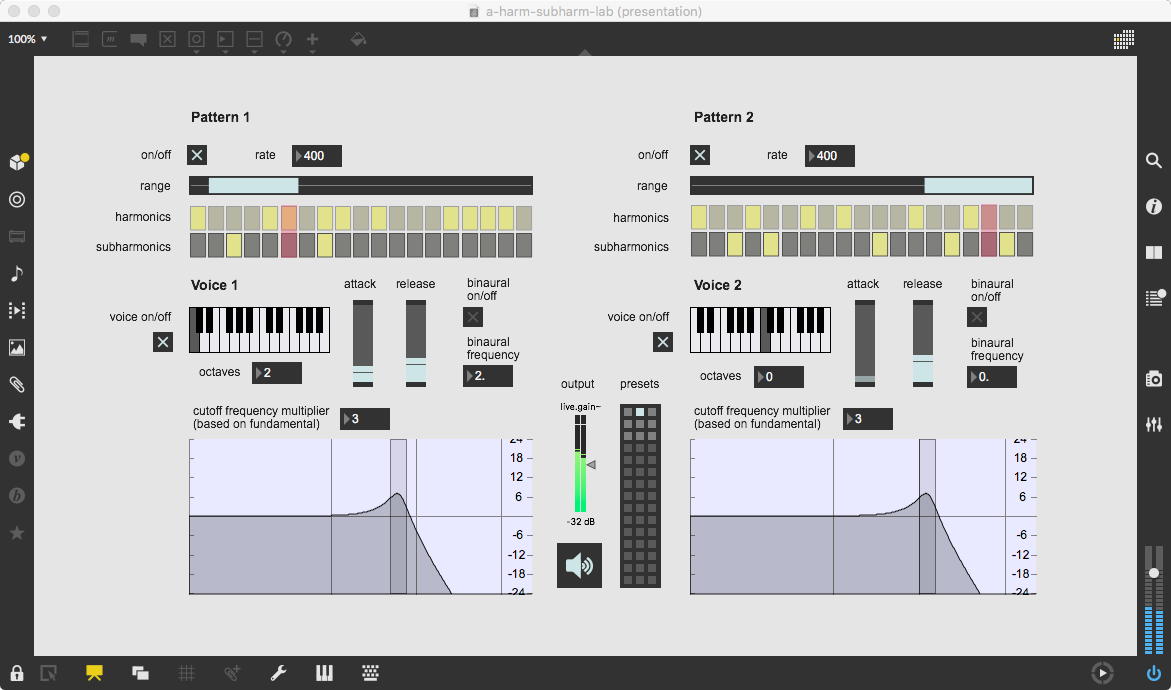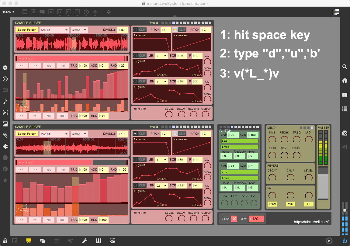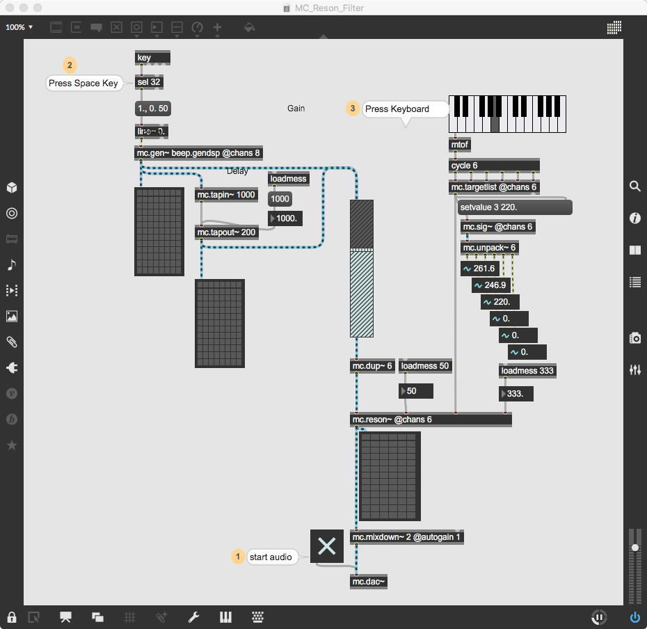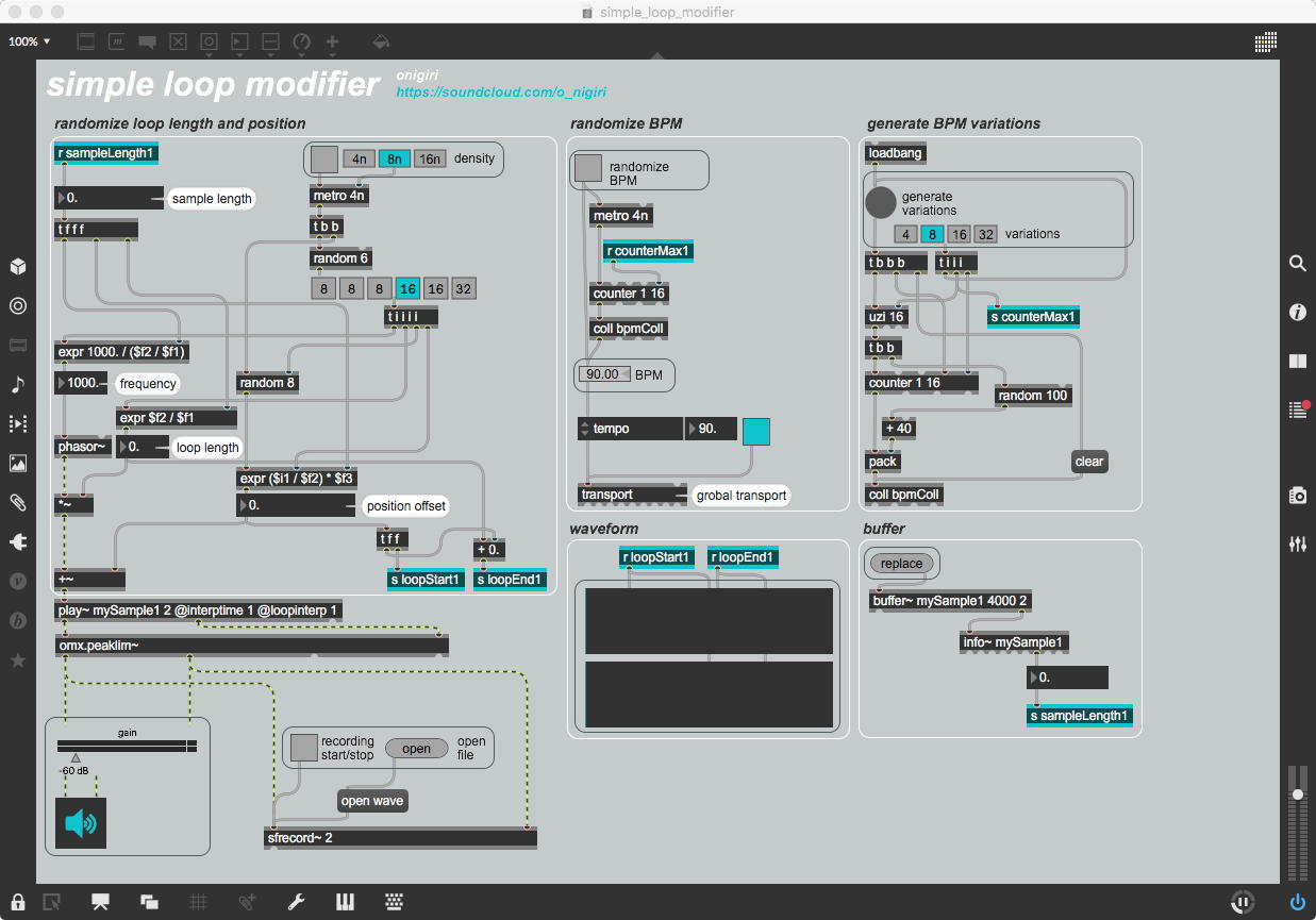 そして、Maxプログラミングに挑戦している王さんからは、「Drum_Machine」と「MIDI_Keyboard」という試作パッチが届いた。 なかなか頑張っているし、これまで僕が使ったことの無かったテクニック(マルチスライダーを円グラフにして縦横に並べて、ドラムシーケンサの個々の楽器ごとに個々のタイミングで異なるベロシティを設定可能)もあった。 「MIDI_Keyboard」は、パソコンのキーボードを白鍵と黒鍵に見立てて、さらに押し続けて離したときのノートオフにも対応した、なかなか上手いデザインである。 ただしサブパッチの中が力ワザであまり美しくないので、改良の余地があった。 そこで帰宅前に頑張ってこの2つのパッチをスマートに(テクニックも盛り込んで)改良して、以下のようなパッチをゼミmeetingの参加者全員に送った。 ゼミメンバーも、Max8の期間限定インストールが完了したので、全員がこれを共有体験できるのだ。(^_^)