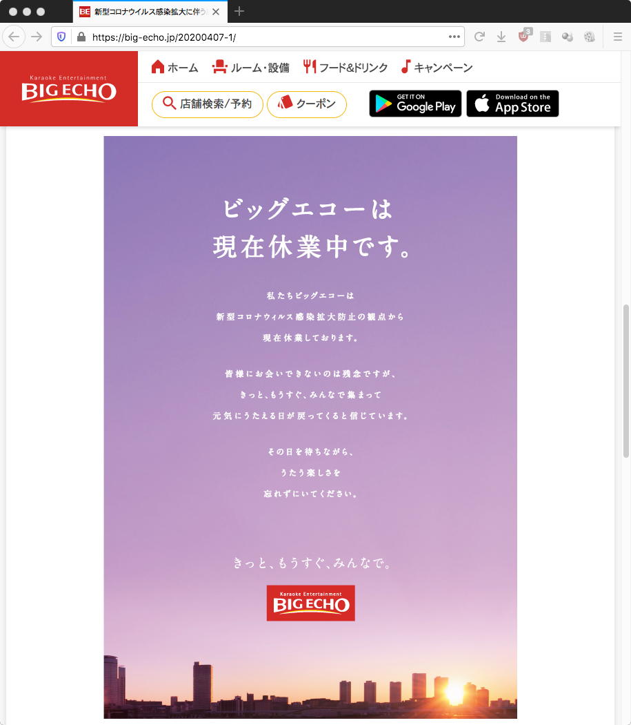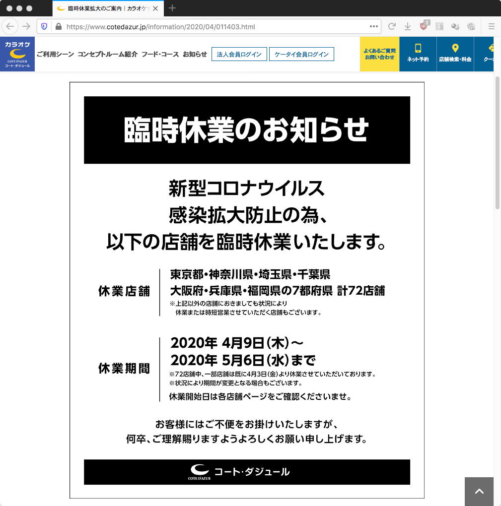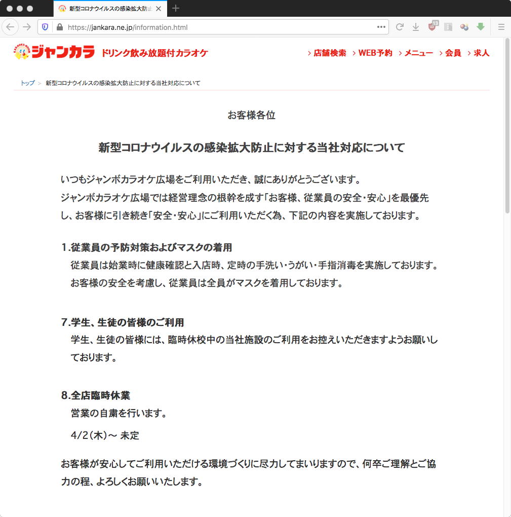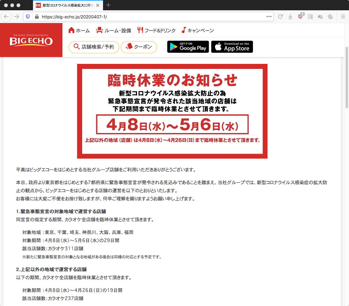 その後、長い長いデザイン学科会議があり、さらに学生委員会があってヘトヘトになって研究室に戻ると、「緊急事態宣言の対象地域、全都道府県に拡大へ」というニュースが届いた。 実は全てのカラオケが営業自粛していたのに、JoyJoyだけはこの週末「金曜12時〜日曜18時の時間だけ24時間営業」とWebサイトにあったので、明日の午後に行くつもりをしていたのだが、再びJoyJoyのWebサイトに行ってみると、このニュースに対応して、他と同じで「5月6日まで全面休業」と変更されていた(;_;)。 これが本日一番のショックだったのは言うまでもない。