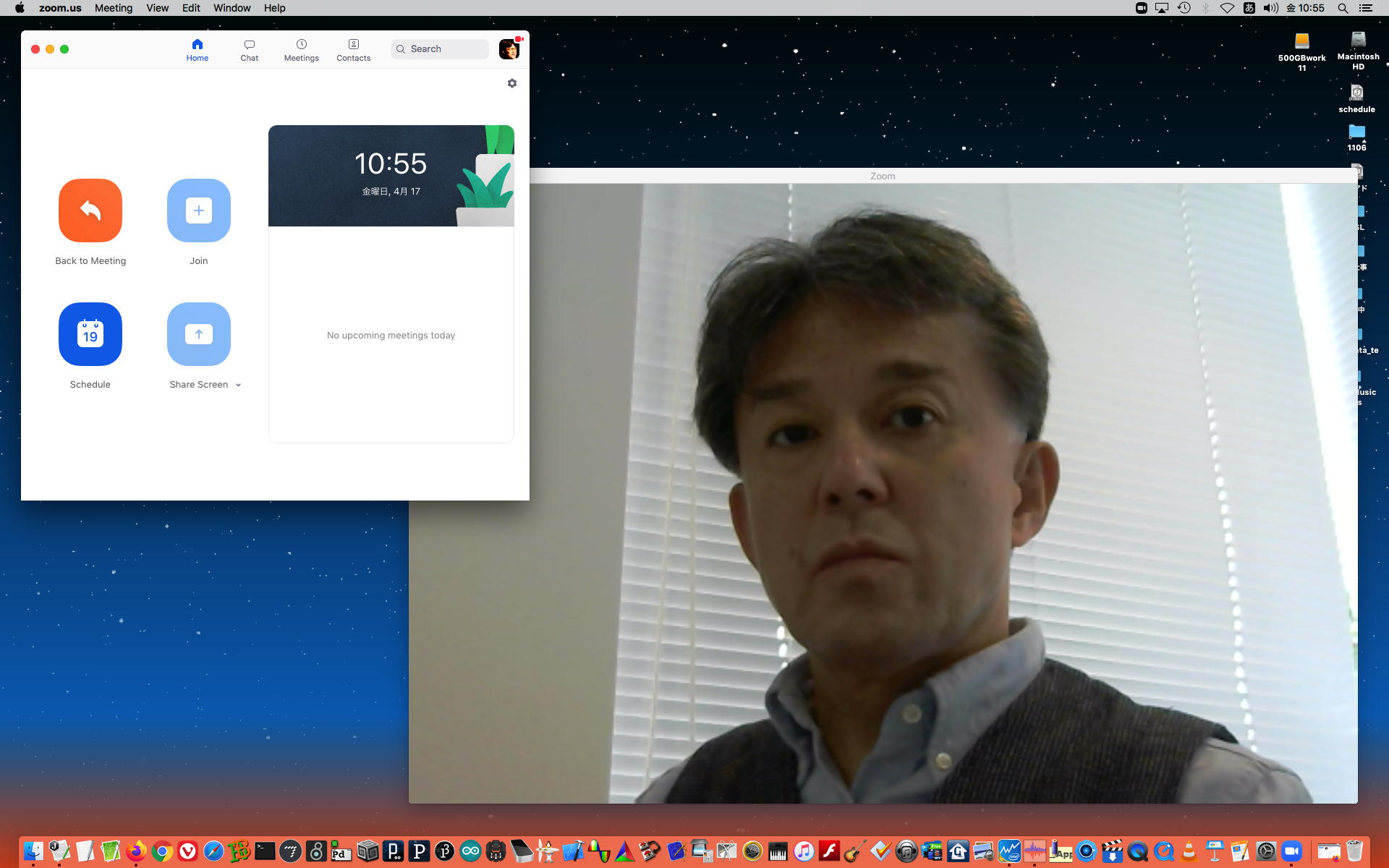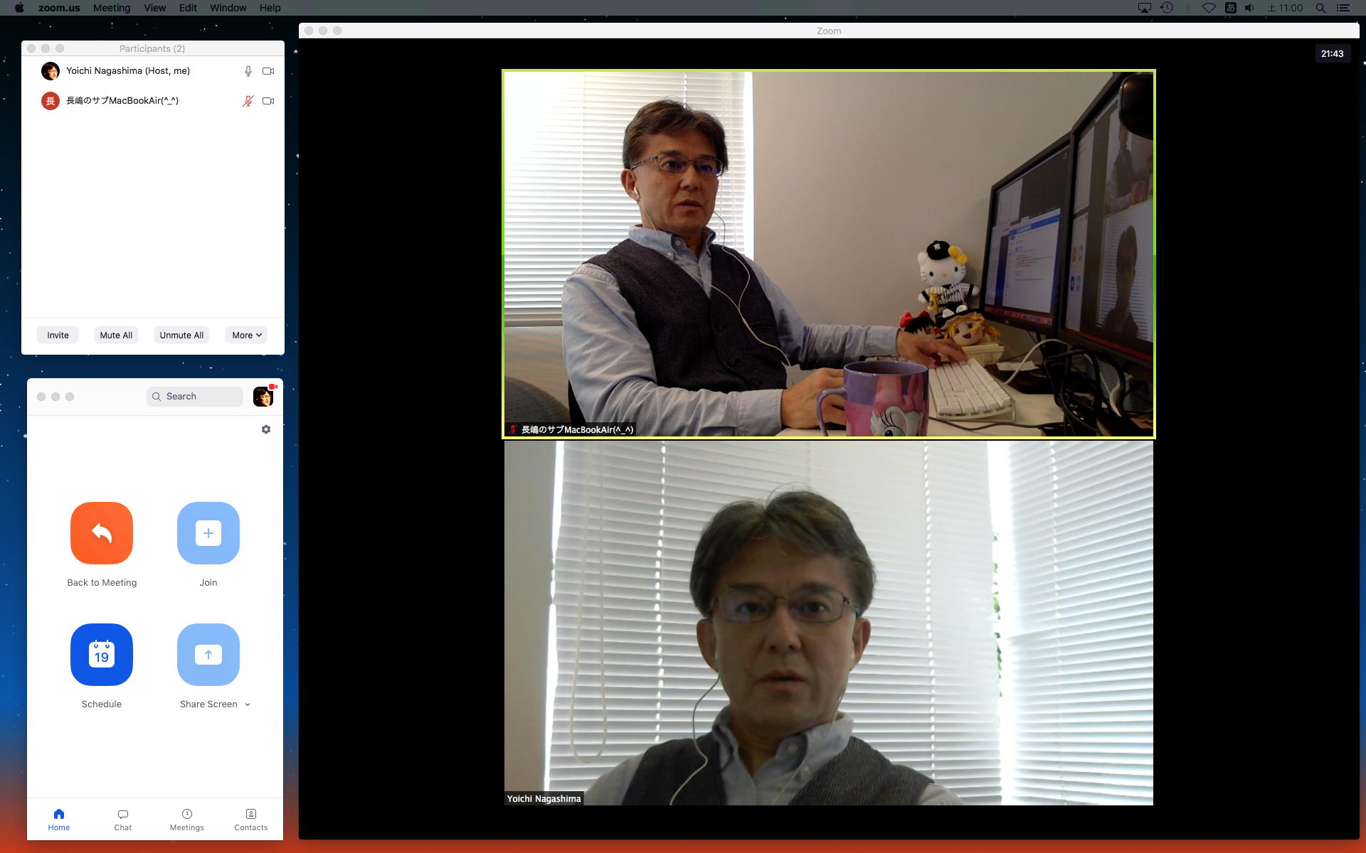 そして、「ZOOMの使い方」というページに従ってやってみようとしたら、どうも最新のZOOMとは画面が違ったりしていたが、なんとか実際に「お仕事Mac mini」と2台のMacBookAirとで、一人3役ということで、実際に「ZOOM会議」が出来てしまった(^_^)。