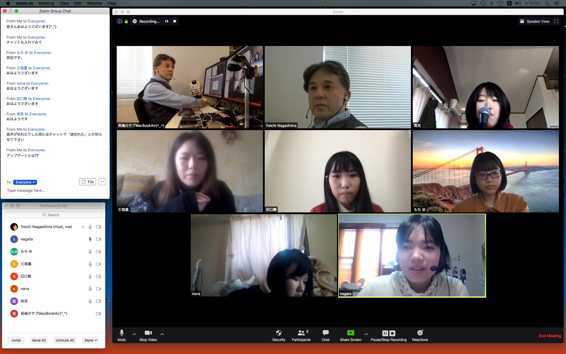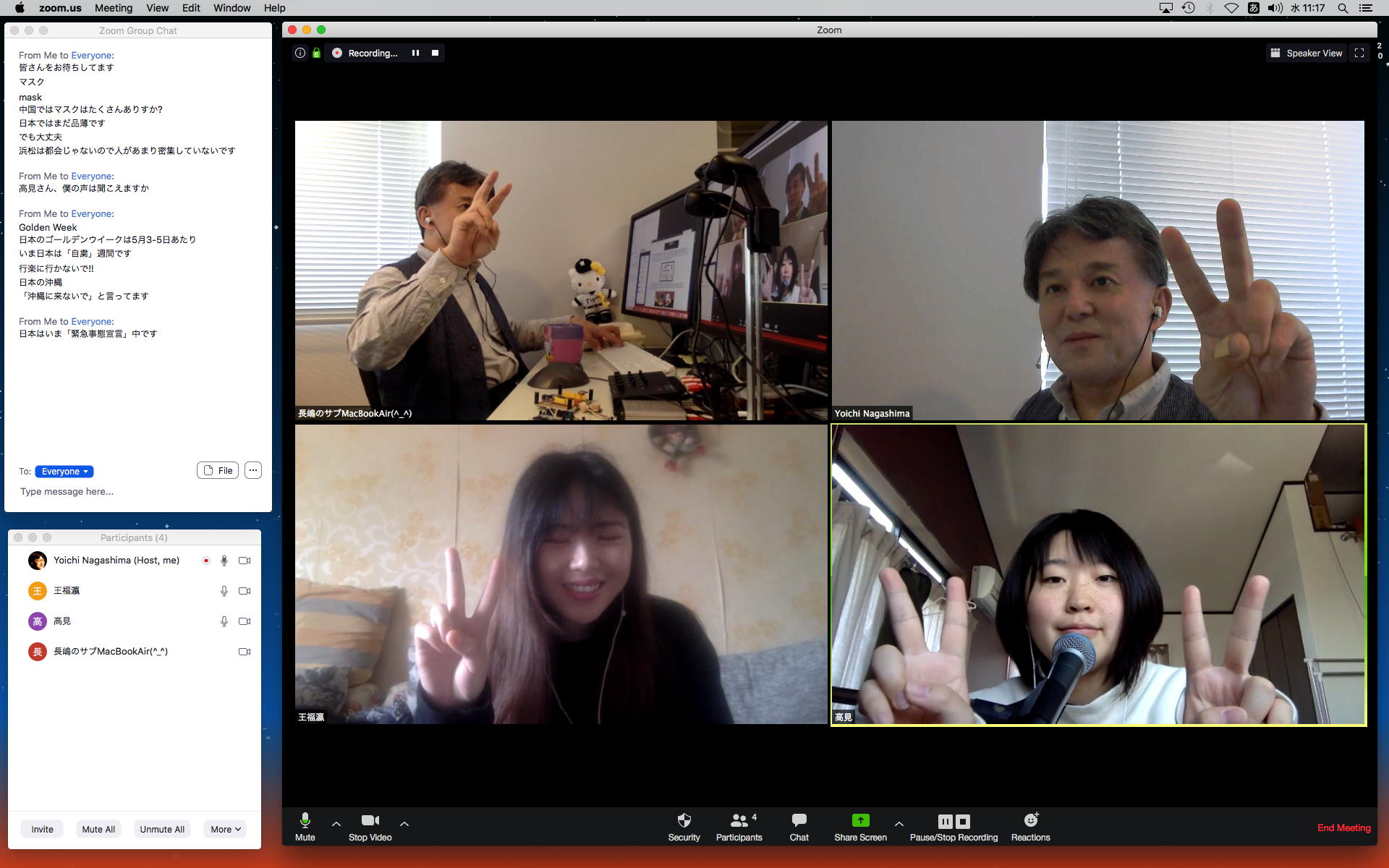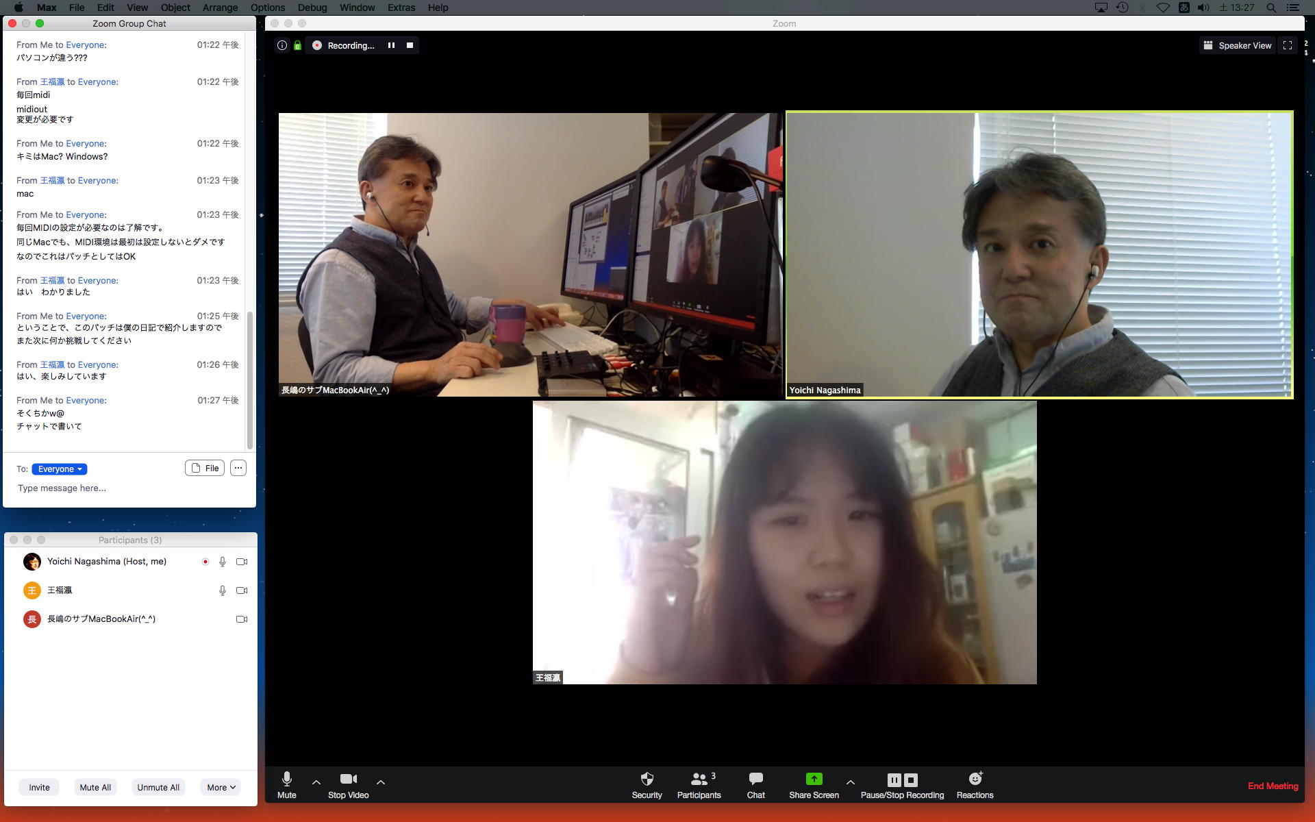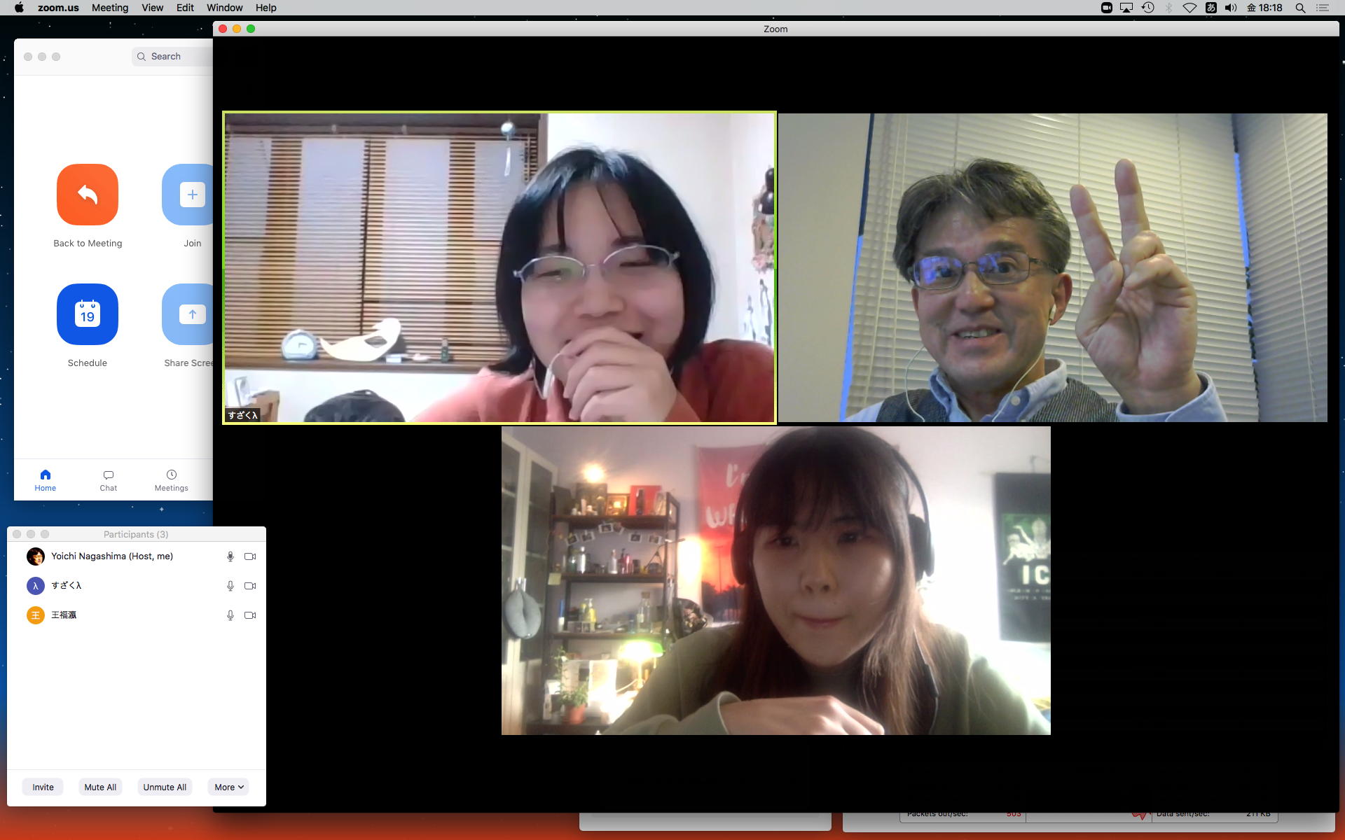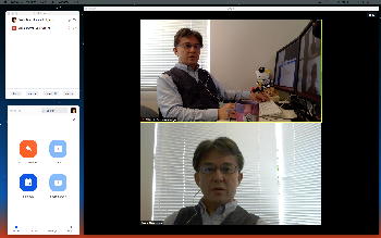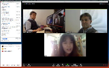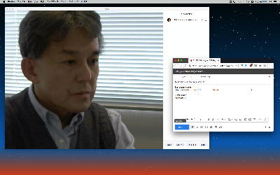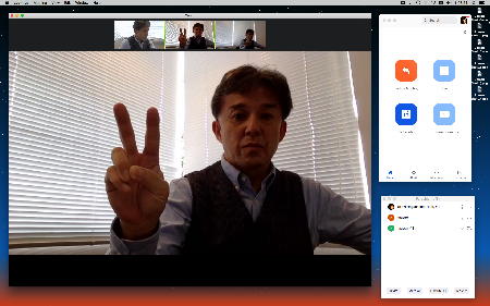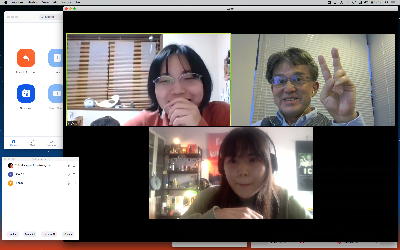 長嶋です。今日はZOOMというオンラインミーティングのツールを実験して、30分ほどでたぶん使えるようになりました。 僕とオンラインで会話の実験をしたいという人は、 (1)https://zoom.us/support/downloadでそれぞれの環境のZOOMアプリをダウンロードしてインストール (2)起動時の「Sign In」はしなくてもOK。サインインするとmeetingを主催できますが、参加だけなら不要 (セキュリティのために普段使っているメアドでなく、どこか「捨てアド」(使うのは最初の1回だけ)を使って、 パスワードも普段のものとかぶらないように捨てパスにしてメモしておいてください。ZOOMユーザの 個人情報が世界中で流出しましたので) (3)僕にメイルして、オンライン会話の日時を約束(僕が1106在室で即答なら「今から」というのもアリ) (4)約束の日時に僕が会議室を開設して、そのIDと入室パスを参加者にメイルします (5)そのメイルを受けたらZOOMを立ち上げてIDとパスを入れるとmeeting開始(^o^) という手順です。お互いに日時を連絡し合って複数メンバーも面白いかも。たぶん今期のゼミmeetingはこれに なりますので、4月中に一度は試してみて下さい。そして、大学からはいよいよ正式に「この前期は学生は学内に入らない」というような方針が届いたりして、ぼちぼち帰ろうかな・・・という時に、ゼミの永田さんから久しぶりにメイルが届いて、近況などを知ってその返信を書いている時に、今度は北京から来日できず待機している、ゼミ「研究生」の王さんから、上のメイルへの返信として「ご連絡有難うございます。分かりました。IDとパスを分かった後、ZOOMをテストします」というメイルが届いた。 そこで、駄目モトでZOOMを起動して、永田さんと王さんに「招待」のメイル(会議室IDと入室のパスワードを含む)を出してみたところ、あっさりと以下のように永田さんと繋がってお話していたら、さらに北京の王さんまで繋がって、3人のWeb会議が実現できてしまった。(^_^)