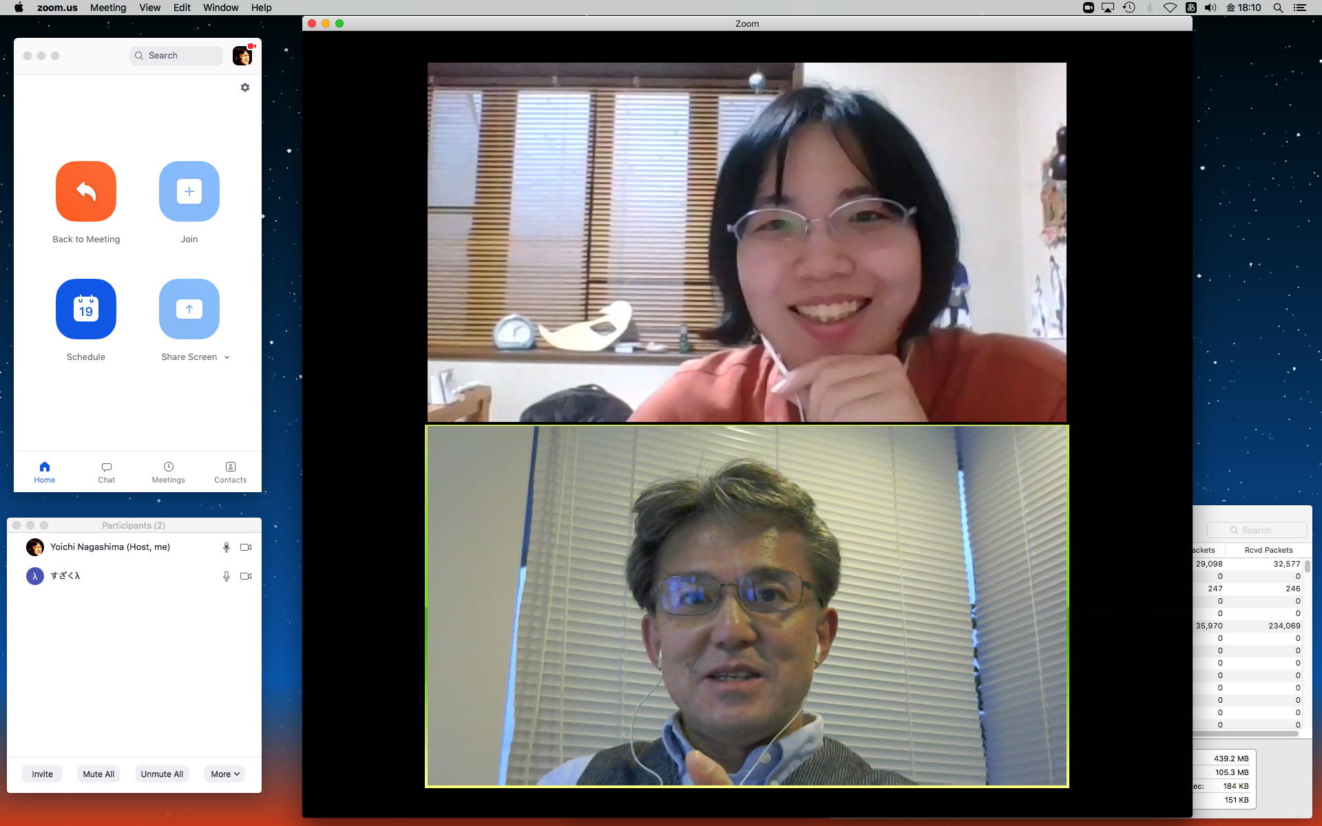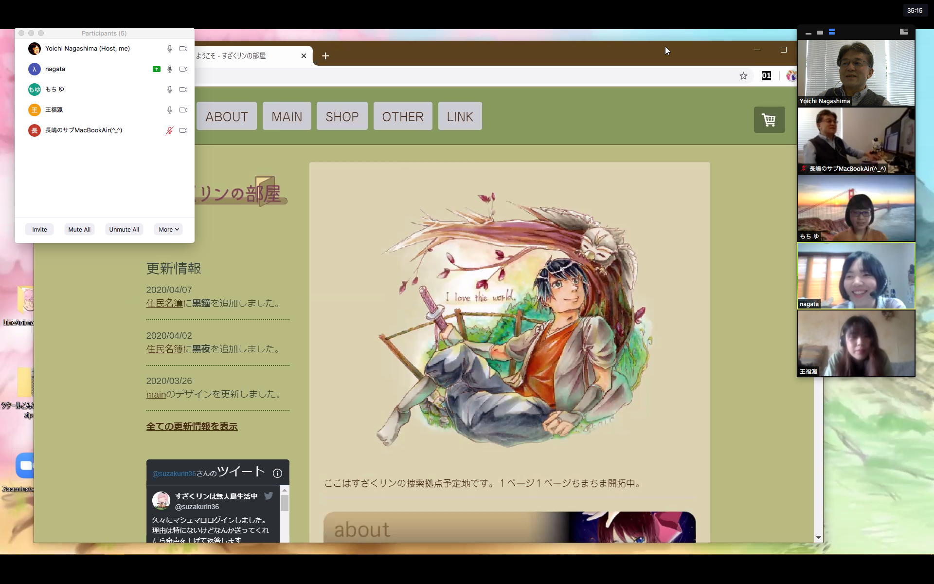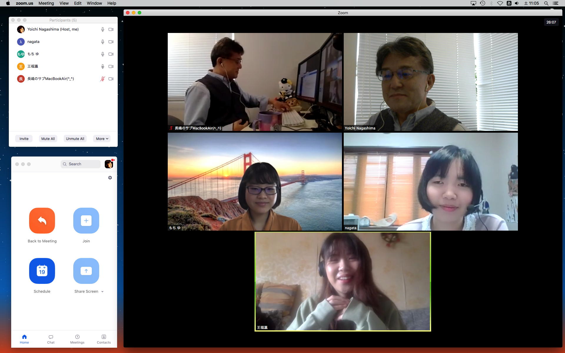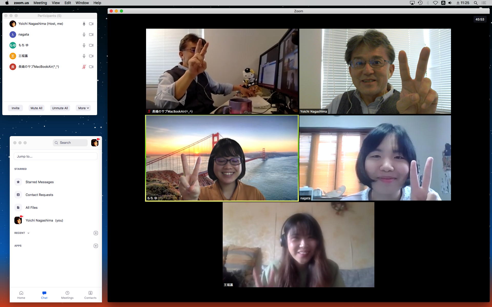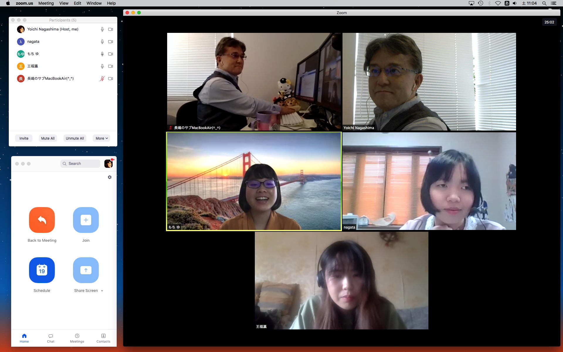 長嶋です。今日はZOOMというオンラインミーティングのツールを実験して、30分ほどでたぶん使えるようになりました。 僕とオンラインで会話の実験をしたいという人は、 (1)https://zoom.us/support/downloadでそれぞれの環境のZOOMアプリをダウンロードしてインストール (2)起動時の「Sign In」はしなくてもOK。サインインするとmeetingを主催できますが、参加だけなら不要 (セキュリティのために普段使っているメアドでなく、どこか「捨てアド」(使うのは最初の1回だけ)を使って、 パスワードも普段のものとかぶらないように捨てパスにしてメモしておいてください。ZOOMユーザの 個人情報が世界中で流出しましたので) (3)僕にメイルして、オンライン会話の日時を約束(僕が1106在室で即答なら「今から」というのもアリ) (4)約束の日時に僕が会議室を開設して、そのIDと入室パスを参加者にメイルします (5)そのメイルを受けたらZOOMを立ち上げてIDとパスを入れるとmeeting開始(^o^) という手順です。お互いに日時を連絡し合って複数メンバーも面白いかも。たぶん今期のゼミmeetingはこれに なりますので、4月中に一度は試してみて下さい。そして、大学からはいよいよ正式に「この前期は学生は学内に入らない」というような方針が届いたりして、ぼちぼち帰ろうかな・・・という時に、ゼミの永田さんから久しぶりにメイルが届いて、近況などを知ってその返信を書いている時に、今度は北京から来日できず待機している、ゼミ「研究生」の王さんから、上のメイルへの返信として「ご連絡有難うございます。分かりました。IDとパスを分かった後、ZOOMをテストします」というメイルが届いた。 そこで、駄目モトでZOOMを起動して、永田さんと王さんに「招待」のメイル(会議室IDと入室のパスワードを含む)を出してみたところ、あっさりと以下のように永田さんと繋がってお話していたら、さらに北京の王さんまで繋がって、3人のWeb会議が実現できてしまった。(^_^)