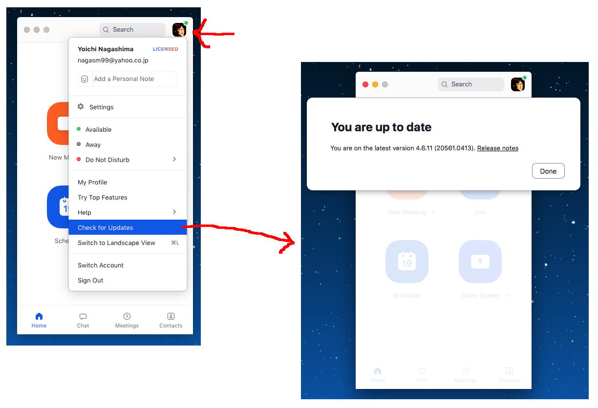 セキュリティの問題があるので、ZOOMを起動したら、常にまずは「現在の最新か?」をチェックしたい。 これは以下のように、自分のプロフィールのアイコンから出したプルダウンメニューの下の方にある「Check for Updates」でチェック出来る。
