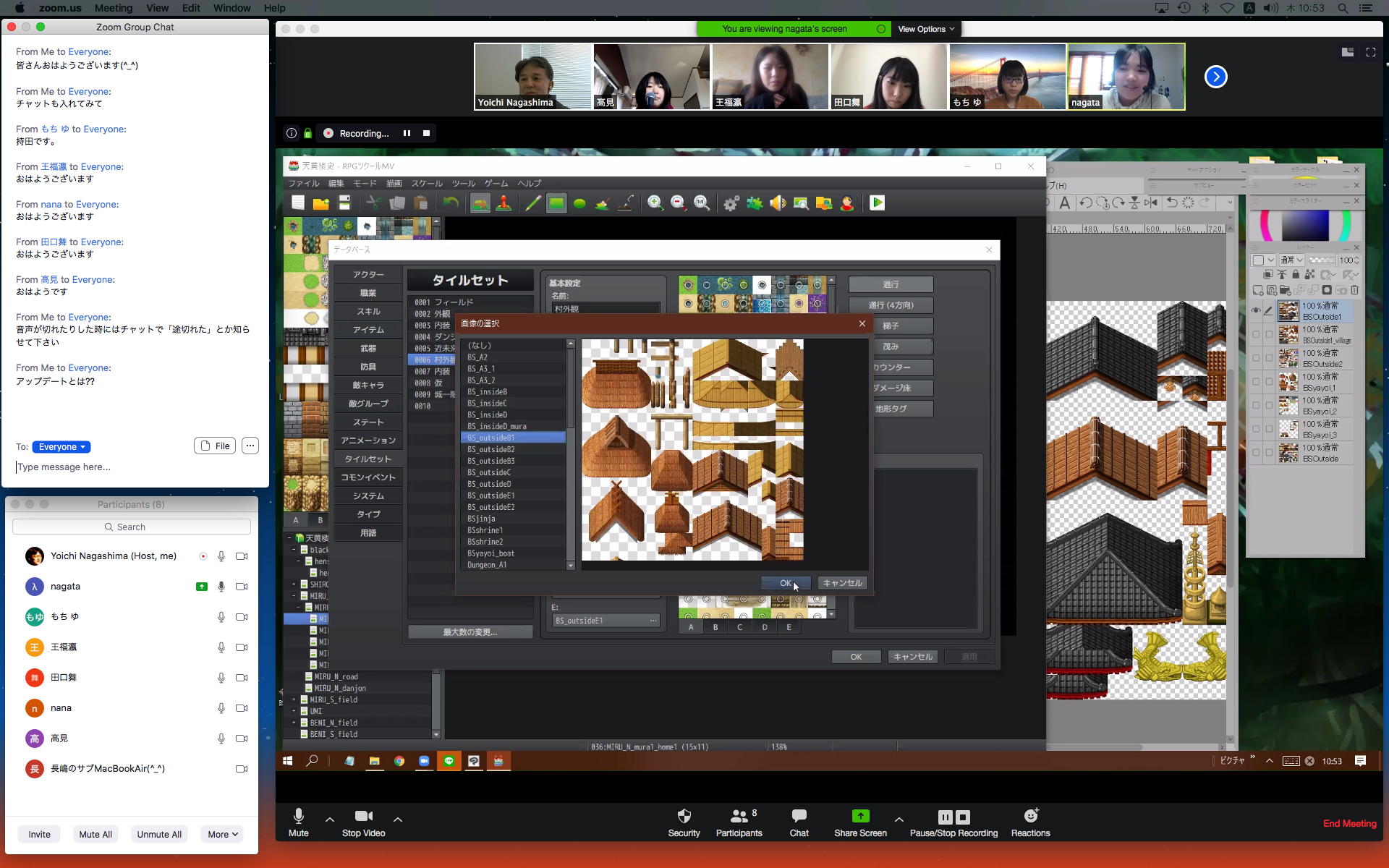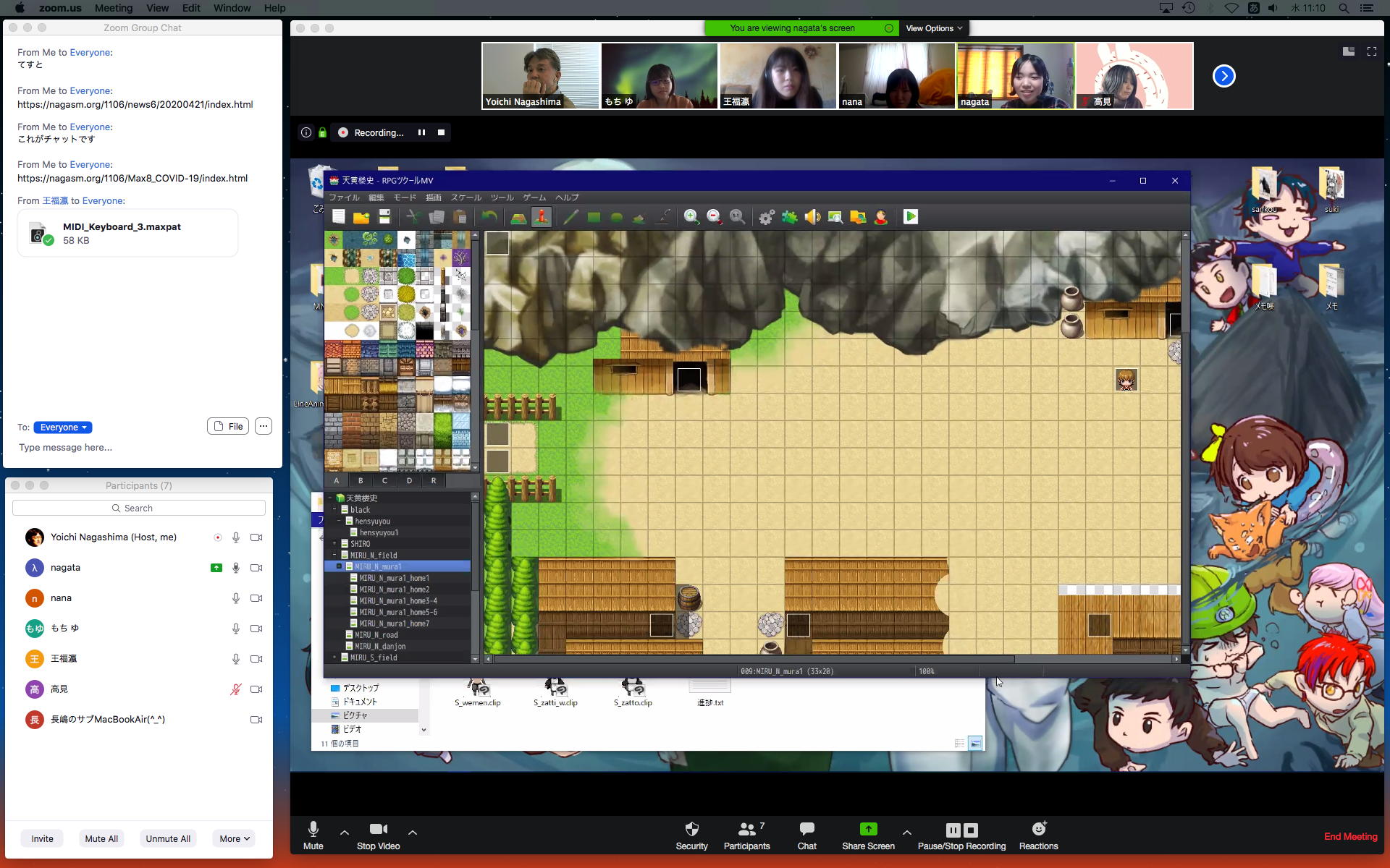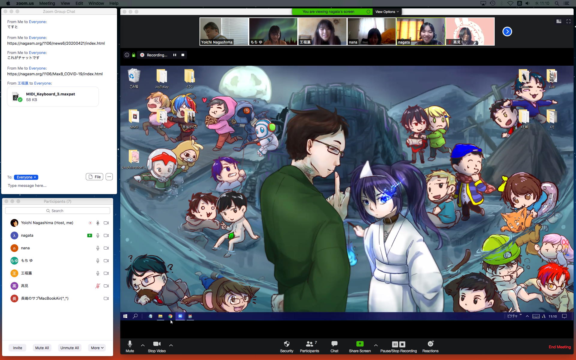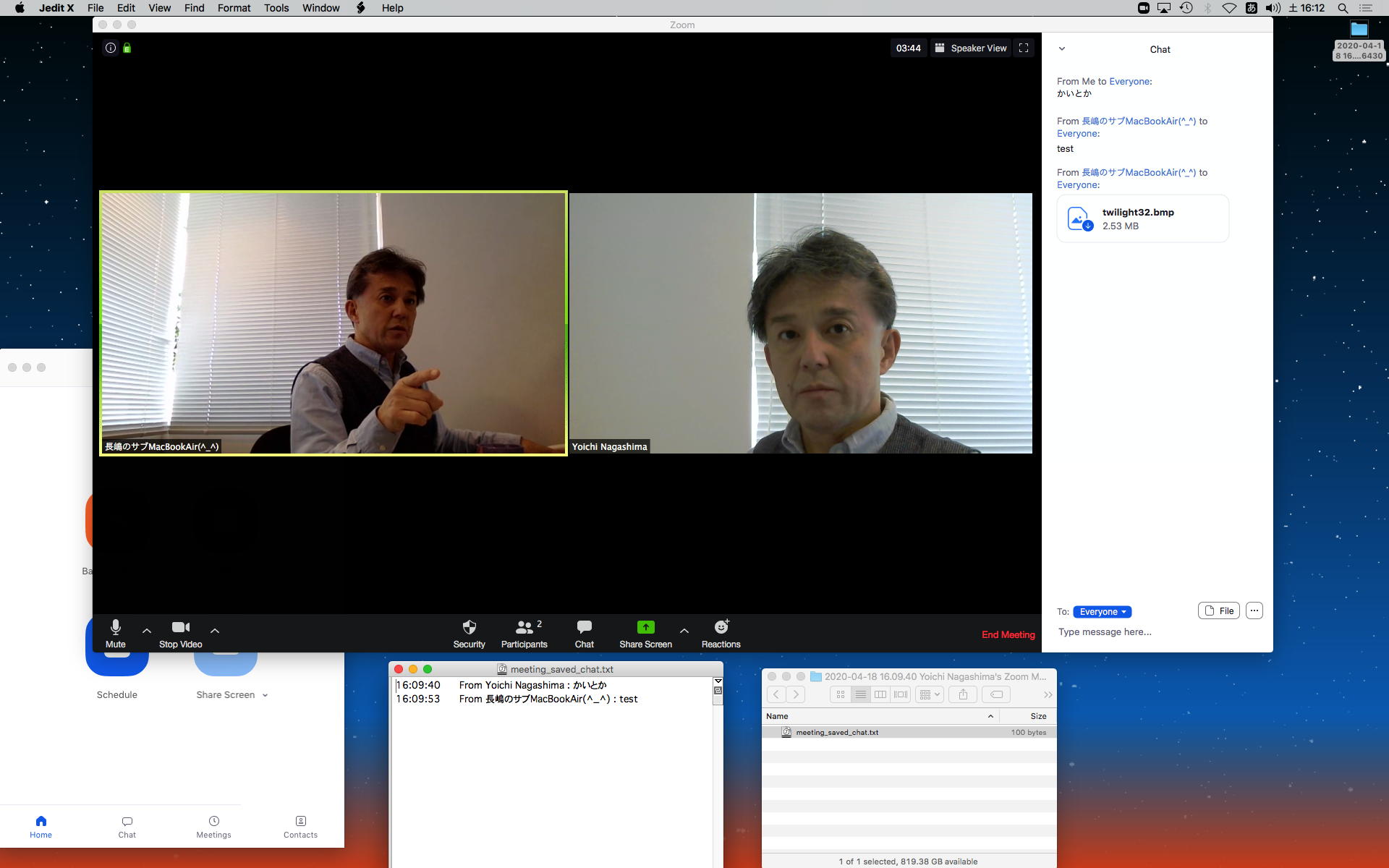 ホストの環境設定としてチャット機能をONに出来て、以下のようにチャットを書いたり読んだり、自動で保存されたり(これはデスクトップにフォルダが作られてその中に保存)、ファイルを指定してアップロード配布して、それをクリックするとダウンロード出来る(これダウンロードフォルダの中に保存された)ところまで確認できた。 チャット領域のマークで「ポップアウト」ってのをしたらチャットウインドウが別になったが、これを戻す方法はちょっと不明だった。