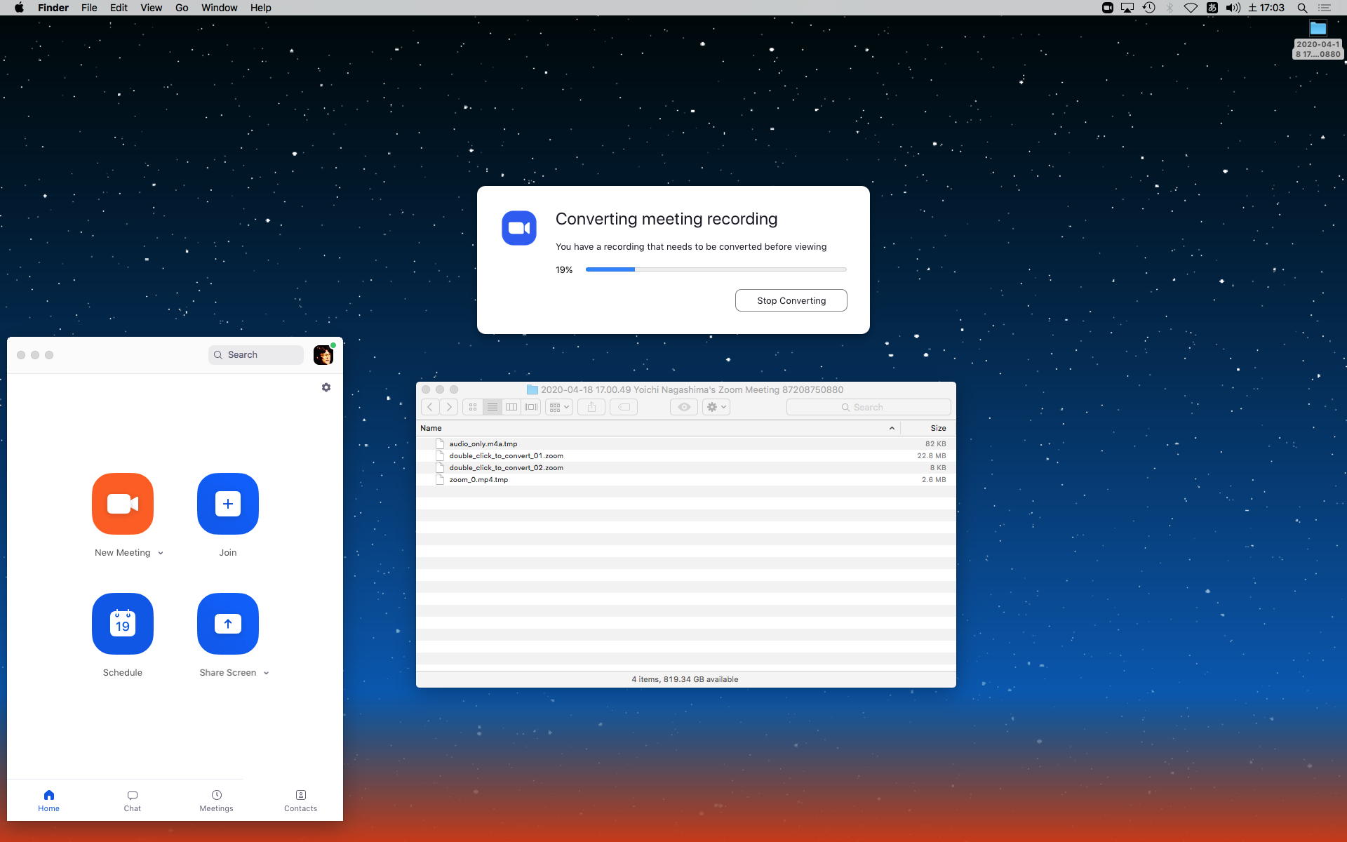 まず、管理者の設定メニューで「ローカル動画保存」をONにした。 すると新しいWeb会議の画面には「Recording」というボタンが出るので、このクリックで録画スタートとなり、チャットの自動保存と同じようにデスクトップに日時の記録されたフォルダが出来て、その中に暫定の記録データが刻々と作られる。 そして録画を終了すると、「セッション後にmp4に変換します」というダイアログが出て、そこからWeb会議が終了すると、以下のように変換画面で新たにmp4が書き出された。 当然ながら、Web会議の画面にあるアイコンの操作などは一切記録されず、本当に会議の中身そのものがきっちり動画となっていた。 これは月曜のテストで、ちょっとやってみよう。