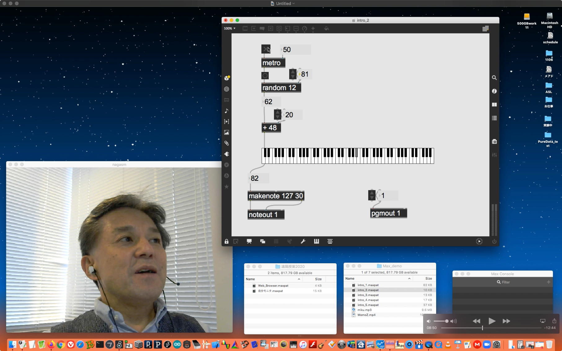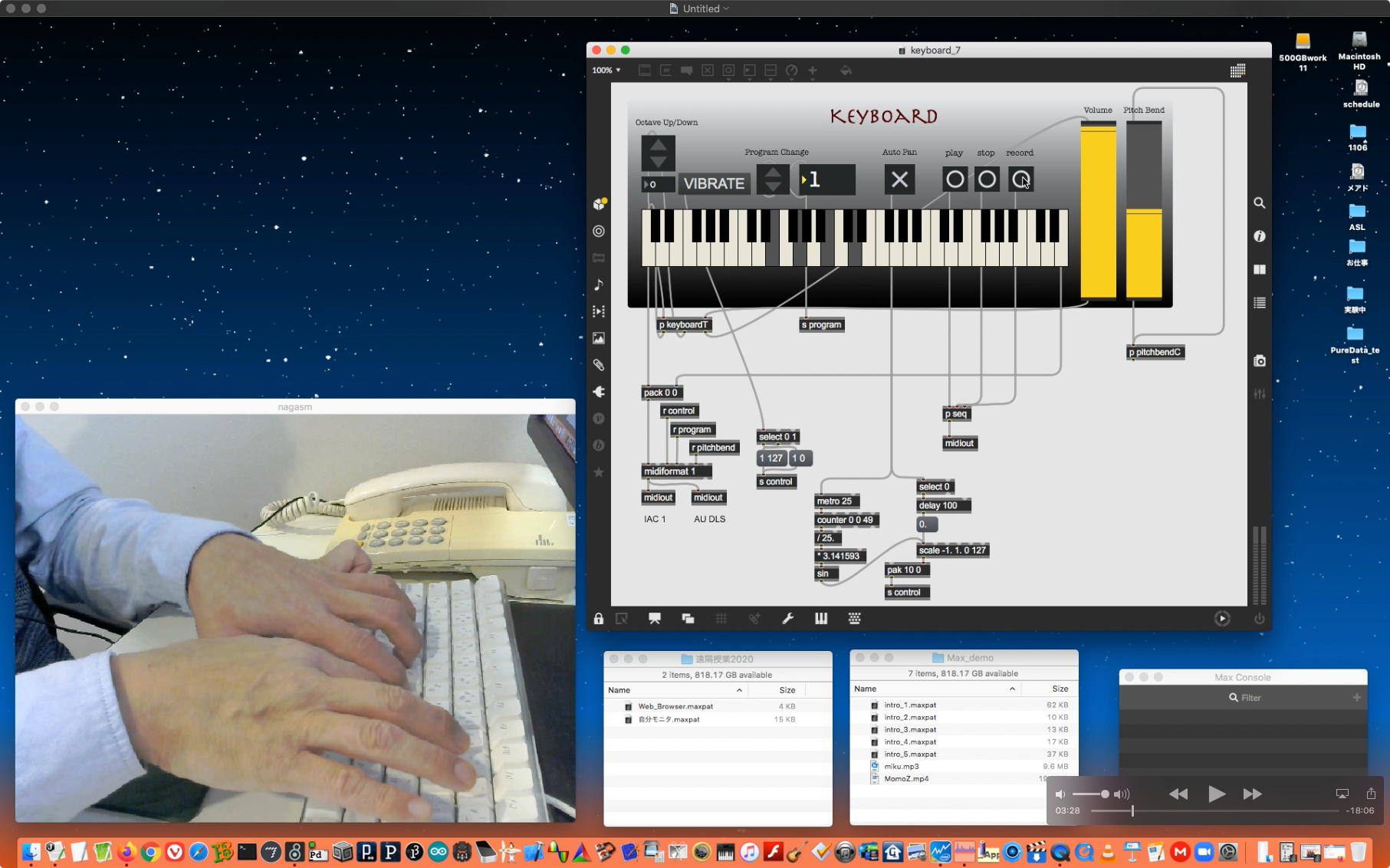 そして夕方になって、王さんから「MIDIキーボード」の最終版というパッチが届いたが、ちょうどそれまで、「サウンドデザイン」の教材として紹介するMax8の準備をしていたので、この王さんのパッチを含めて「Maxとはこんなもの(^_^)」という、上のような20分ほどの動画の一発撮りを完了した。 講義ページの中から参照する予定であるが、 これ である。 土曜の夕方ということで世間のネットも混雑しているのか、なかなかYouTubeにアップするスピードが遅いので、アップロードを放置したまま帰宅することにした。 おそらく1時間ぐらいすると見えると思うのだが、自宅ではネットしない僕は明日に確認することになる。