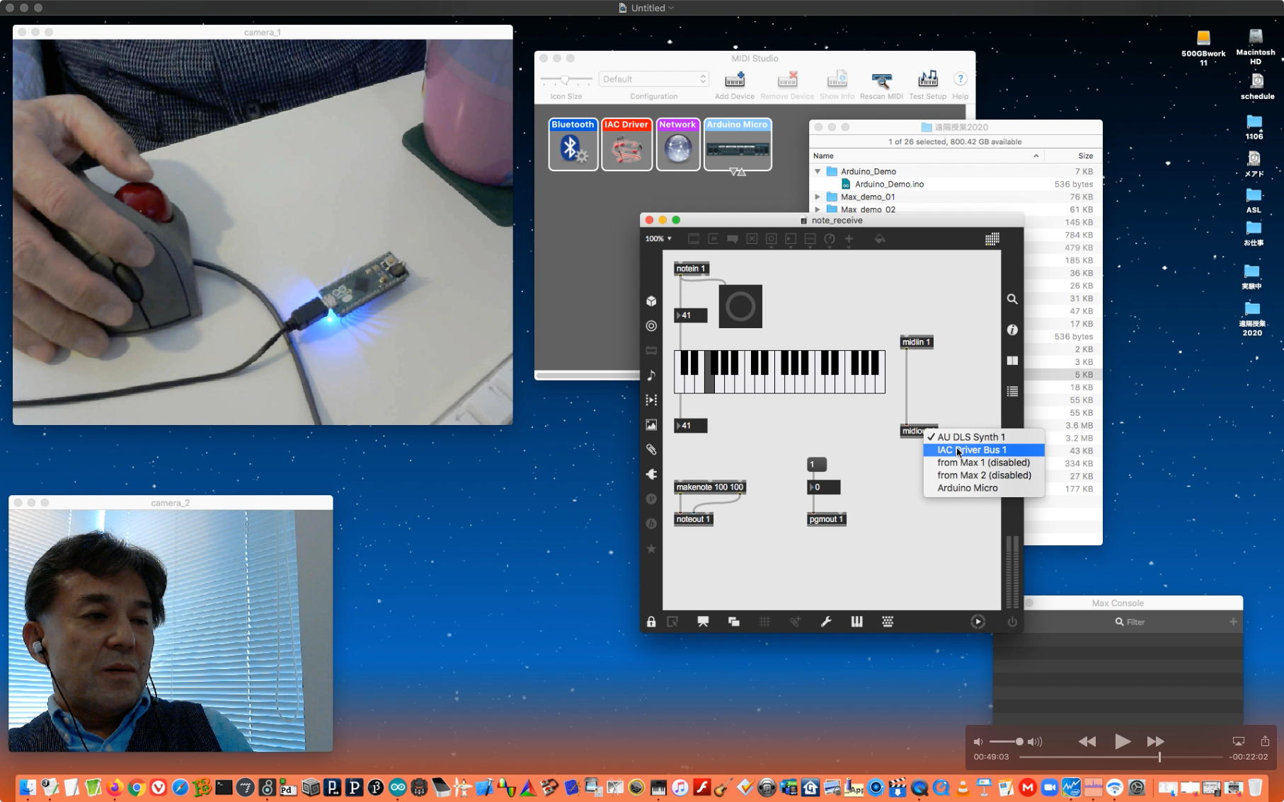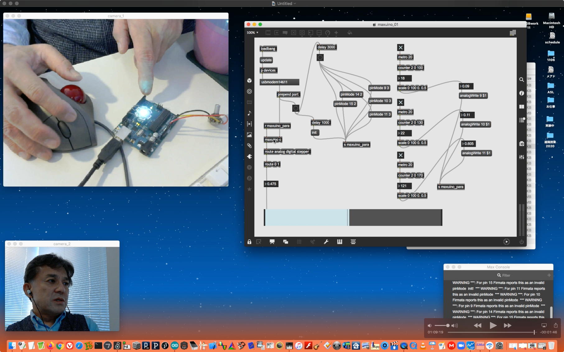 そして午後には上のように、Arduino2Maxと、ArduinoMIDIUSBと、さらにFirmata+Maxuinoと、盛り沢山の70分を超える Max8の紹介(4) を作ったところでオシマイとなった。 途中でエラーが出たりするところまで含めて、一発撮りの醍醐味であり、まさにライブComputer Musicのパフォーマンスと通じるところがある。 終わってみると所要時間が「2時間30分」とか言われたので、またまたYouTubeへのアップロードを放置したまま帰宅することにした。 明日は訳ありで午前遅くに研究室に出てきて、午後早くには帰るという予定があるので、ほとんど何も新しいことは出来ないだろう。