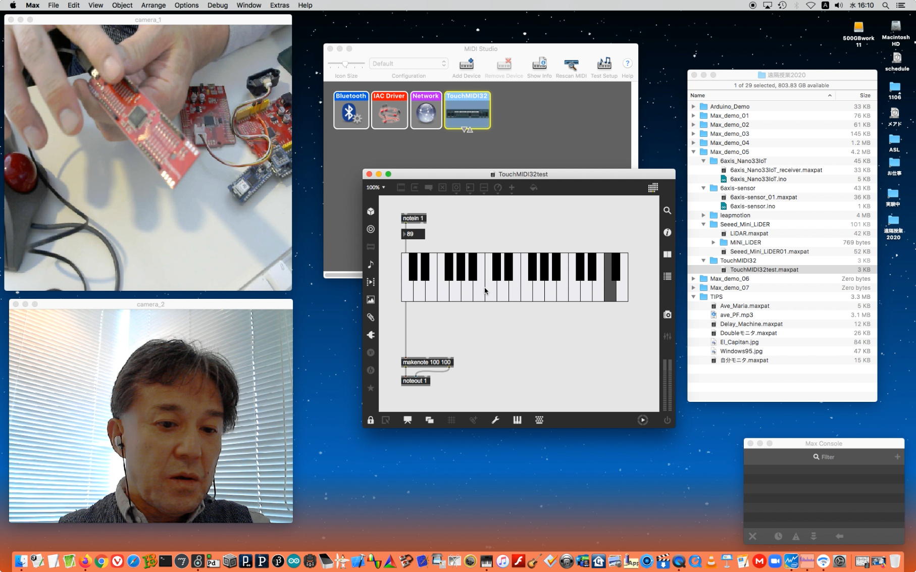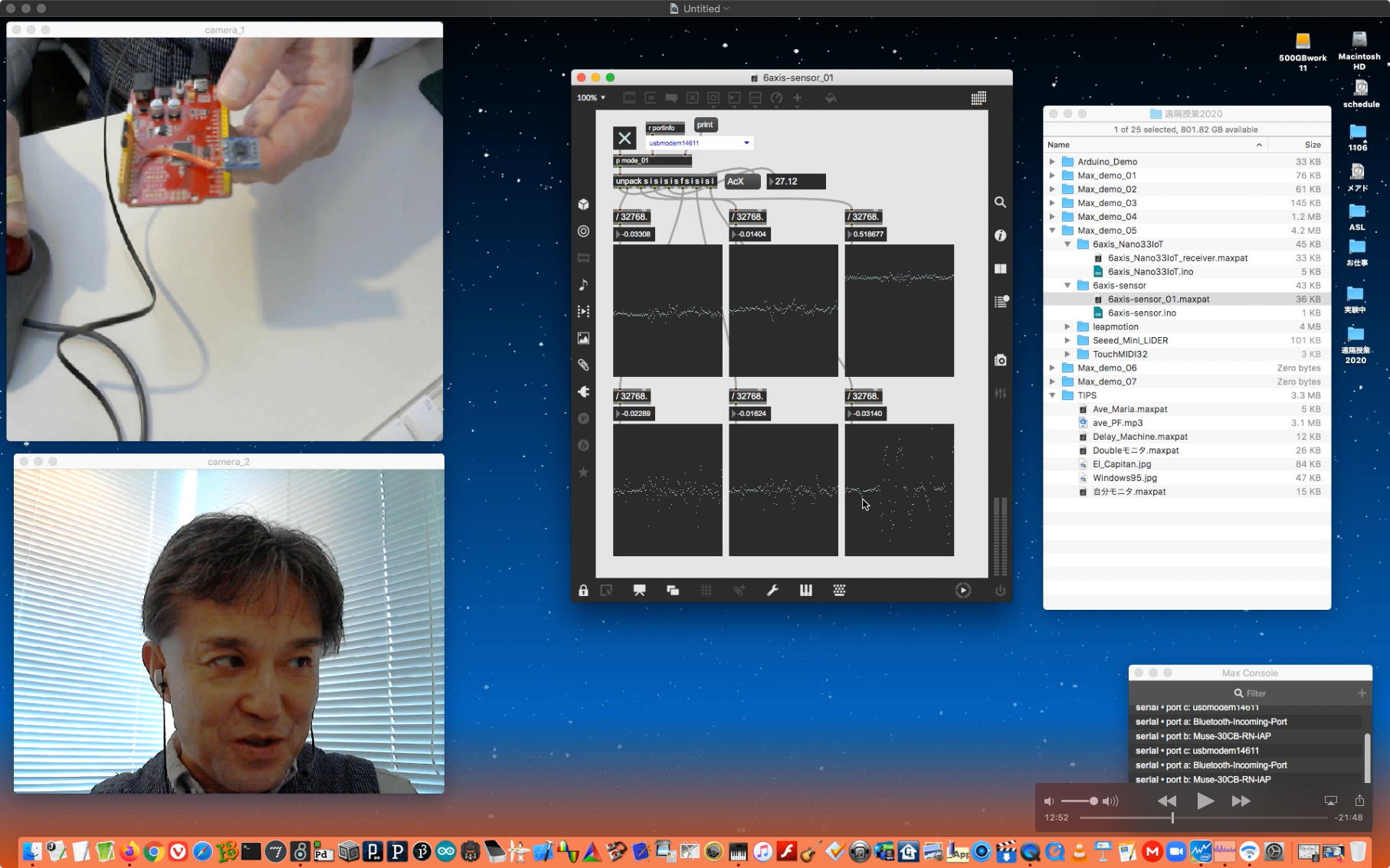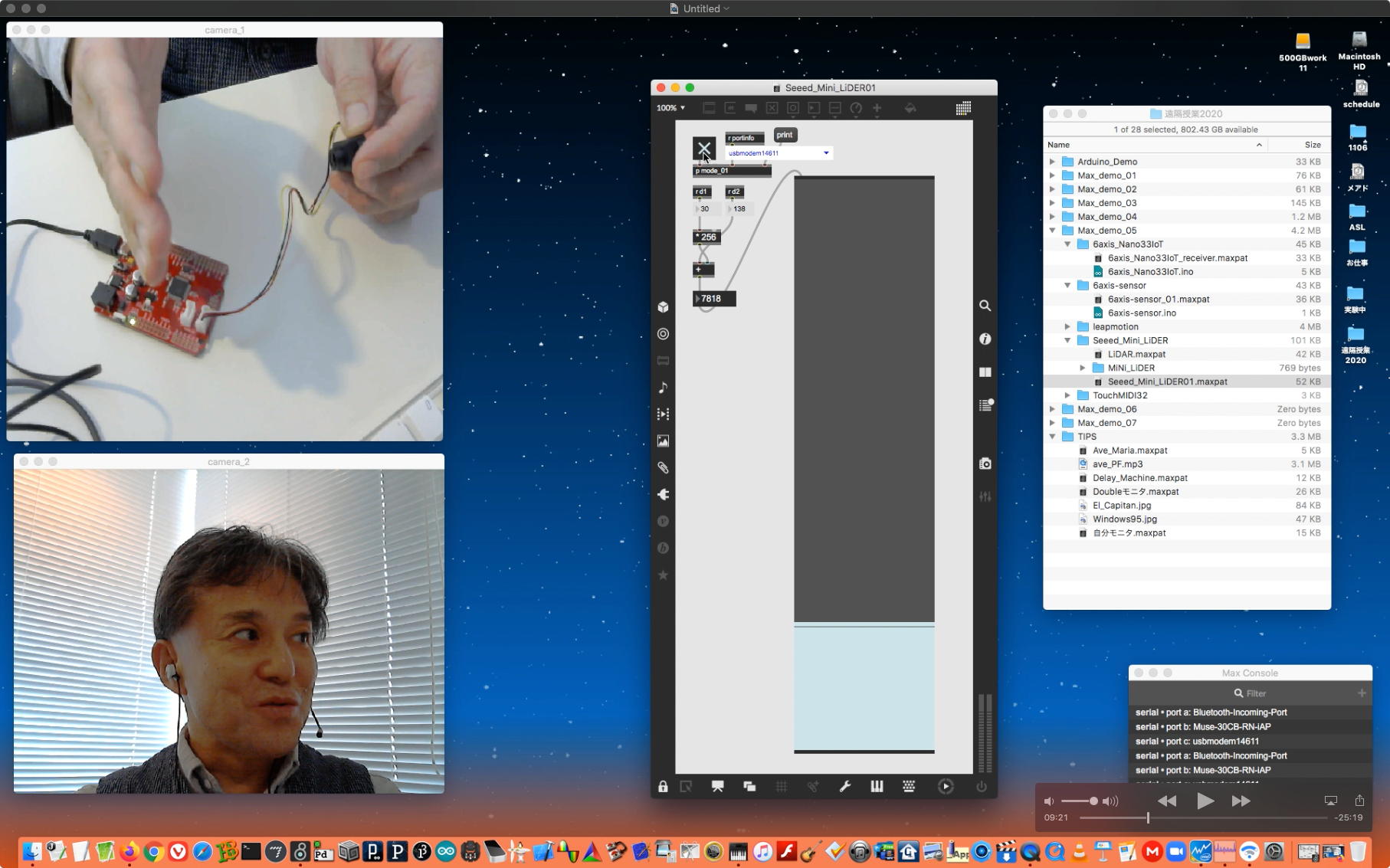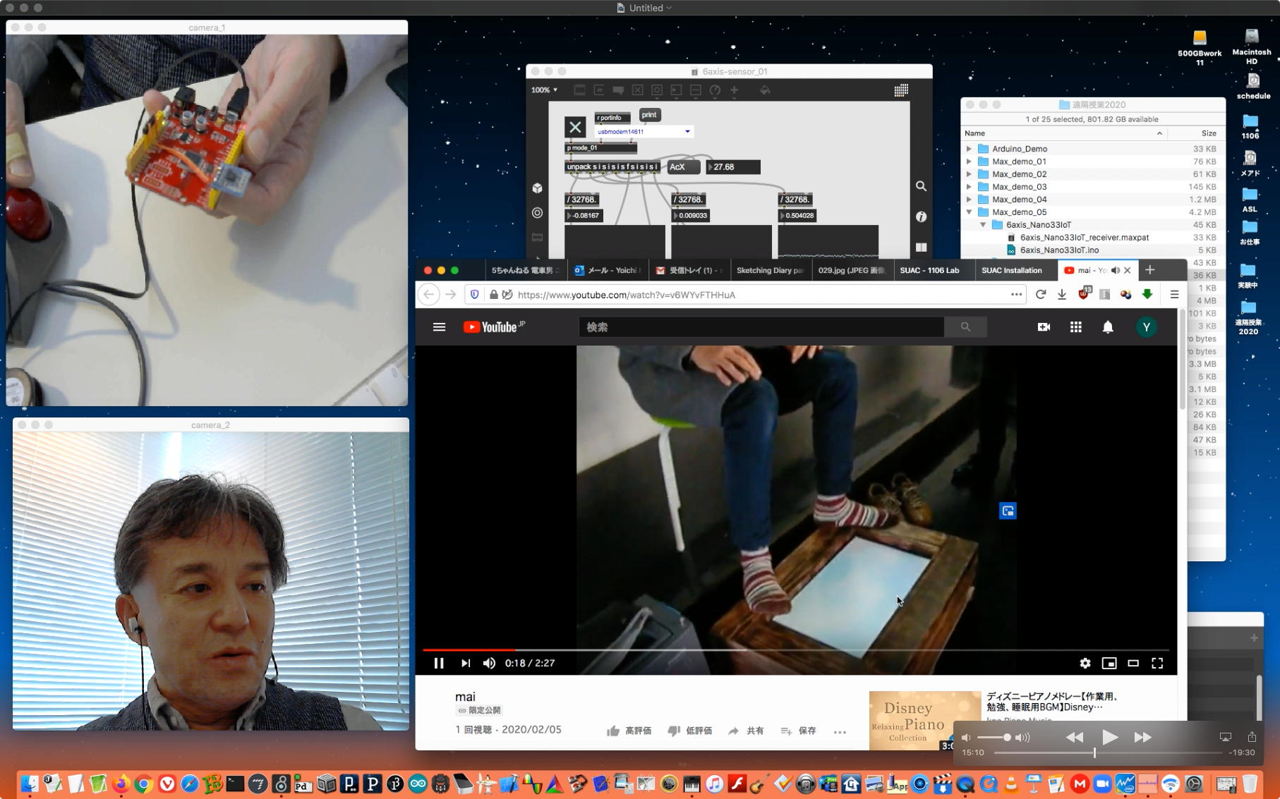 その後は上のように、TouchMIDI32と、SeeedMini+LiDERと、SeeedMini+6軸センサと、さらにArduinoNano33IoTの6軸センサ→AveMariaと、盛り沢山(34分)の Max8の紹介(5) を作った。 最後にleapmotionをデモりたかったが若干のトラブルが起きてこれは次回となったものの、またまた一発撮りを遂行した。 そのYouTubeへのアップロード所要時間は「1時間10分」と言われたので、またまたアップロードを放置したまま帰宅することにした。 明日は連休の谷間で、ゼミのZOOMミーティングの予定である。
