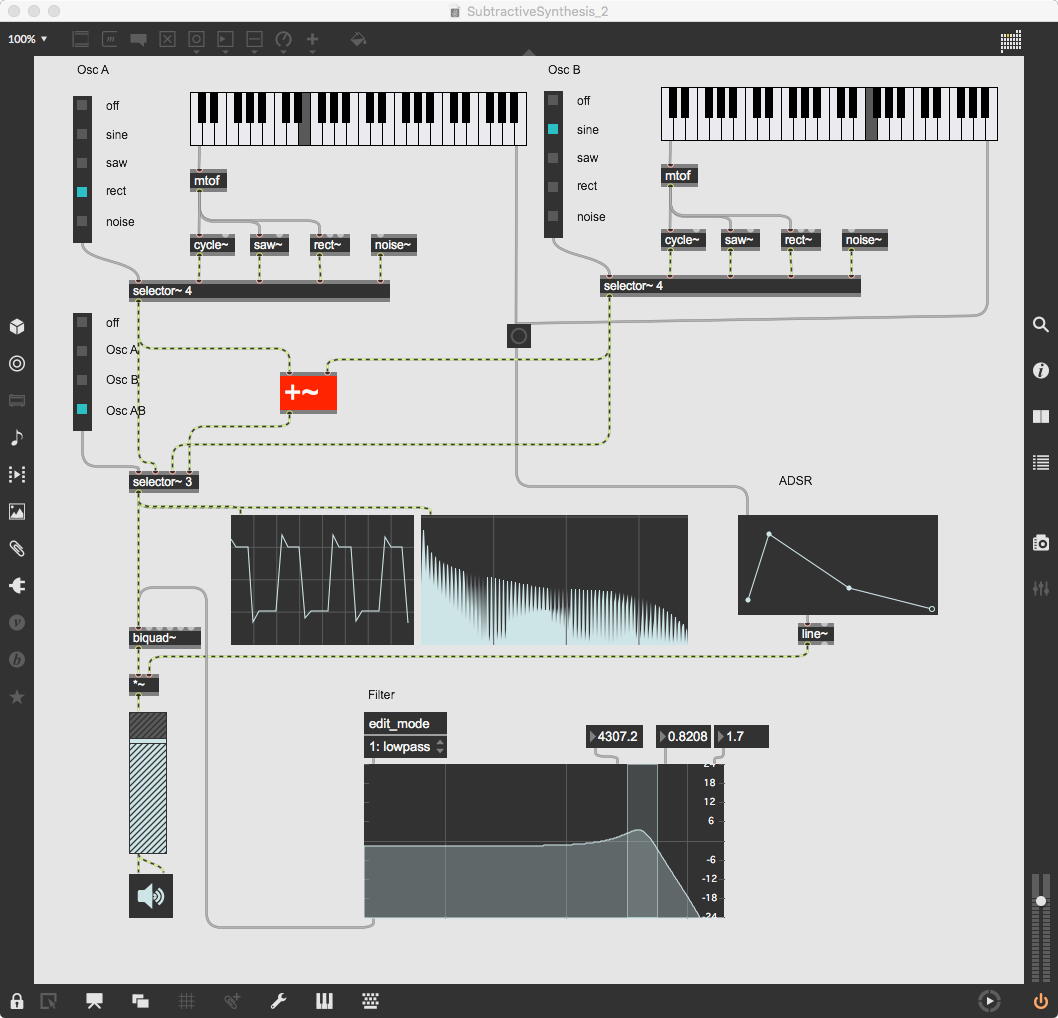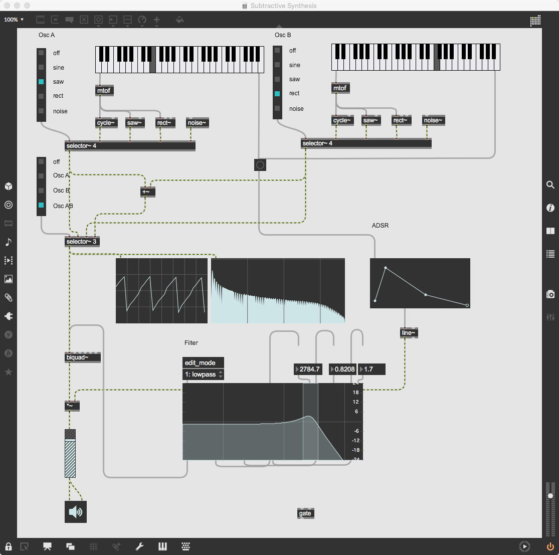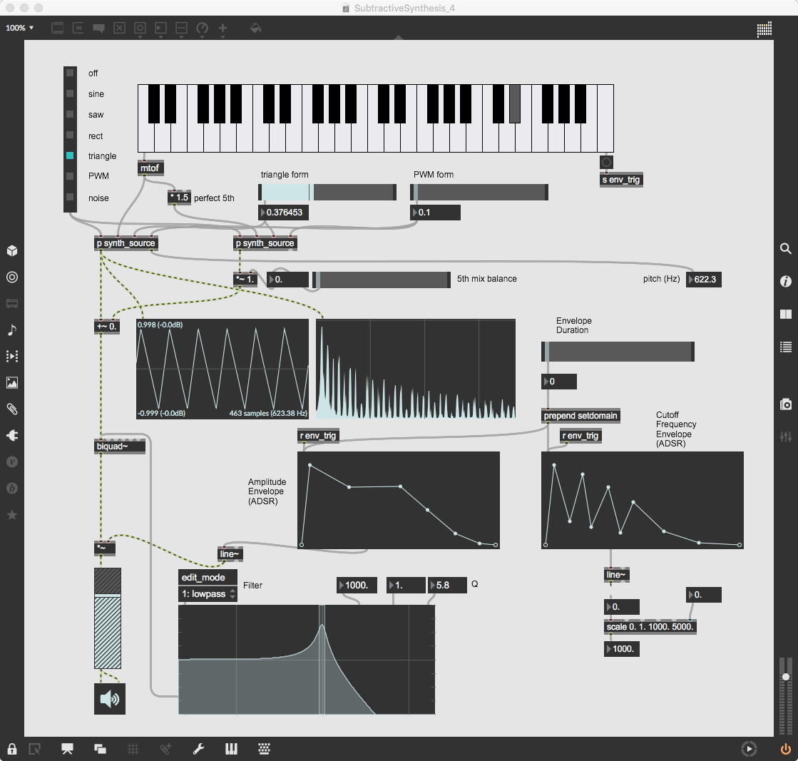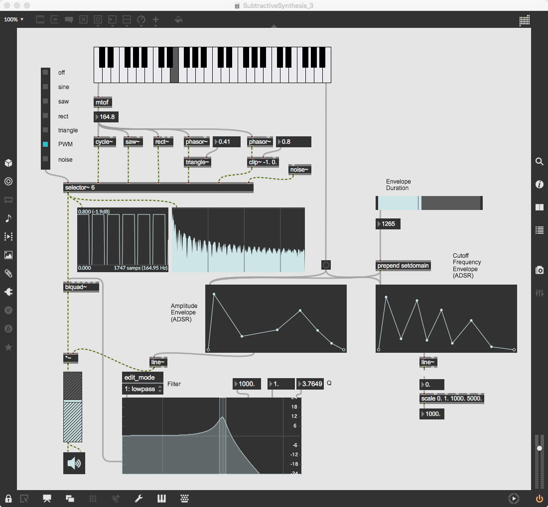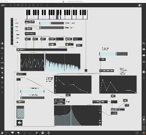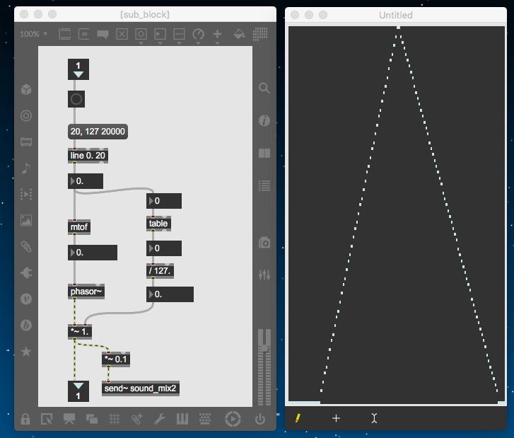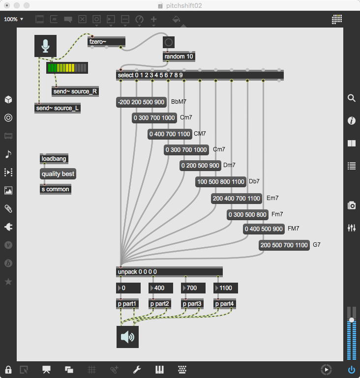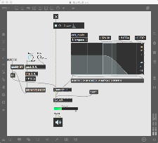 この出力に乗算する「*~」には、「ゼロ→1」までを13秒間(6半音下→ピッタリ)、次に1のままで13秒間(ピッタリ→6半音上)、最後に「1→ゼロ」までを13秒間(6半音上→オクターブ上)という等脚台形エンベロープが生成される。 これが3ブロックあって、次々に13秒ごとに起動する(「ピッタリ→6半音上」という区間だけが最大音量で、それ以前とそれ以後は線形でクロスフェードする)、というシンプルなものである。