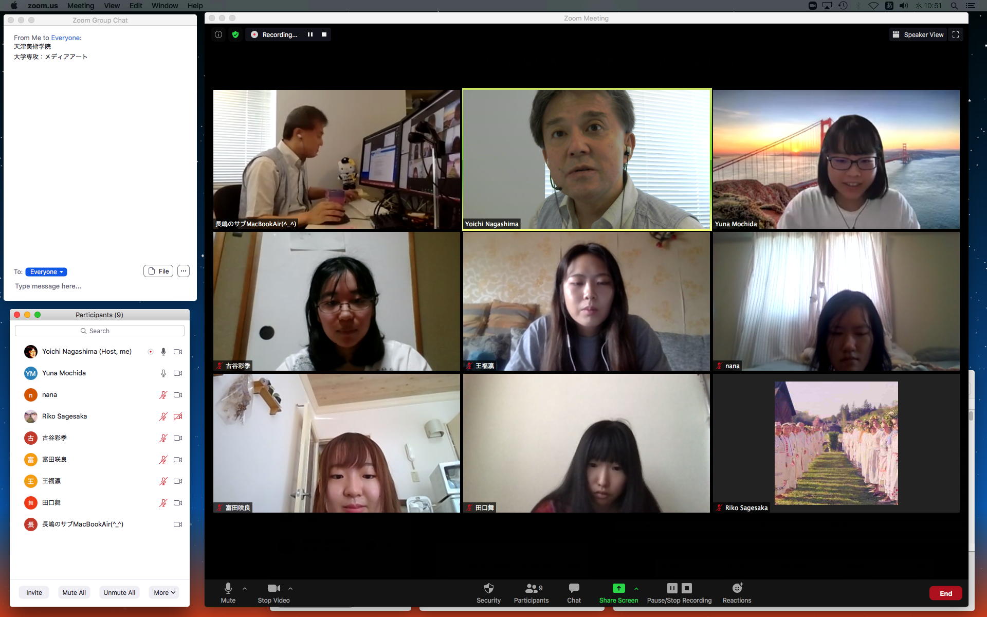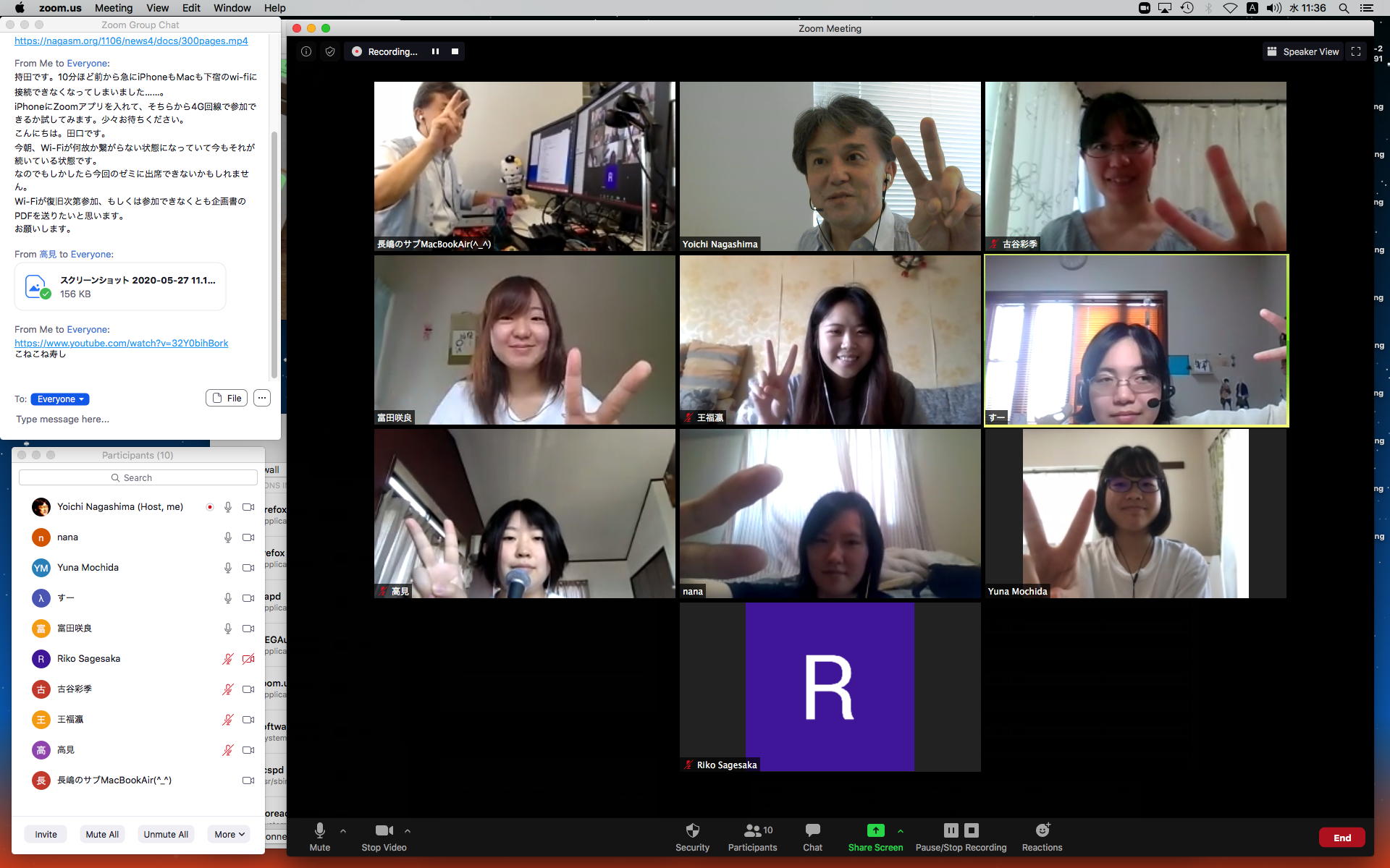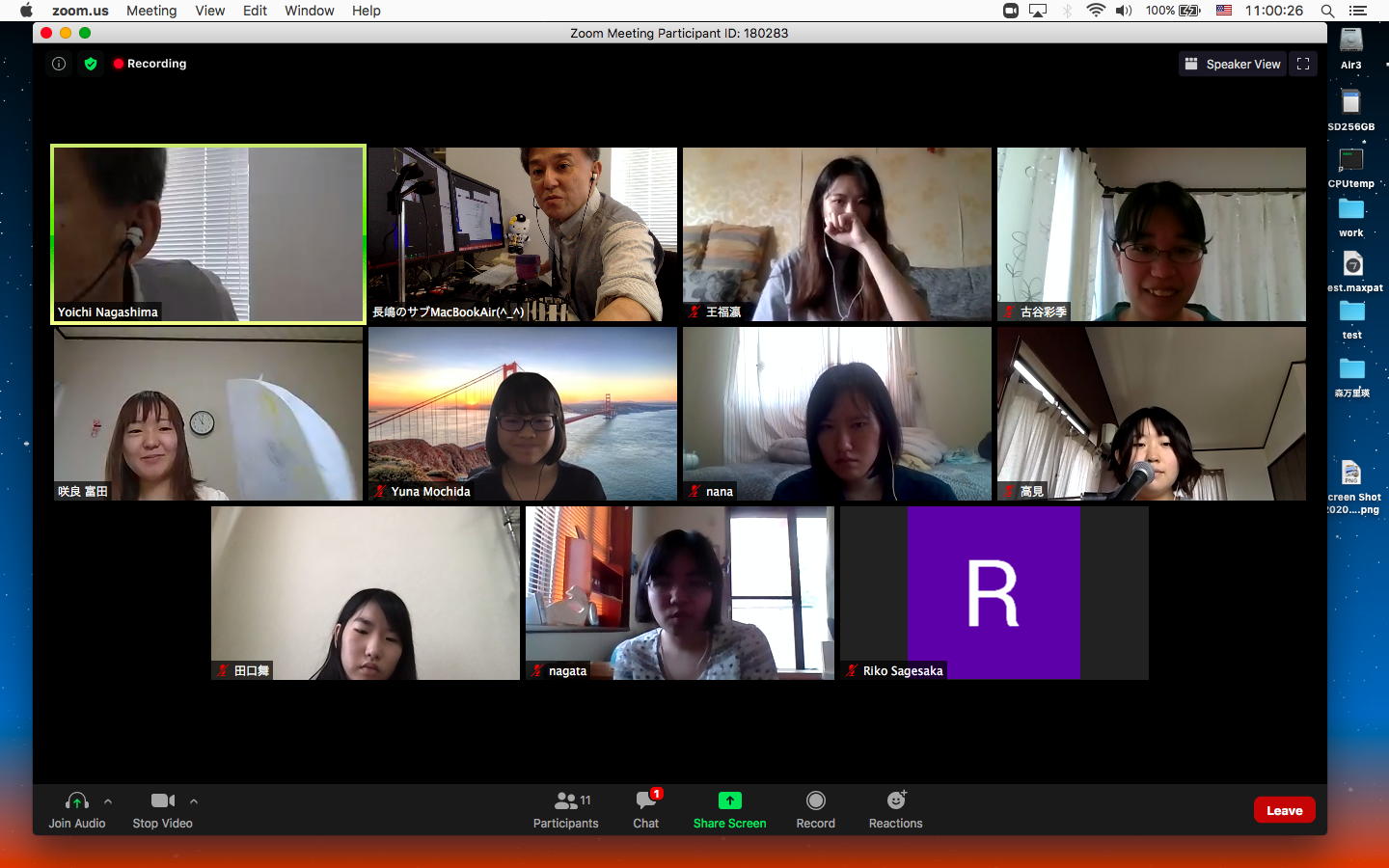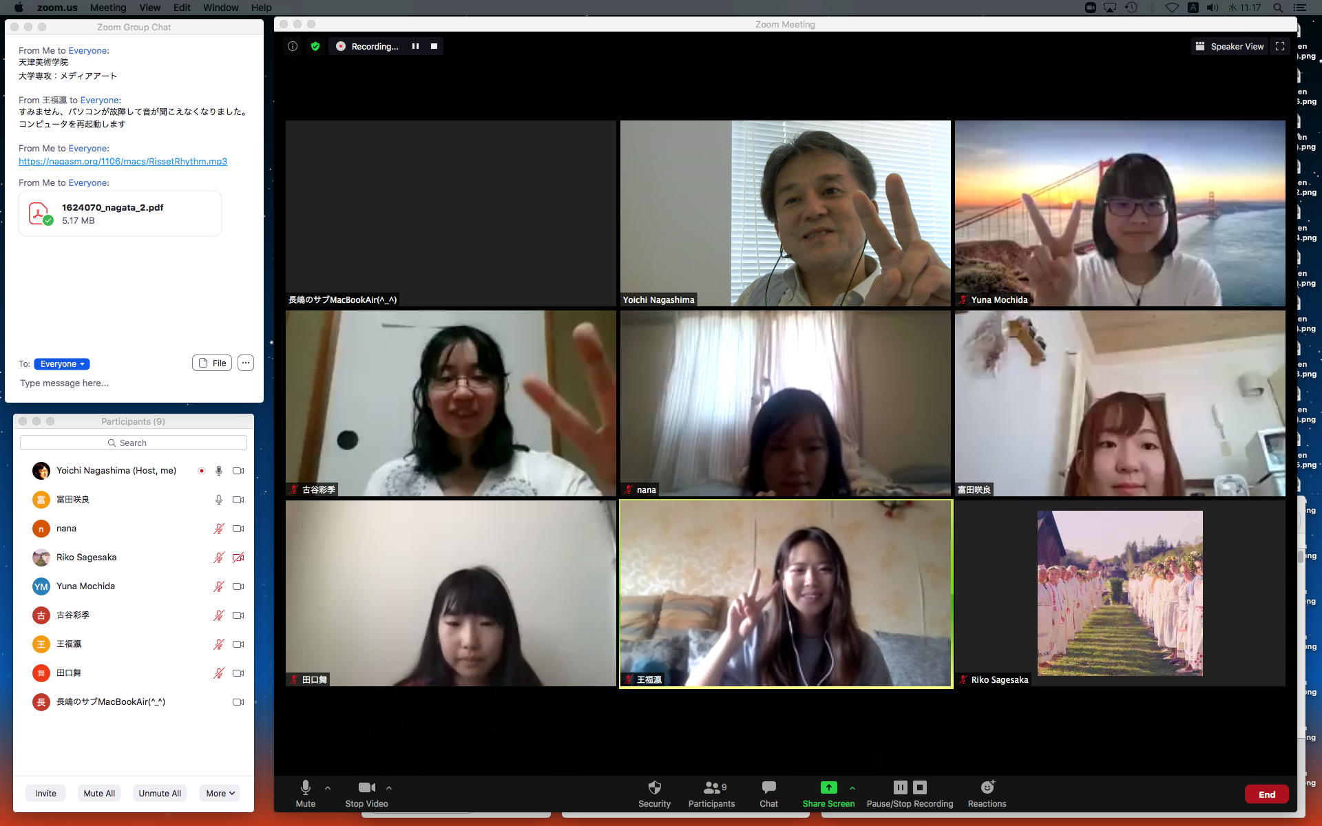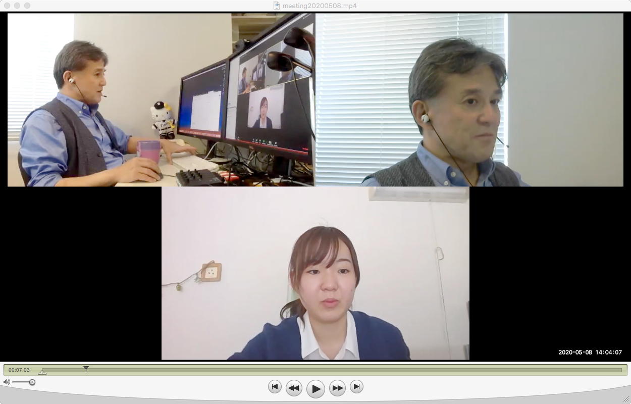 昨日の昼過ぎにアップして受講学生に告知した「サウンドデザイン」だが、もう昨日の日付で3人からレポートのメイルが届いていた。 これにいちいちコメントするので、なかなか前途は多難である。 そして2限には、5/11から開始の新学期としては初めての「ゼミZOOMミーティング」を開催した。 初めてとなった理子ちゃんは「顔出しナシ」というスタイルを貫いたが、3回生で加わった古谷さんと富田さんも参加、茨城県日立市から参加のOG・馬ブンさんを含めてゼミ全員が揃って、以下のようにそれぞれの進捗を報告した。