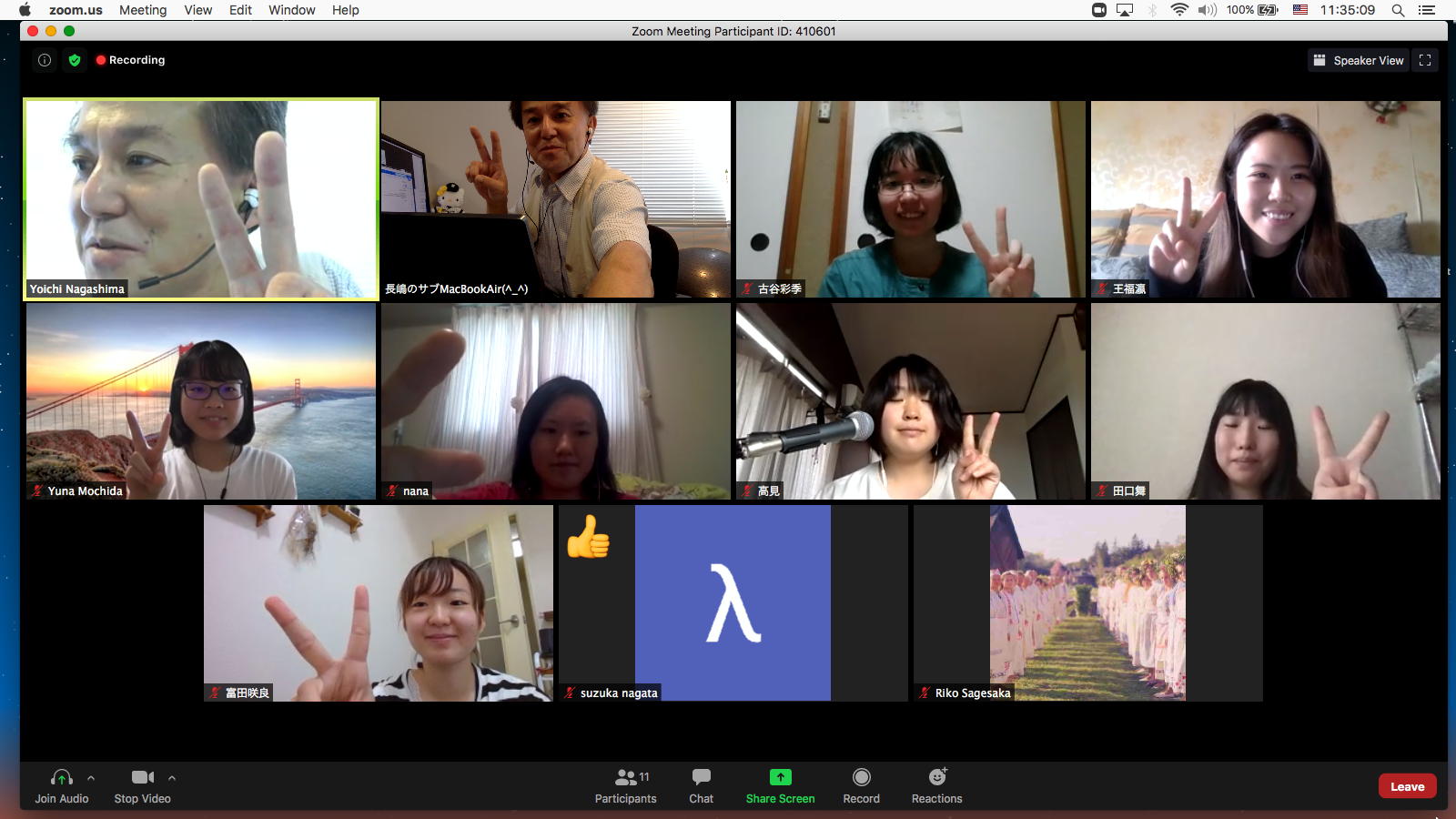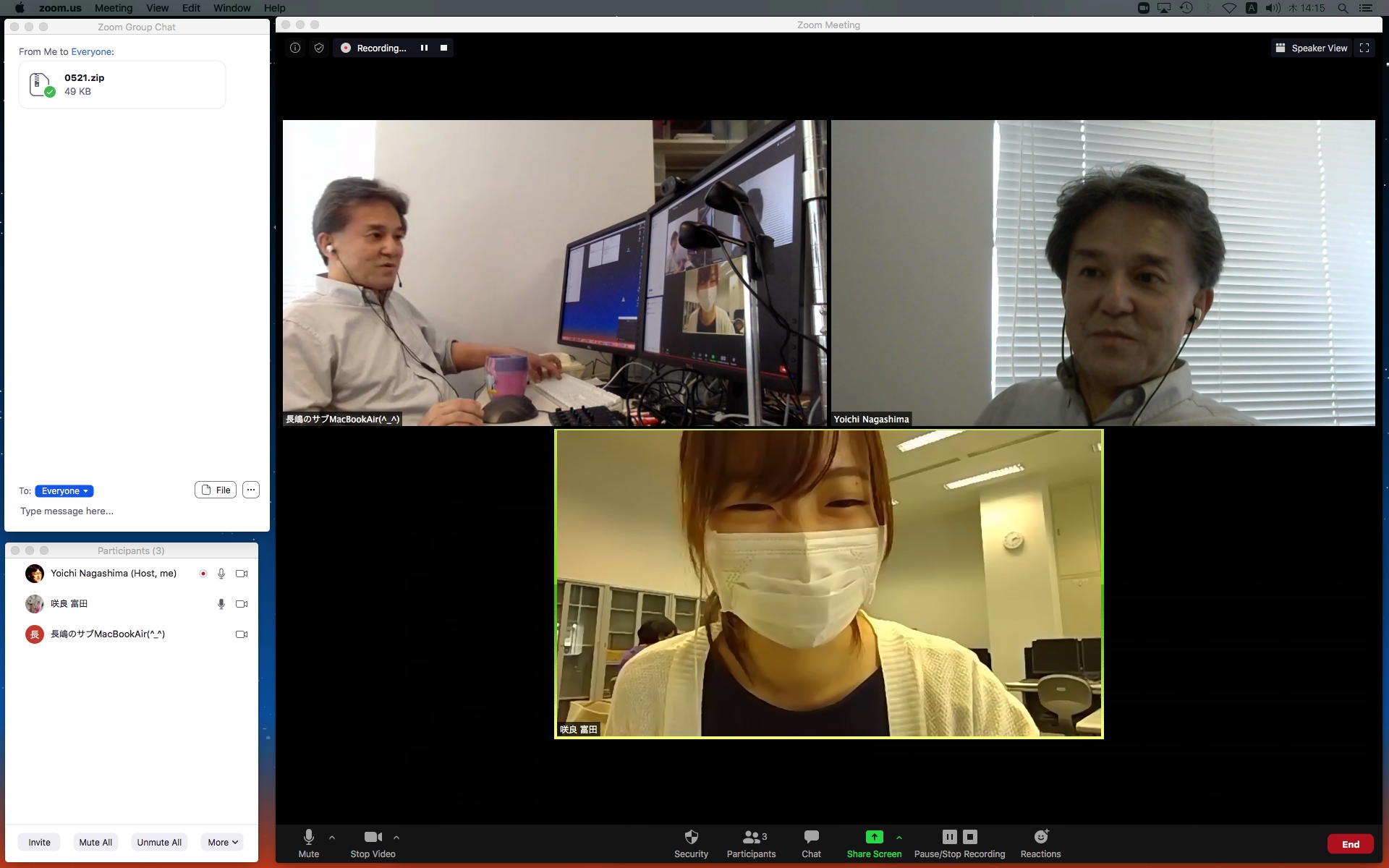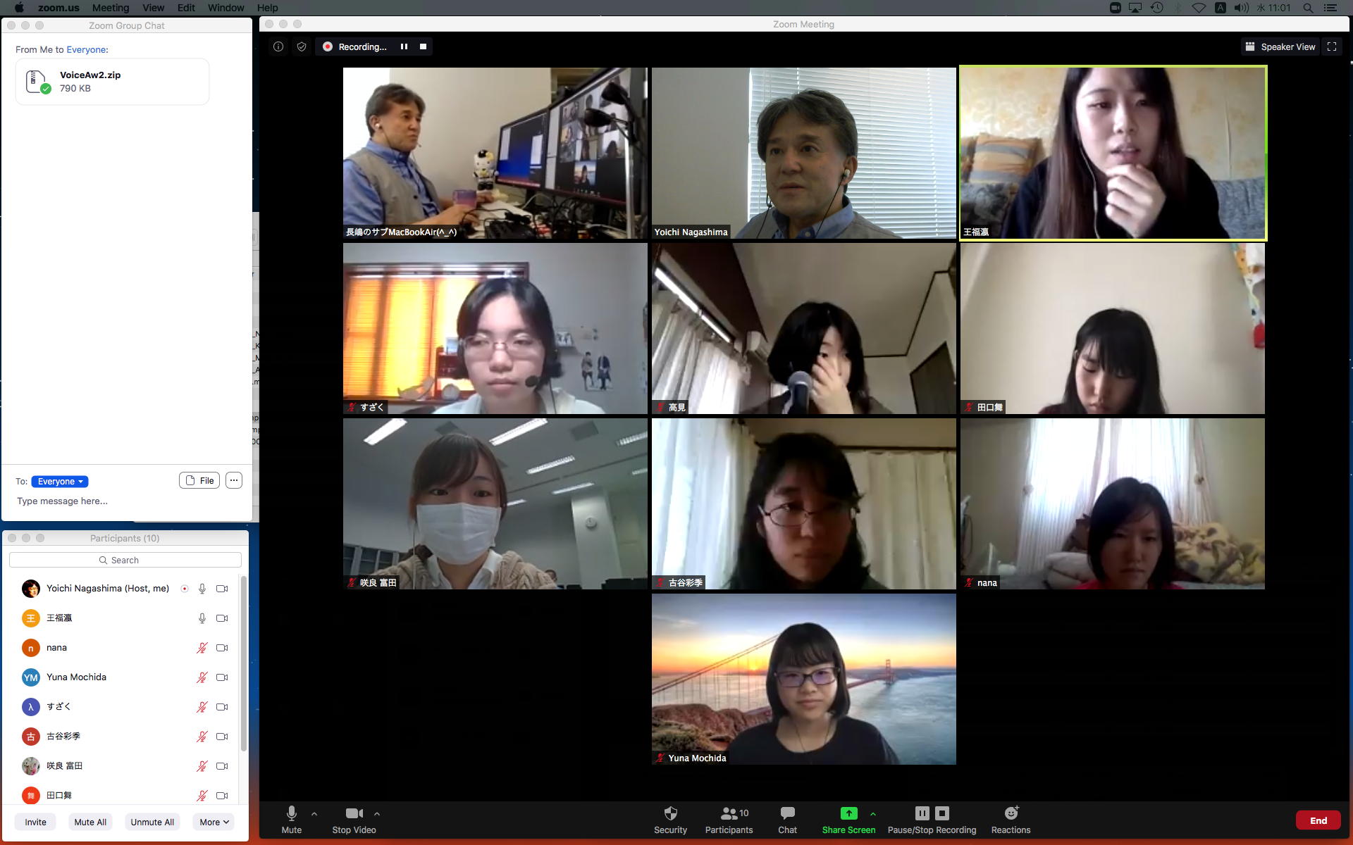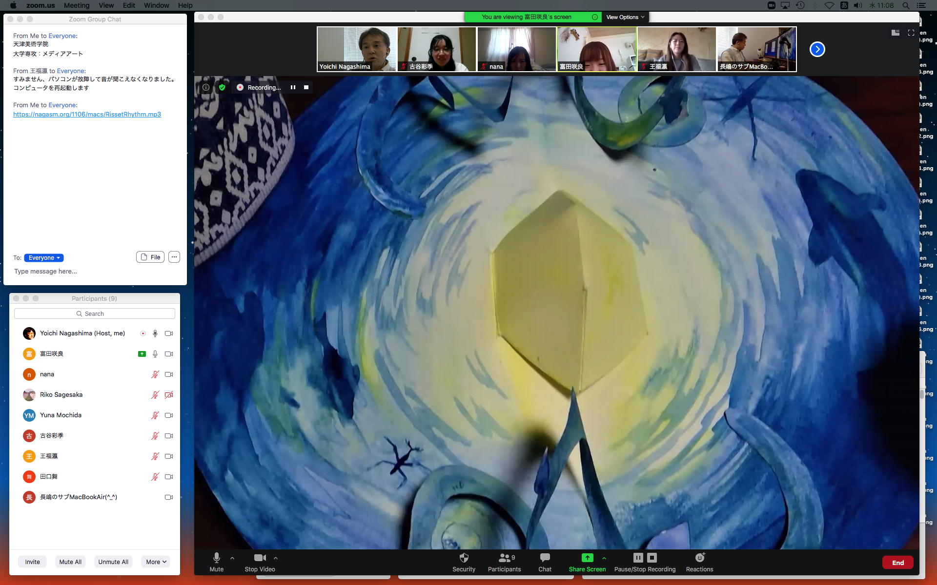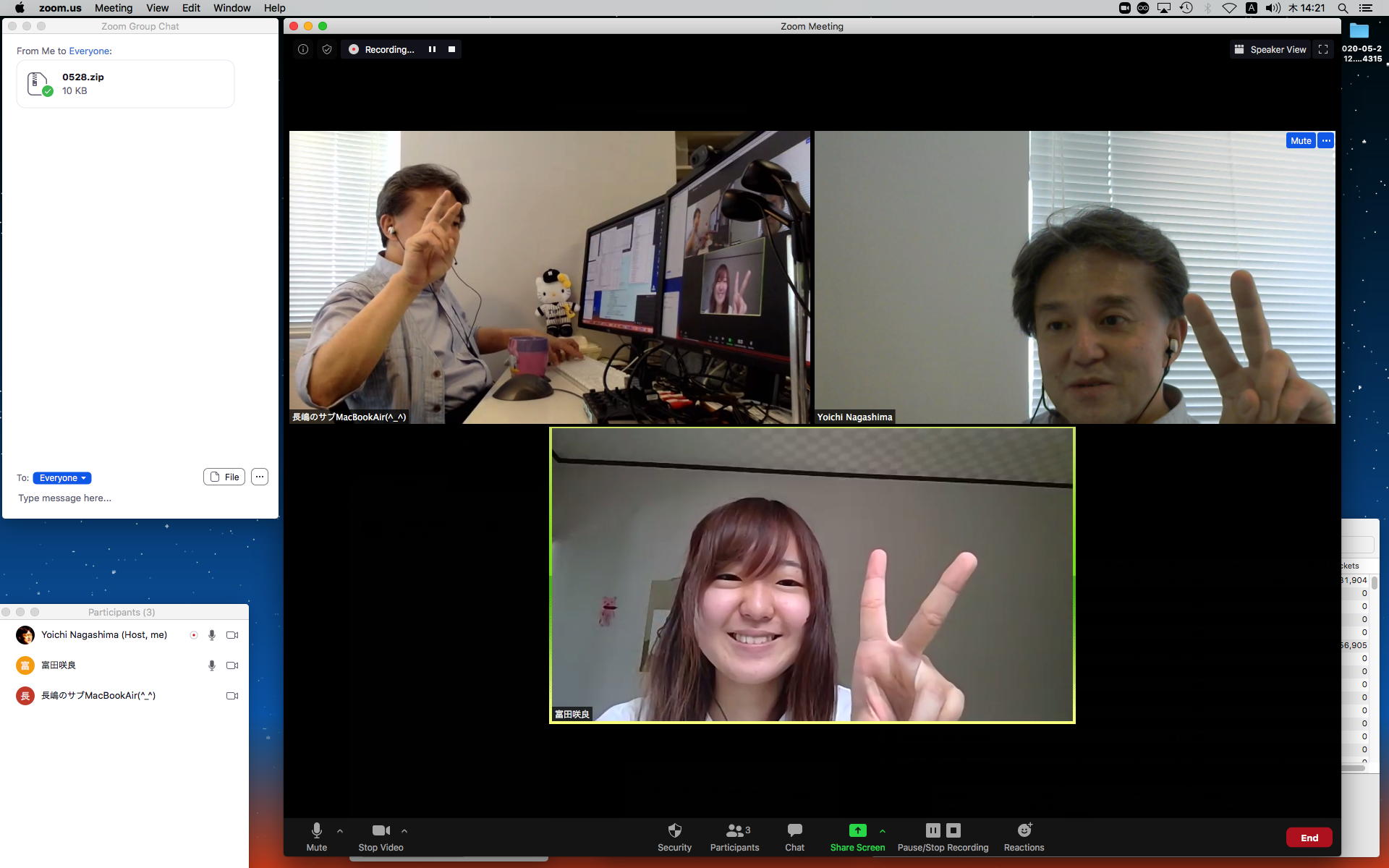 昨日の昼過ぎにアップして受講学生に告知した「サウンドデザイン」だが、もう昨日の日付で3人からレポートのメイルが届いていた。 これにいちいちコメントするので、なかなか前途は多難である。 そして2限には、5/11から開始の新学期としては初めての「ゼミZOOMミーティング」を開催した。 初めてとなった理子ちゃんは「顔出しナシ」というスタイルを貫いたが、3回生で加わった古谷さんと富田さんも参加、茨城県日立市から参加のOG・馬ブンさんを含めてゼミ全員が揃って、以下のようにそれぞれの進捗を報告した。