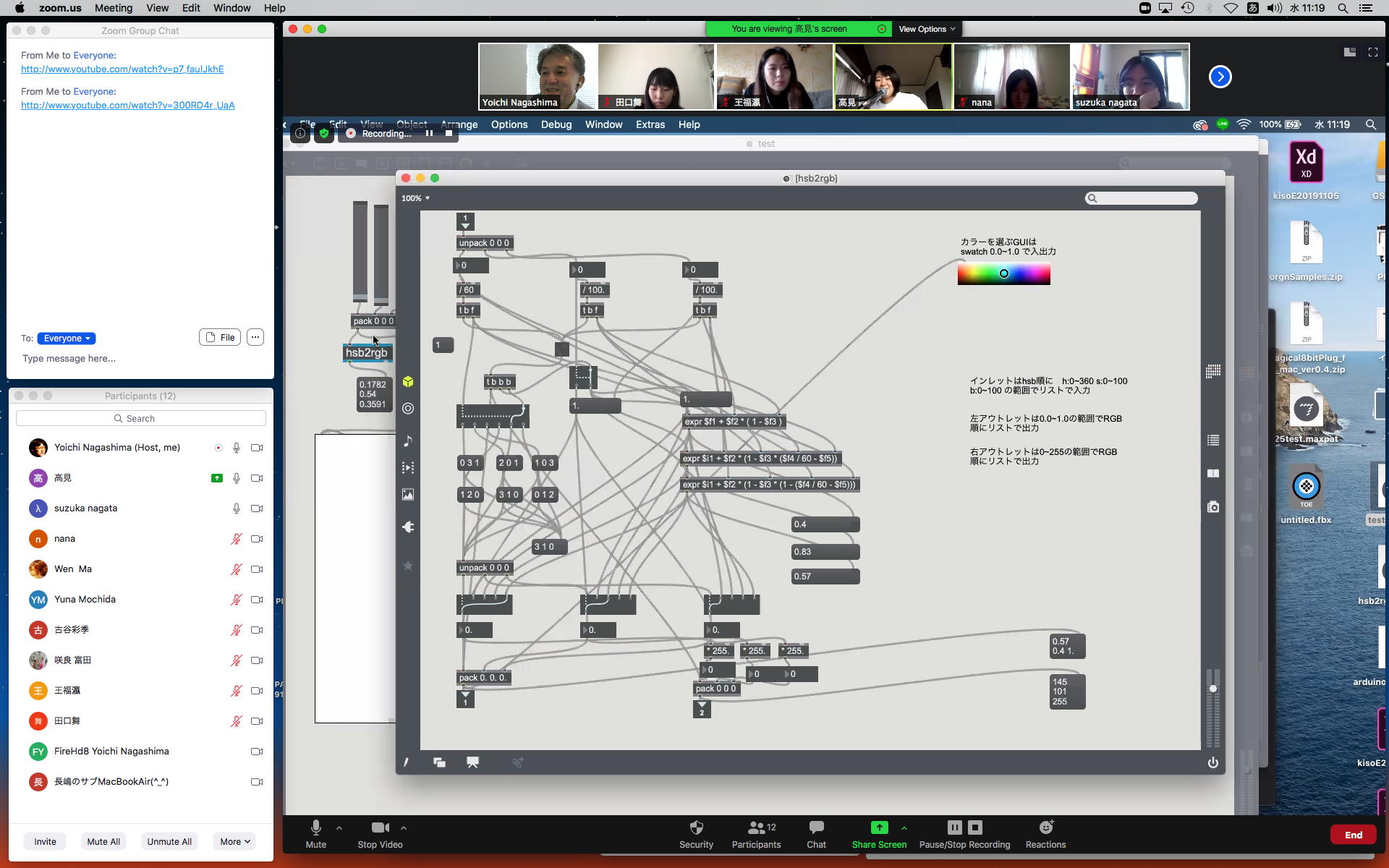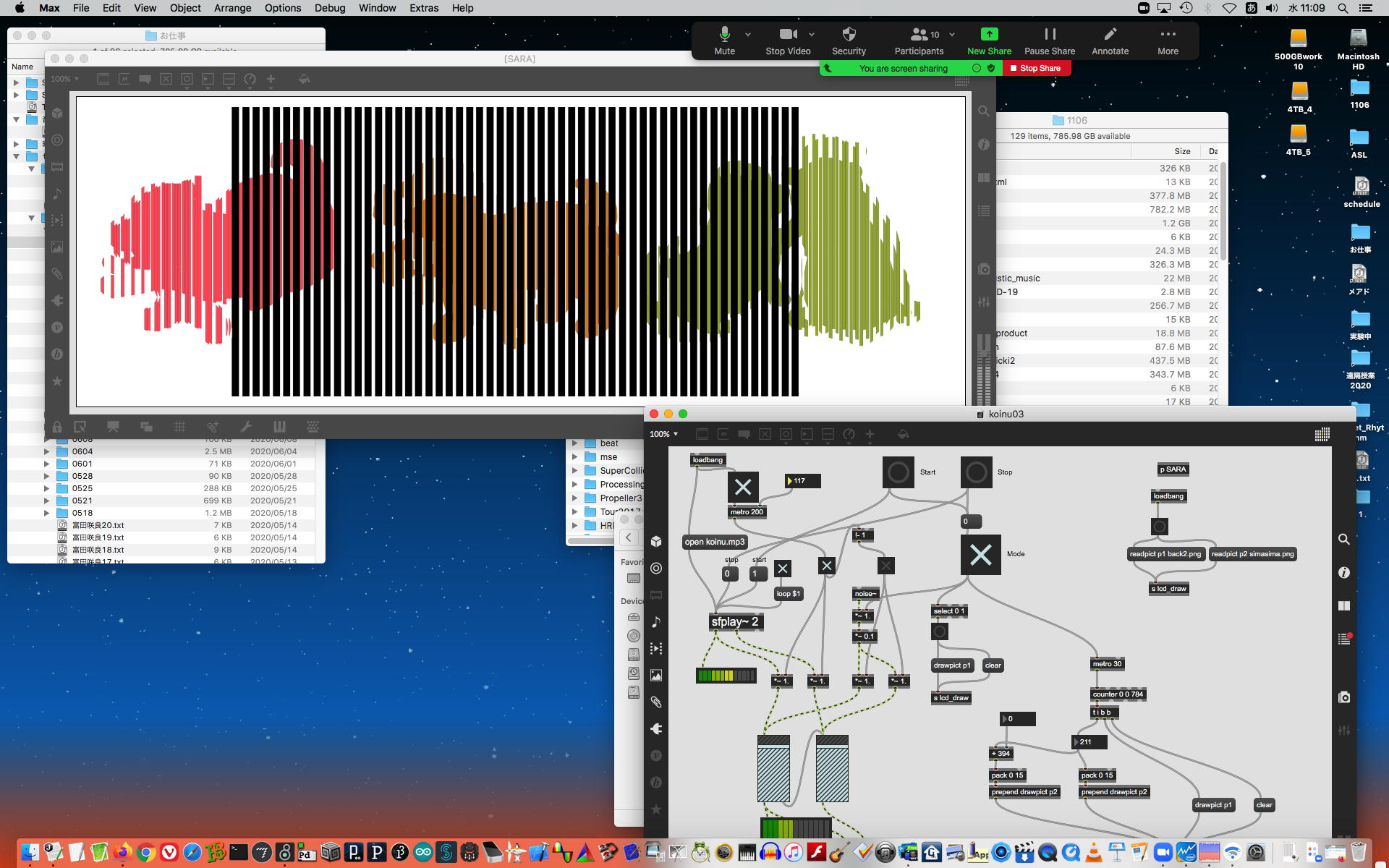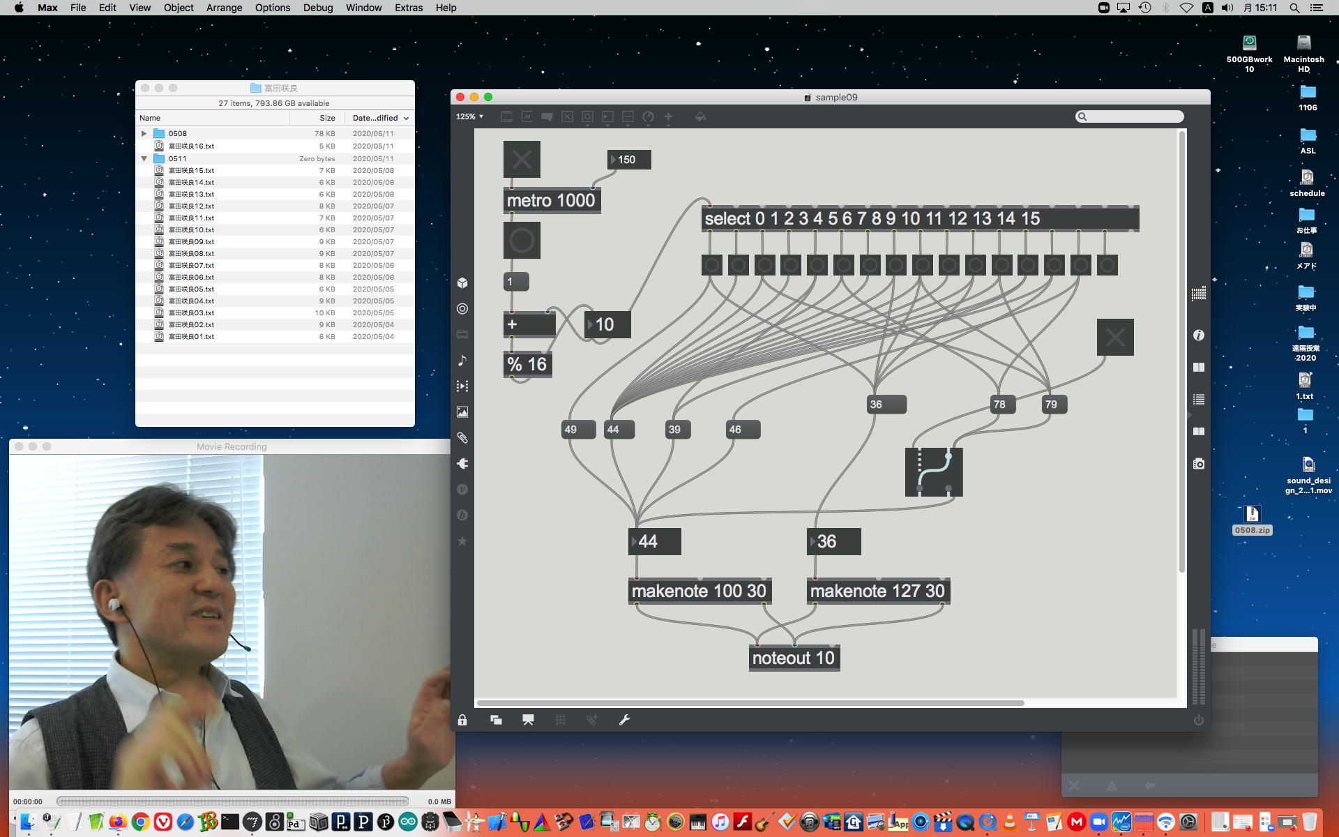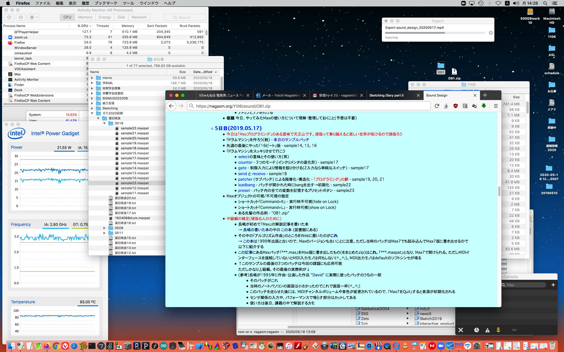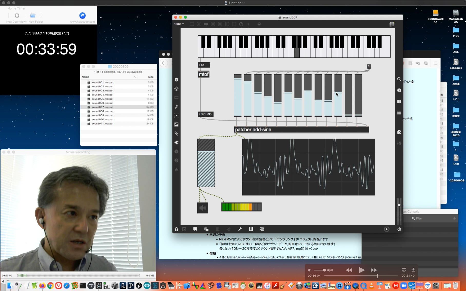 ということで、午前10時過ぎにようやく「 基礎演習E 」の 授業動画 60分7.1GBがmp4(1.46GB)になったものの、昼休みになっても「 サウンドデザイン 」の 授業動画 75分9GBのmp4エンコードが終了せず、CPU温度は80℃でCPU使用率も合計200%ほどのまま、13時からの富田さんとのZOOM会議に突入した。 同じSUAC構内ではあるものの、音声に時々ノイズが入ったのはmp4エンコードの影響だったようだが、ZOOM特訓でMaxプログラミングを手取り足取りで教える、というのはなかなかに効率が良くて、気付いたら1時間半ほどやってしまって、無事に特訓は進んだ。 ただし「 サウンドデザイン 」の 授業動画 75分9GBのmp4エンコードは、Max8とZOOMの走る裏でずっと進んでいるものの、終わる気配がないままだった。 ちなみに(リンク切れするが)全90分の記録動画は これ である。
