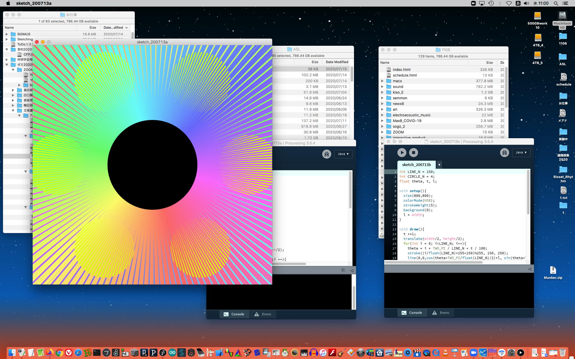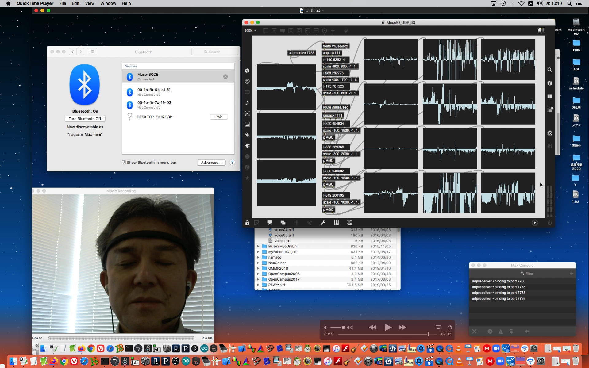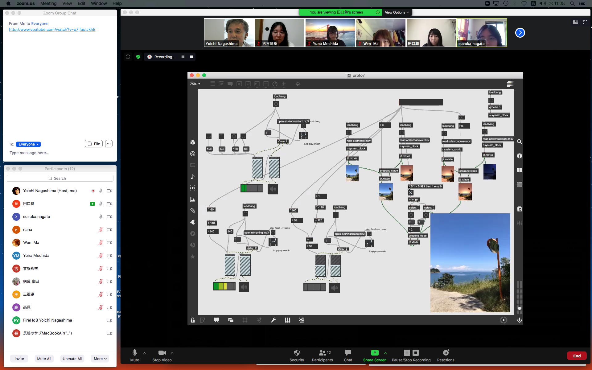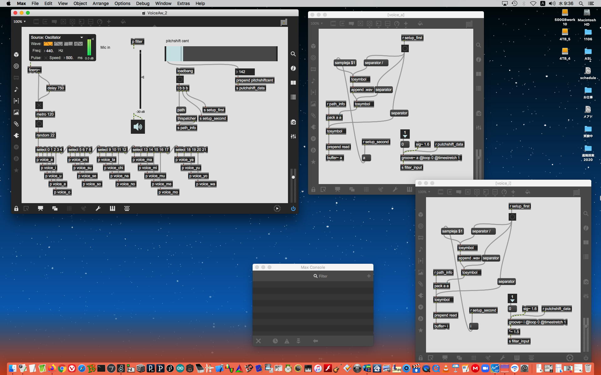 ということで、午前10時過ぎにようやく「 基礎演習E 」の 授業動画 60分7.1GBがmp4(1.46GB)になったものの、昼休みになっても「 サウンドデザイン 」の 授業動画 75分9GBのmp4エンコードが終了せず、CPU温度は80℃でCPU使用率も合計200%ほどのまま、13時からの富田さんとのZOOM会議に突入した。 同じSUAC構内ではあるものの、音声に時々ノイズが入ったのはmp4エンコードの影響だったようだが、ZOOM特訓でMaxプログラミングを手取り足取りで教える、というのはなかなかに効率が良くて、気付いたら1時間半ほどやってしまって、無事に特訓は進んだ。 ただし「 サウンドデザイン 」の 授業動画 75分9GBのmp4エンコードは、Max8とZOOMの走る裏でずっと進んでいるものの、終わる気配がないままだった。 ちなみに(リンク切れするが)全90分の記録動画は これ である。