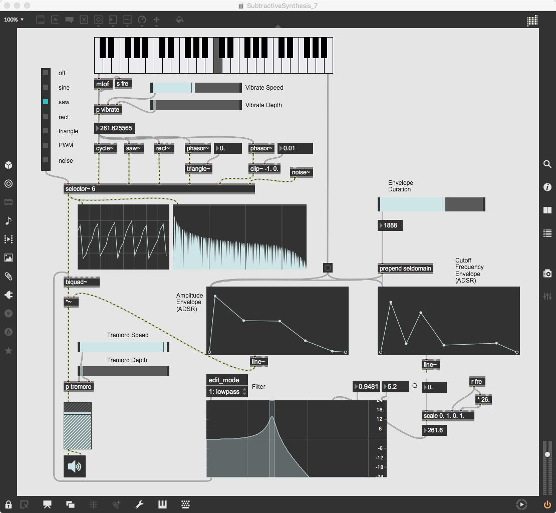 そして、北京の王さんからは「減算方式シンセサイザ」の改良版(LPFにADSRのエンベロープを与えるところで、鍵盤の音域に対応させるようリクエストしていた)が届いたのでチェックして、さらに一気に上のように、ビブラートとトレモロまで加えたものを完成させてしまった。 ここには周波数とデプスに色々な経験的ノウハウがあるのだが、そこは元・楽器メーカの研究者ということで熟知しているので、何故そうなるのか不明な微妙な塩梅を盛り込んだアナログシンセになっている。