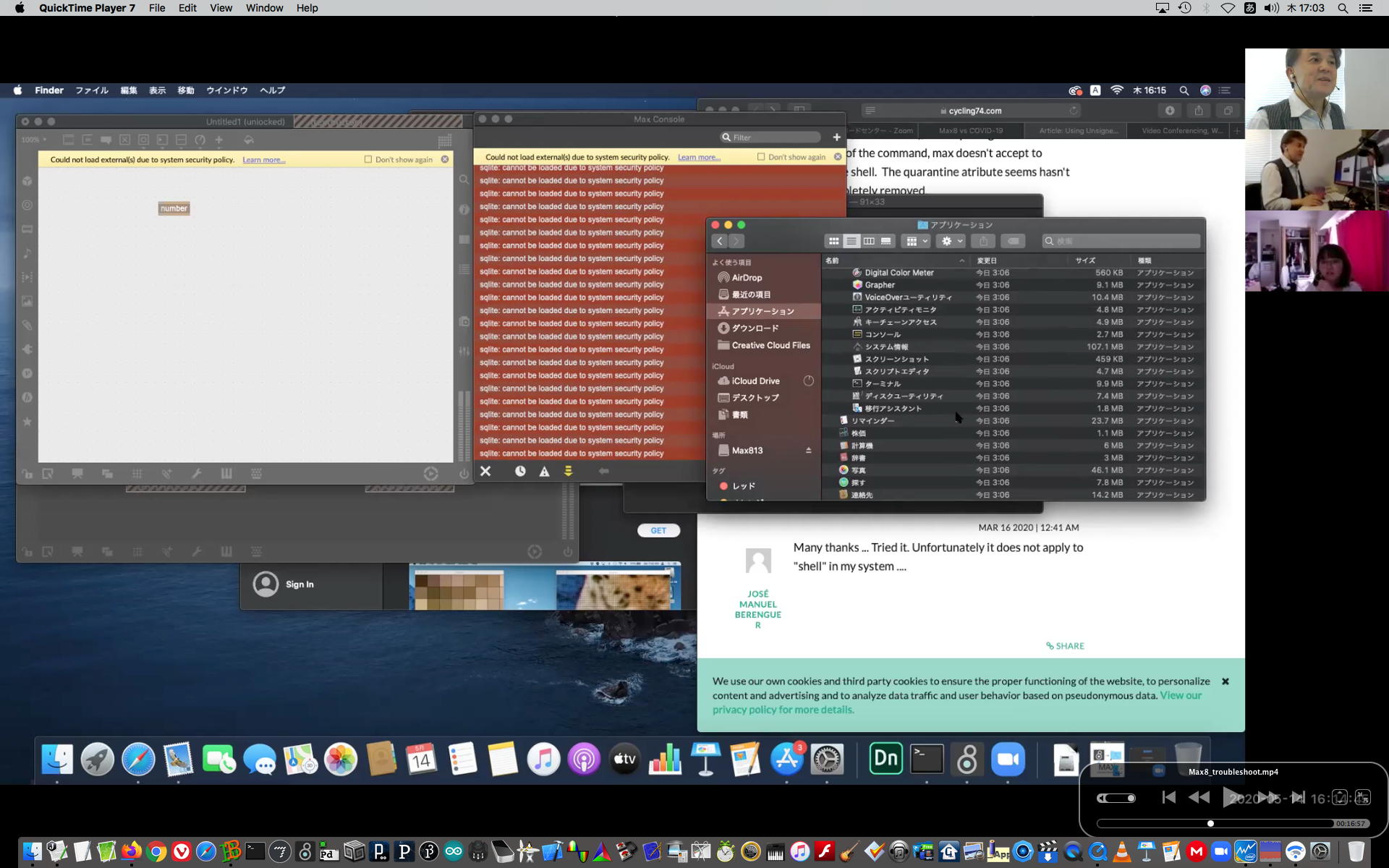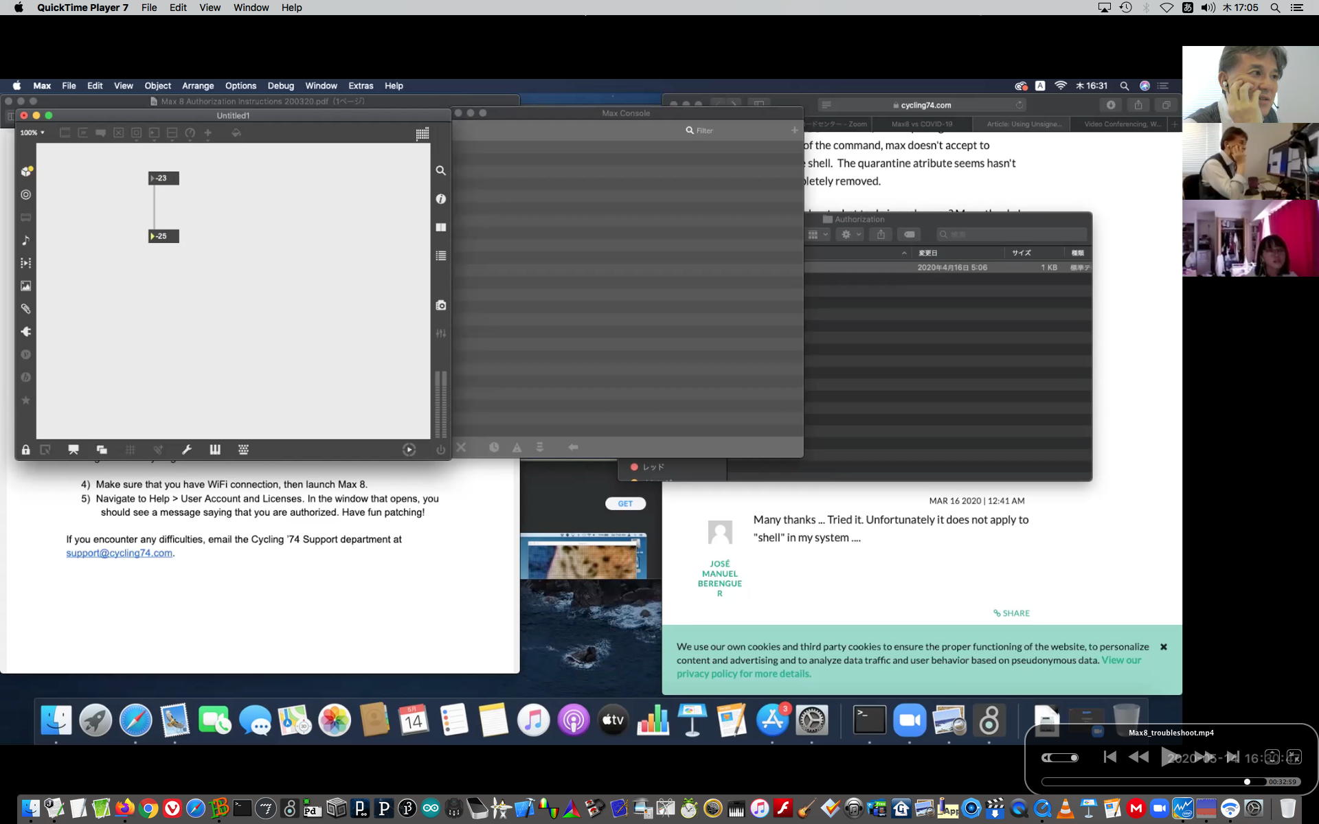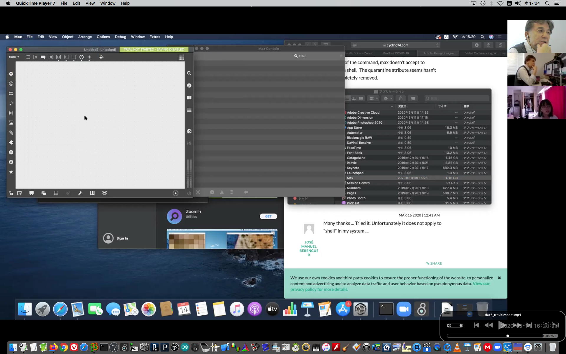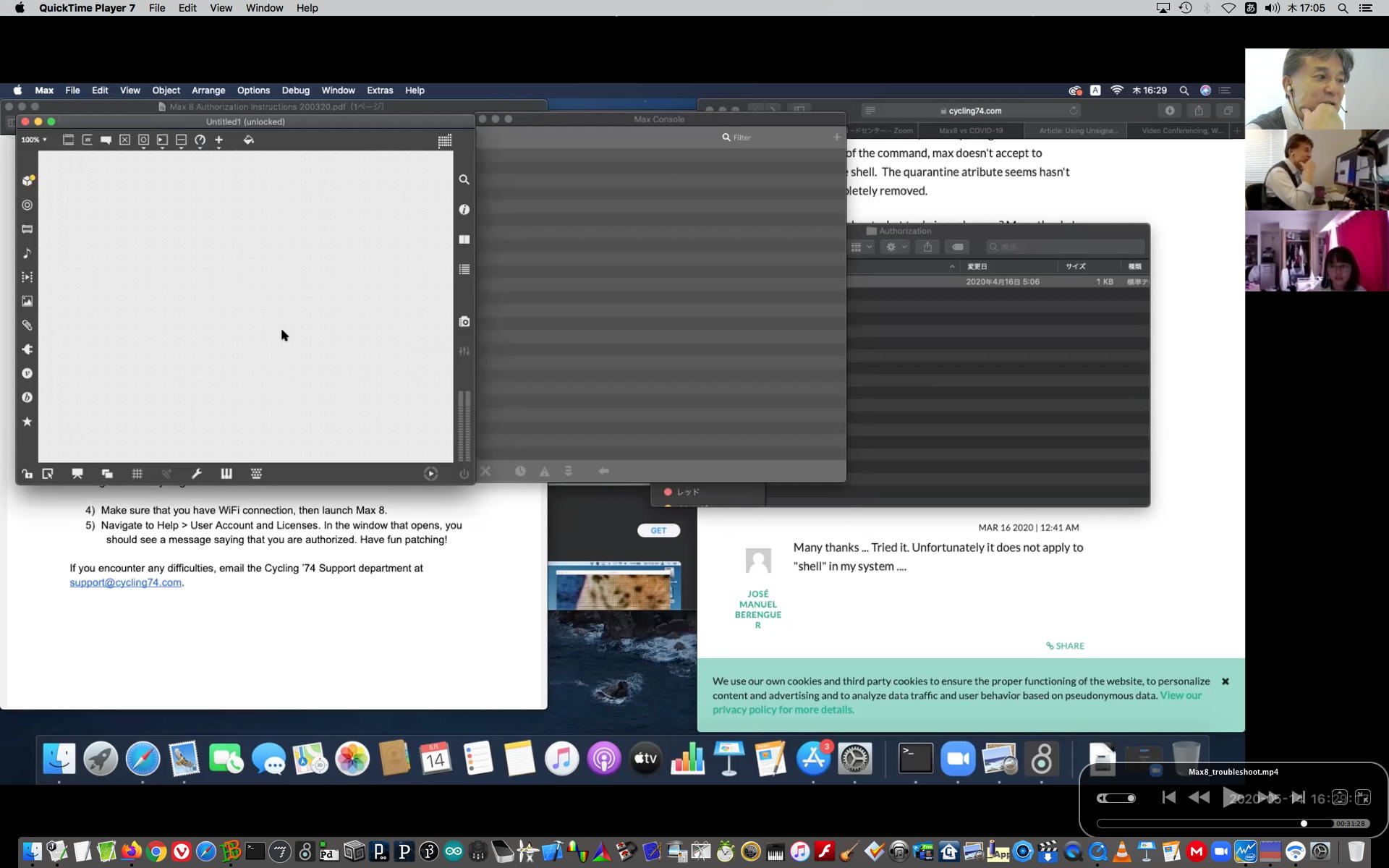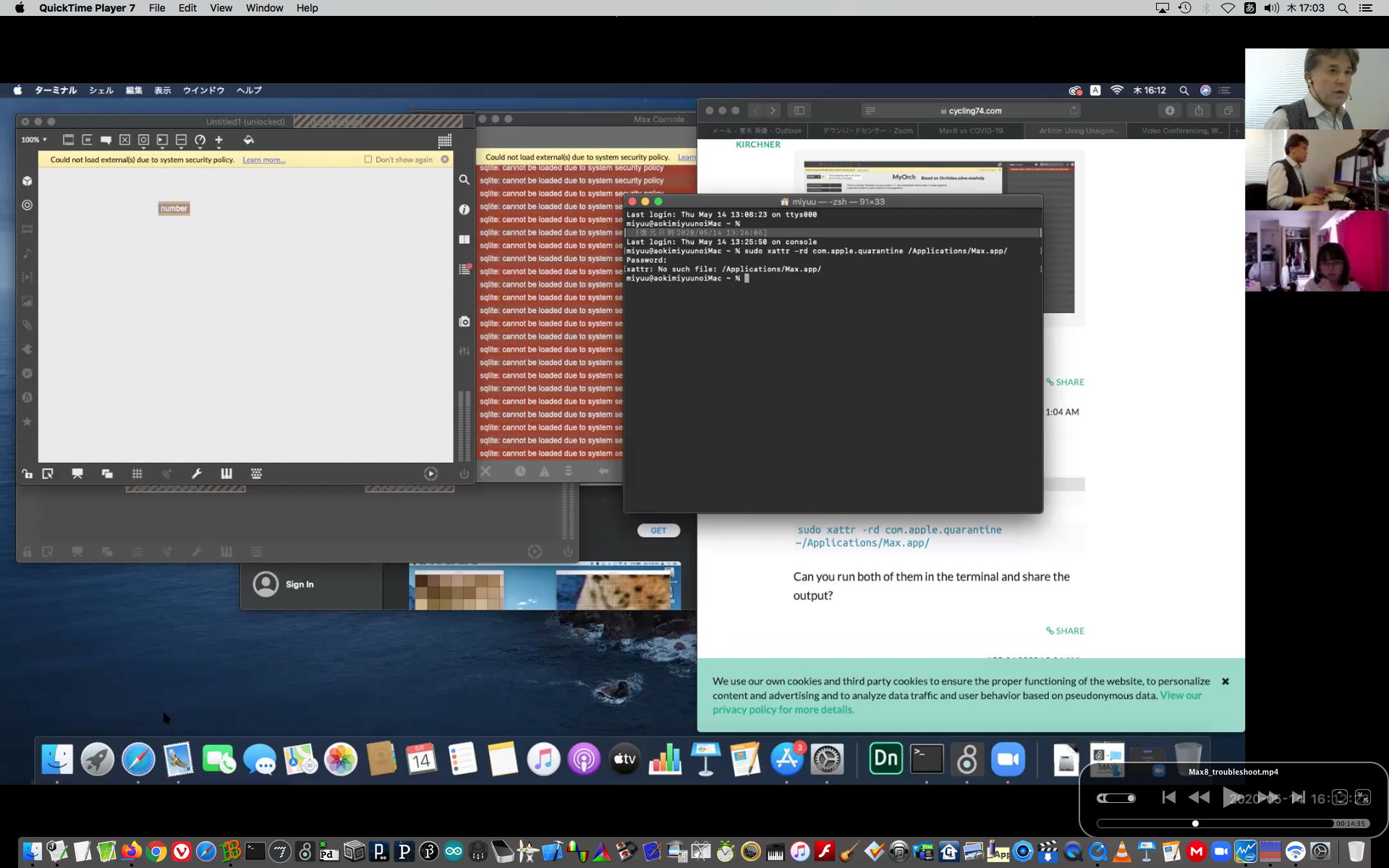 そして午後にいつものようにギターを弾いていると、学生から続々とレポートなどのメイルが届いたが、その中でMaxのインストールで厖大なエラーが出る・・・という2回生の青木さんとの対応から、大きな成果を得ることが出来た。 しばらくメイルを行き来させたが、様子がわからないのでZOOMを入れて・・・とお願いして、上のように臨時ZOOM会議で遠隔サポートして、無事に問題を解決して、ついでに期間限定ライセンスまで入れてしまった。 これで今後、トラブルが起きても参考情報が得られた。 このZOOM動画は、背景である下宿の部屋が見えては困るとの青木さんの要請でYouTubeには上げずに、僕の手元のサポート教材動画とすることにした。