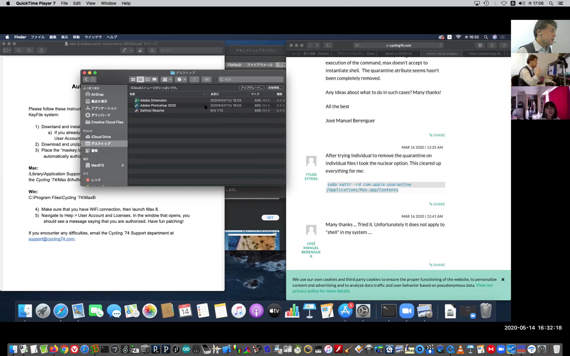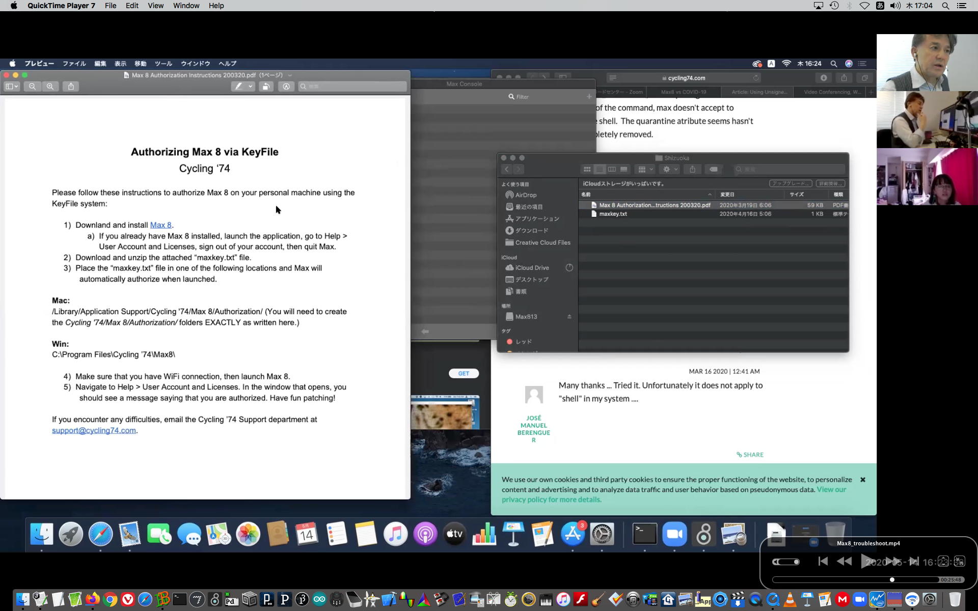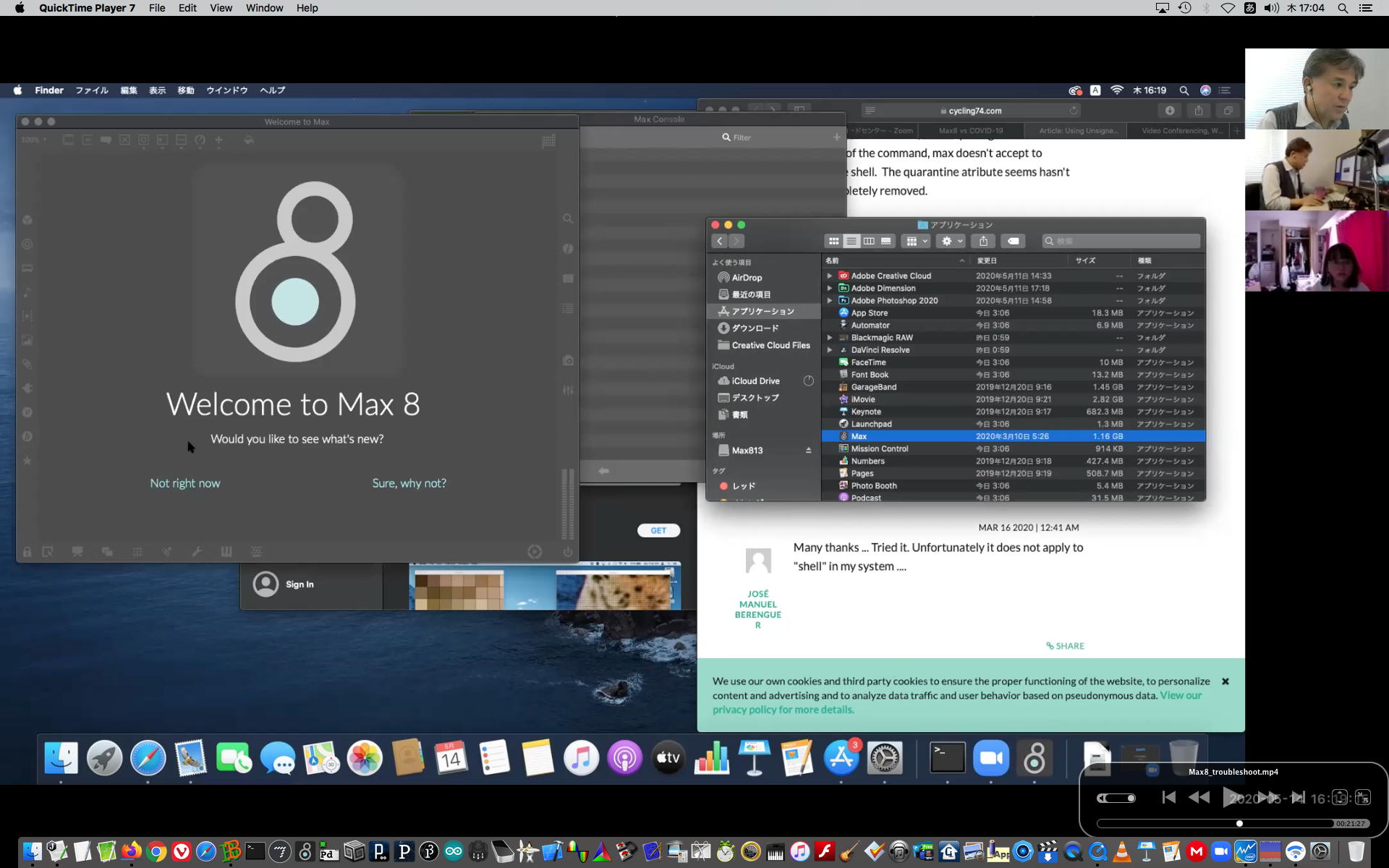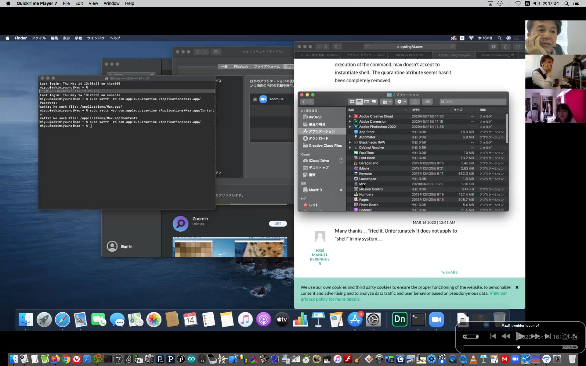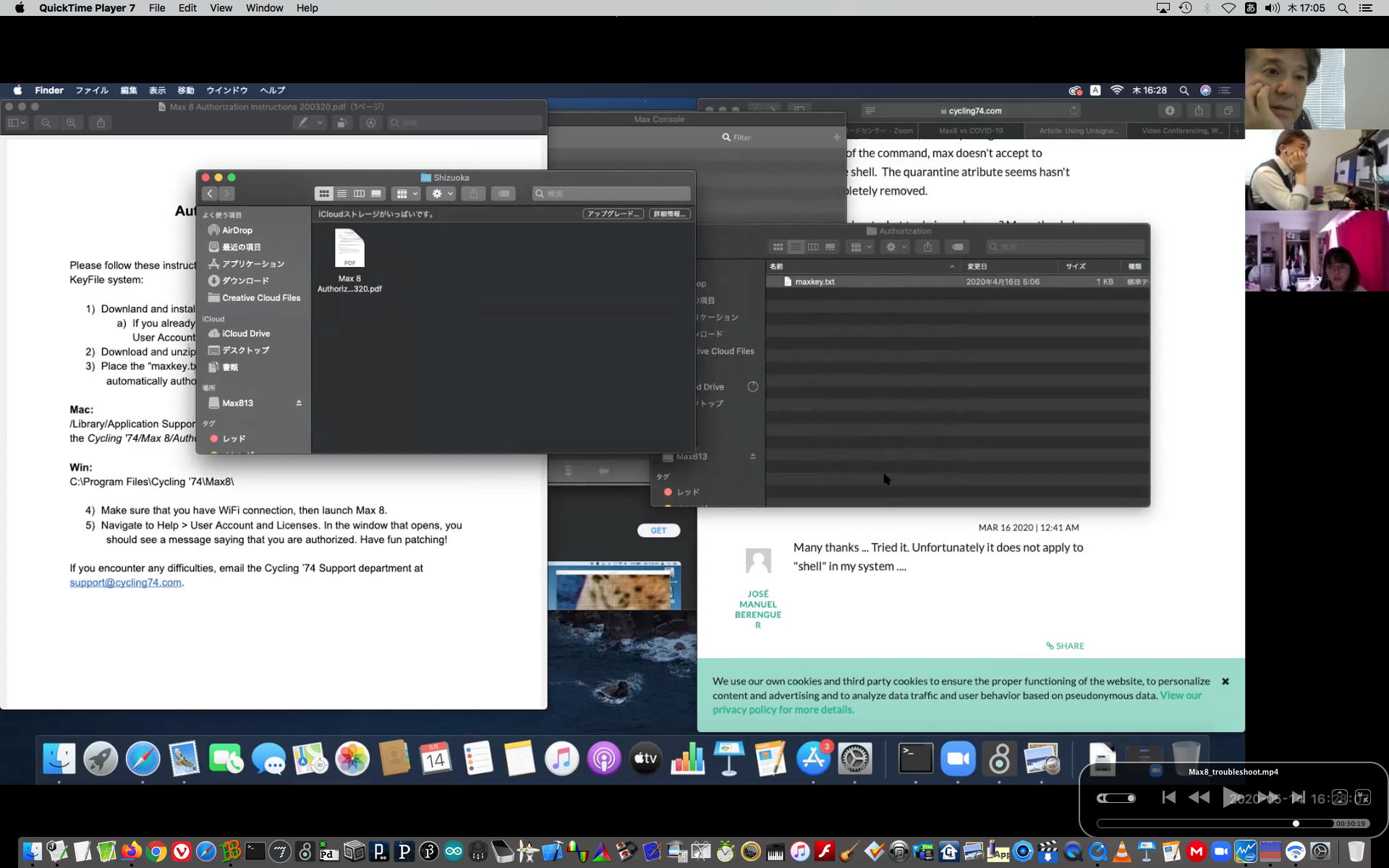 そして午後にいつものようにギターを弾いていると、学生から続々とレポートなどのメイルが届いたが、その中でMaxのインストールで厖大なエラーが出る・・・という2回生の青木さんとの対応から、大きな成果を得ることが出来た。 しばらくメイルを行き来させたが、様子がわからないのでZOOMを入れて・・・とお願いして、上のように臨時ZOOM会議で遠隔サポートして、無事に問題を解決して、ついでに期間限定ライセンスまで入れてしまった。 これで今後、トラブルが起きても参考情報が得られた。 このZOOM動画は、背景である下宿の部屋が見えては困るとの青木さんの要請でYouTubeには上げずに、僕の手元のサポート教材動画とすることにした。