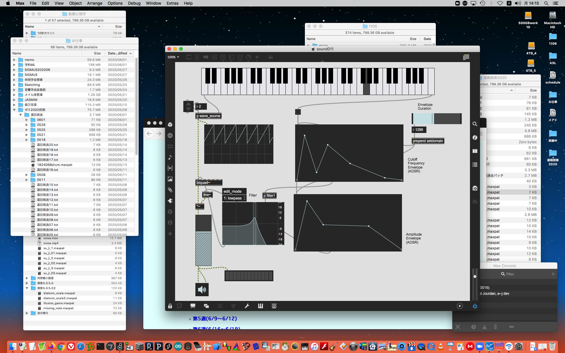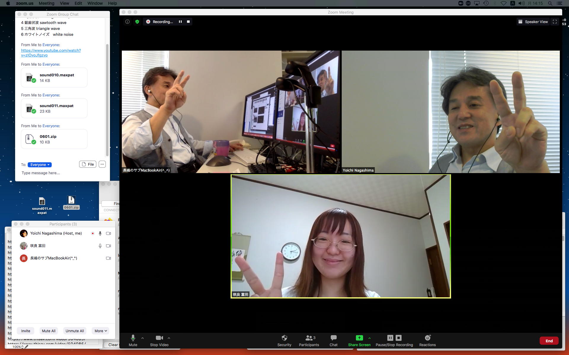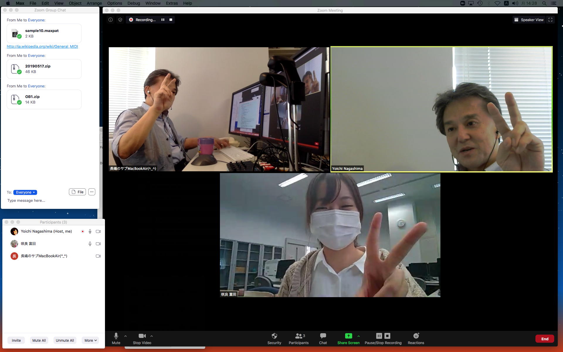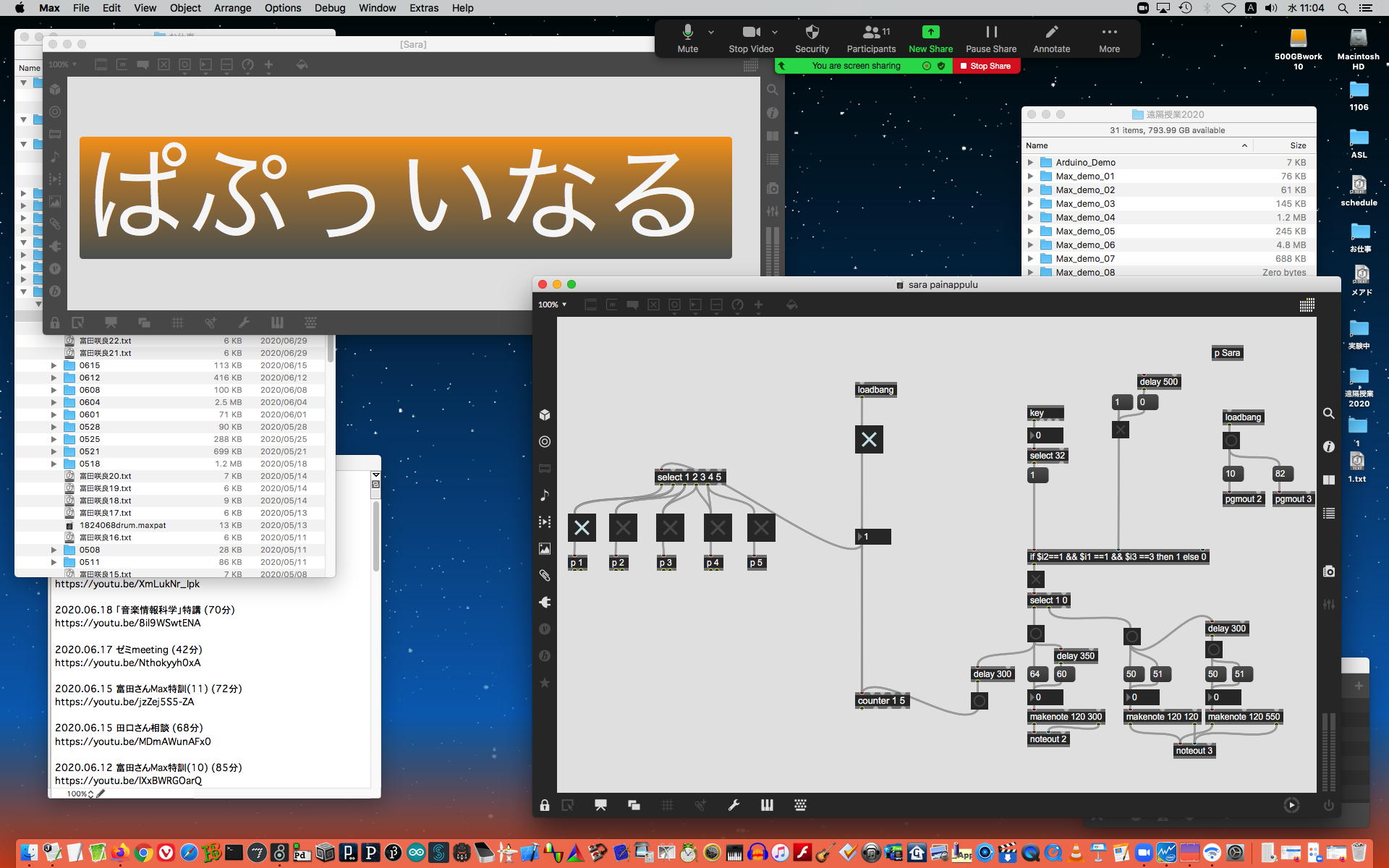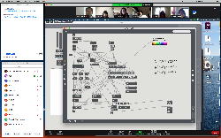 そして1時間にわたったゼミZOOM会議も無事に終わり、古谷さんと富田さんもゼミメンバーとして参加を続けることとなった。 「サウンドデザイン」と「音楽情報科学」をダブルで受講しつつMaxプログラミングを特訓で追いかける富田さんには、1106研究室のMax7の入ったMacBookを貸し出してフォローしていくことにした。 ちなみに(リンク切れするが)全70分の記録動画は これ である。 そしてその後、富田さんと連絡を取り合って、明日の午後イチで守衛室に来てもらった富田さんにMacBookを渡して、下宿に戻ったところでZOOM会議で最初の一歩を進めることになった。 こういう話がサクサク進むというのは、いいもんである。(^_^)