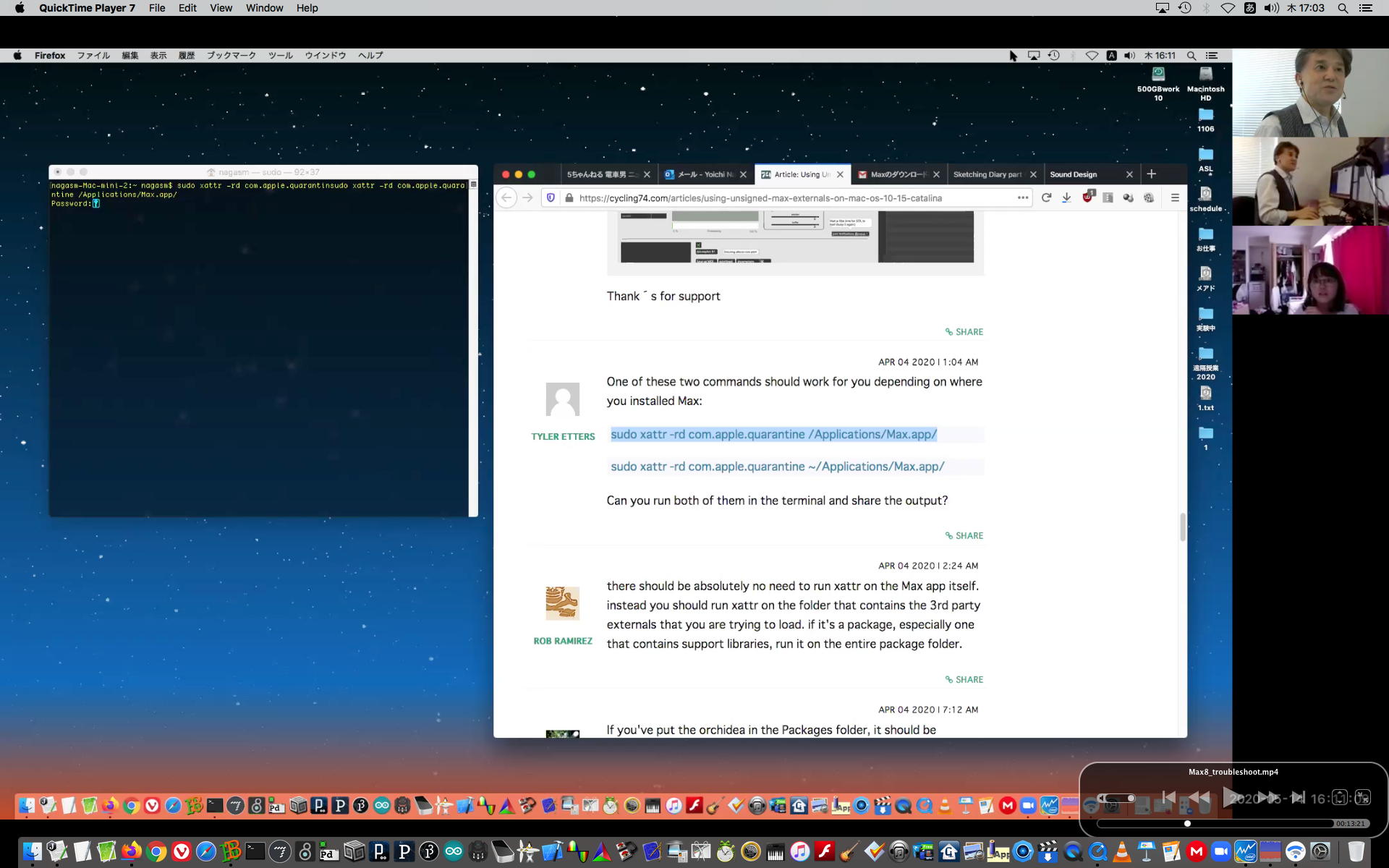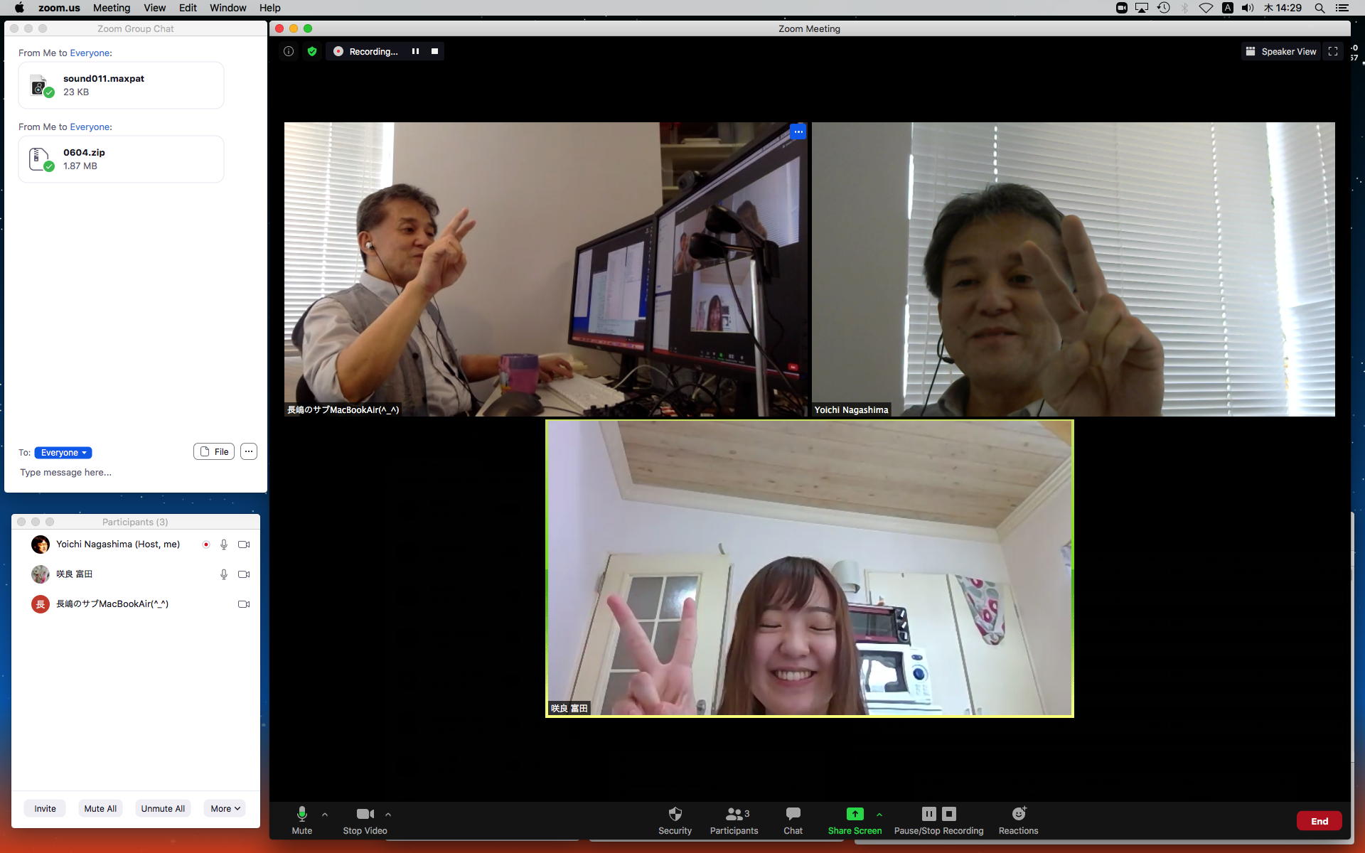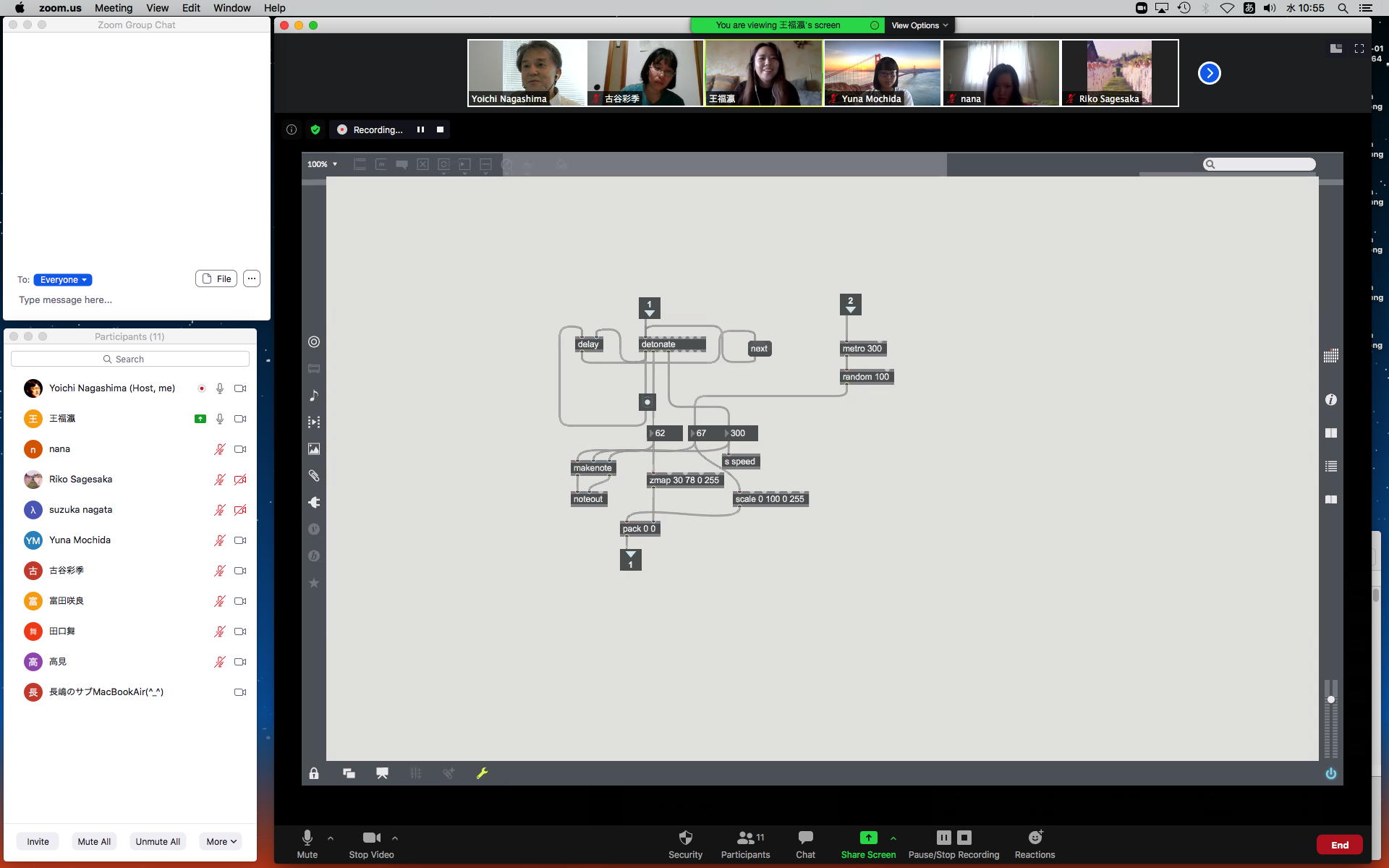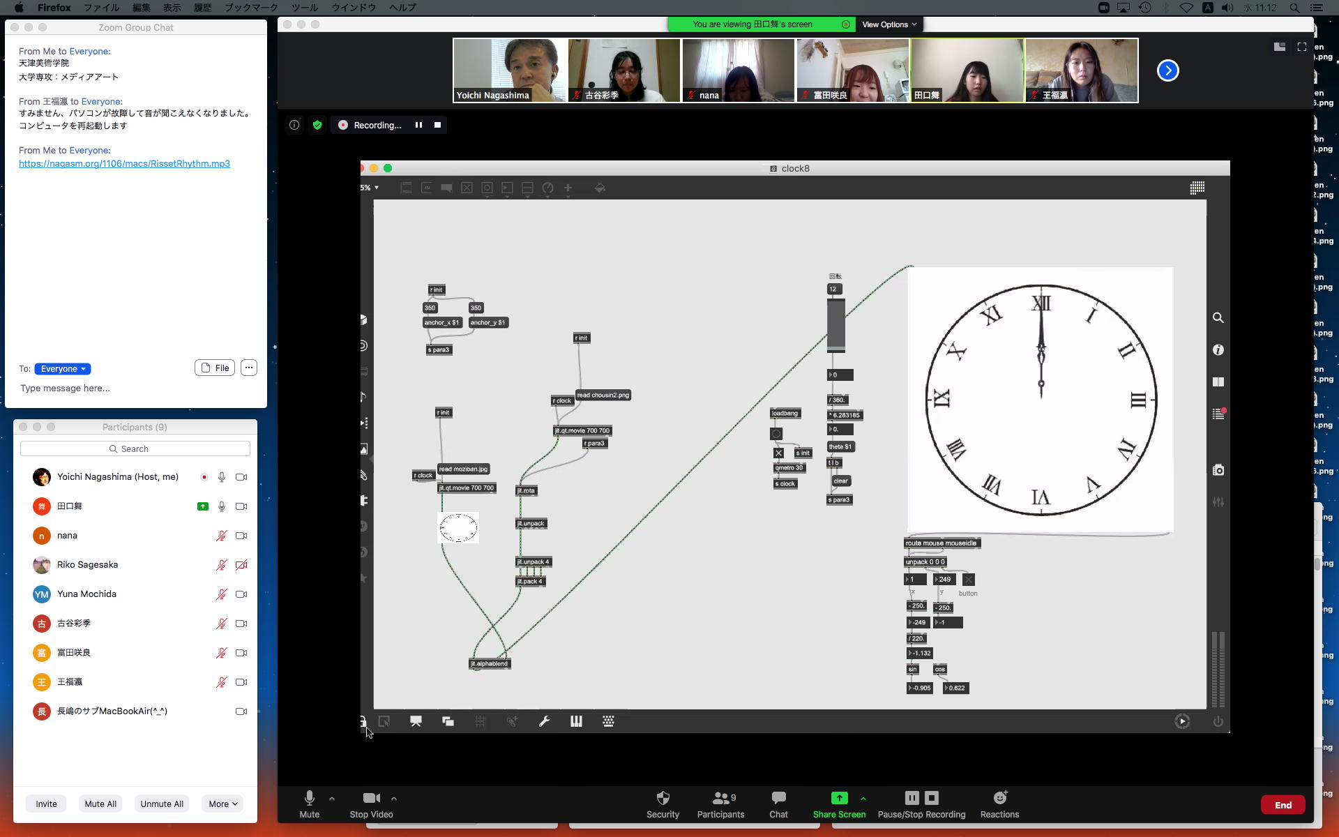 そして1時間にわたったゼミZOOM会議も無事に終わり、古谷さんと富田さんもゼミメンバーとして参加を続けることとなった。 「サウンドデザイン」と「音楽情報科学」をダブルで受講しつつMaxプログラミングを特訓で追いかける富田さんには、1106研究室のMax7の入ったMacBookを貸し出してフォローしていくことにした。 ちなみに(リンク切れするが)全70分の記録動画は これ である。 そしてその後、富田さんと連絡を取り合って、明日の午後イチで守衛室に来てもらった富田さんにMacBookを渡して、下宿に戻ったところでZOOM会議で最初の一歩を進めることになった。 こういう話がサクサク進むというのは、いいもんである。(^_^)