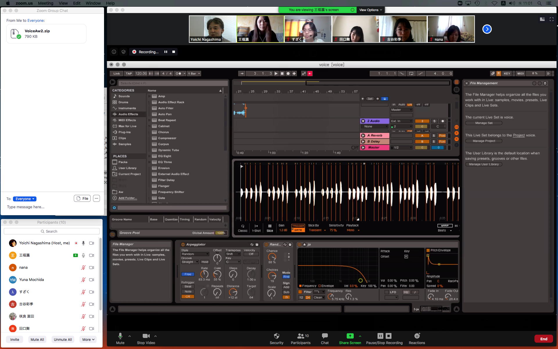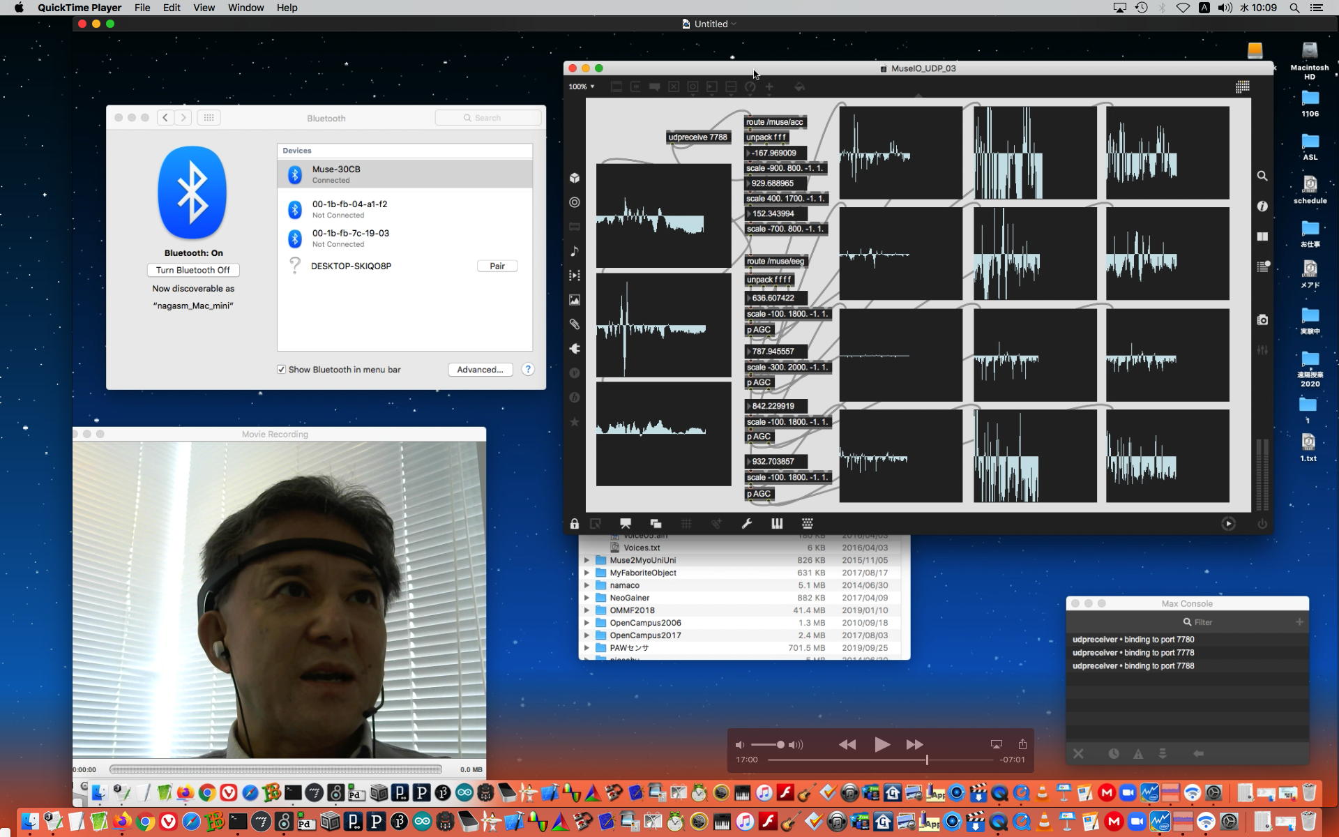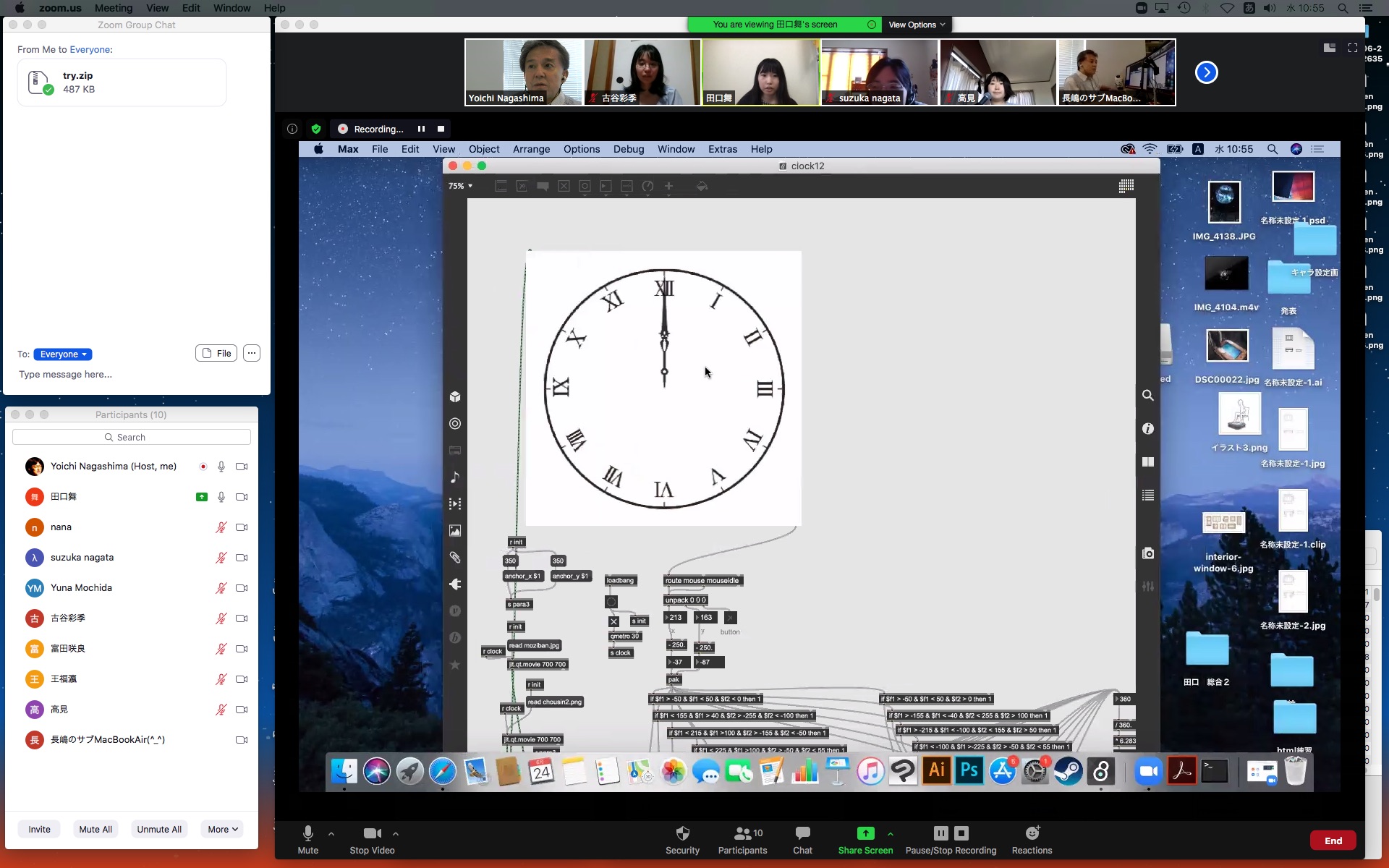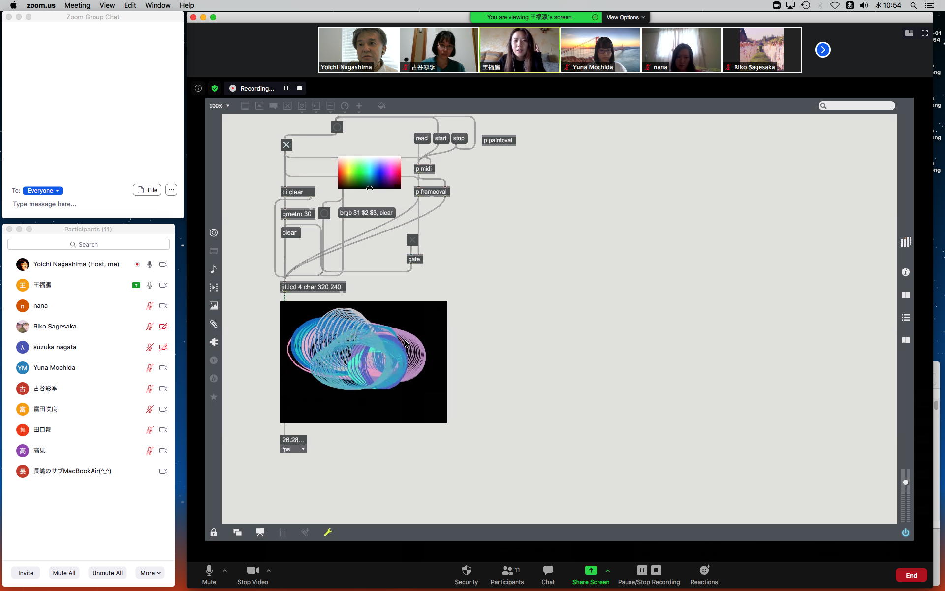 そして1時間にわたったゼミZOOM会議も無事に終わり、古谷さんと富田さんもゼミメンバーとして参加を続けることとなった。 「サウンドデザイン」と「音楽情報科学」をダブルで受講しつつMaxプログラミングを特訓で追いかける富田さんには、1106研究室のMax7の入ったMacBookを貸し出してフォローしていくことにした。 ちなみに(リンク切れするが)全70分の記録動画は これ である。 そしてその後、富田さんと連絡を取り合って、明日の午後イチで守衛室に来てもらった富田さんにMacBookを渡して、下宿に戻ったところでZOOM会議で最初の一歩を進めることになった。 こういう話がサクサク進むというのは、いいもんである。(^_^)